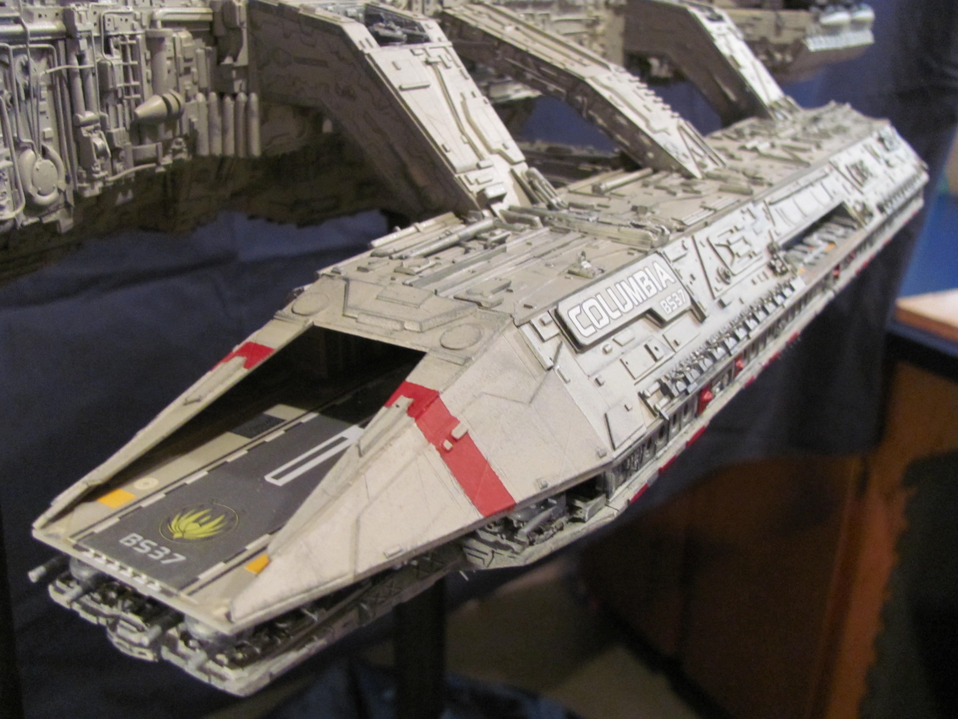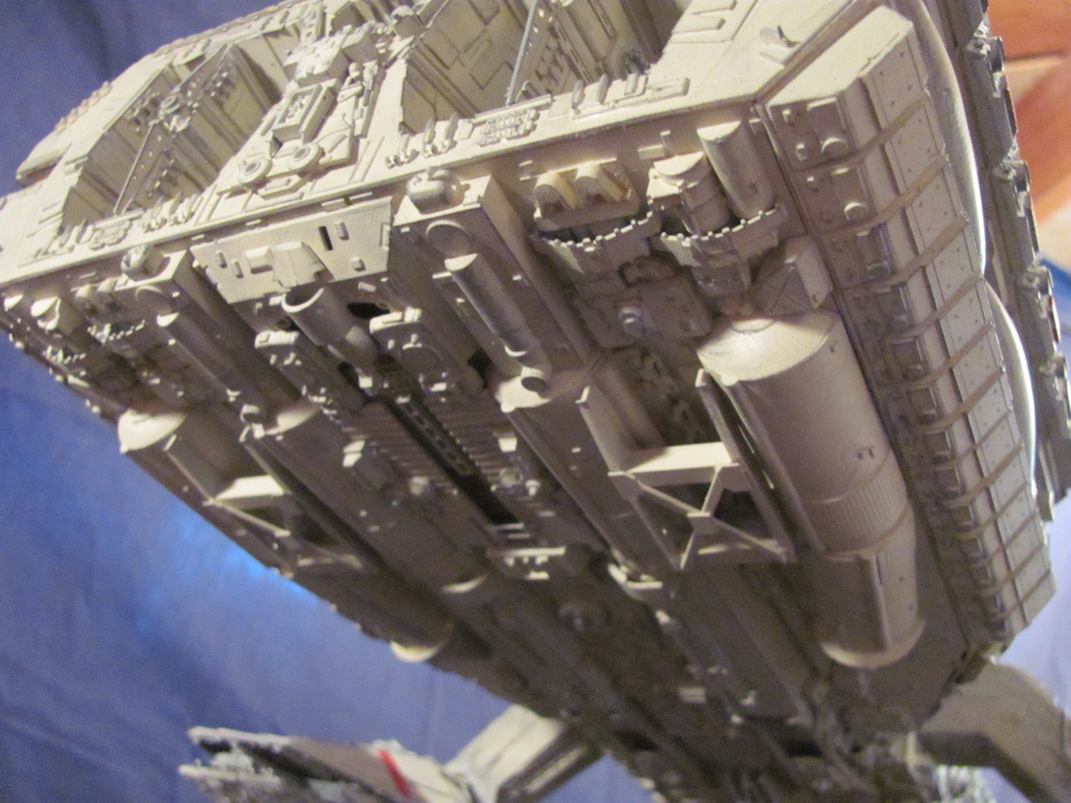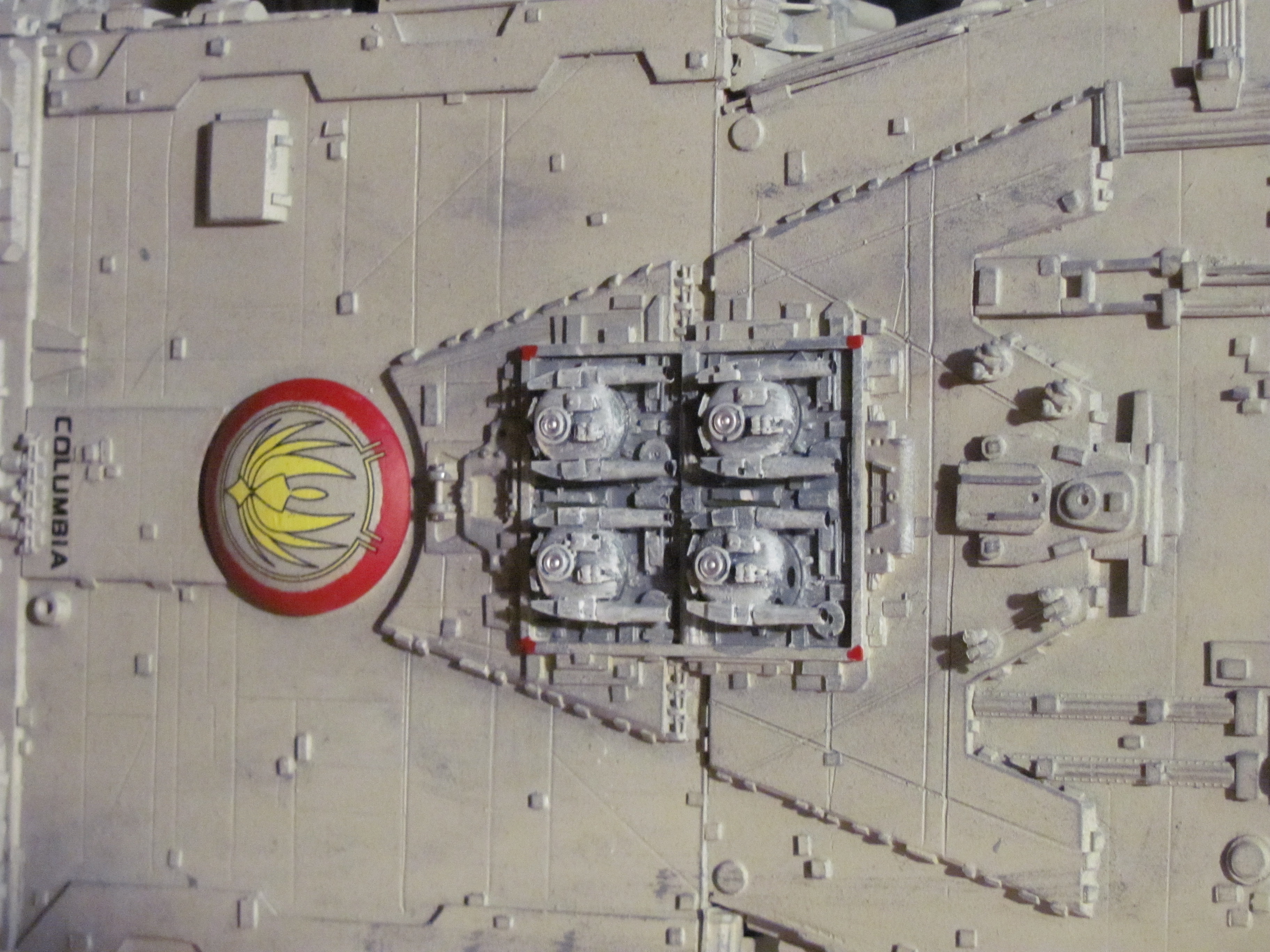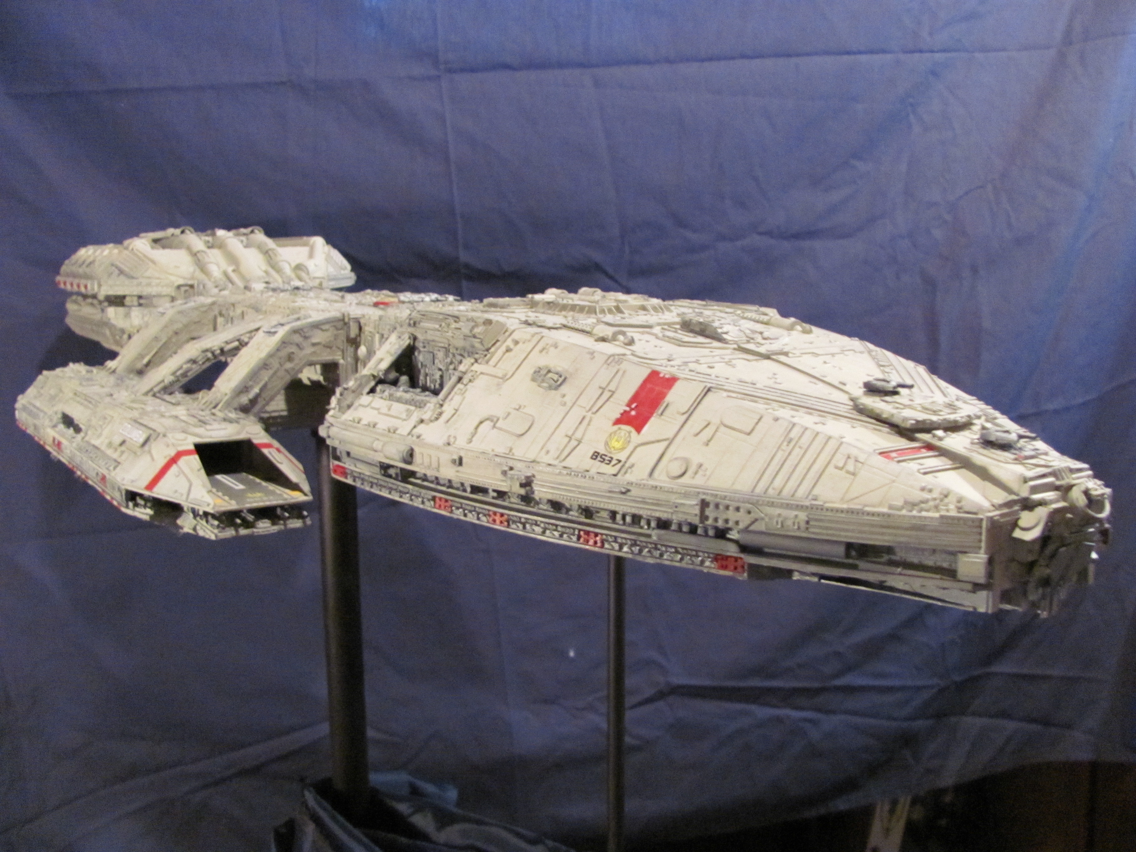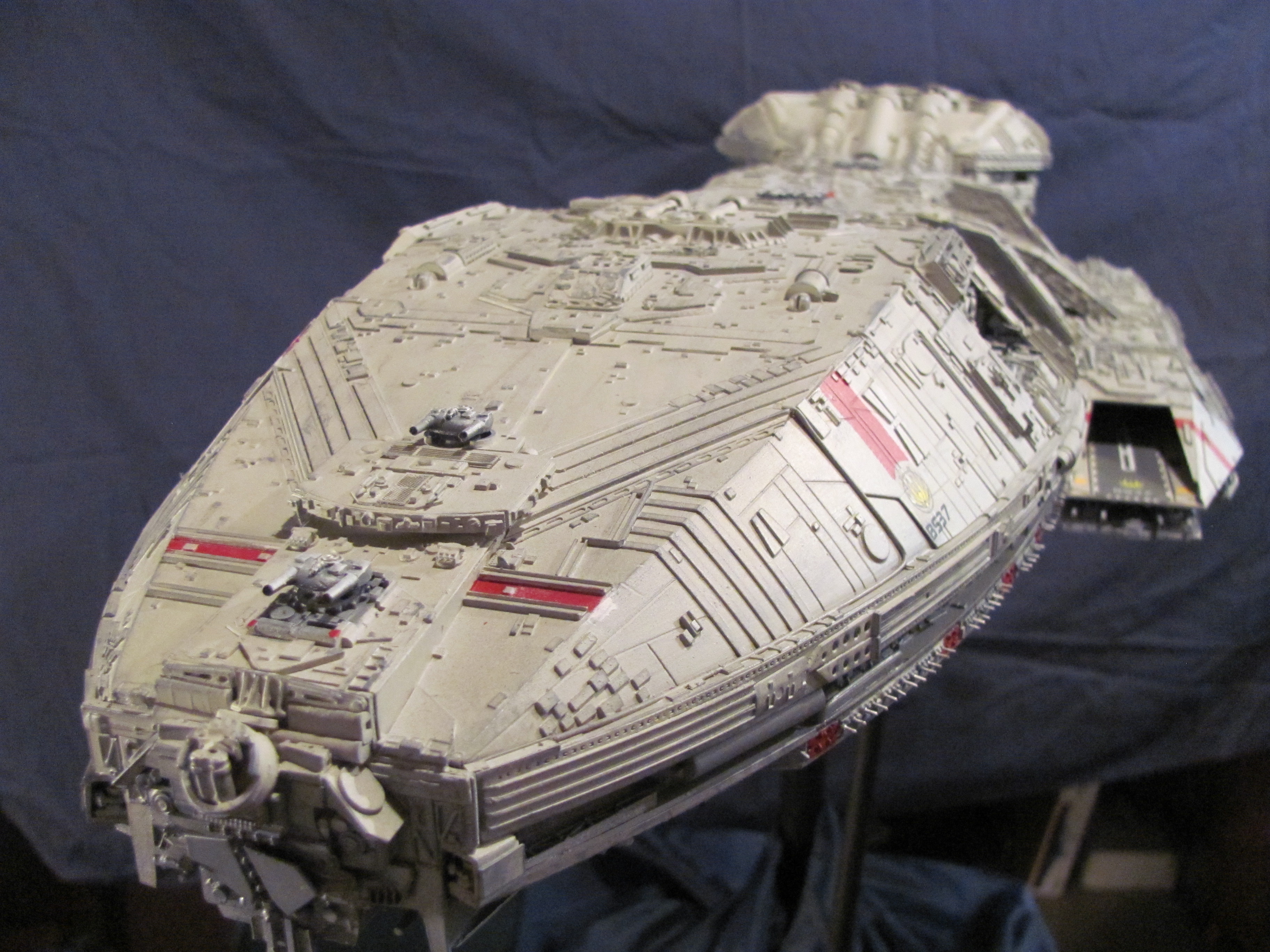 WOW! What a fantastic imagination Clifton has with this creation of a Battlestar reminiscent of three types of designs! The most obvious being the original Battlestar from the 1978 Film, then the amazing new landing and launch bay pods that have hints from the original film, the new Ron Moore Battlestar design (from Eric Chu) and then the use of the under bay guns from Brian Larson’s Re-imagined Battlestar (SEEN HERE). I LOVE THIS! As a matter of fact, I have an email into Clifton right now about this fantastic piece. One of the key element of the story of “13” we are producing is the first Colonial encounter with the Cylons (which we refer to as Cetans at first). In our story it is the Columbia that is involved…. and she isn’t even finished when the encounter happens. She will have an entire open landing bay that is still unfinished at the time. I state this to you all because what Clifton has done with this build very much is what we were looking for in an early Battlestar design (as being the Colonies first launched). Of course there would be changes to suit the time period better, but what a fantastic design by artist Clifton Simmons!!! Just look at the beautiful lines… and the very functional gun emplacements! Creativity is what this art form is all about! This design also shows us that an artist does not have to be part for part accurate to the original studio model to have an amazing Battlestar display! Outstanding!