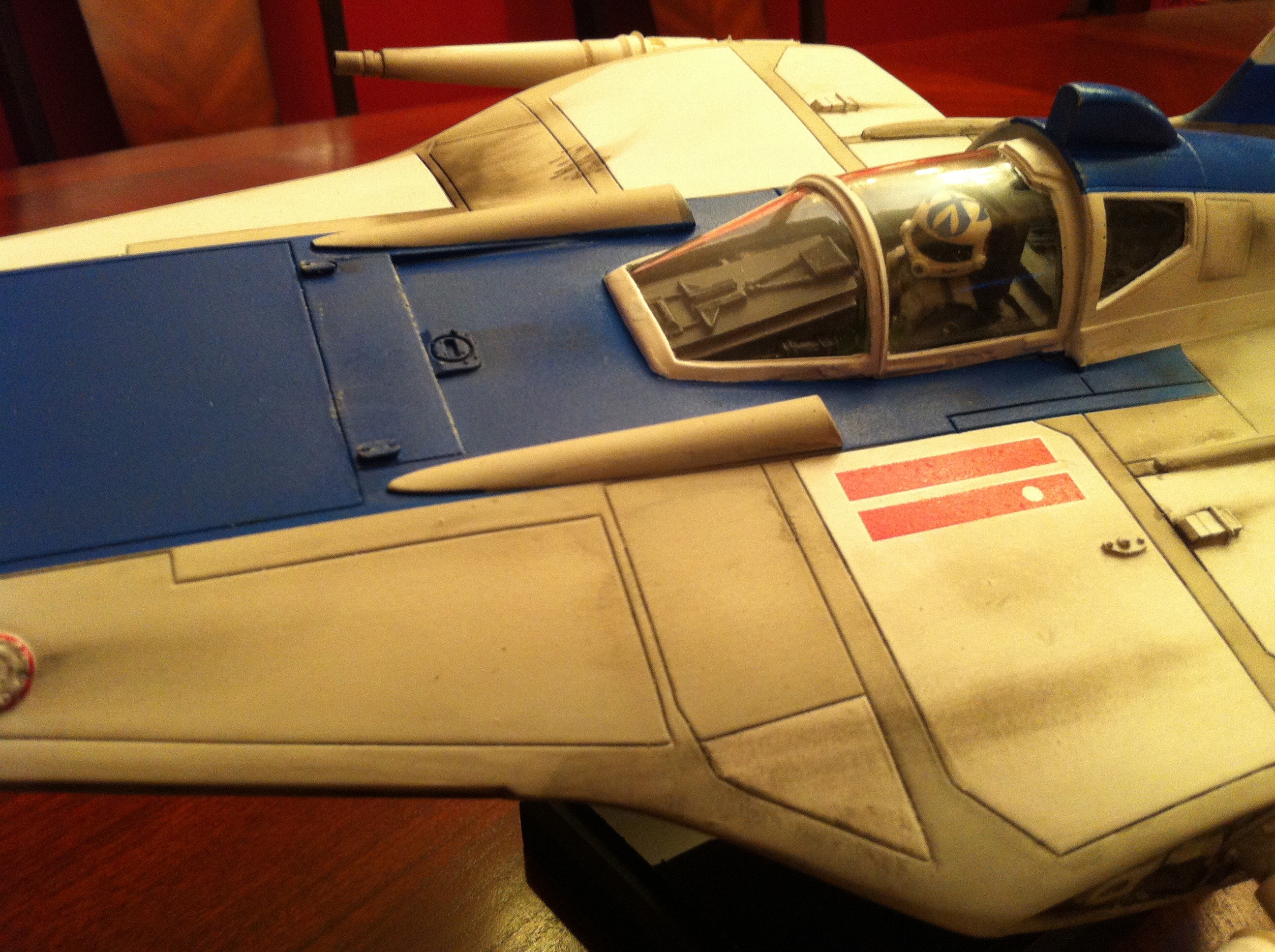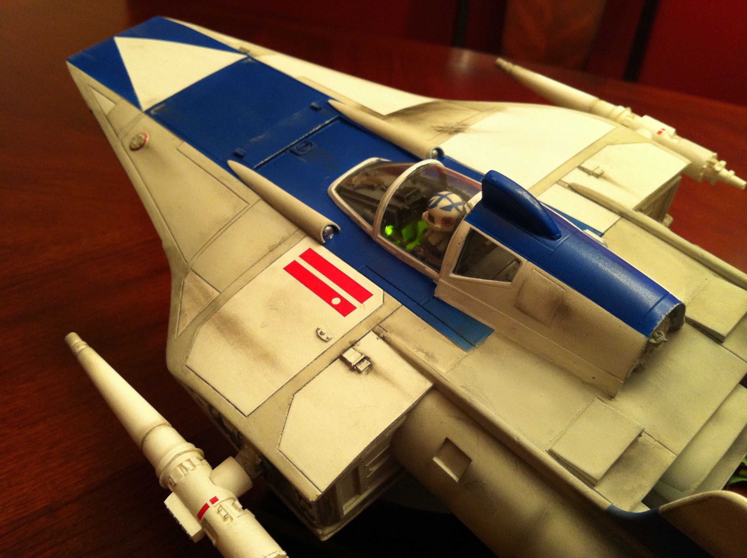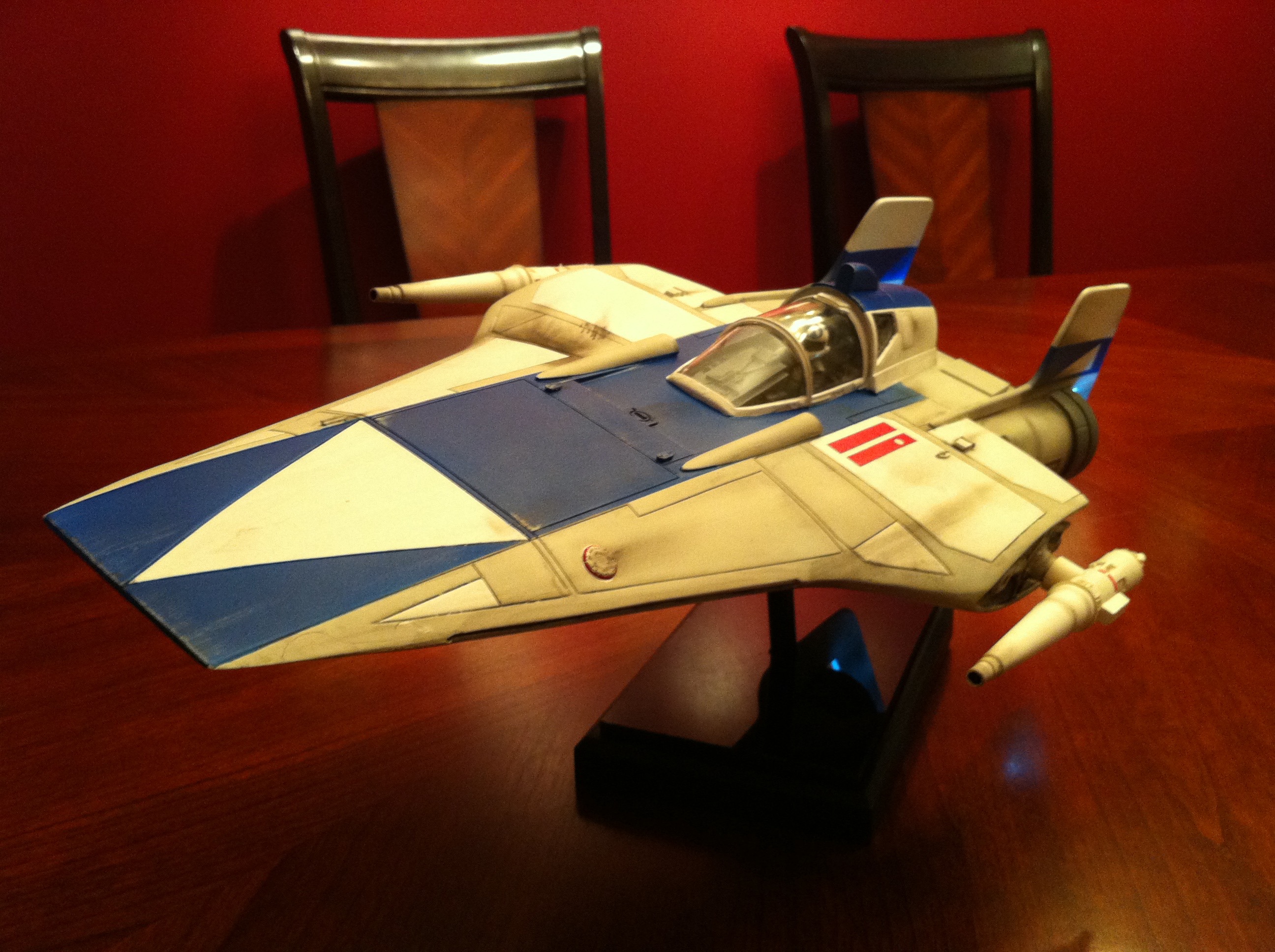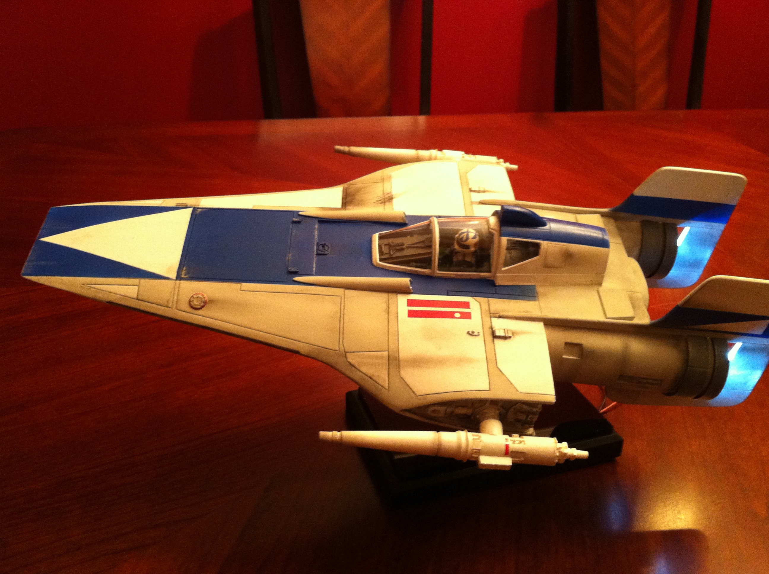 Here is the Ralph Mcquarrie A-Wing Concept. It’s in 1/24 scale and measuring about 16” long. Lit with LED’s and weathered with pastels and airbrush. A simple but elegant design and easy to build. Hope you like it.