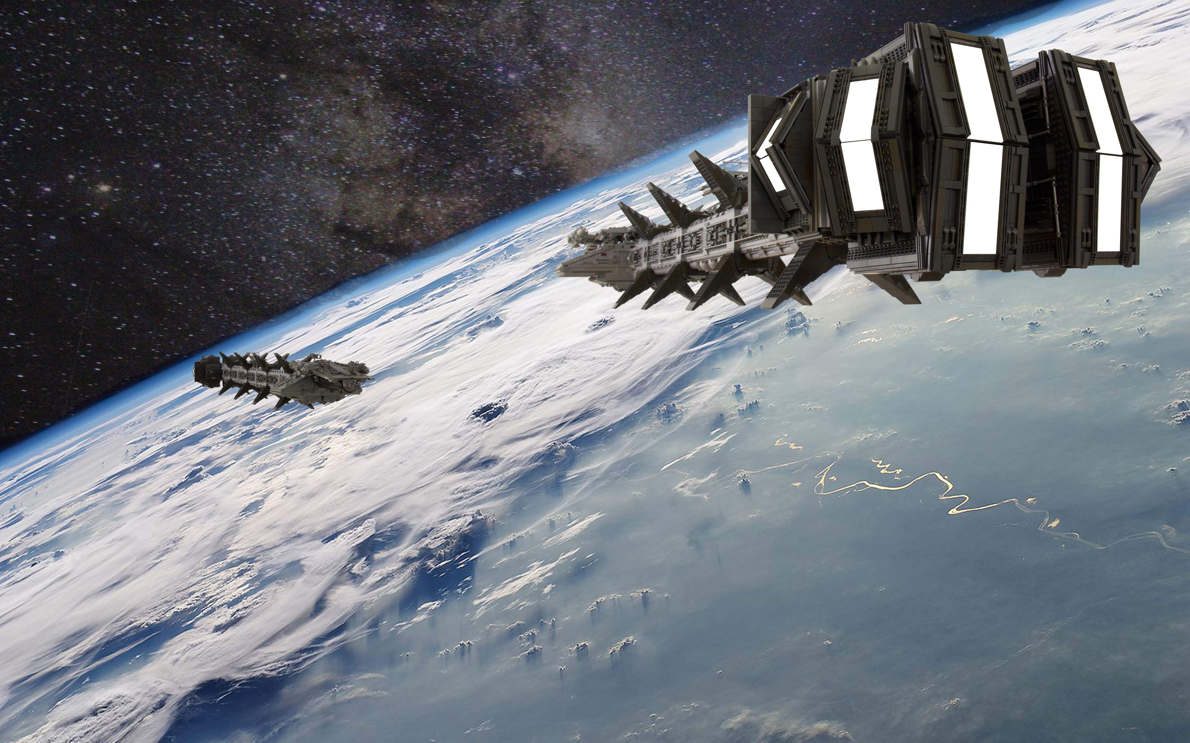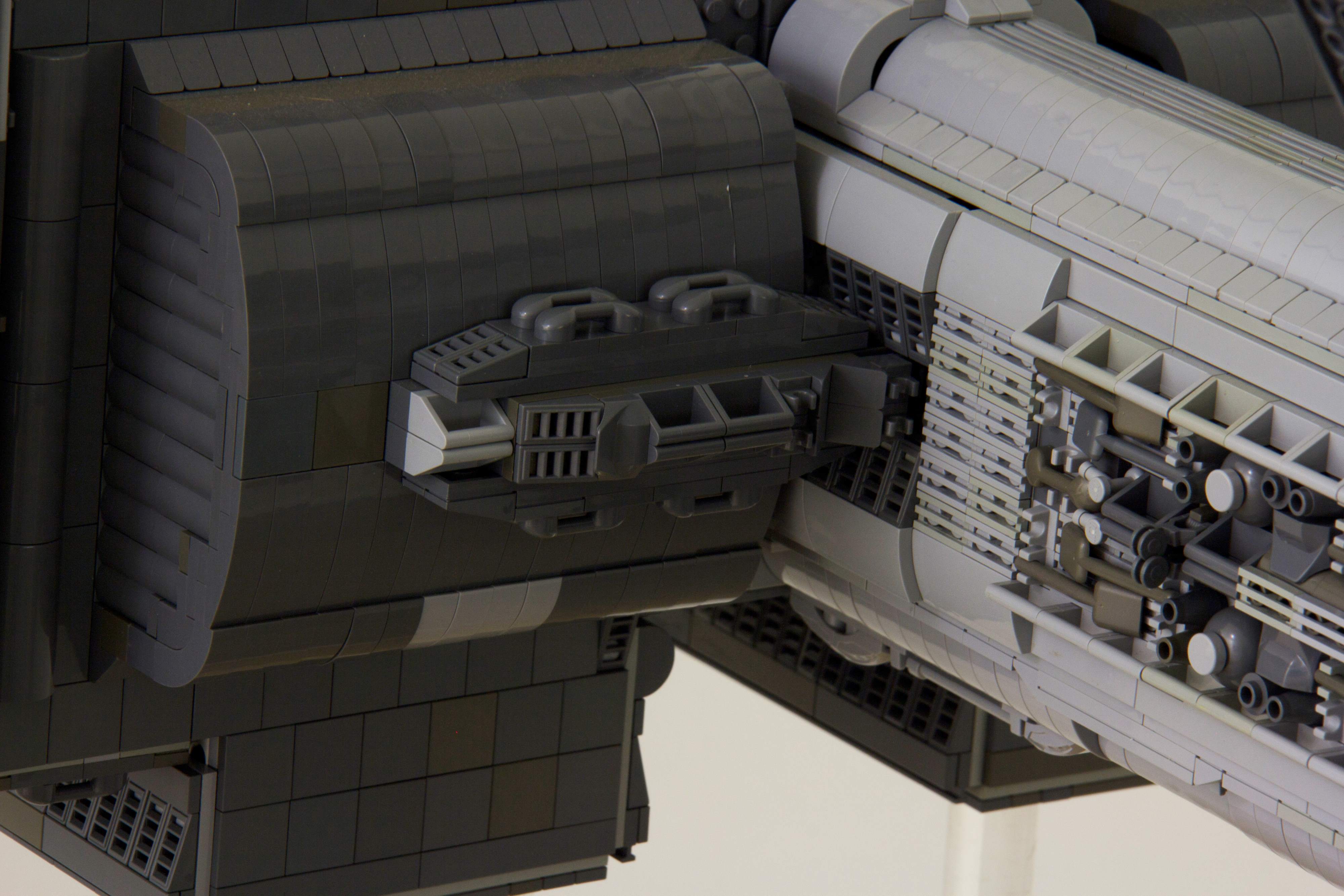 The massive arms have been retracted upwards to the rest position so when the cargo pods are set into place they lower clamping them together with the aid of super powerful electromagnets locking them into position.