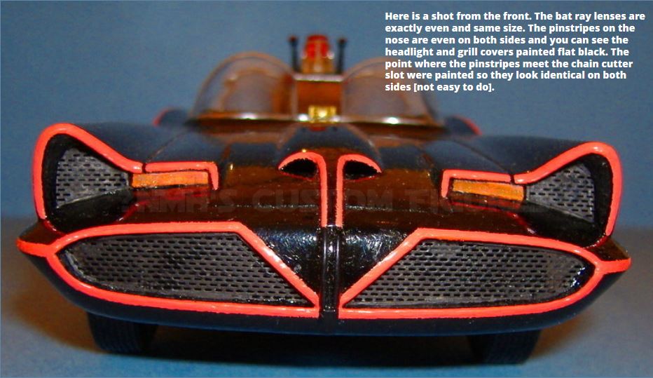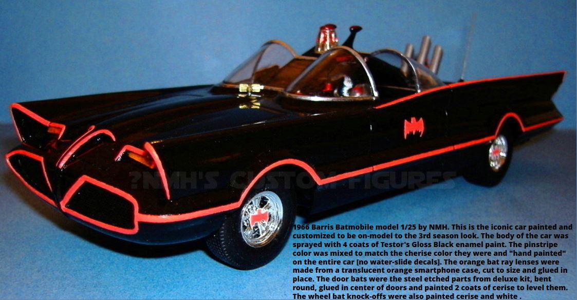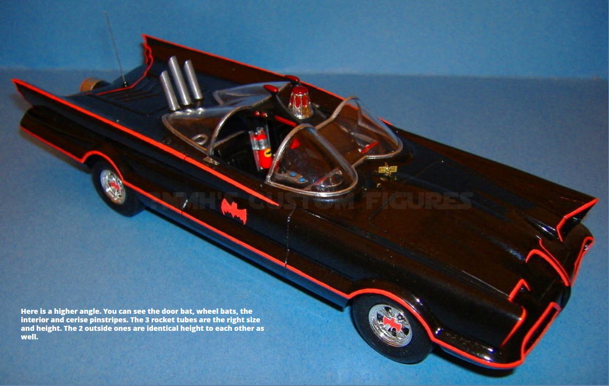 I just finished the Polar Lights and I thought would show it. I put a lot of thought into it before each step….and the engineering of the rocket tubes and antenna was complex….not just glued on top the car. This is actually my 3rd Batmobile…….. the first was a resin one, the second was the Hot Wheels 1/24 die cast that I repainted, but then realized it was 8 1/2 inches long and too small for my tastes, so at least I had a first run at mixing the Cherise, of which I remixed from scratch for this car, as mixed paint dries out in about a month. I ended up selling the Hot Wheel version on eBay. My site has shown to be number one on the Google, Bing and Yahoo Search Engines for the “1966 Batmobile Model”. I hope you enjoy this one.
