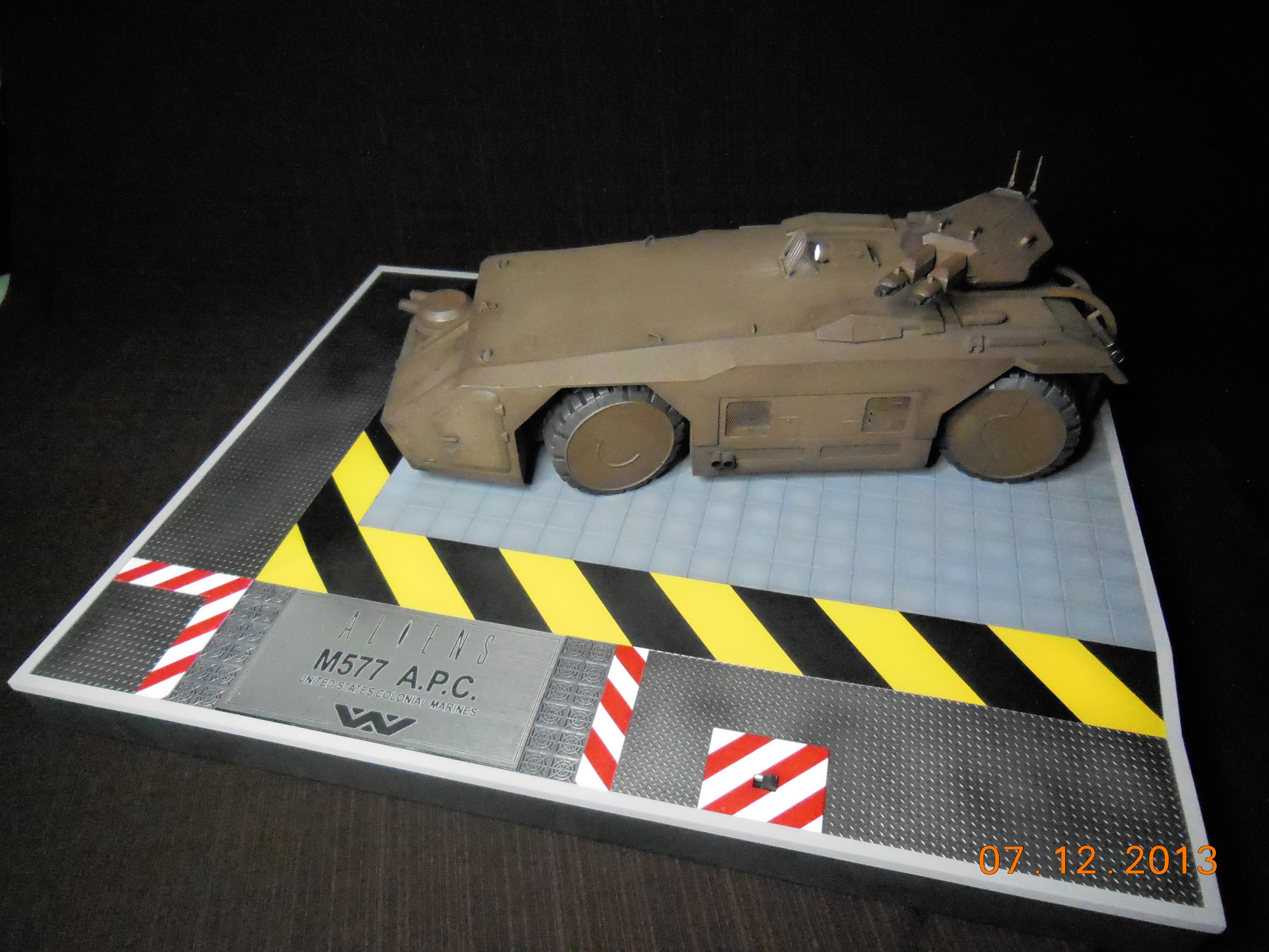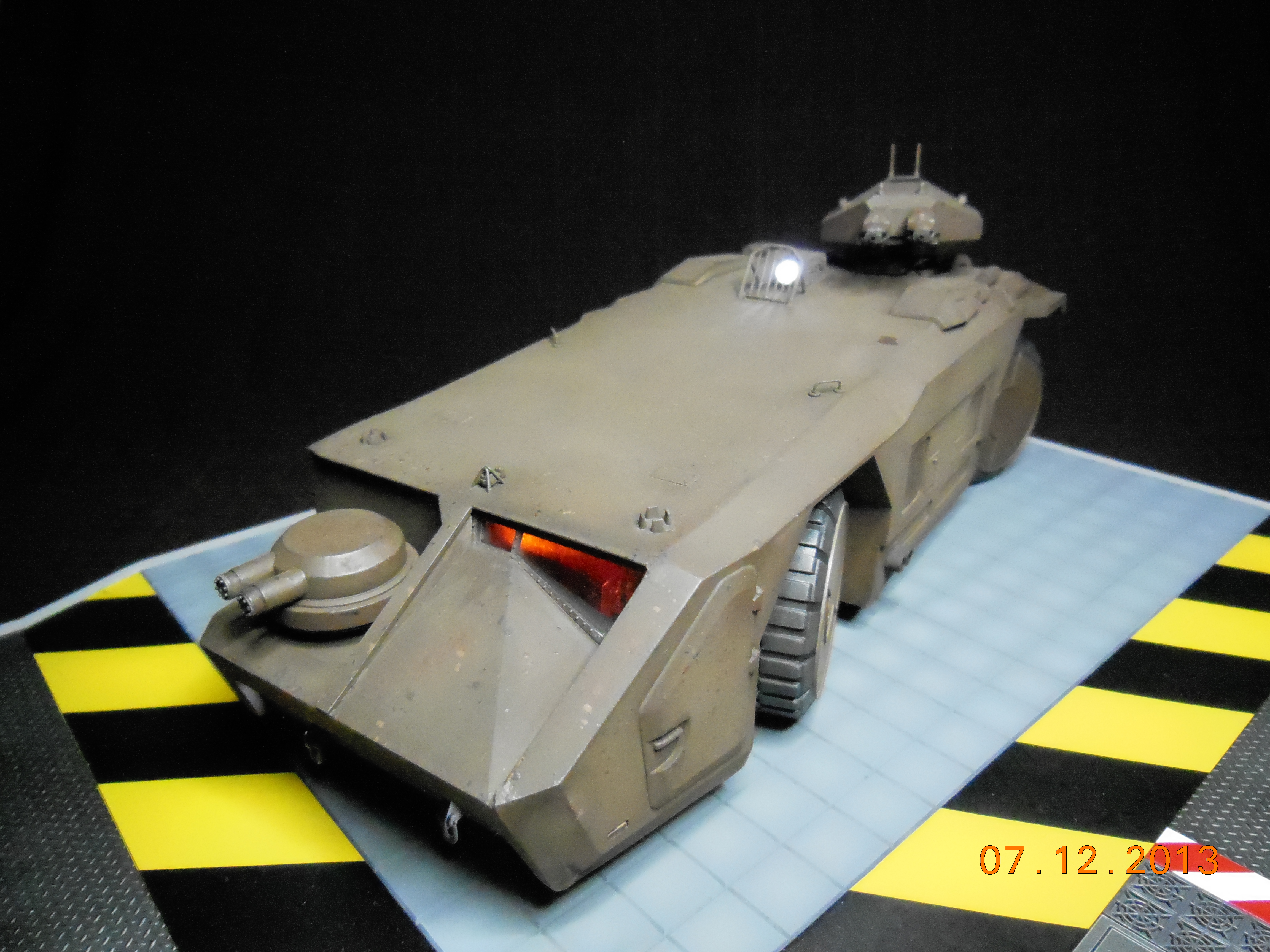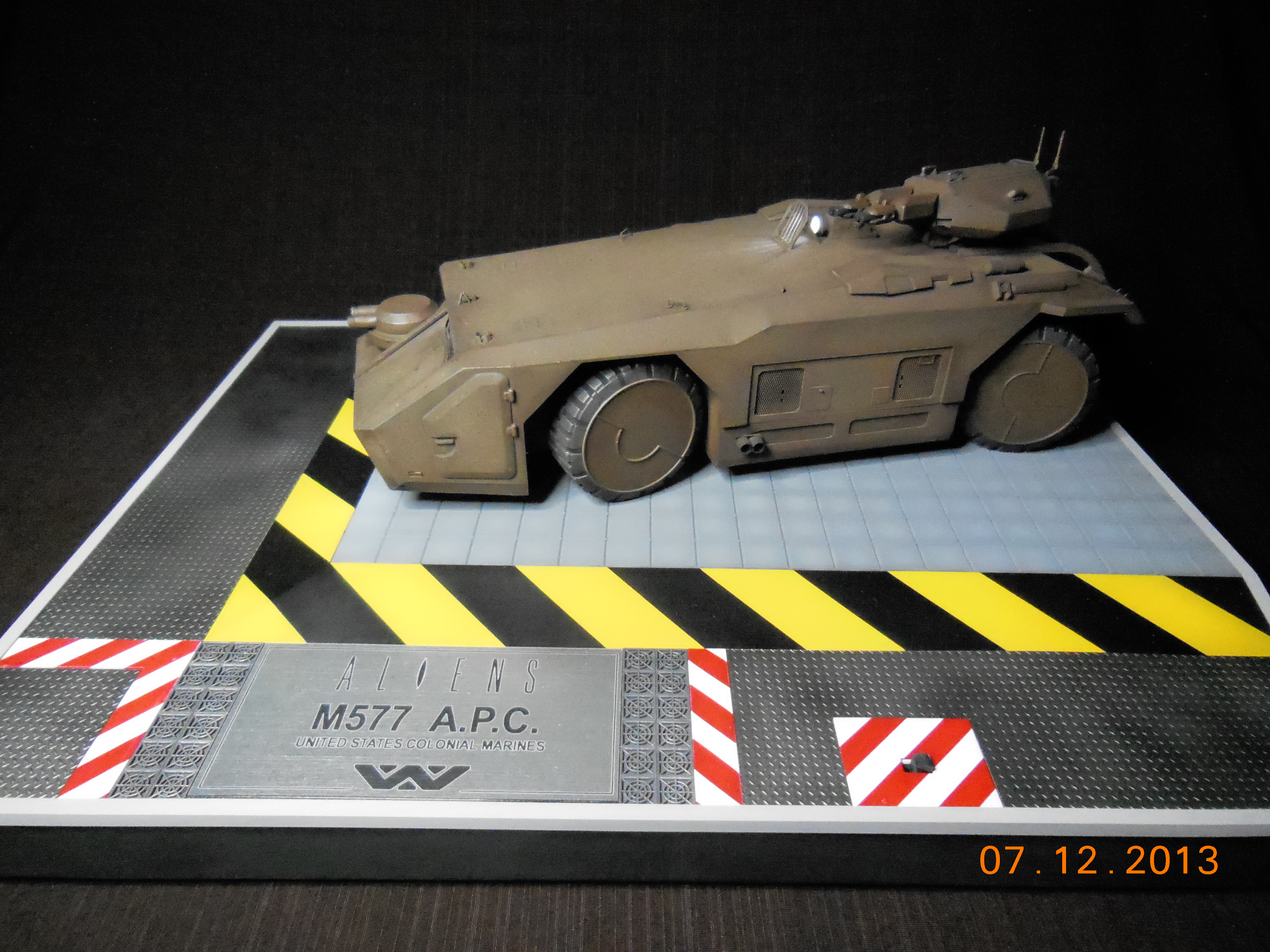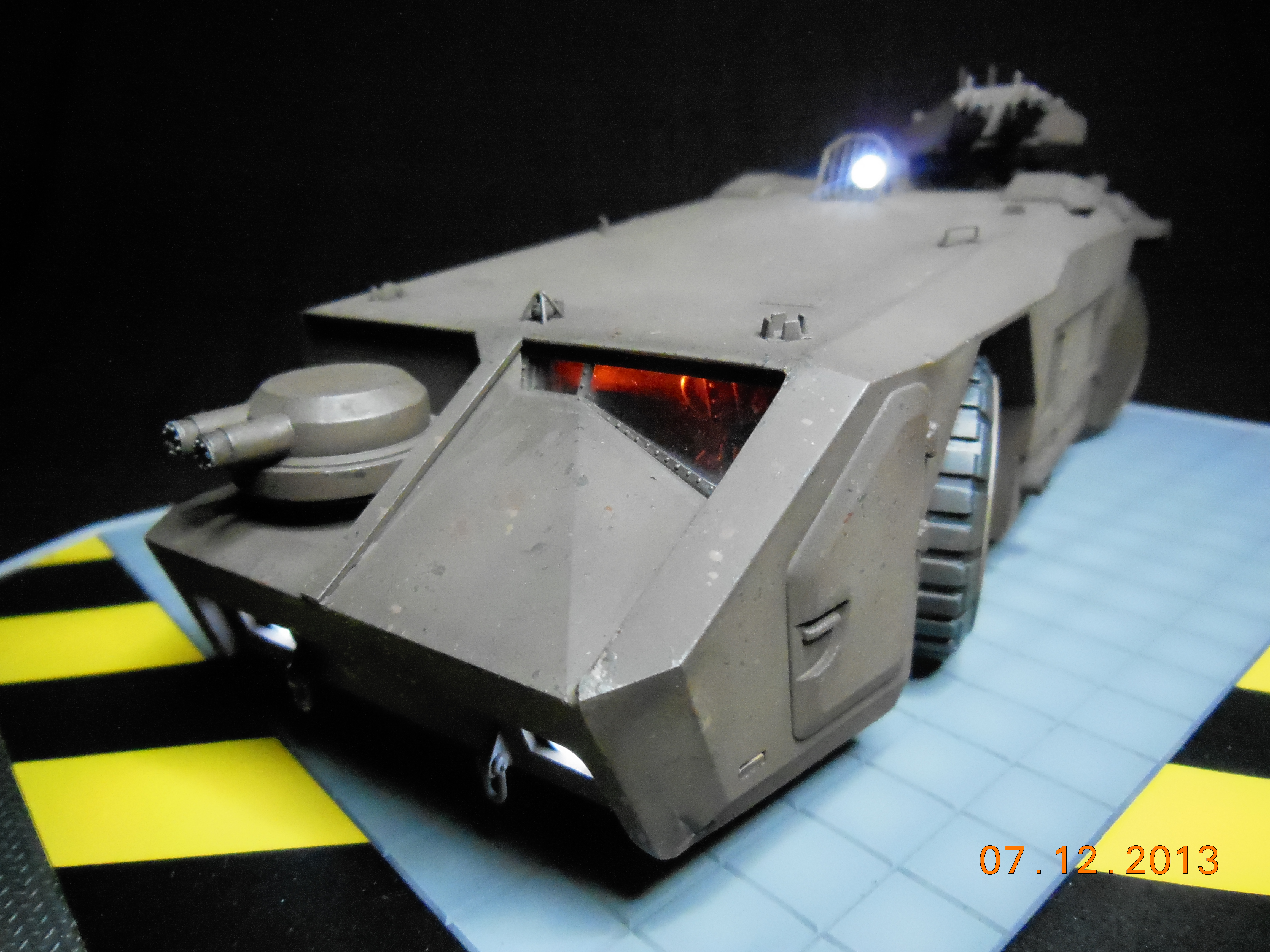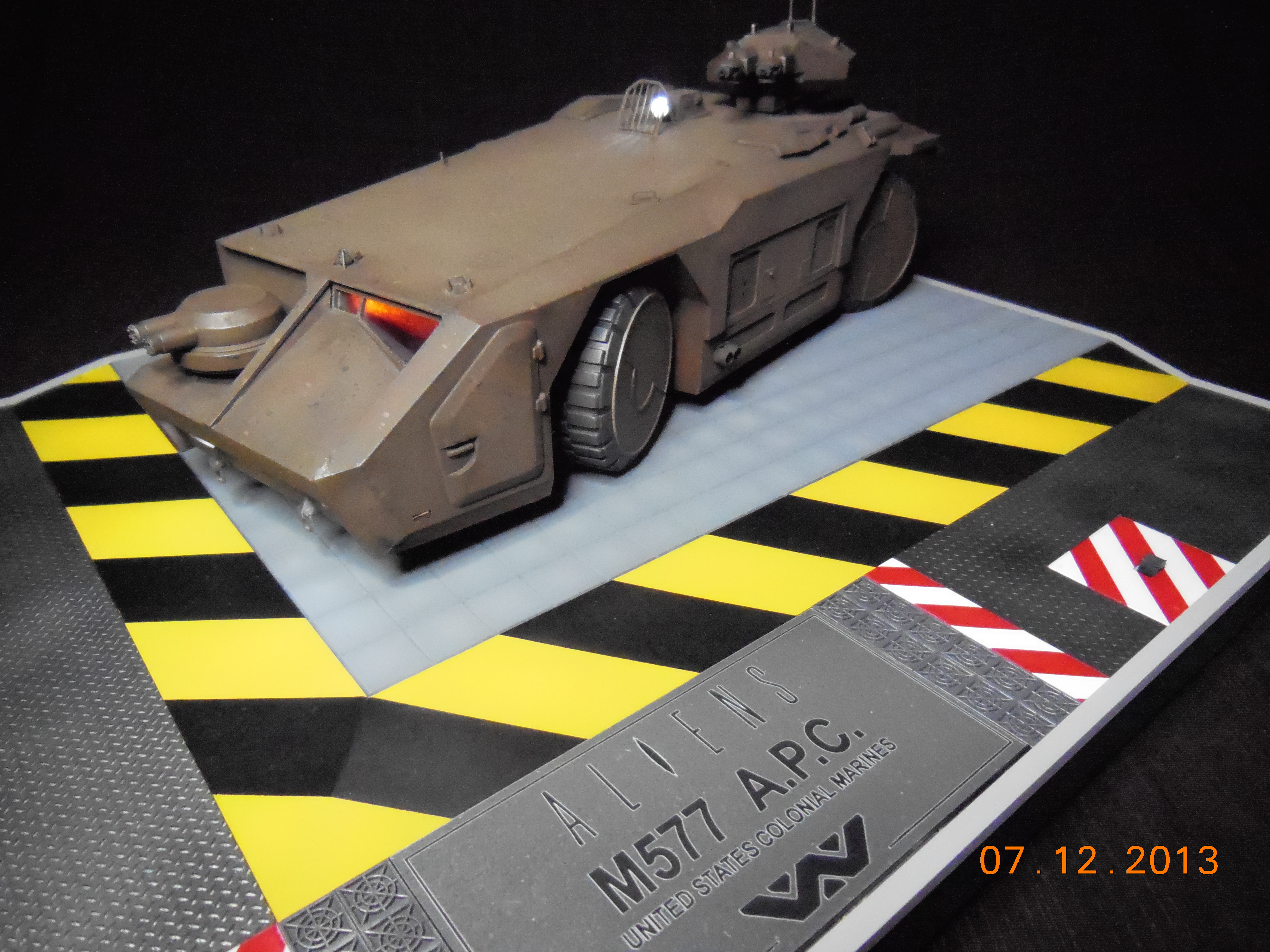 Trevor Alderson here. These are the photos of my latest model, the 1/35 scale APC from Aliens made by Halcyon. I did major modifications to this model with lots of scratch built areas including a complete interior, engine bays on the drivers side and rear, main door and suspension. Also includes lots of photo etch and custom LED lighting. The fit of this model kit is difficult, so much time was spent sanding and filling to get seamless joints. This was all topped off with a custom display base and name tag, the 9V power runs through the front left tire. Next up is the Spinner car from Blade Runner.