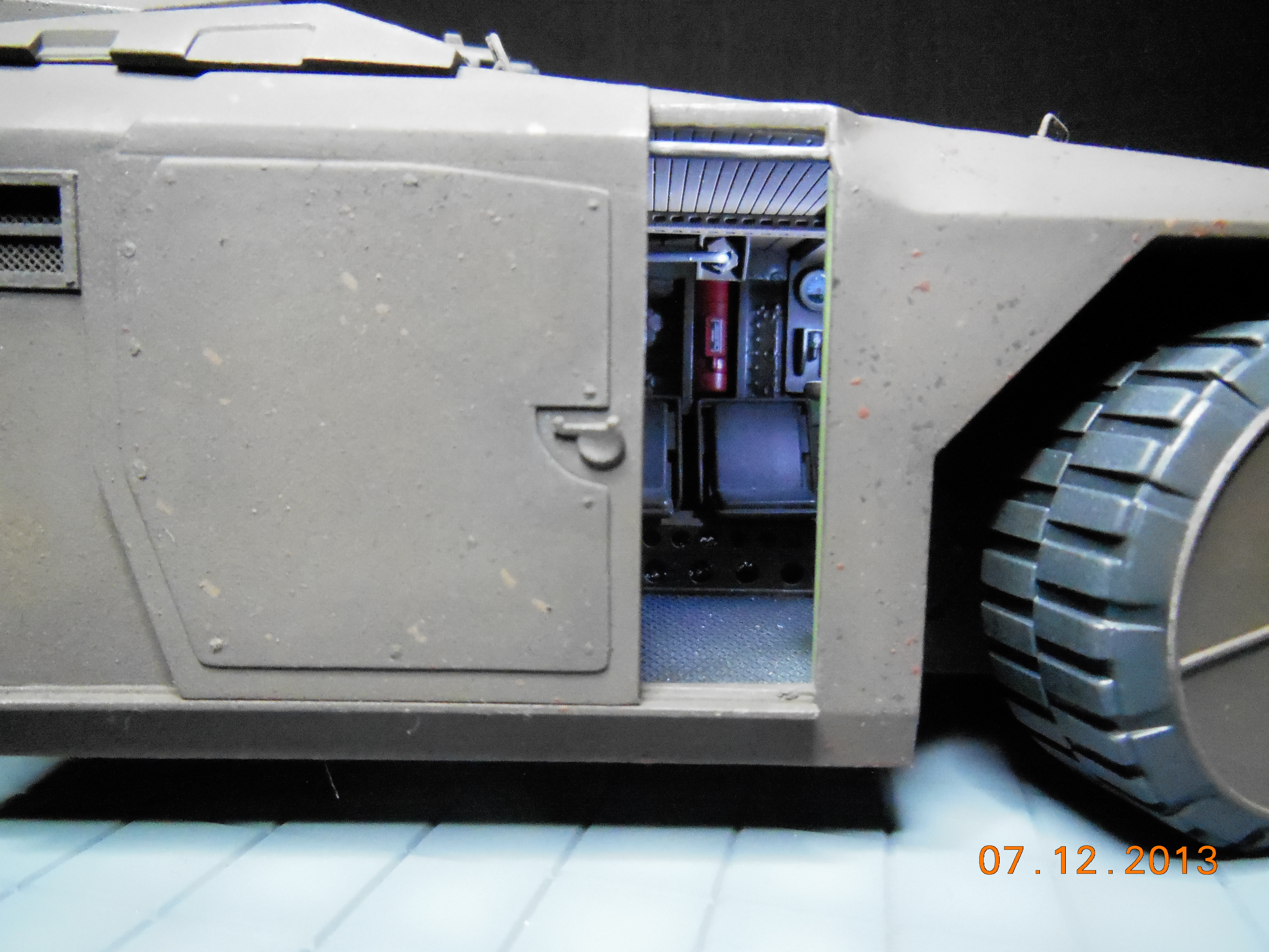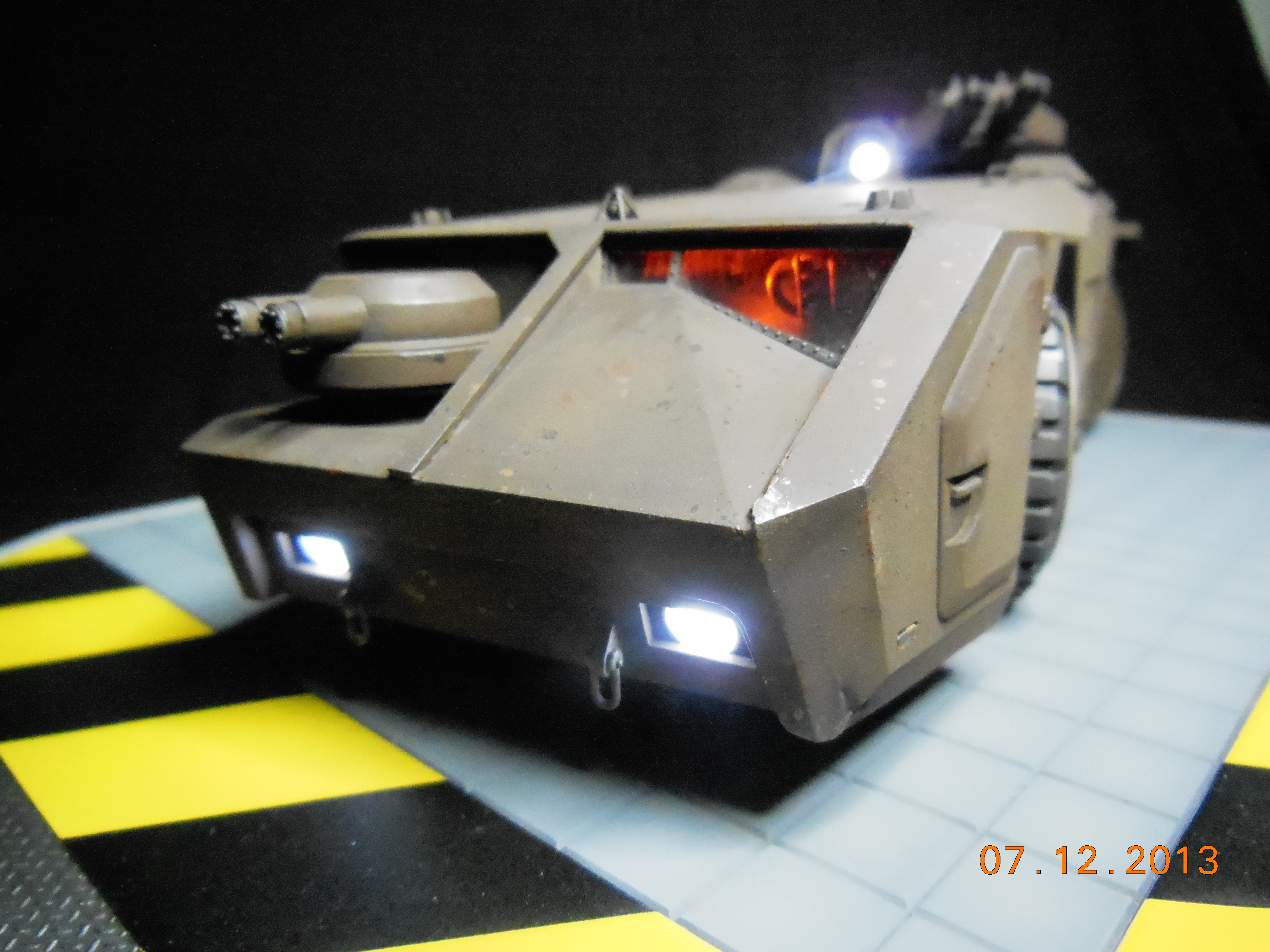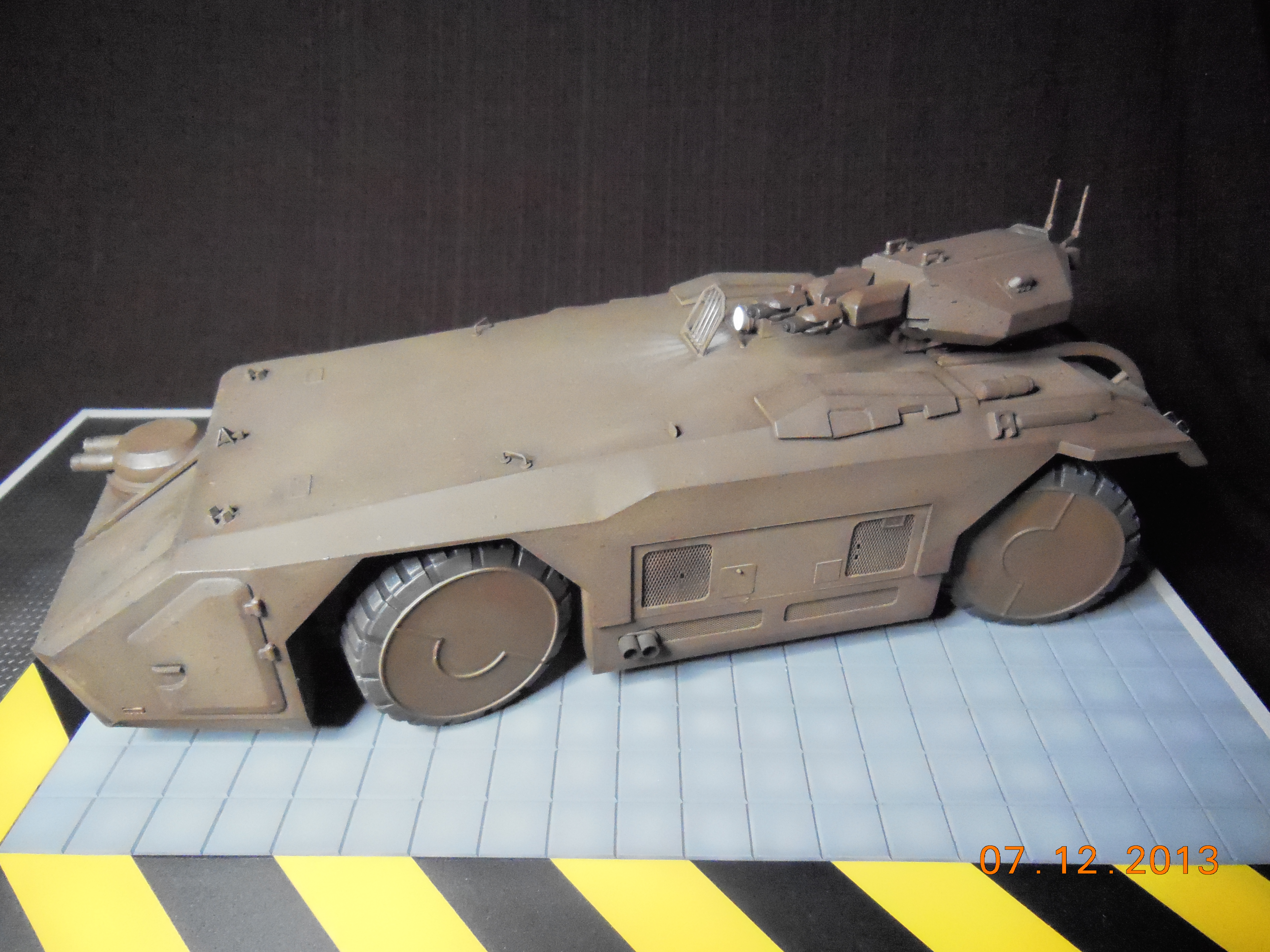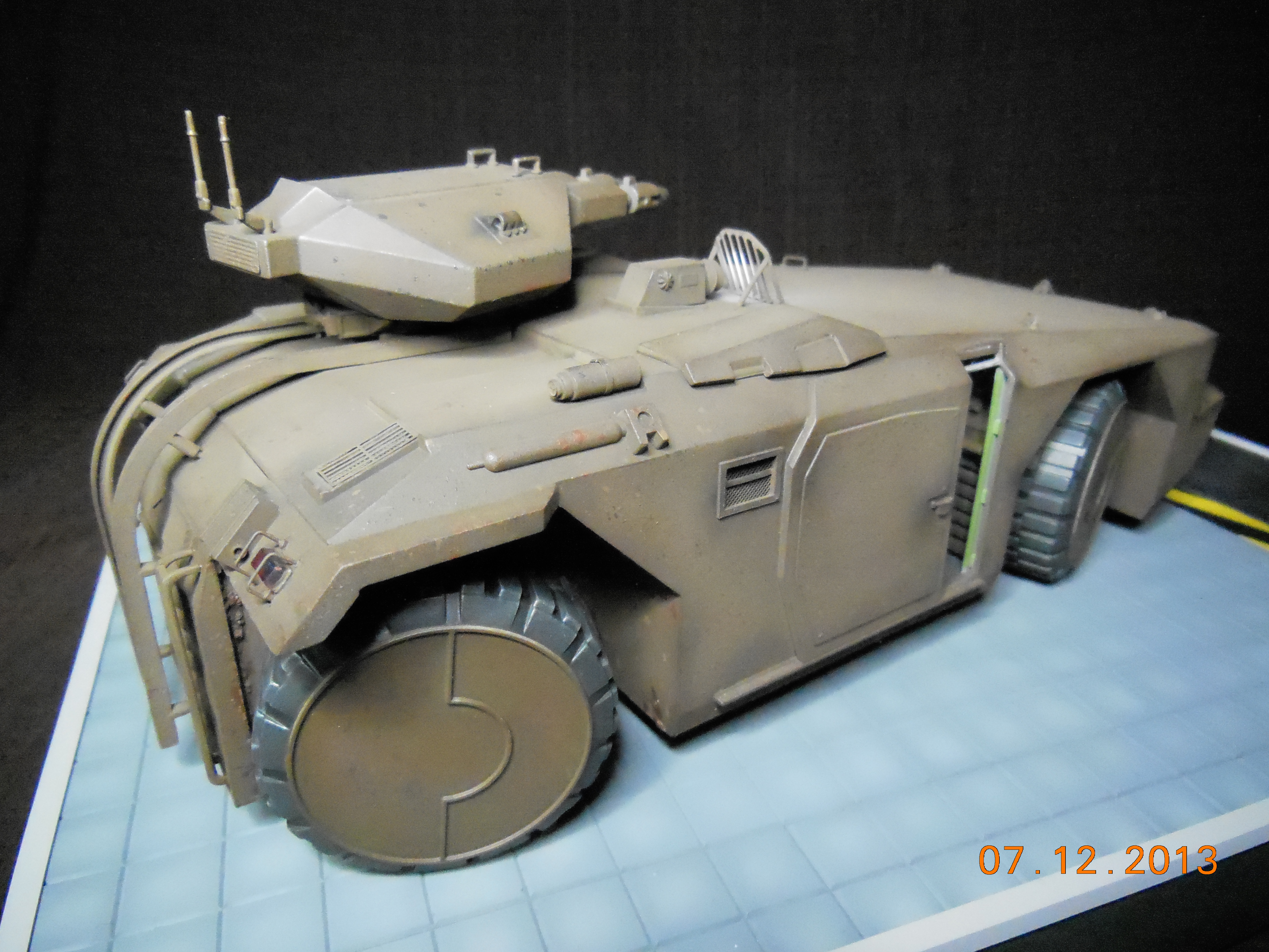 Trevor Alderson here. These are the photos of my latest model, the 1/35 scale APC from Aliens made by Halcyon. I did major modifications to this model with lots of scratch built areas including a complete interior, engine bays on the drivers side and rear, main door and suspension. Also includes lots of photo etch and custom LED lighting. The fit of this model kit is difficult, so much time was spent sanding and filling to get seamless joints. This was all topped off with a custom display base and name tag, the 9V power runs through the front left tire. Next up is the Spinner car from Blade Runner.