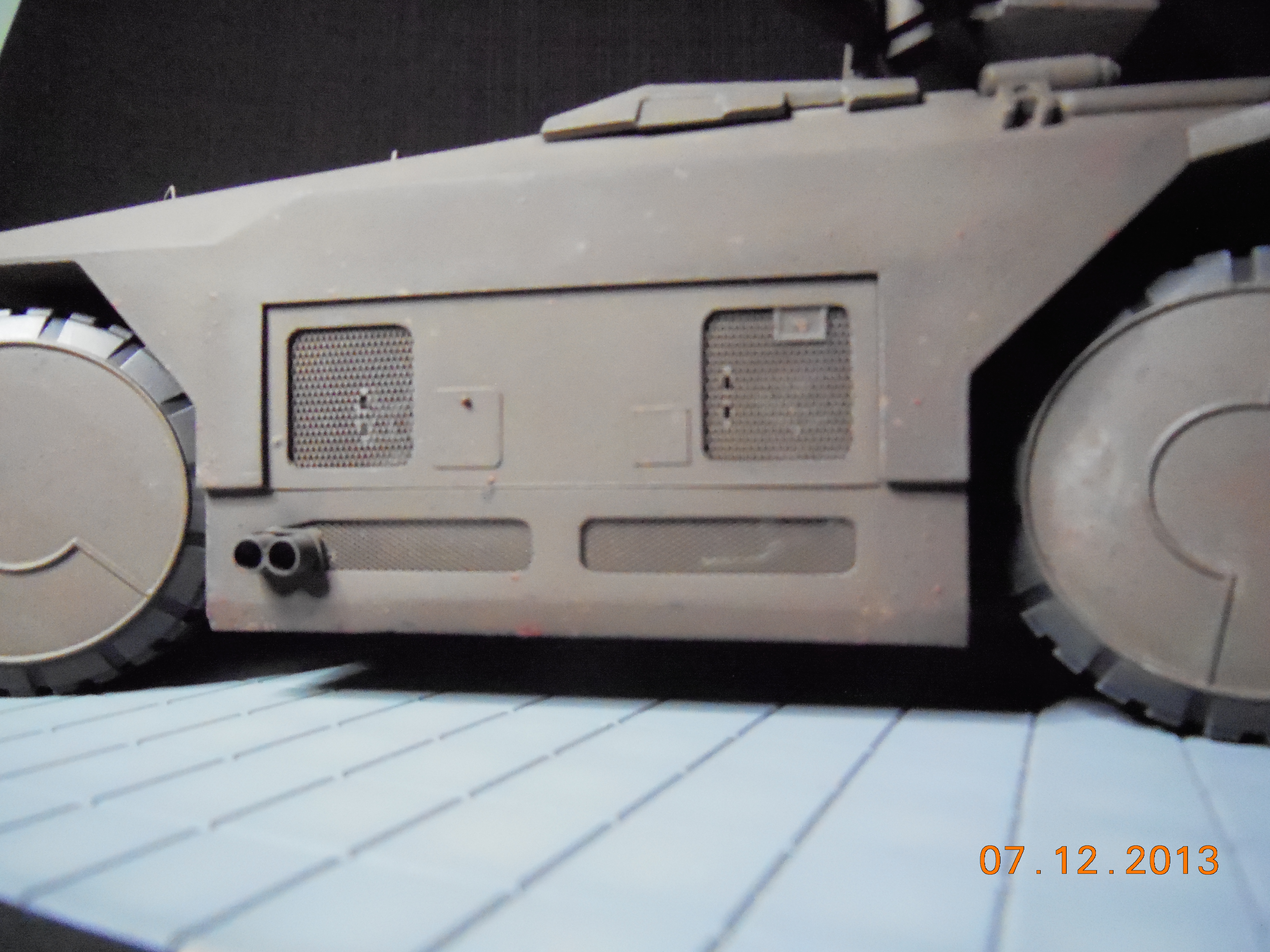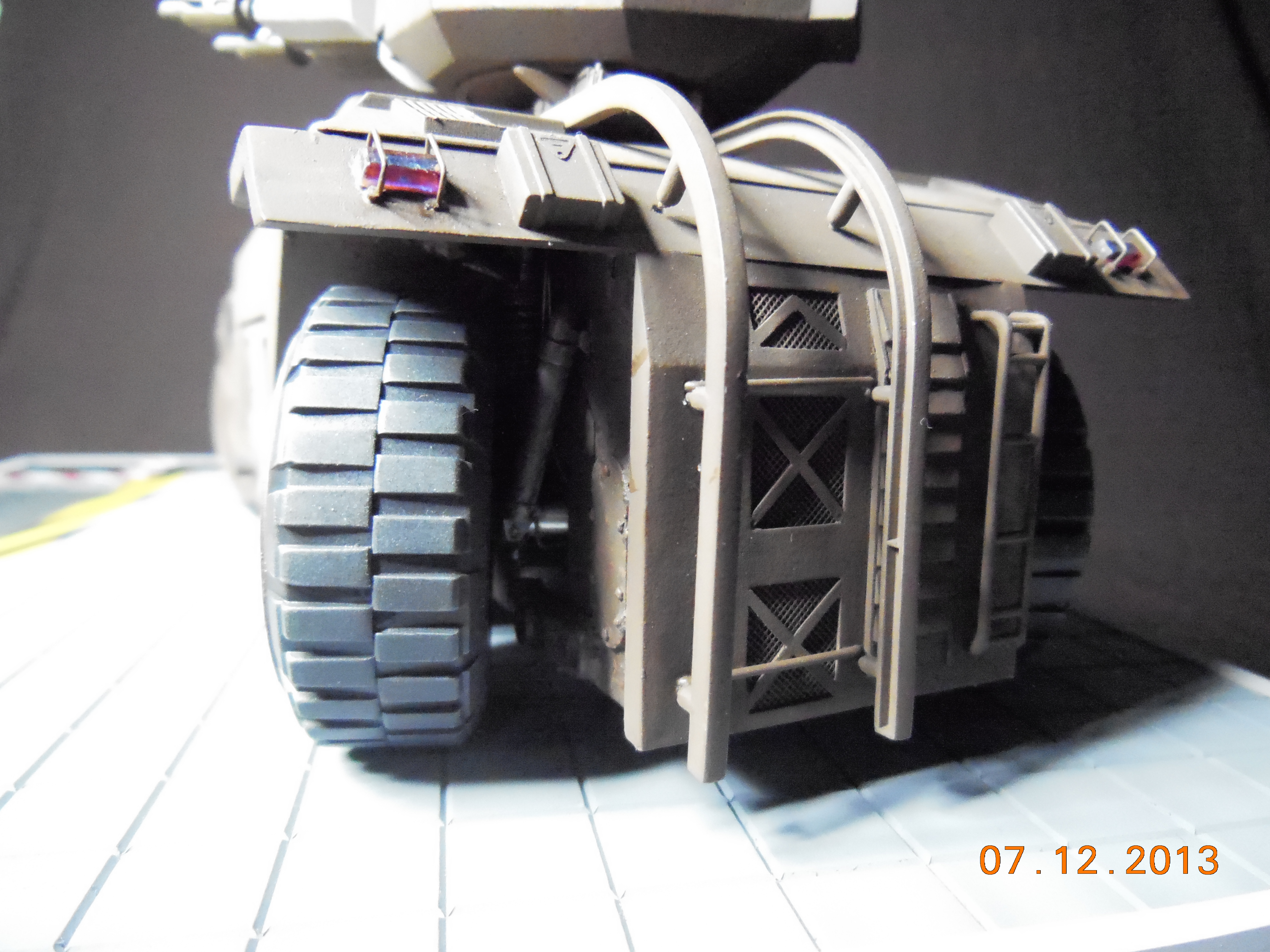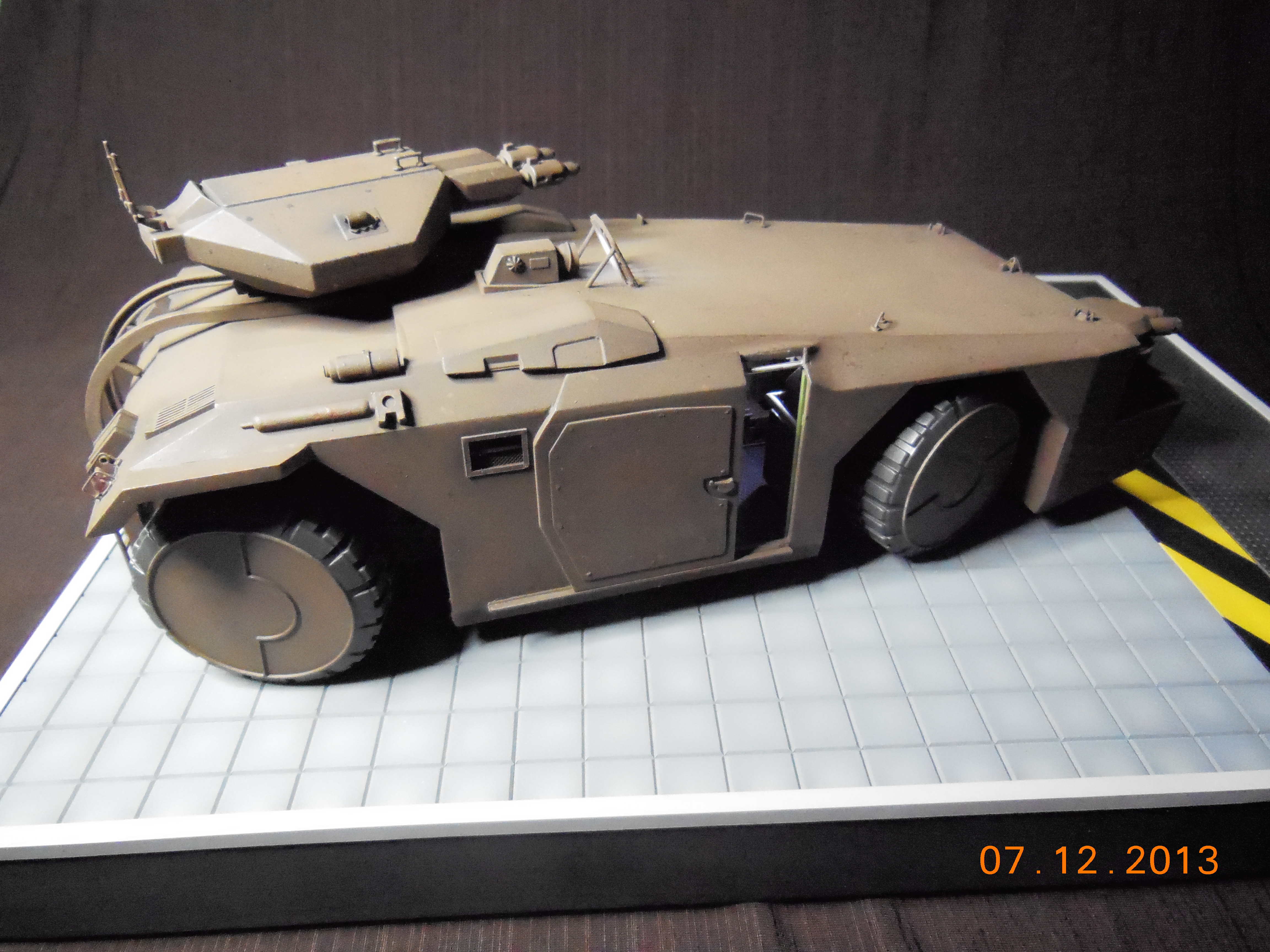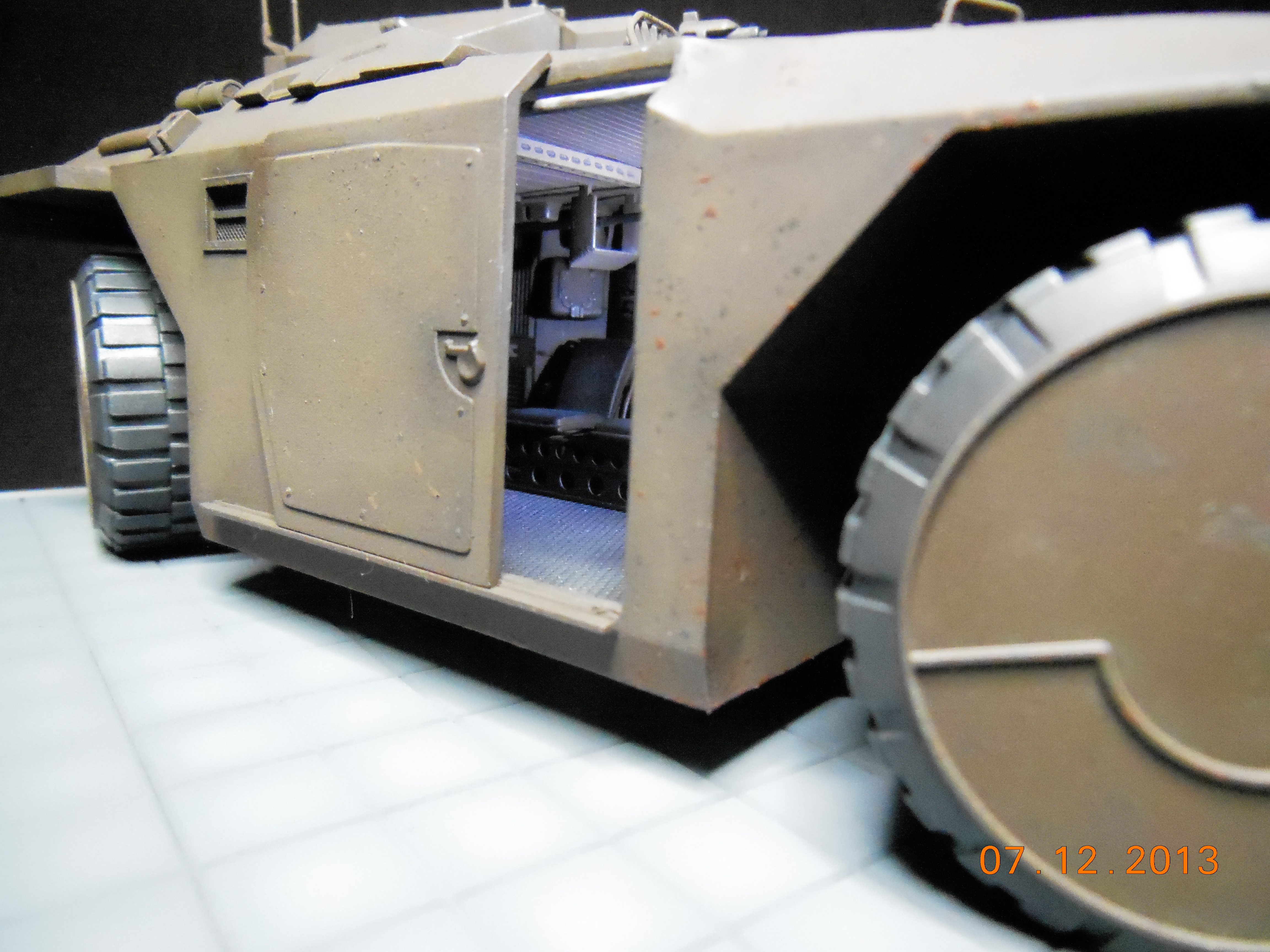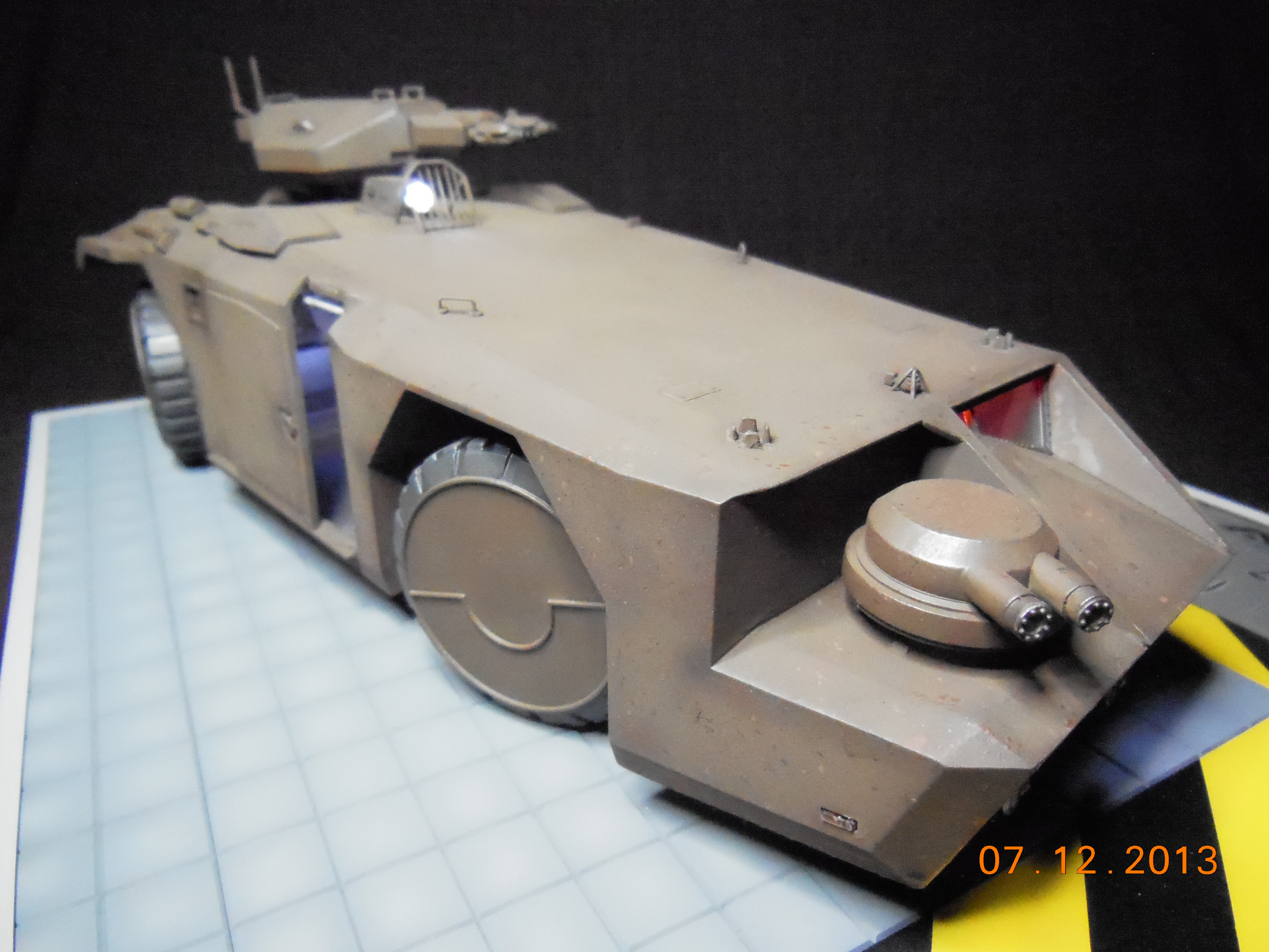 Trevor Alderson here. These are the photos of my latest model, the 1/35 scale APC from Aliens made by Halcyon. I did major modifications to this model with lots of scratch built areas including a complete interior, engine bays on the drivers side and rear, main door and suspension. Also includes lots of photo etch and custom LED lighting. The fit of this model kit is difficult, so much time was spent sanding and filling to get seamless joints. This was all topped off with a custom display base and name tag, the 9V power runs through the front left tire. Next up is the Spinner car from Blade Runner.