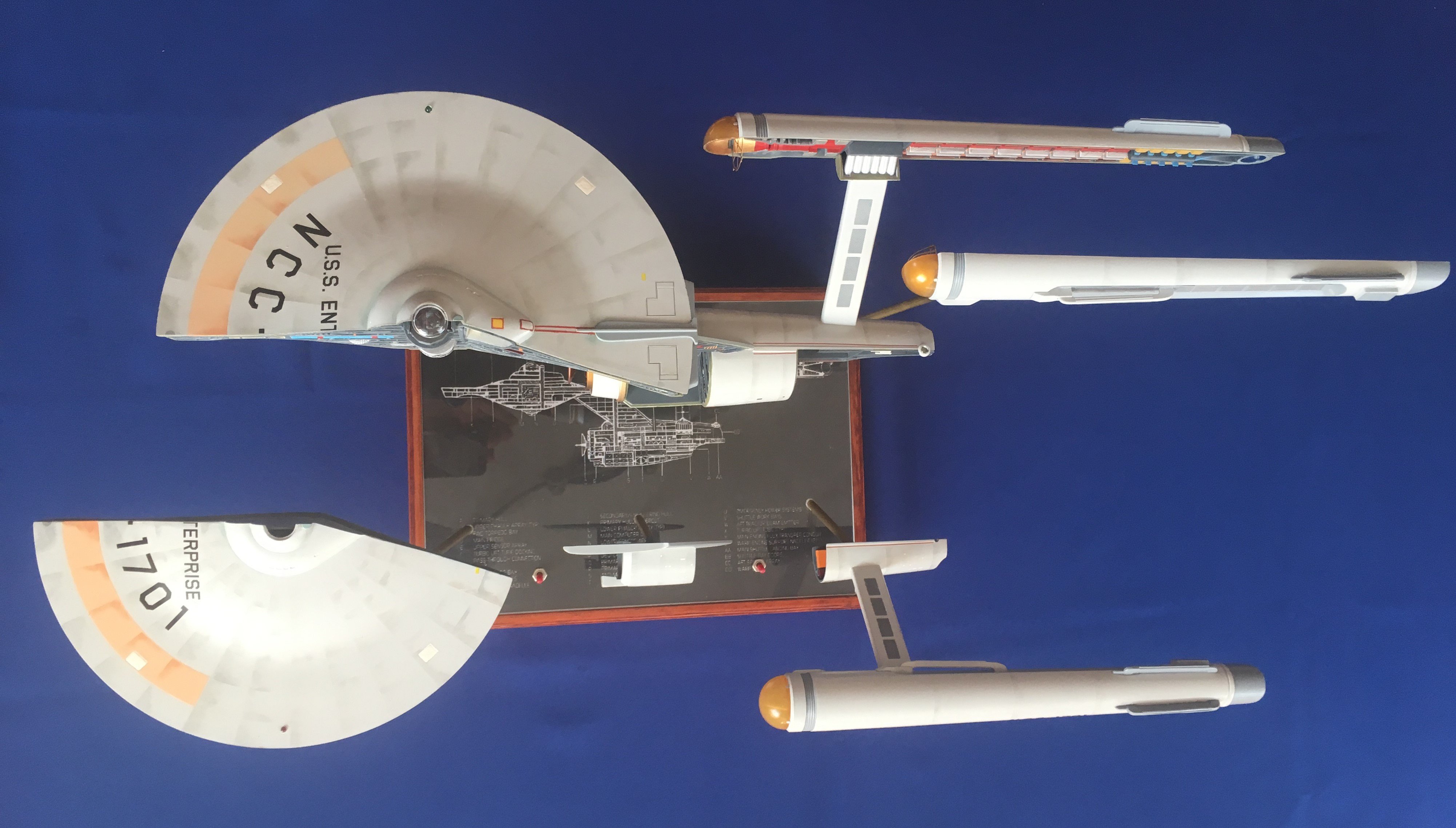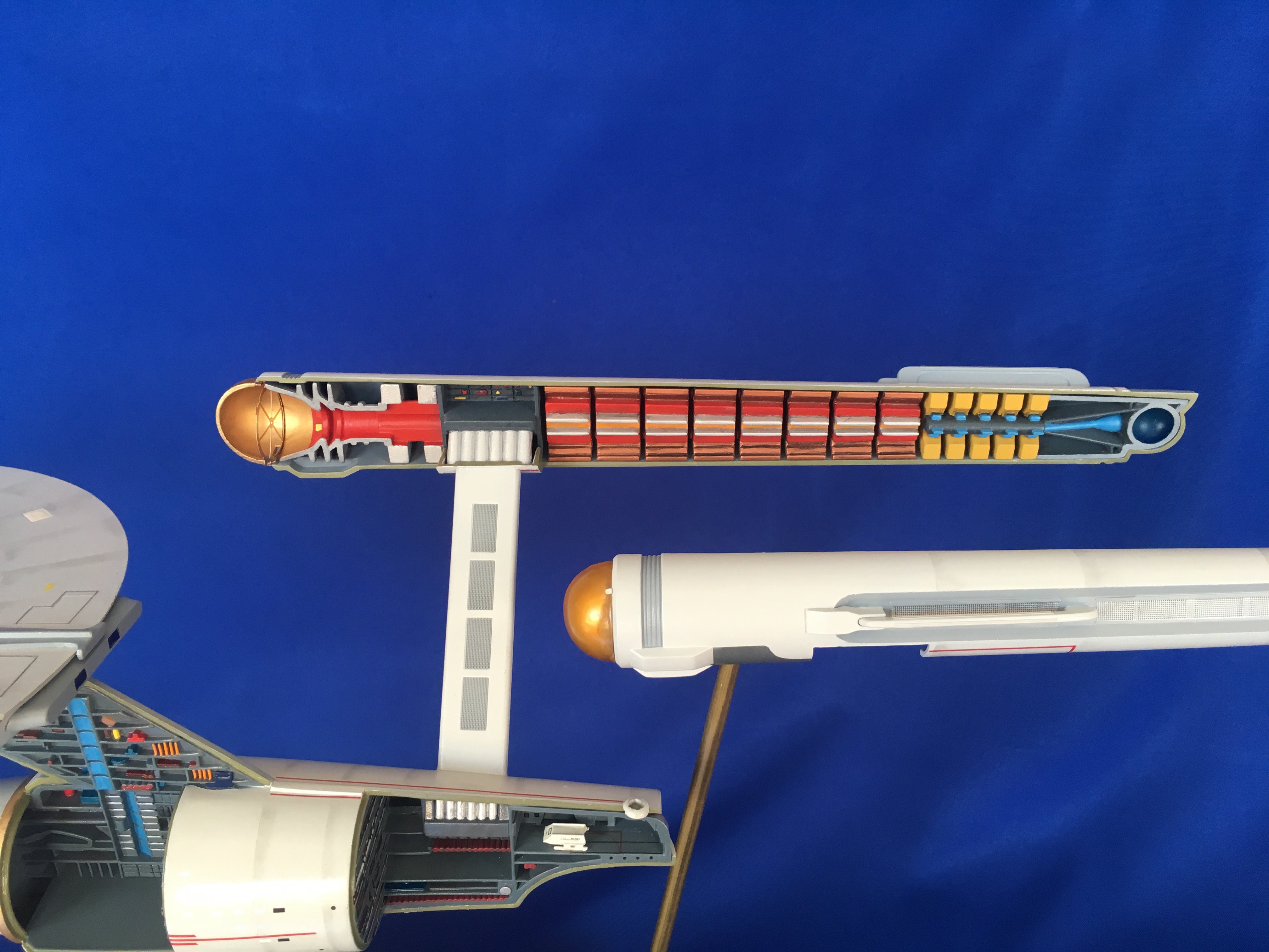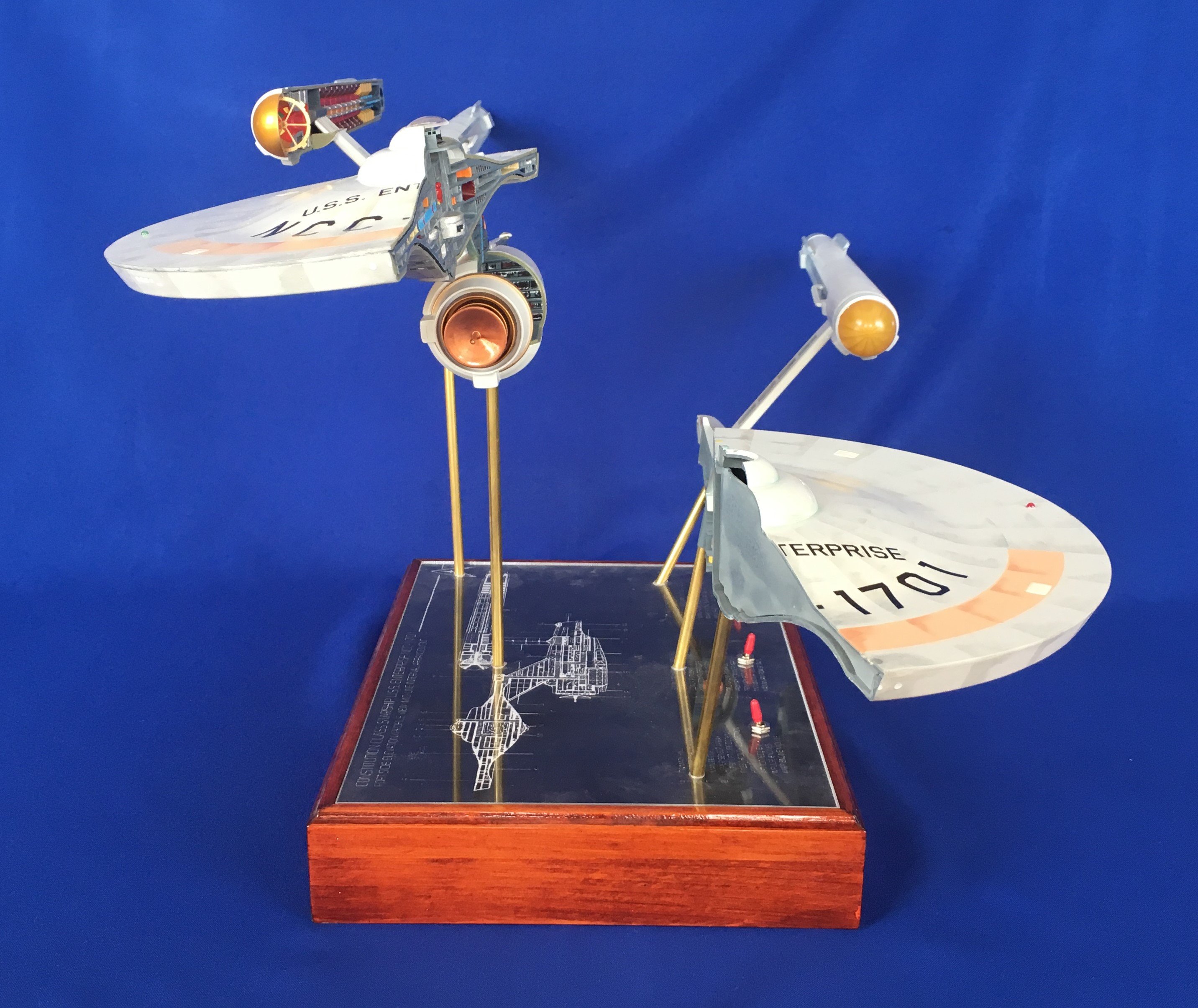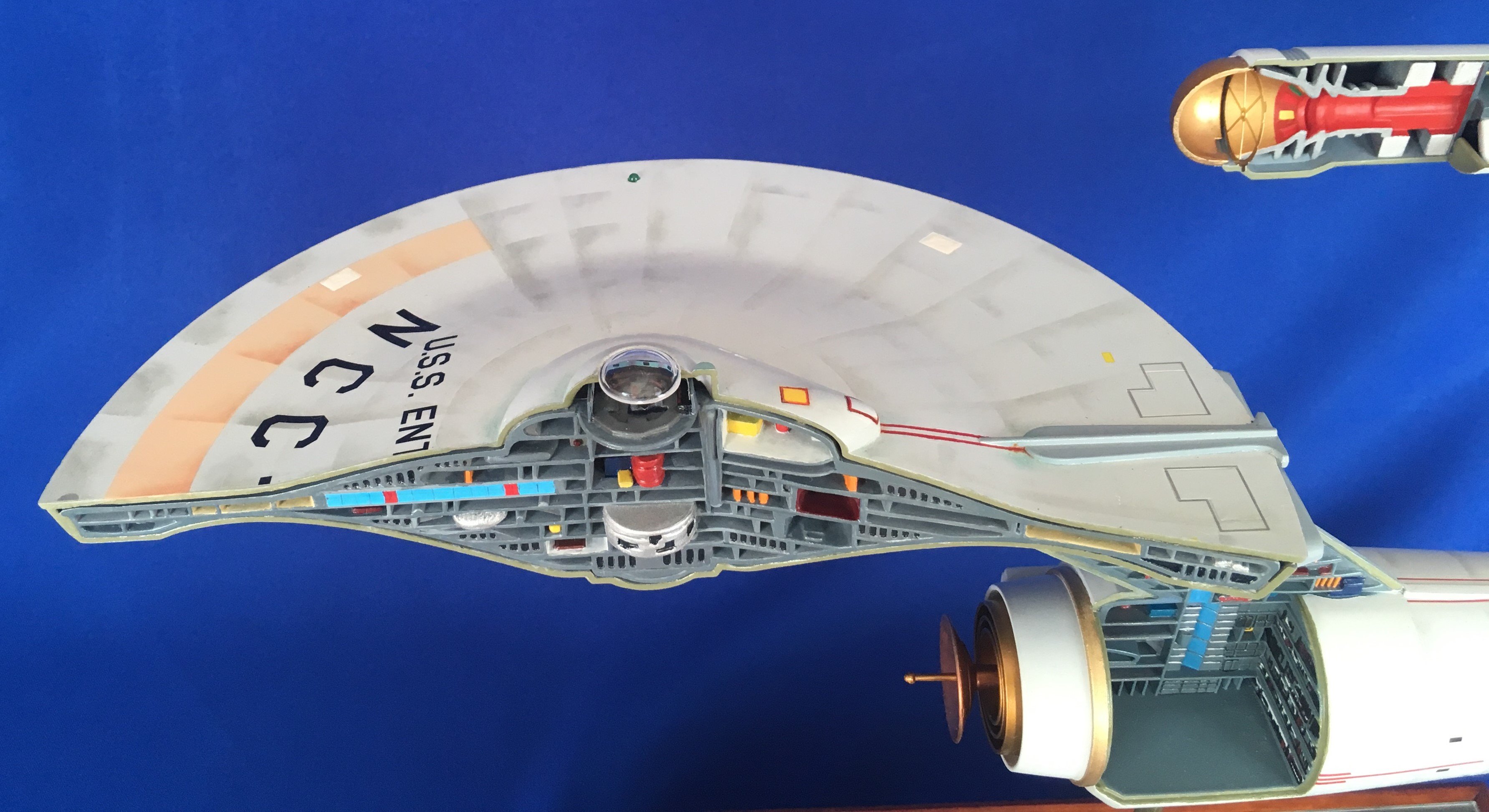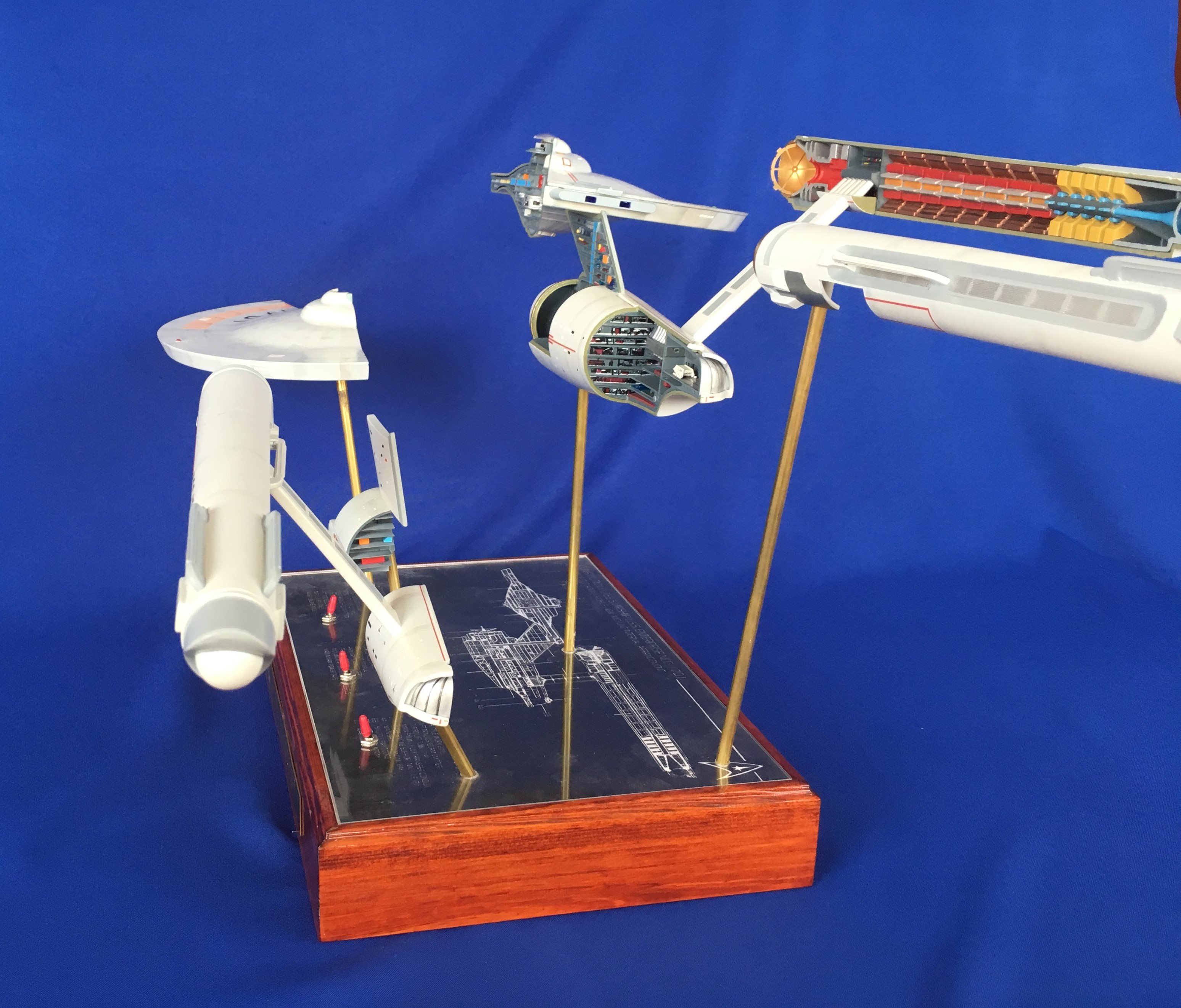 Artist Géza Sági has done wonderful work with this AMT Cutaway Enterprise! It is very clean and has a highly detailed paint job! This artist’s display of this, and the fantastic base, is top notch! I would love to see this done on a 1/2 studio scale Enterprise. Géza, you may have just sparked something in me to make that happen my friend. I love this! Excellent work!