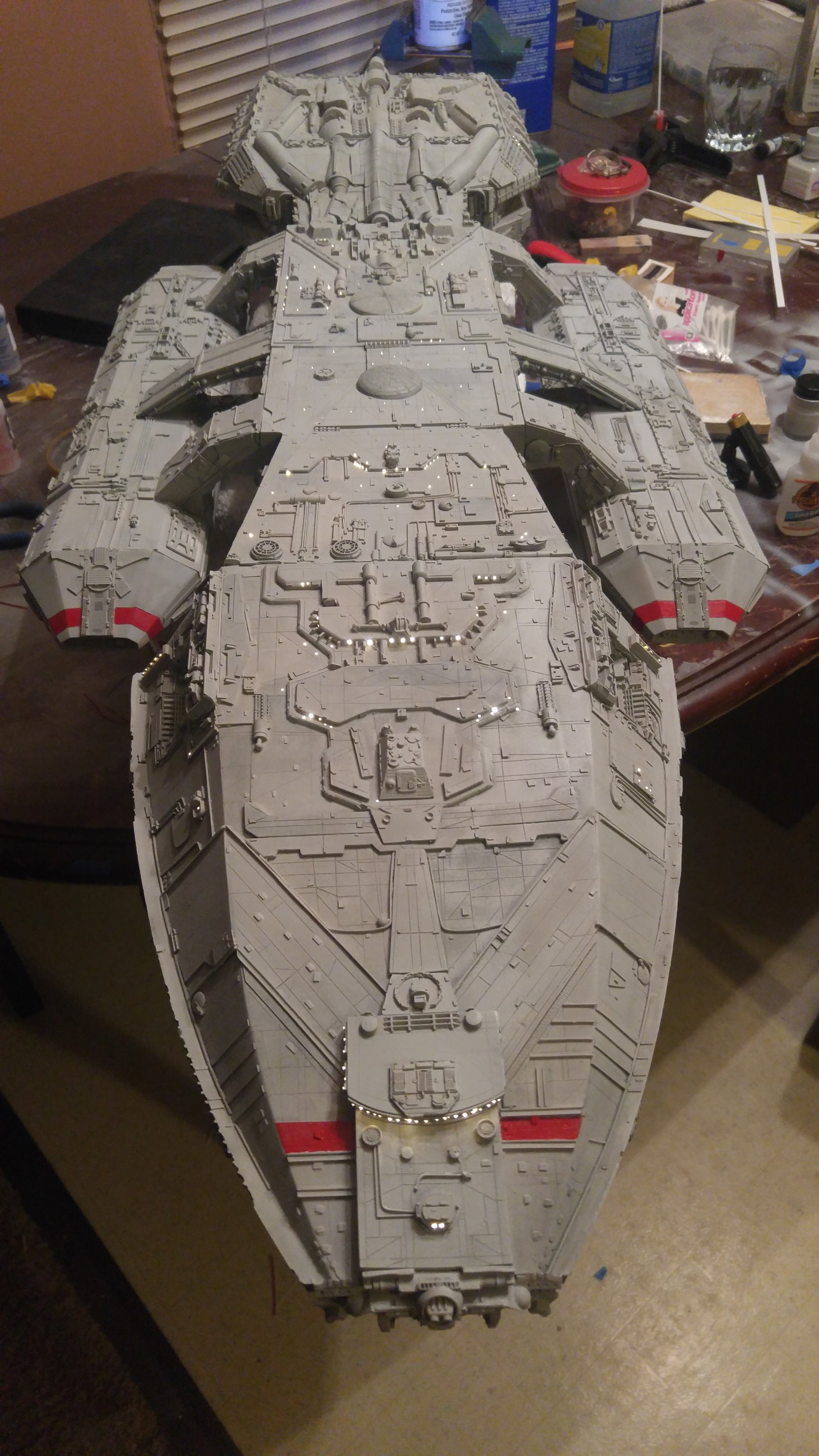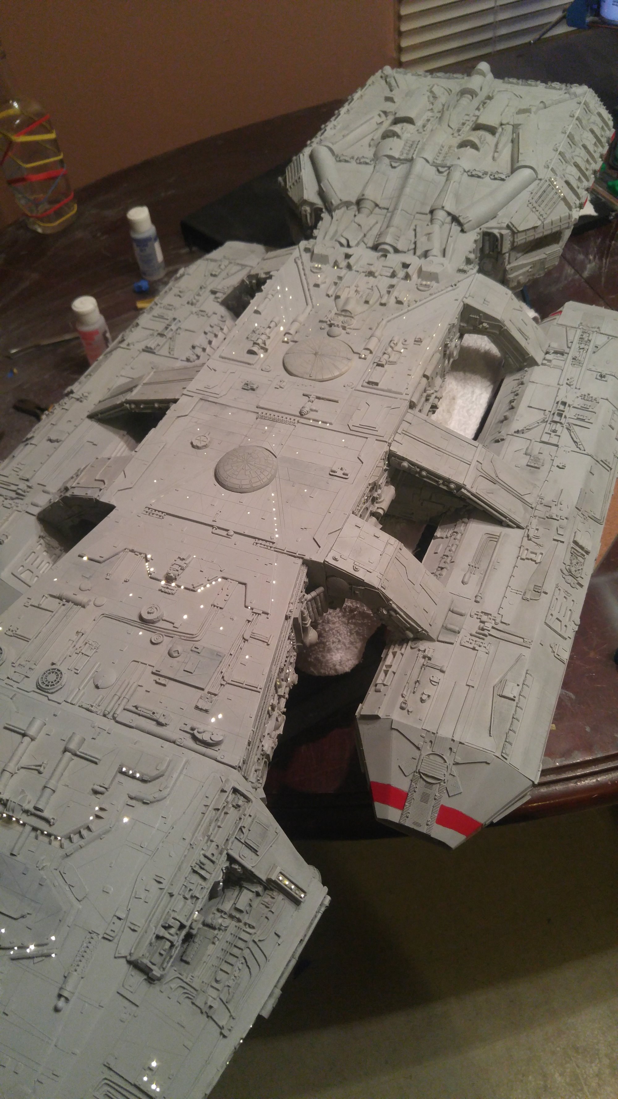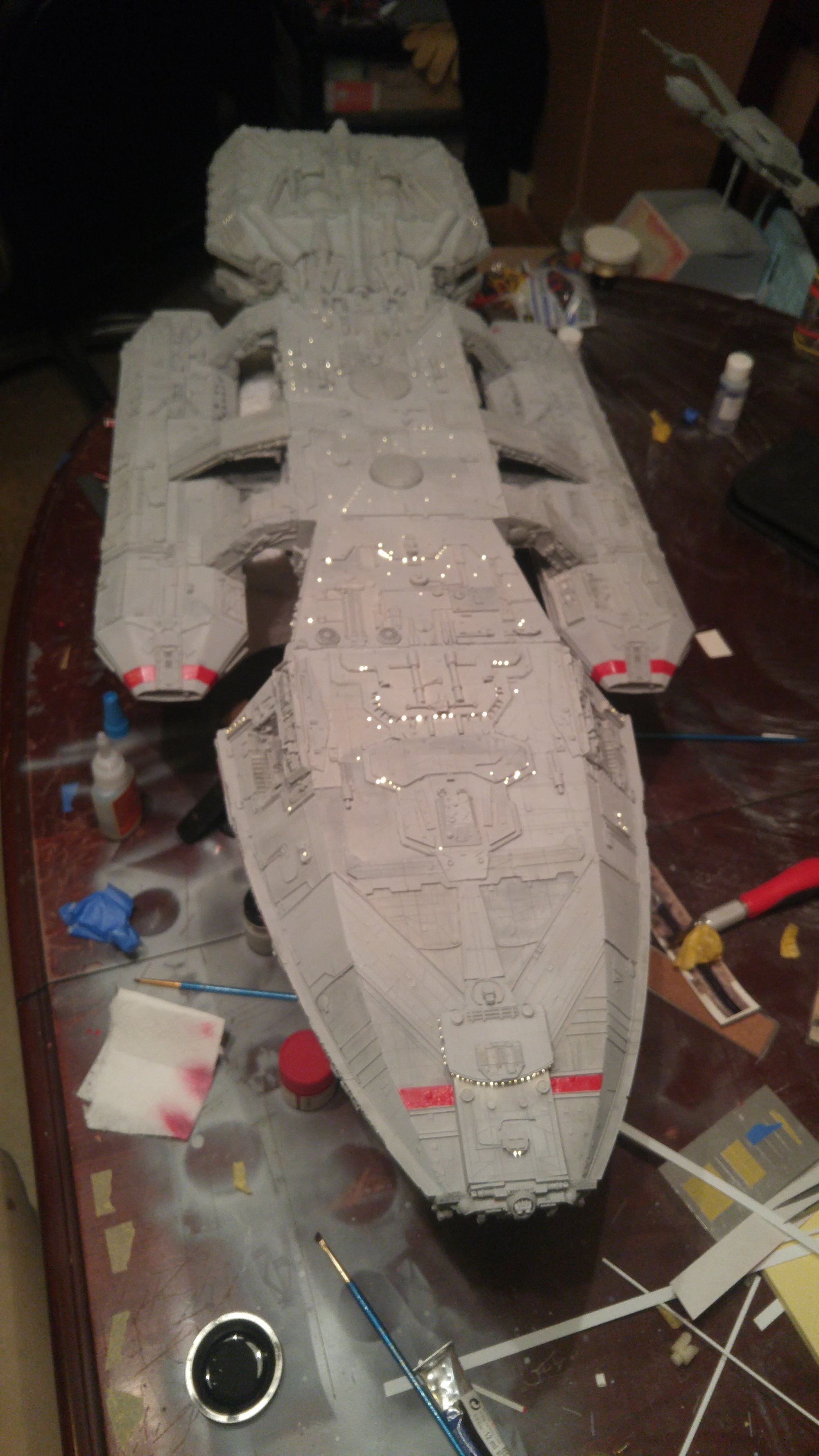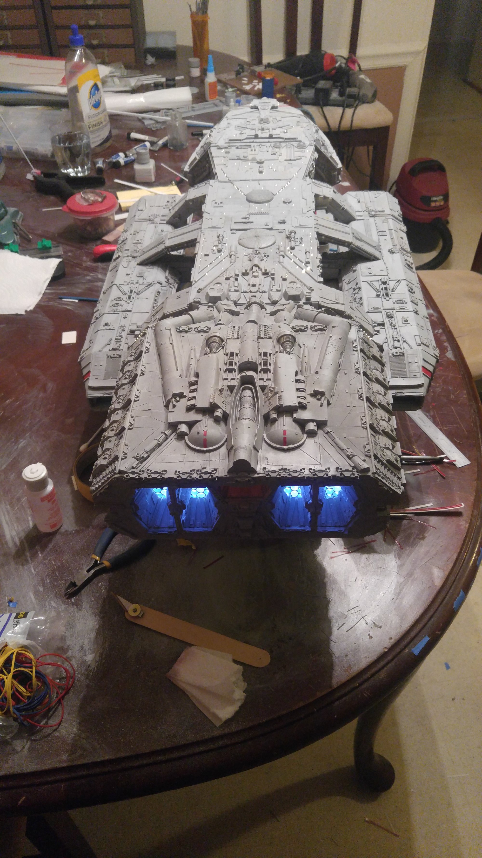 1/2 studio scale Salzo Galactica build and painted to client specs. The landing bays have full interiors and lighting, with vipers, via the randy cooper Interior kit. There are sequential lights at the entrance of both bays as well. All of the lighting is internal, battery powered via a 9.7 v rc car battery, Power is driven by a Magnet switch under the larger of the two domes. @x of the domes were painted for the client so that he could display it with or without lights. The smaller front dome is removable to allow access to the charge port for the battery. A Glass mirror top base was designed by myself and made by Lazerfire Creations for the display. I unfortunately have no images of the final display at this time.