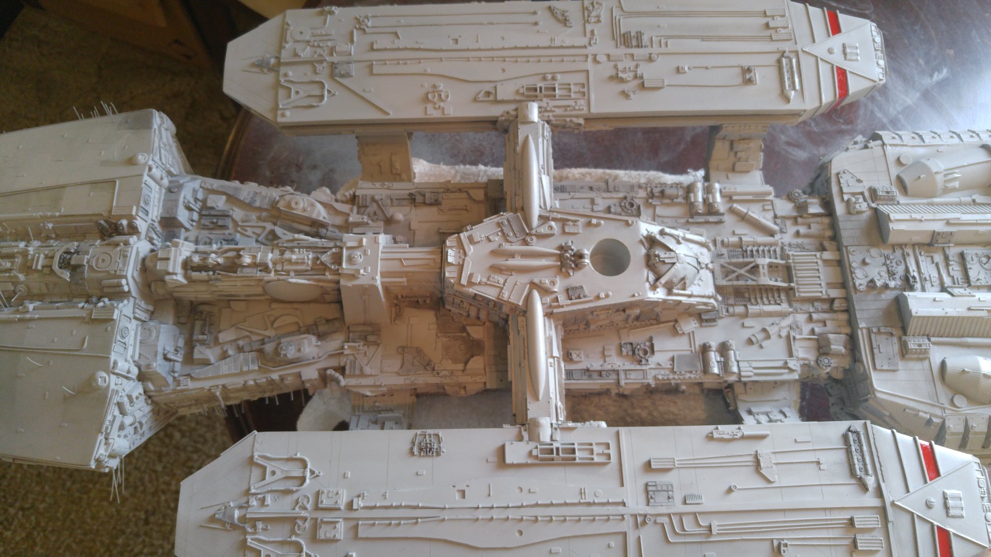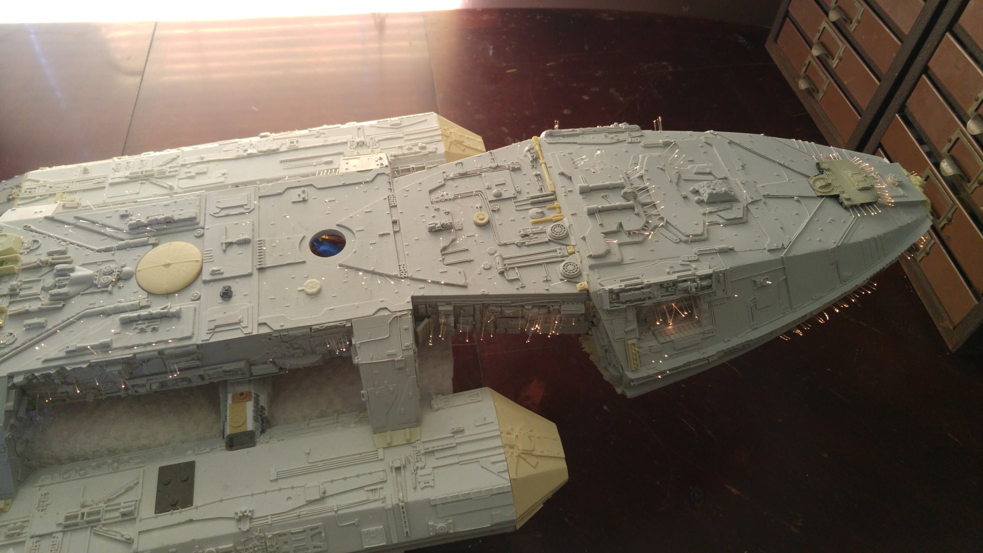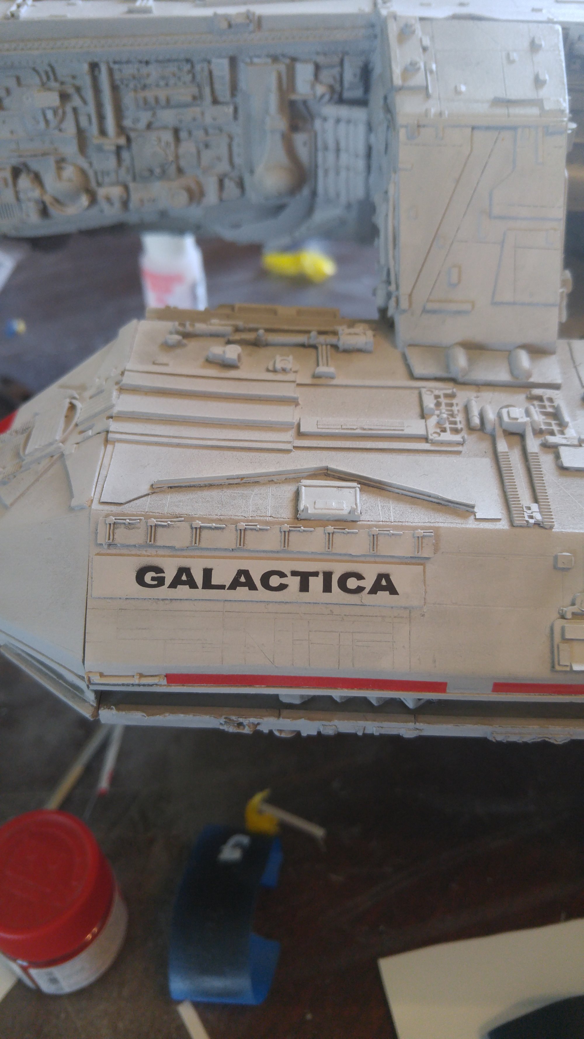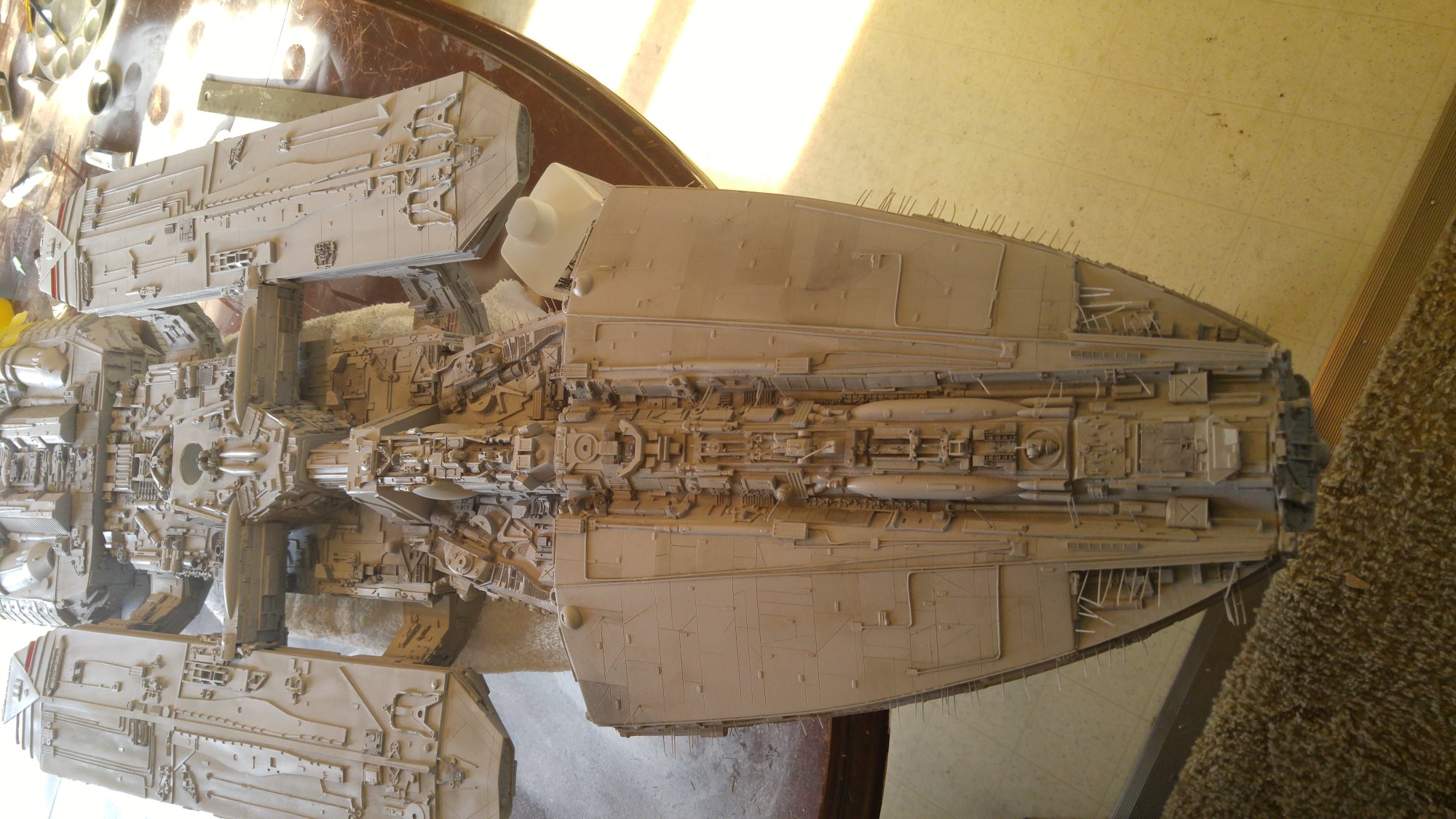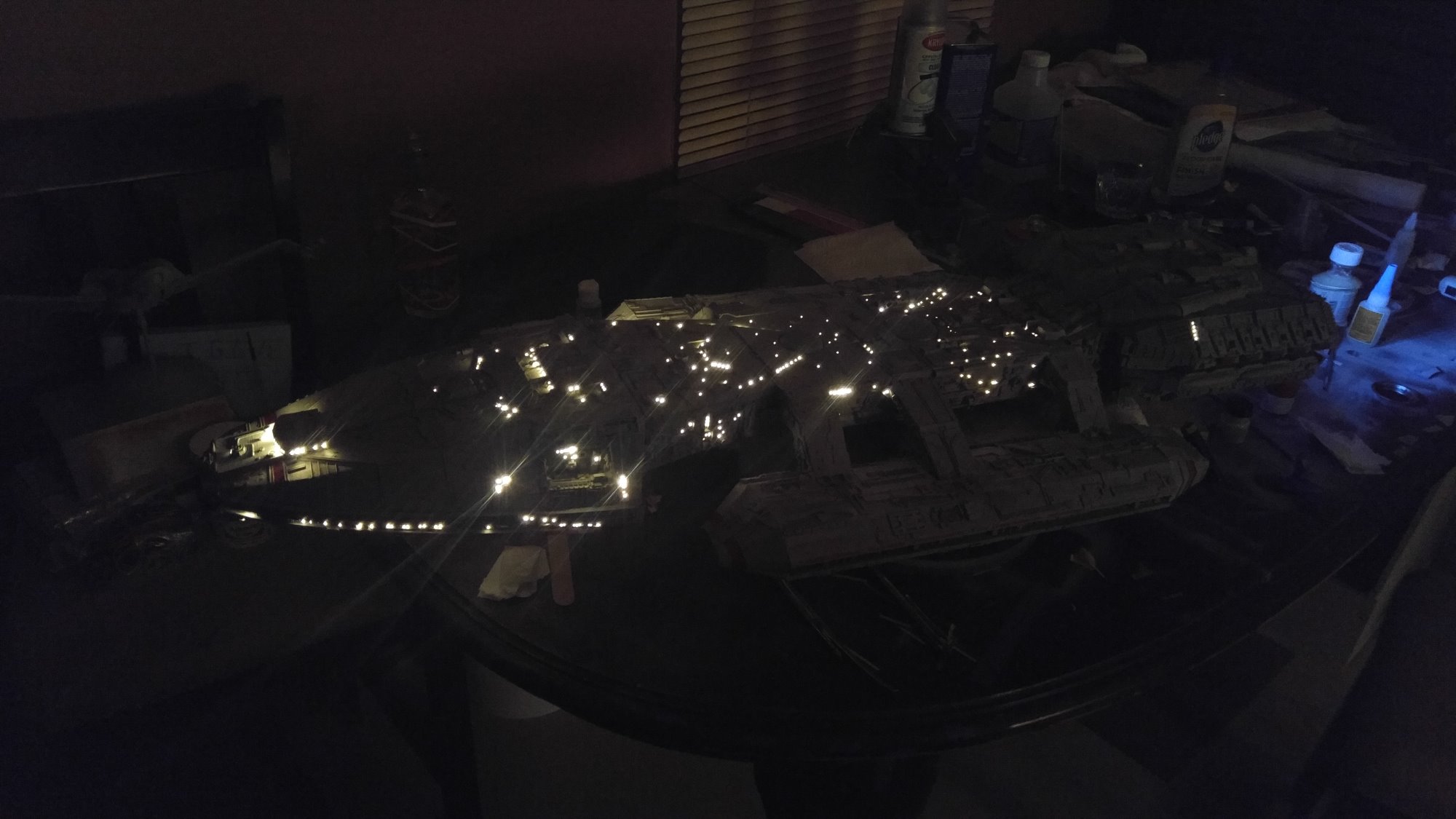 1/2 studio scale Salzo Galactica build and painted to client specs. The landing bays have full interiors and lighting, with vipers, via the randy cooper Interior kit. There are sequential lights at the entrance of both bays as well. All of the lighting is internal, battery powered via a 9.7 v rc car battery, Power is driven by a Magnet switch under the larger of the two domes. @x of the domes were painted for the client so that he could display it with or without lights. The smaller front dome is removable to allow access to the charge port for the battery. A Glass mirror top base was designed by myself and made by Lazerfire Creations for the display. I unfortunately have no images of the final display at this time.