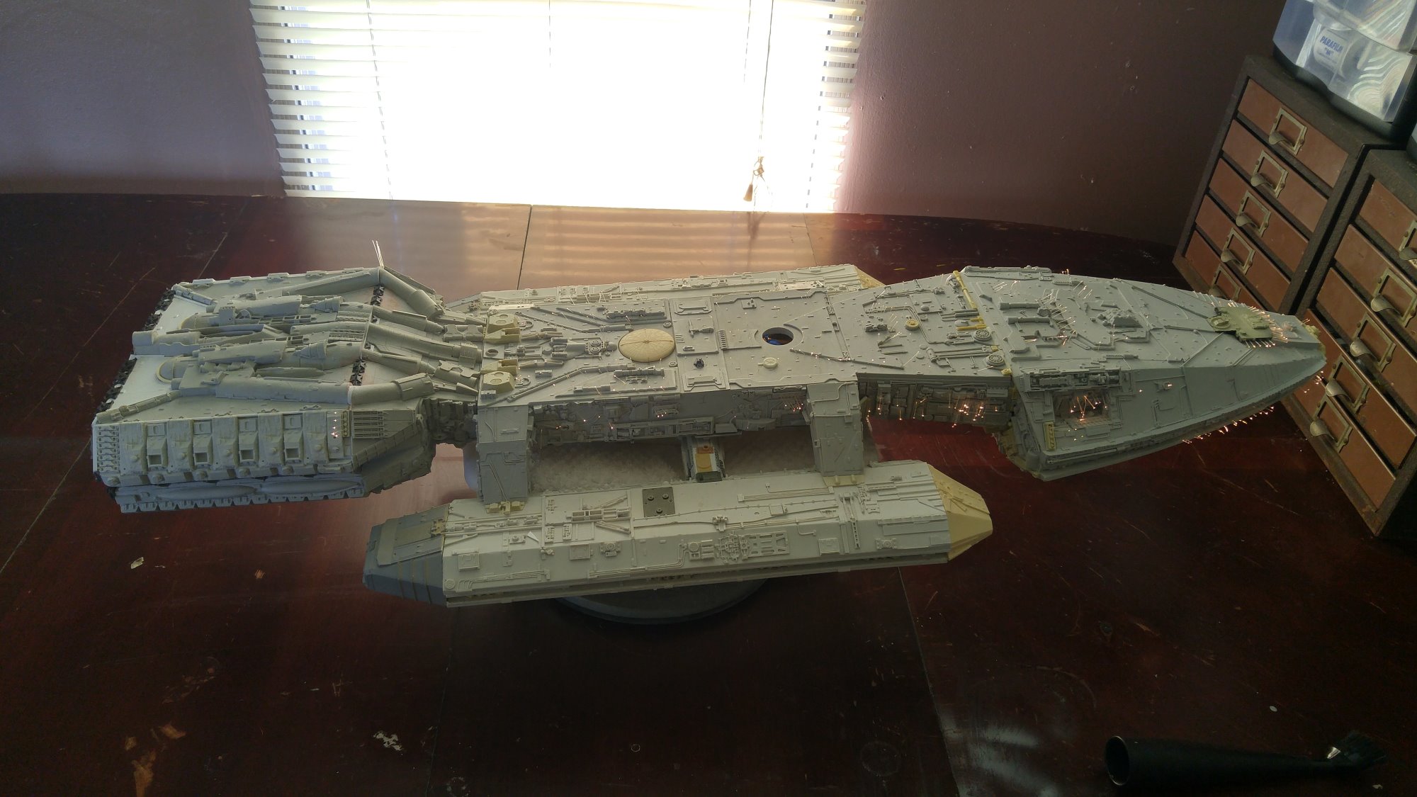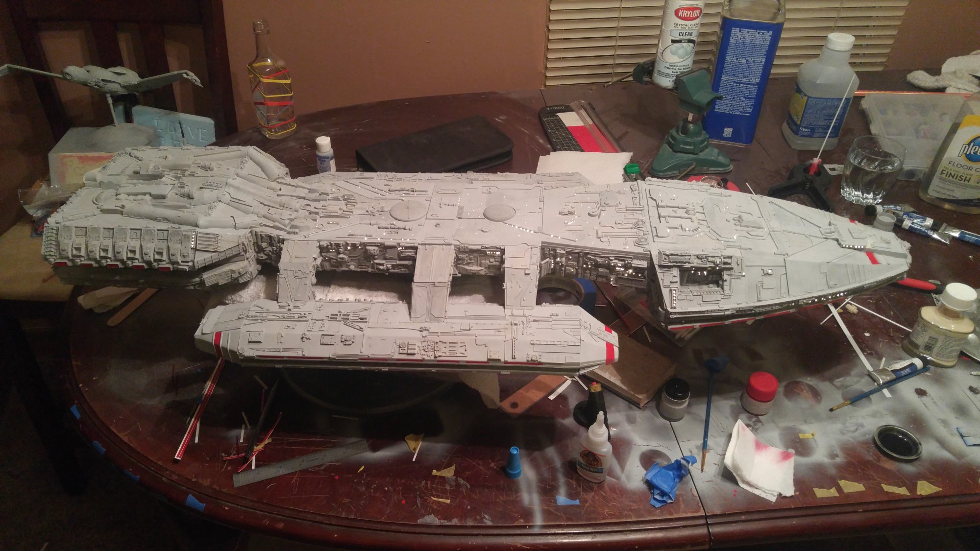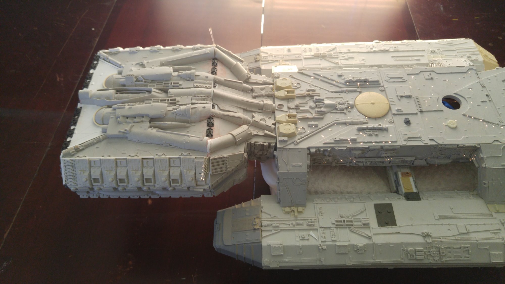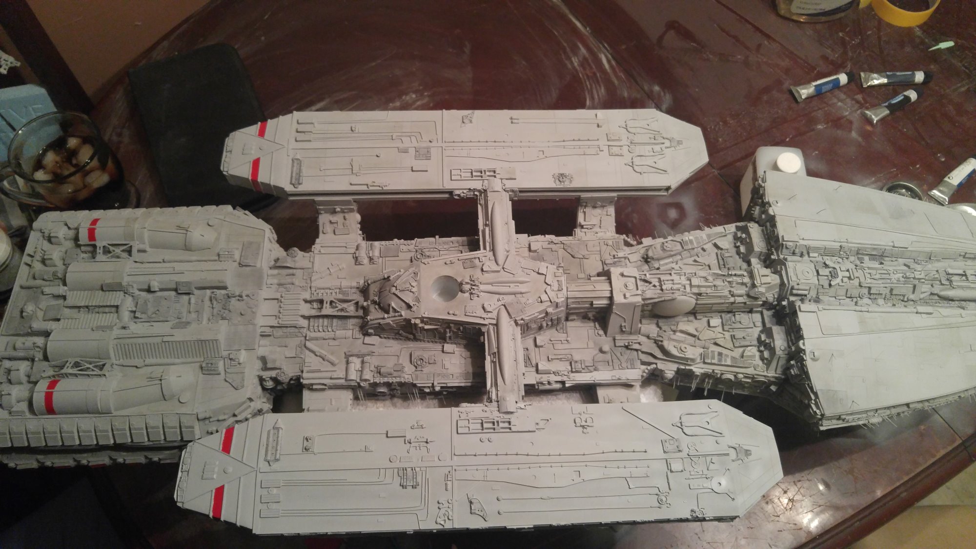 1/2 studio scale Salzo Galactica build and painted to client specs. The landing bays have full interiors and lighting, with vipers, via the randy cooper Interior kit. There are sequential lights at the entrance of both bays as well. All of the lighting is internal, battery powered via a 9.7 v rc car battery, Power is driven by a Magnet switch under the larger of the two domes. @x of the domes were painted for the client so that he could display it with or without lights. The smaller front dome is removable to allow access to the charge port for the battery. A Glass mirror top base was designed by myself and made by Lazerfire Creations for the display. I unfortunately have no images of the final display at this time.