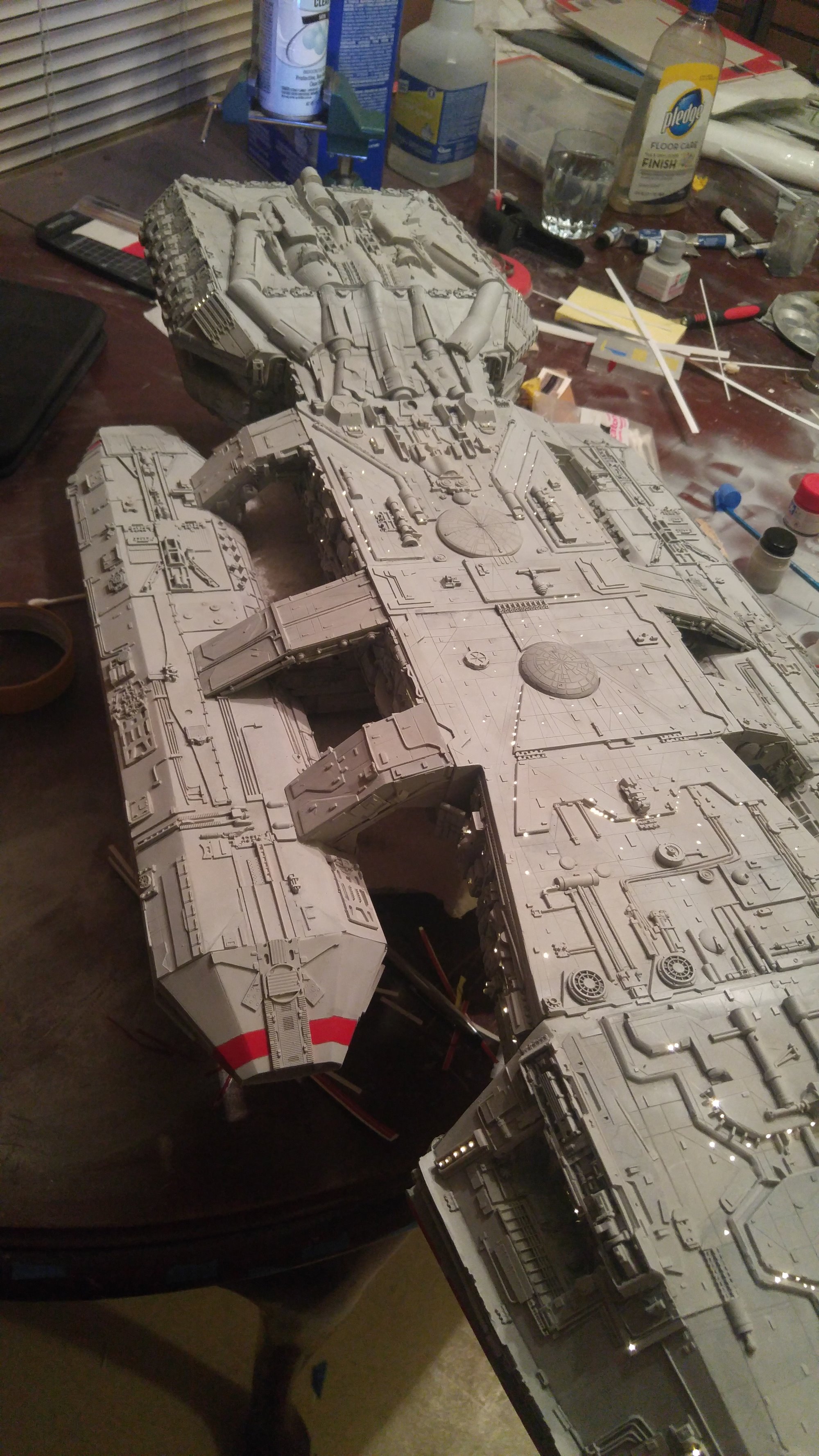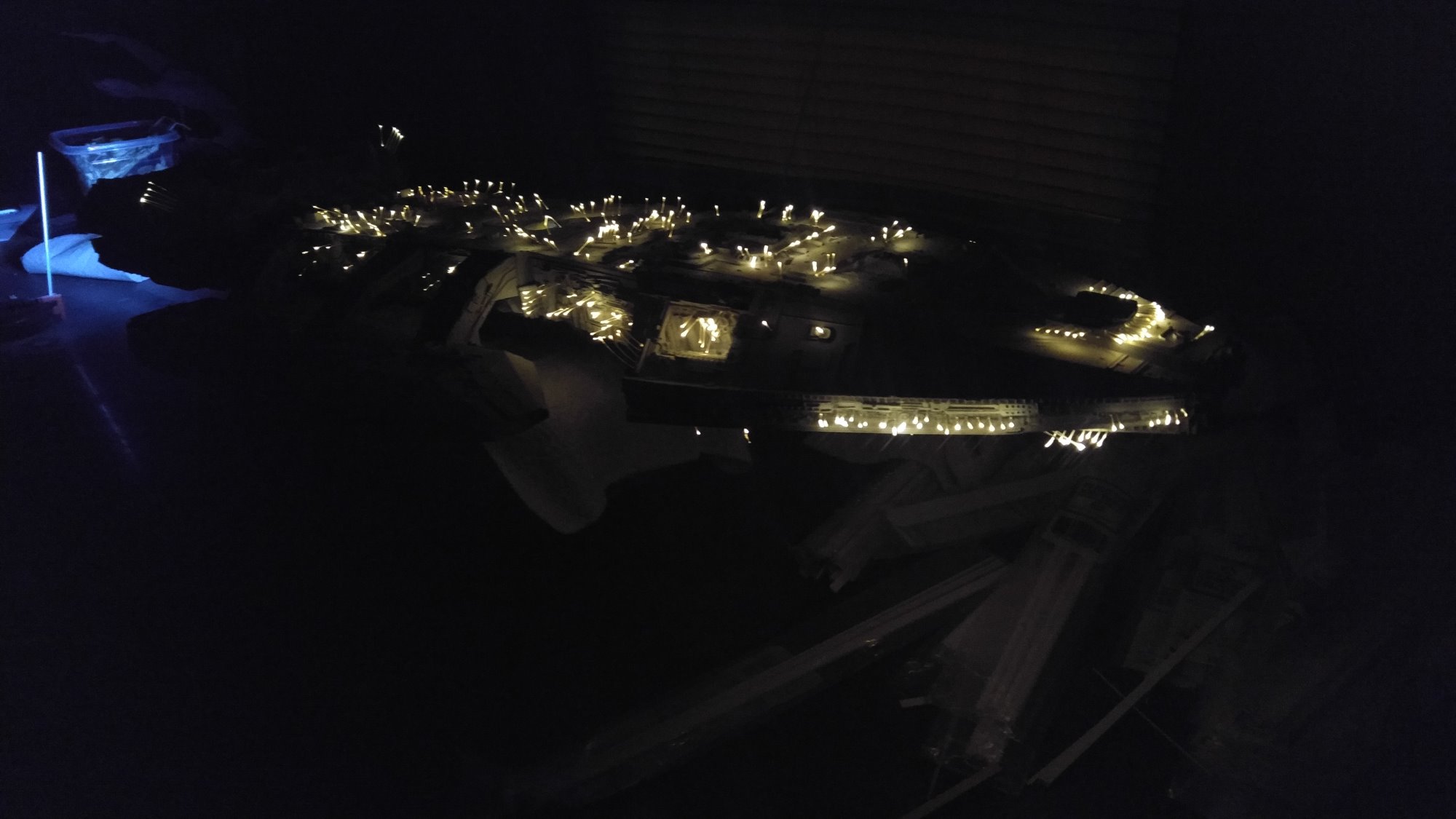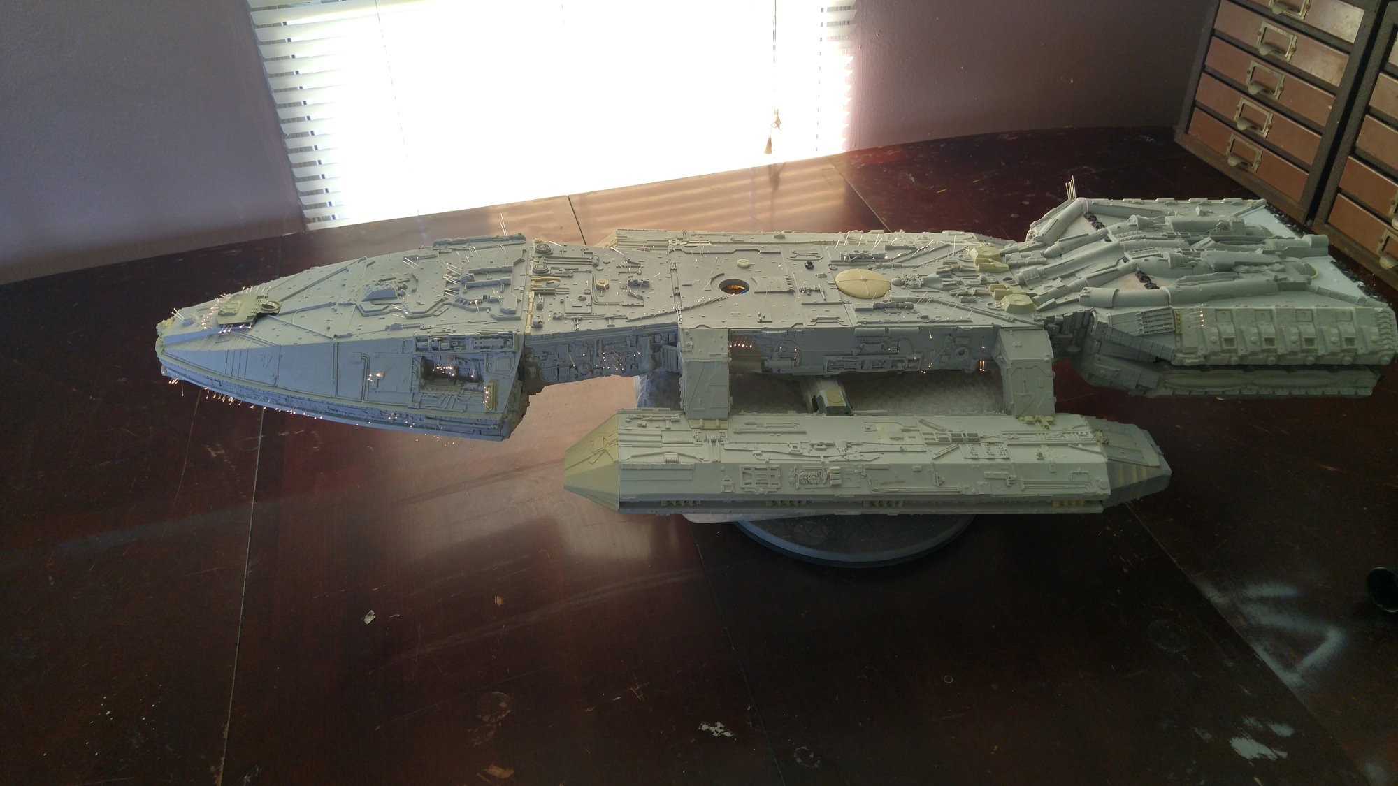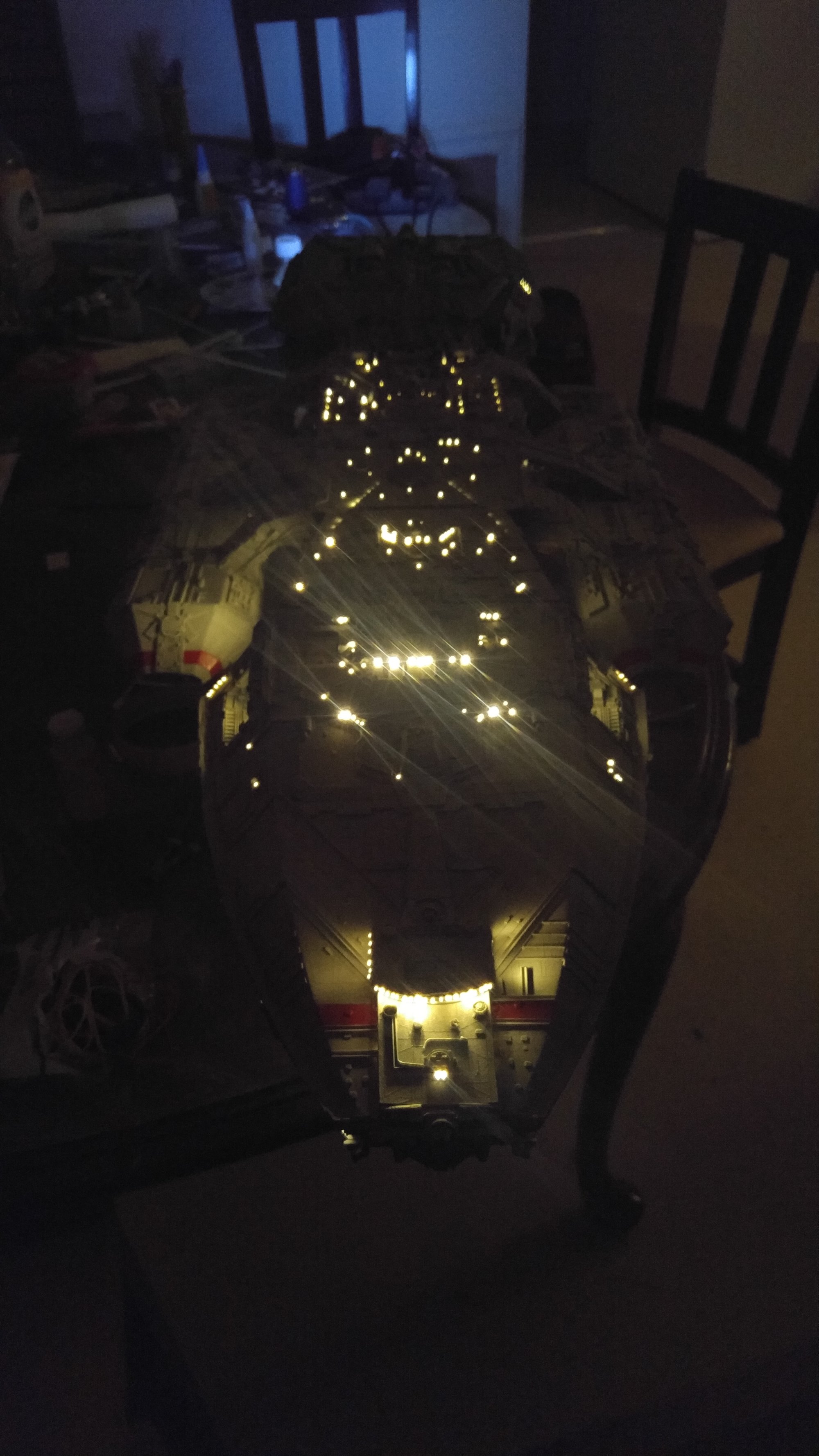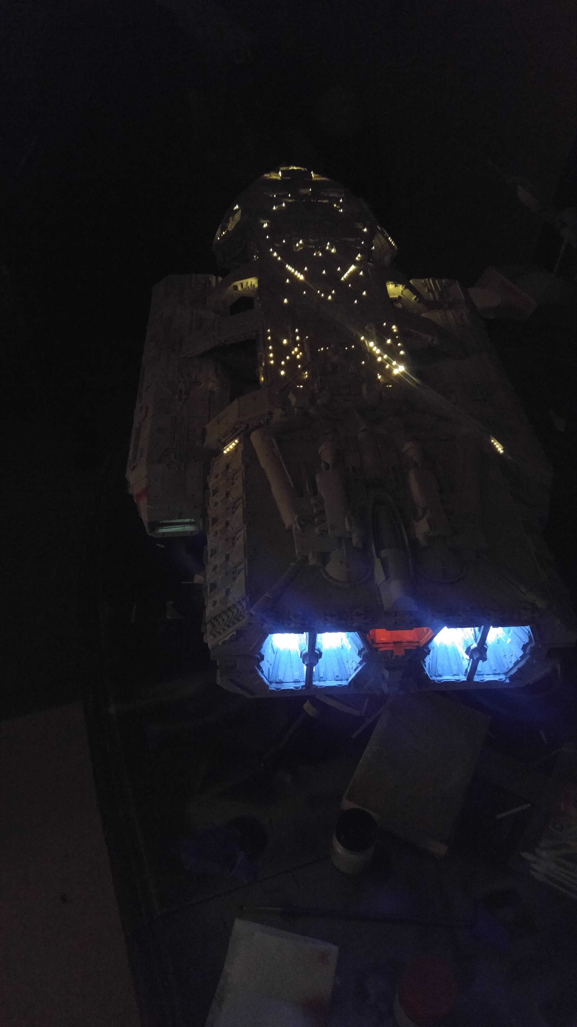 1/2 studio scale Salzo Galactica build and painted to client specs. The landing bays have full interiors and lighting, with vipers, via the randy cooper Interior kit. There are sequential lights at the entrance of both bays as well. All of the lighting is internal, battery powered via a 9.7 v rc car battery, Power is driven by a Magnet switch under the larger of the two domes. @x of the domes were painted for the client so that he could display it with or without lights. The smaller front dome is removable to allow access to the charge port for the battery. A Glass mirror top base was designed by myself and made by Lazerfire Creations for the display. I unfortunately have no images of the final display at this time.
