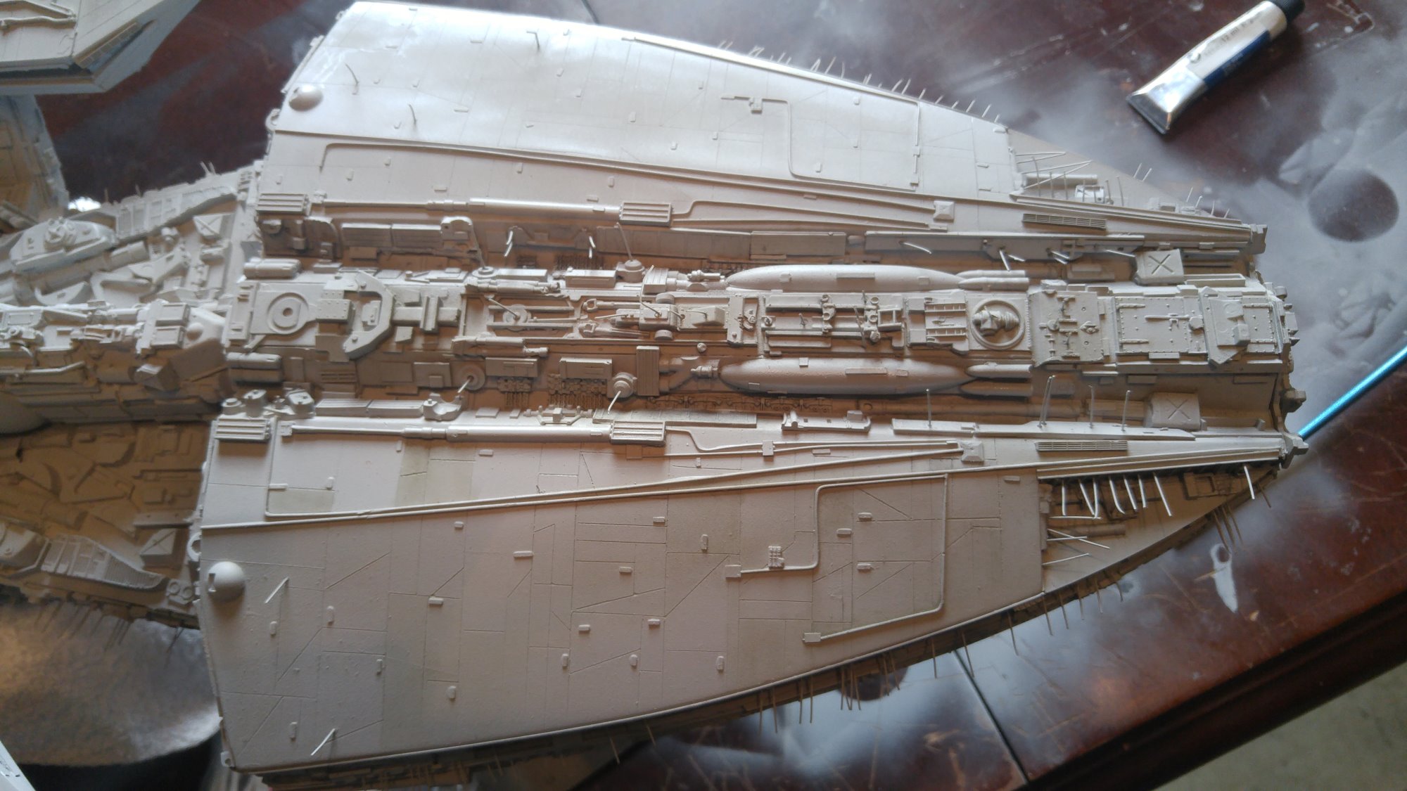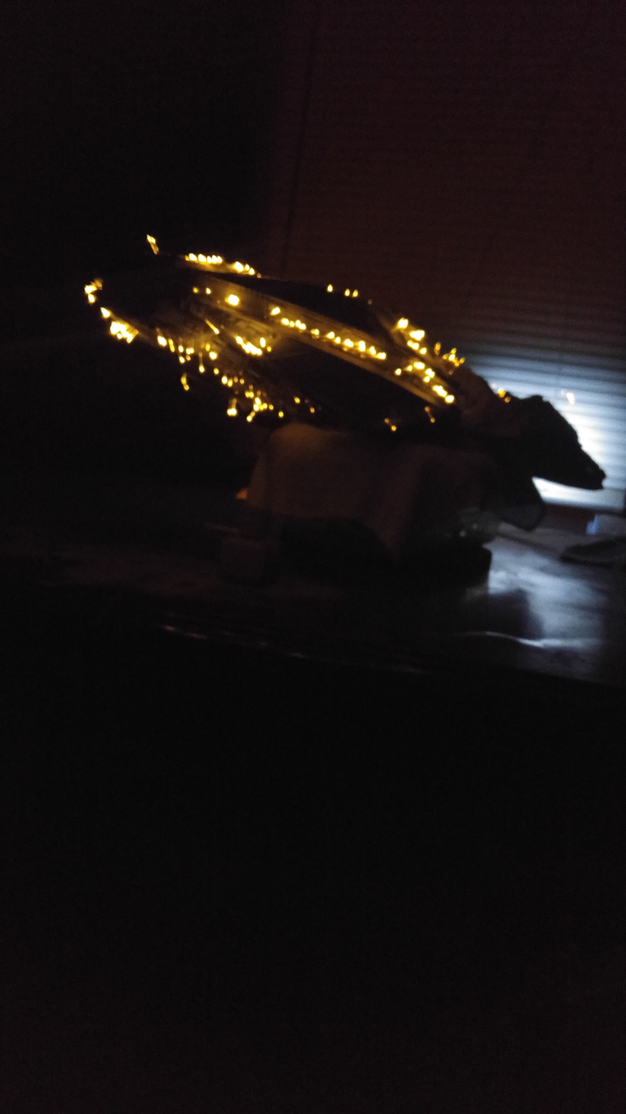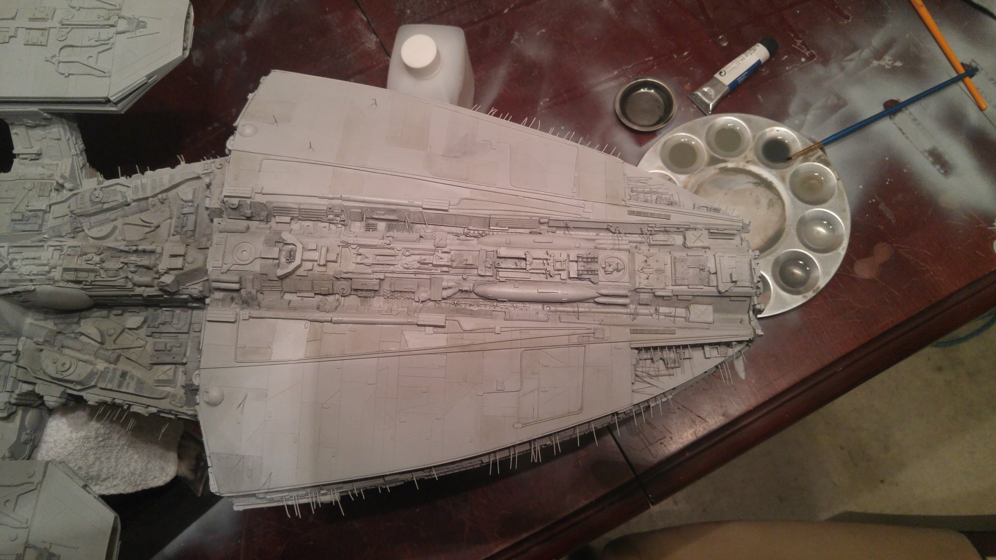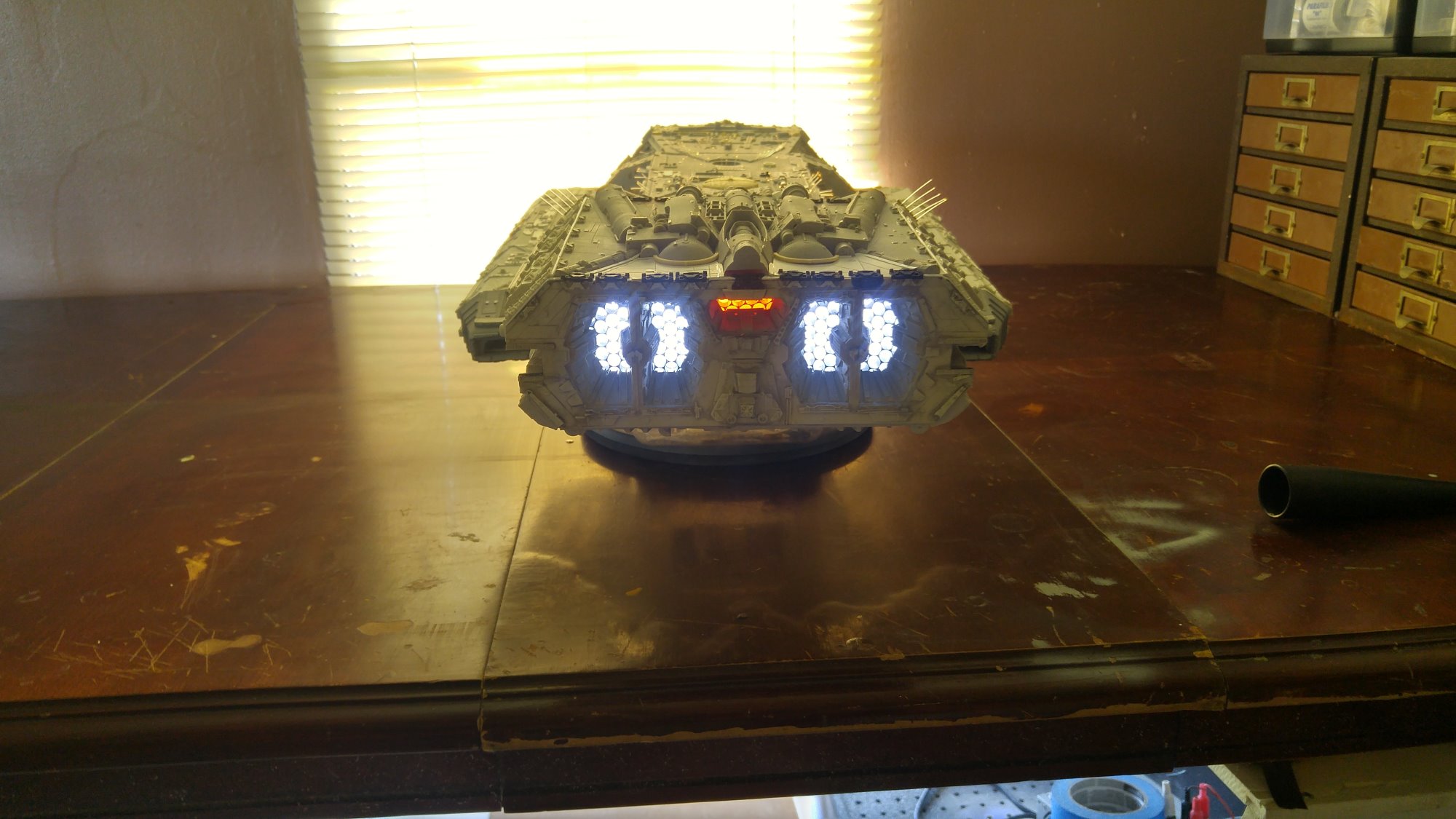 1/2 studio scale Salzo Galactica build and painted to client specs. The landing bays have full interiors and lighting, with vipers, via the randy cooper Interior kit. There are sequential lights at the entrance of both bays as well. All of the lighting is internal, battery powered via a 9.7 v rc car battery, Power is driven by a Magnet switch under the larger of the two domes. @x of the domes were painted for the client so that he could display it with or without lights. The smaller front dome is removable to allow access to the charge port for the battery. A Glass mirror top base was designed by myself and made by Lazerfire Creations for the display. I unfortunately have no images of the final display at this time.