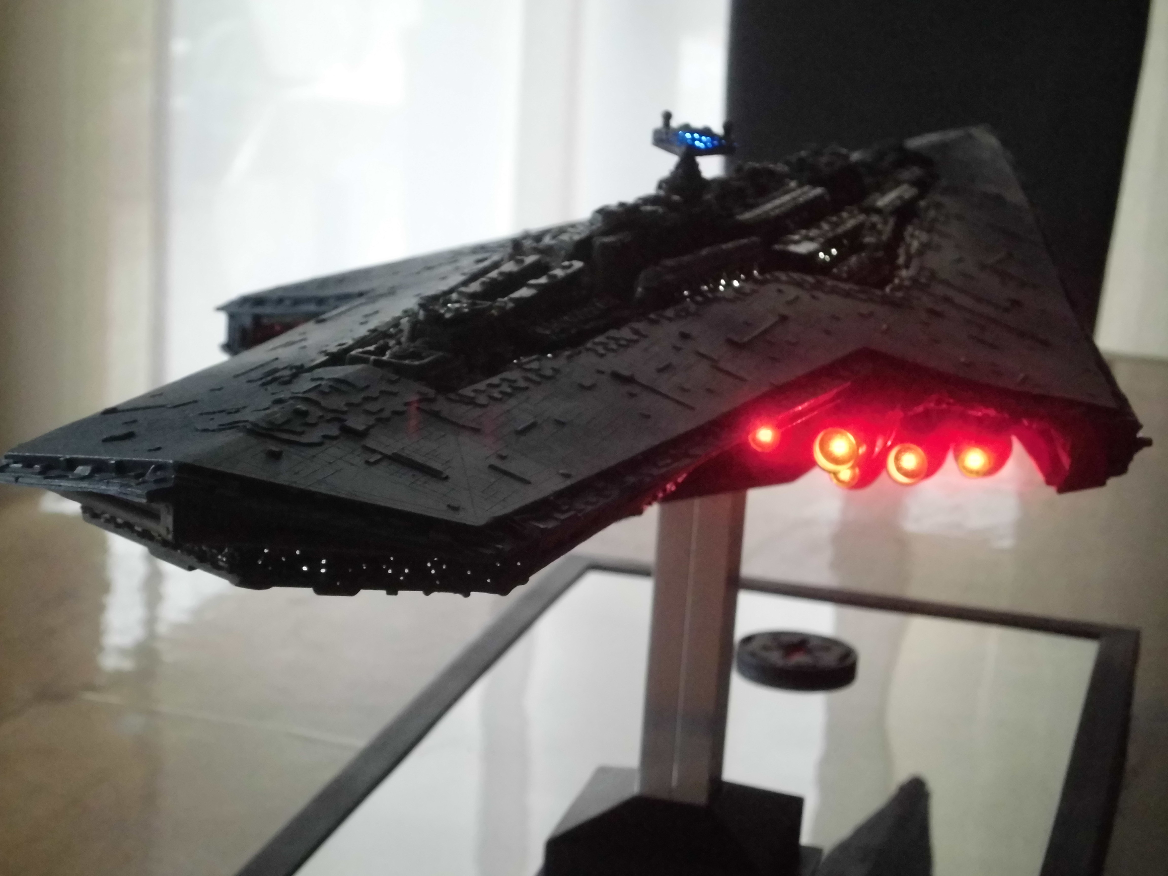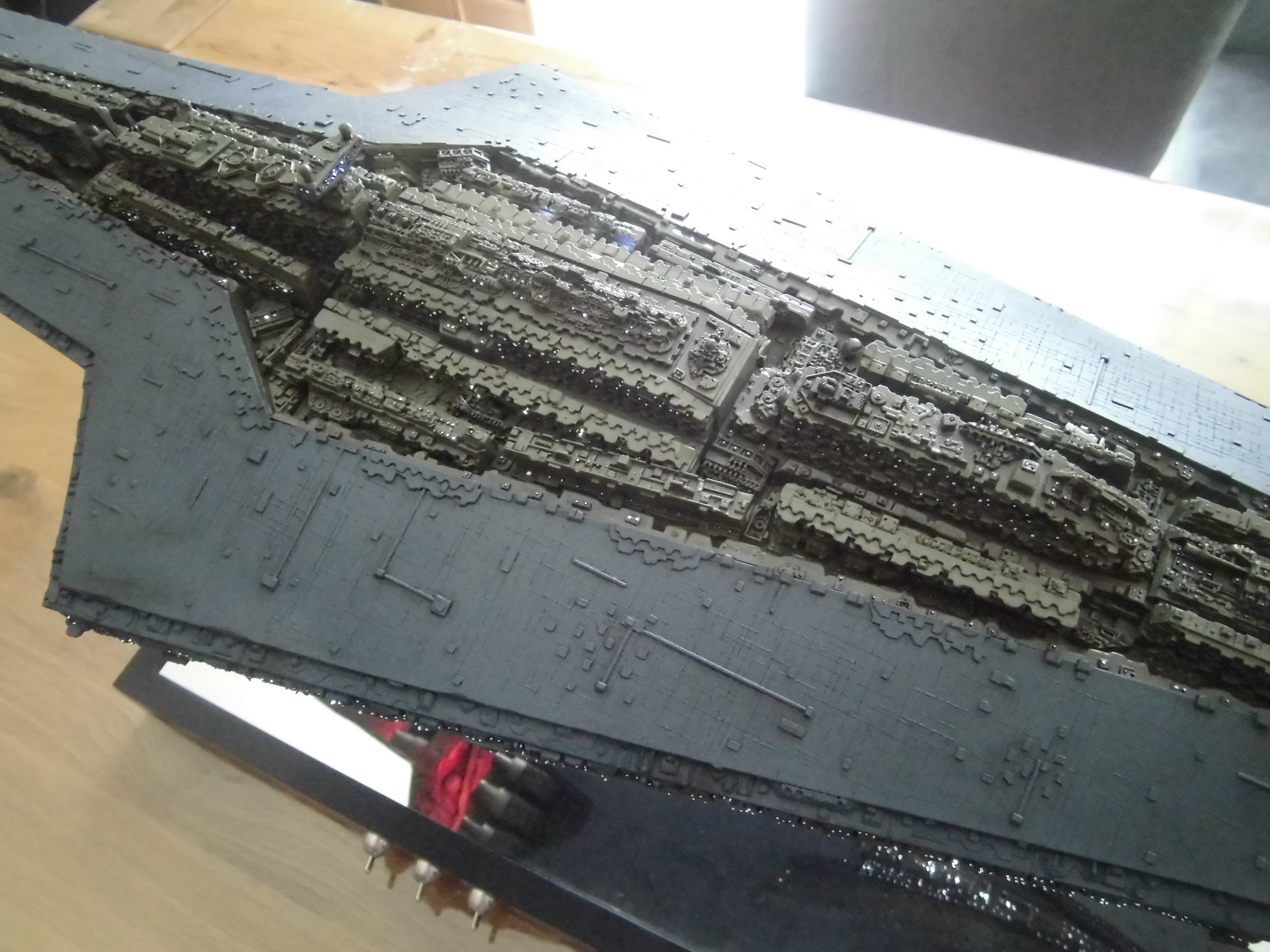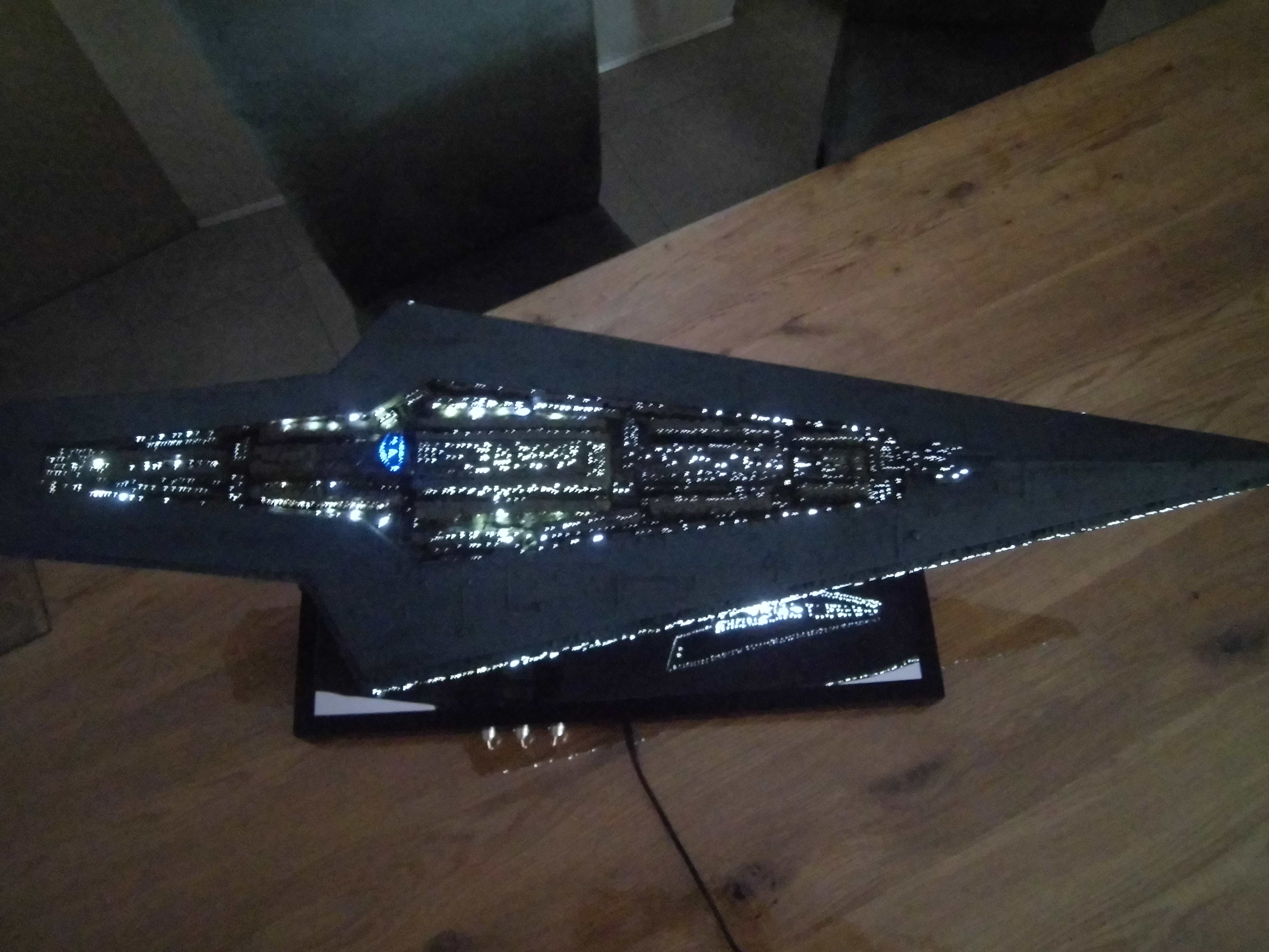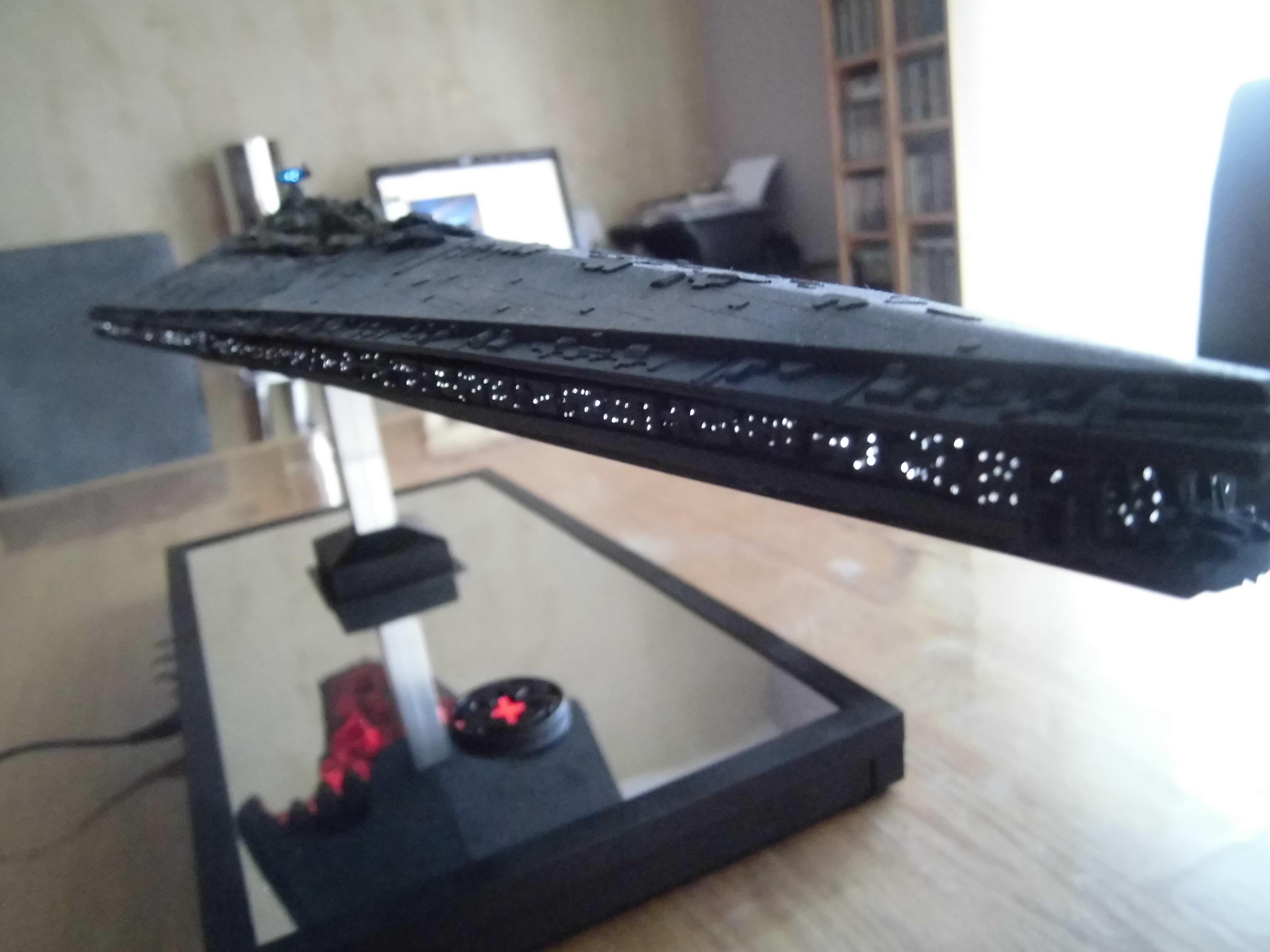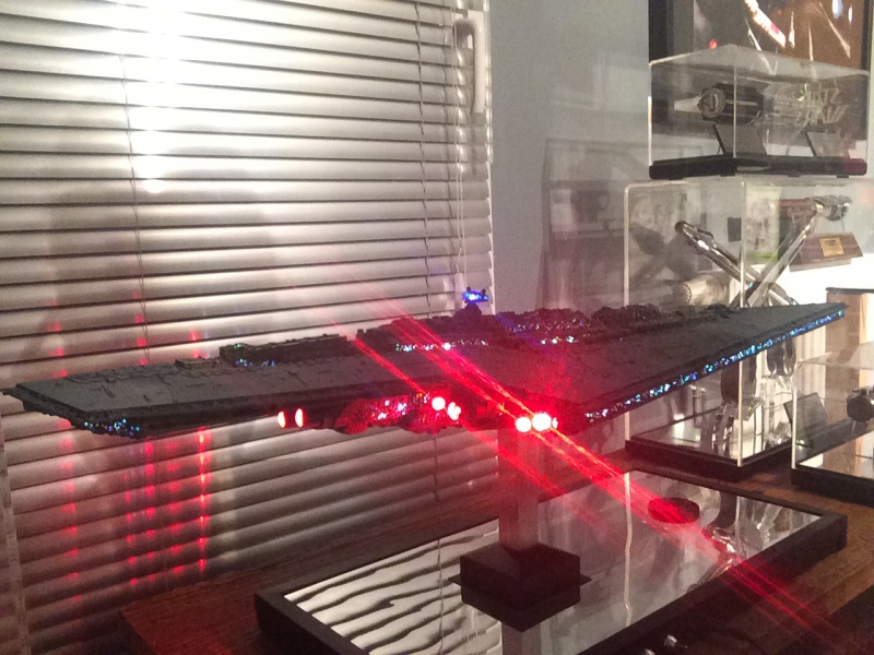 “I have just finished a Super Star Destroyer from Korbanth. It’s a kit that I got that was already assembled and painted. I undertook a complete renovation, dismantling the kit, stripping the old paint job. Some figures for its realization I drilled about 700 holes of 0.5 mm for the passage of 150 meters of fiber optics for the light up I used 3 meter LED tape. I also made a bracket that has 3 switches that allow light to be the symbol of the empire of the base or engines or general lighting of the ship.