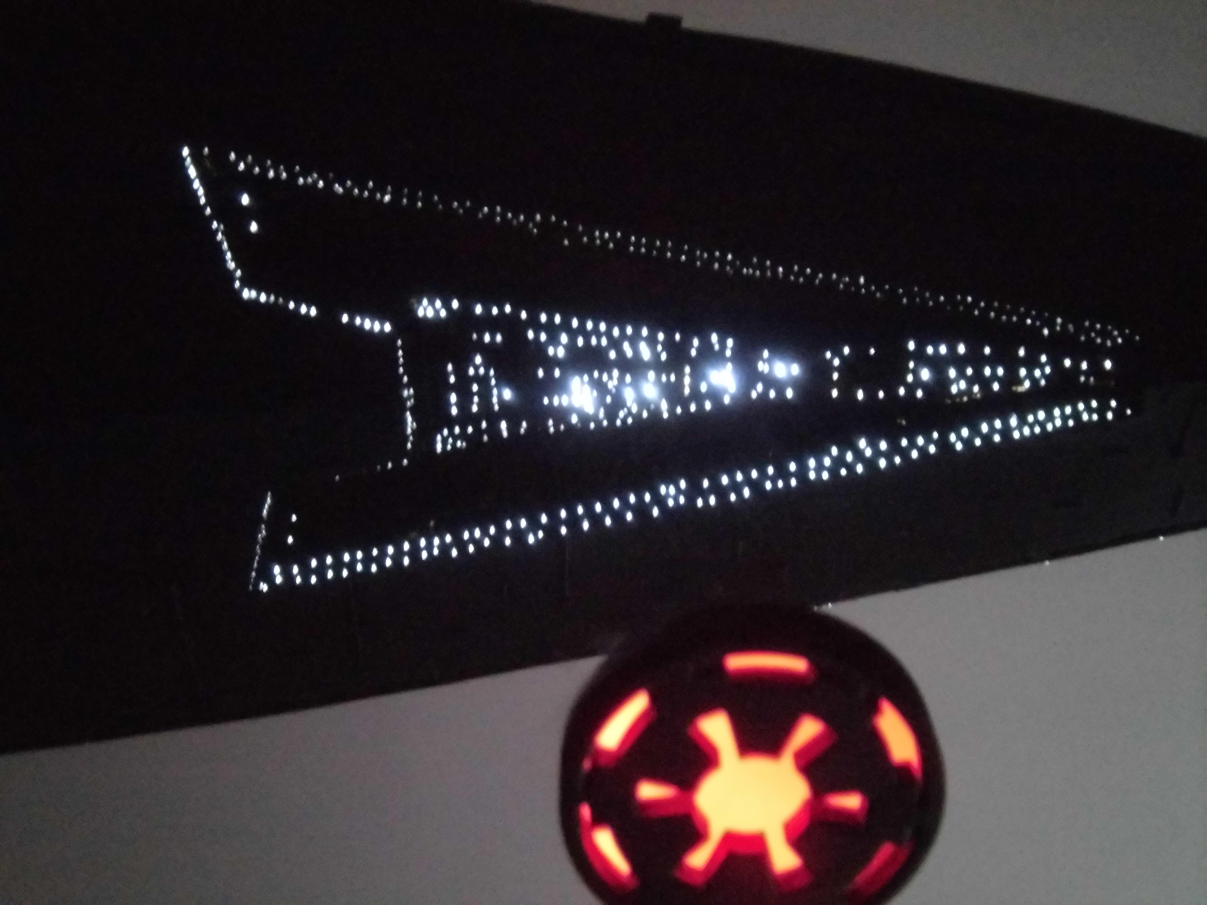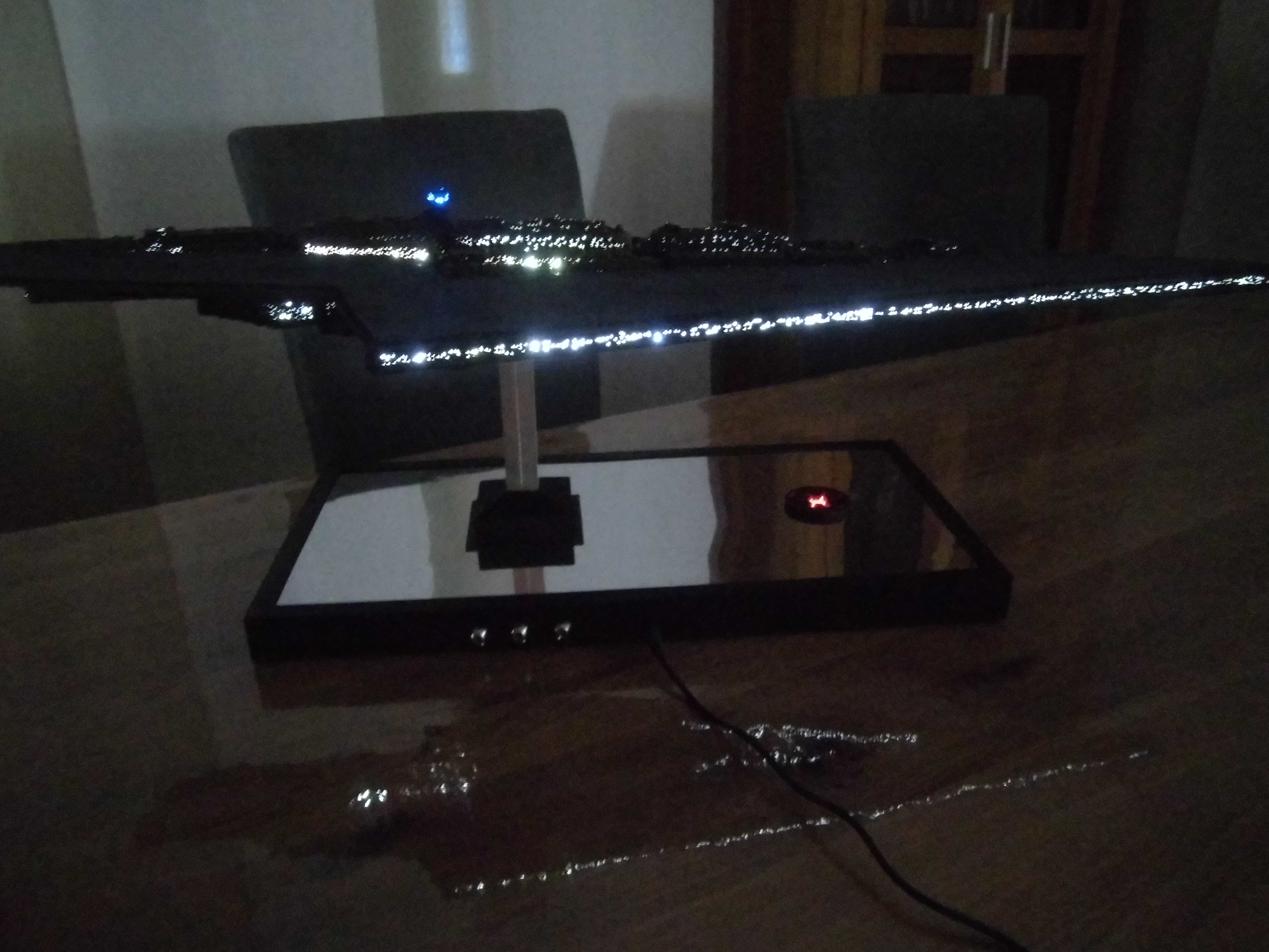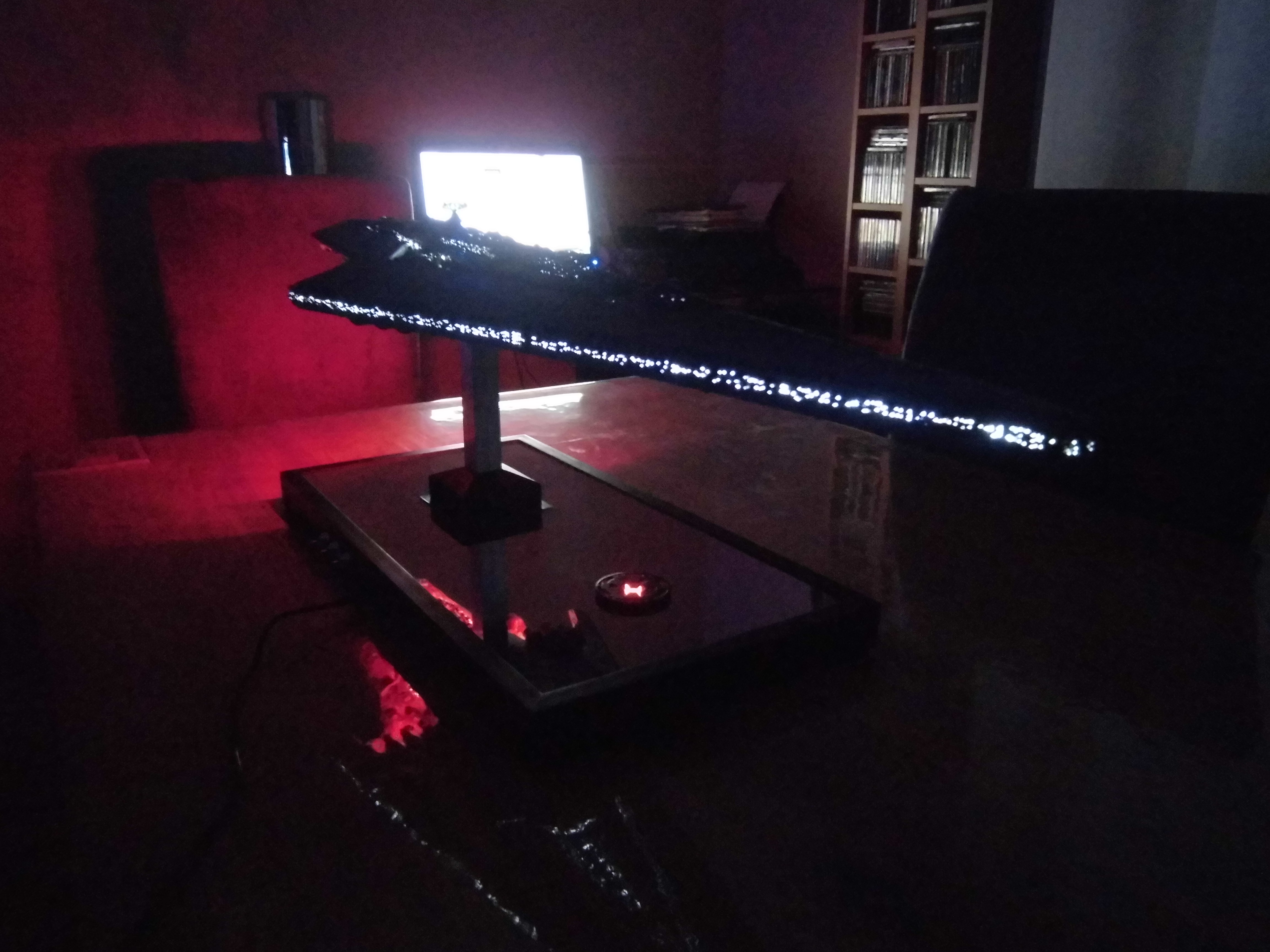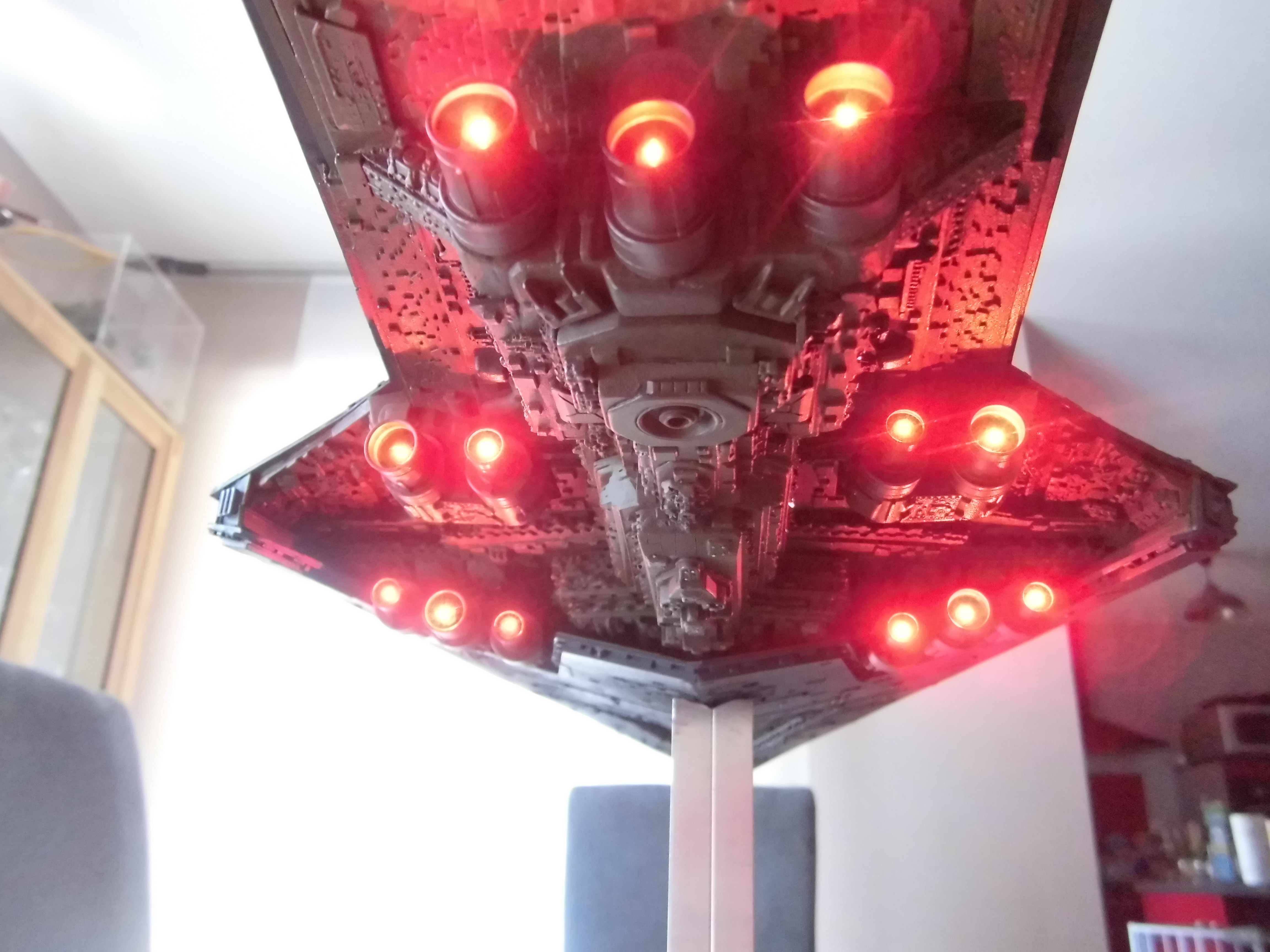 “I have just finished a Super Star Destroyer from Korbanth. It’s a kit that I got that was already assembled and painted. I undertook a complete renovation, dismantling the kit, stripping the old paint job. Some figures for its realization I drilled about 700 holes of 0.5 mm for the passage of 150 meters of fiber optics for the light up I used 3 meter LED tape. I also made a bracket that has 3 switches that allow light to be the symbol of the empire of the base or engines or general lighting of the ship.