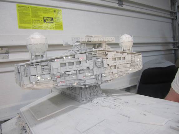 We all recognize this amazing 6 foot Star Destroyer AVENGER being the one that famed artist Marc Elkins scratch built a few years ago. That Avenger ended up in the Michael Plante collection this past year and is now being upgraded to have the appropriate lighting that was originally planned. This beastie upgrade reminds me of the old ILM photos with all the fiber optics hanging from the studio model! And check out the tiny TIE Fighter! Michael… I am JEALOUS!!! LOL. This piece is going to stand out among some amazing replicas. Stay tuned to view this piece completed. I may even visit Michael to take some photos and videos to show all of you on Modeler Magic. Marc did a great job on this.. as well as the Bay Area artists upgrading it! BEAUTIFUL!!