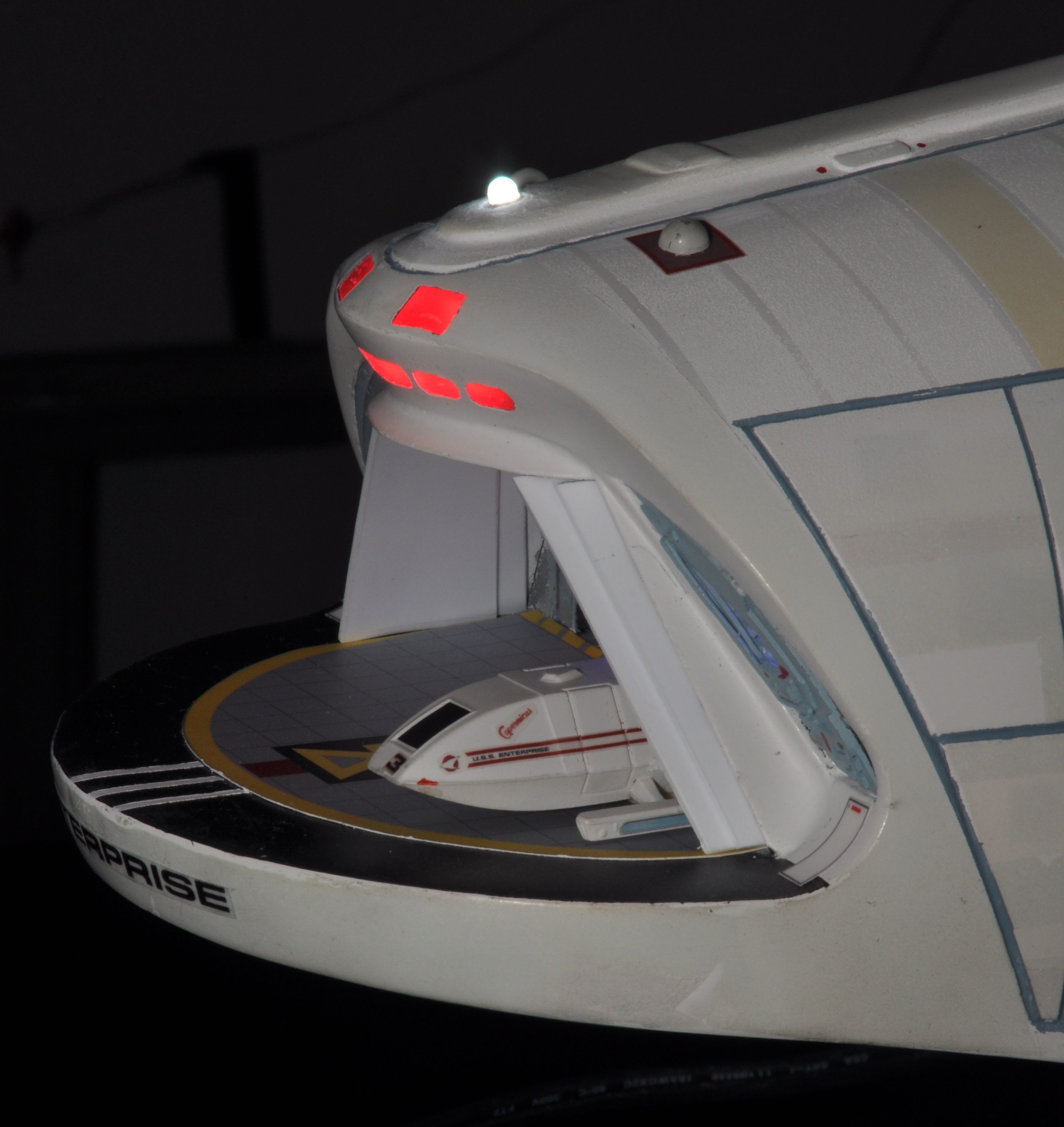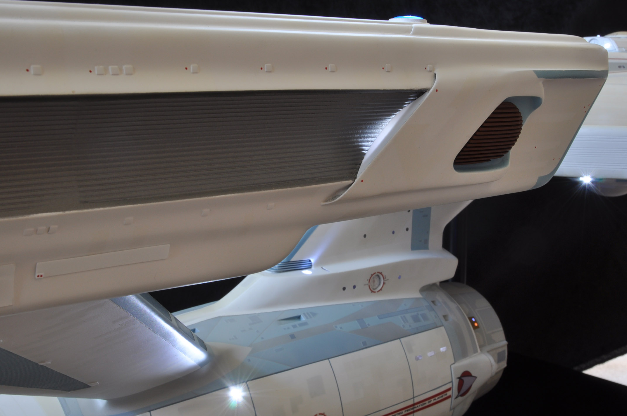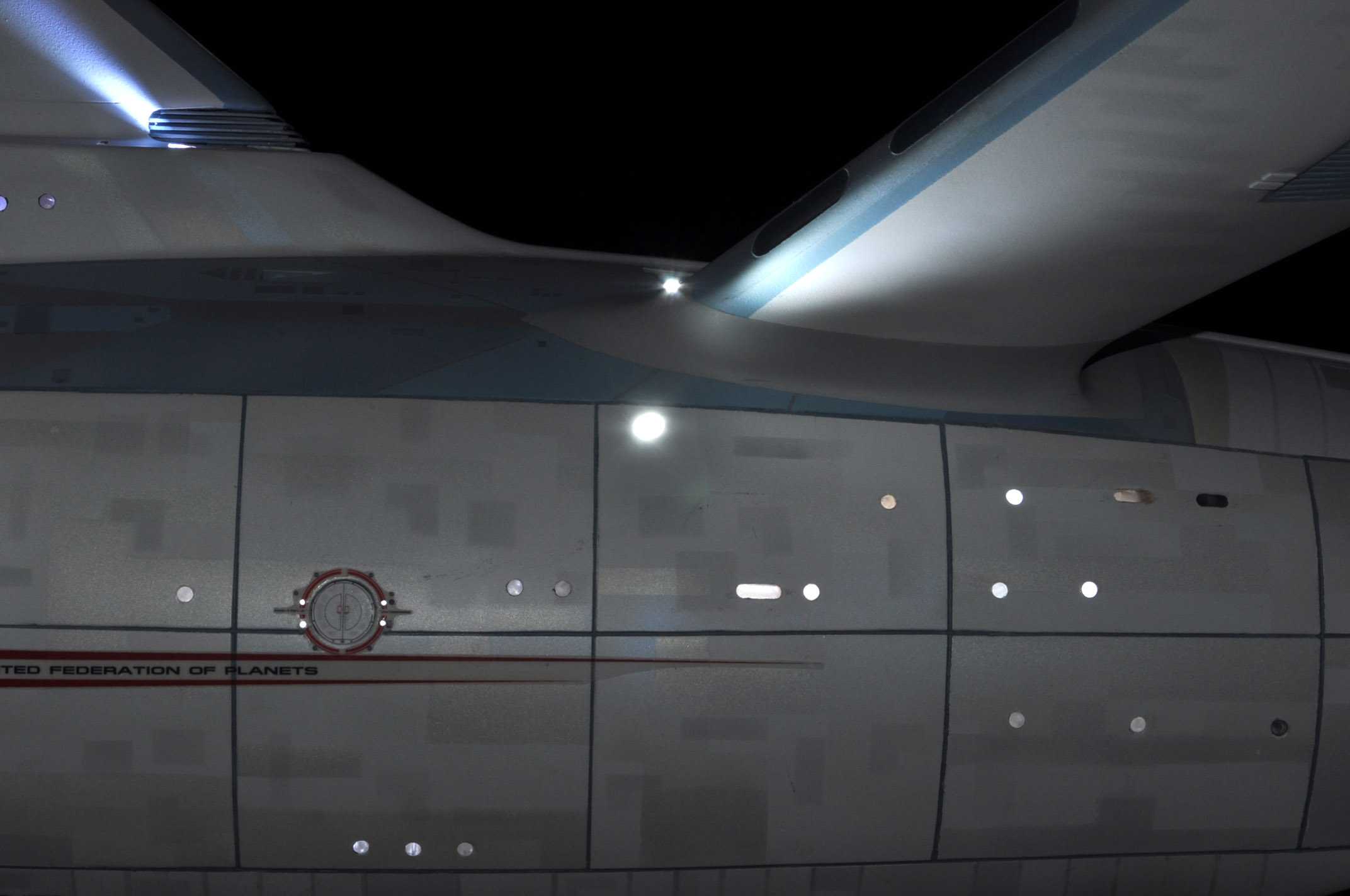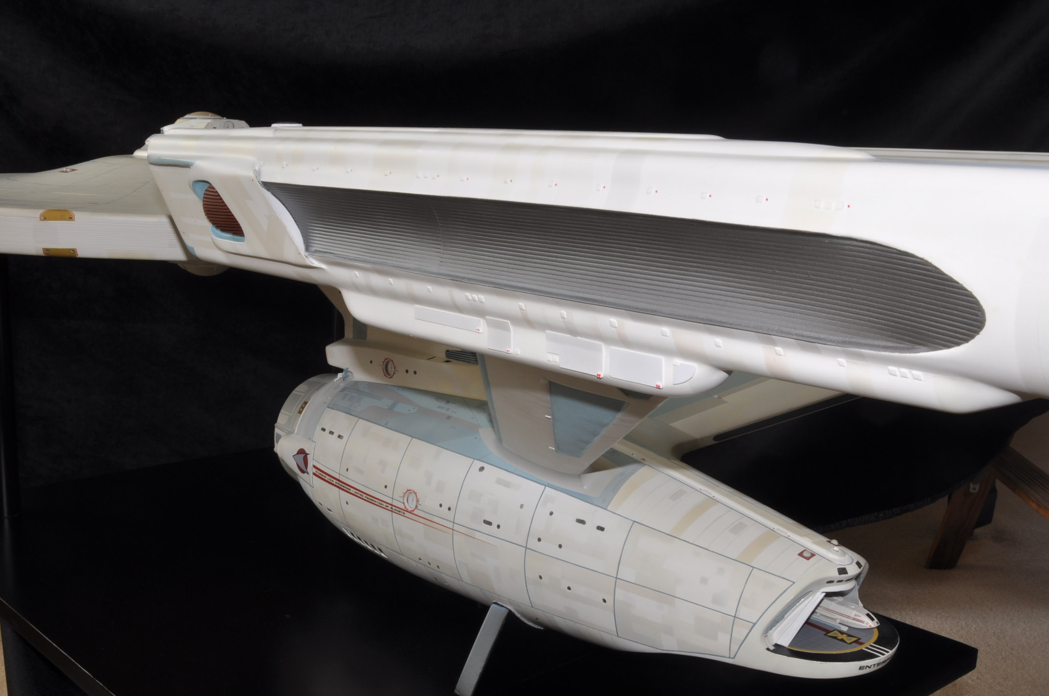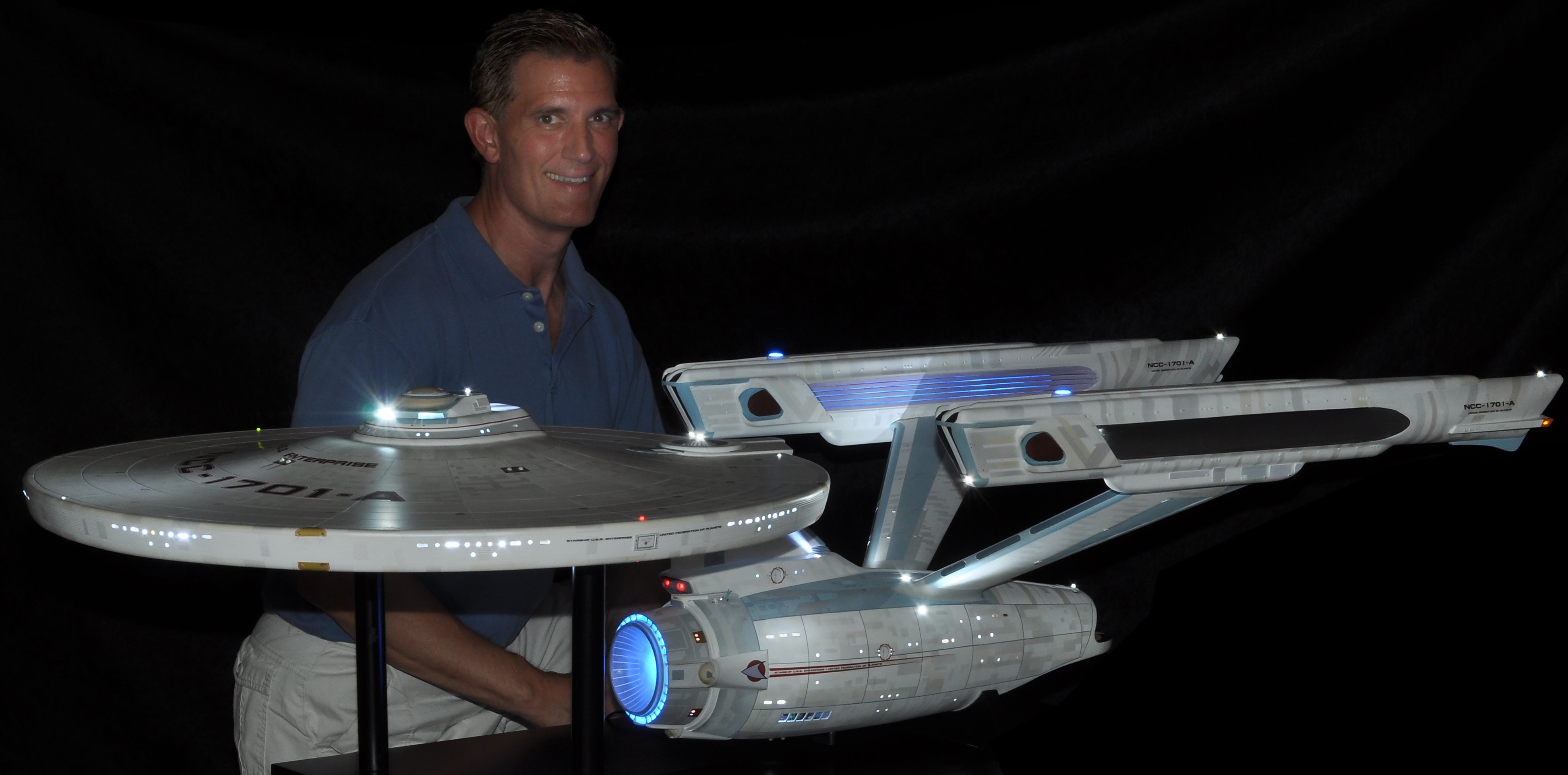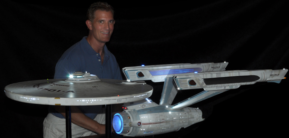 I am honored today to be able to introduce a builder to this Gallery who has been inspirational to me in his talents, proving that dreams ARE achievable! Professional Photographer, and Model Master Jason Ware. Using some of the reference shown directly from this site through the Mark Dickson Collection, and using some dramatic lighting from VooDooFX, with over 1500 hours spent building her…. Jason made his dream come true of this 3/4 studio scale scratch build of the most known science fiction vessel in science fiction history… the Enterprise 1701 Refit! This piece is so large that he was even able to place figures in the windows and on the hull! Every bit of lighting accounted for exactly like the original 8 foot filming model… this piece is second to none that I have seen. There have some world class, beautiful builds from large kits of this piece before this time, but none scratch built… and certainly nothing this large! Jason has inspired me to do what I have been wanting to have done…. build and exact replica of the 8 foot filming model. I am completely floored with Jason’s talents in doing this piece and look forward to showing more of his fantastic builds!