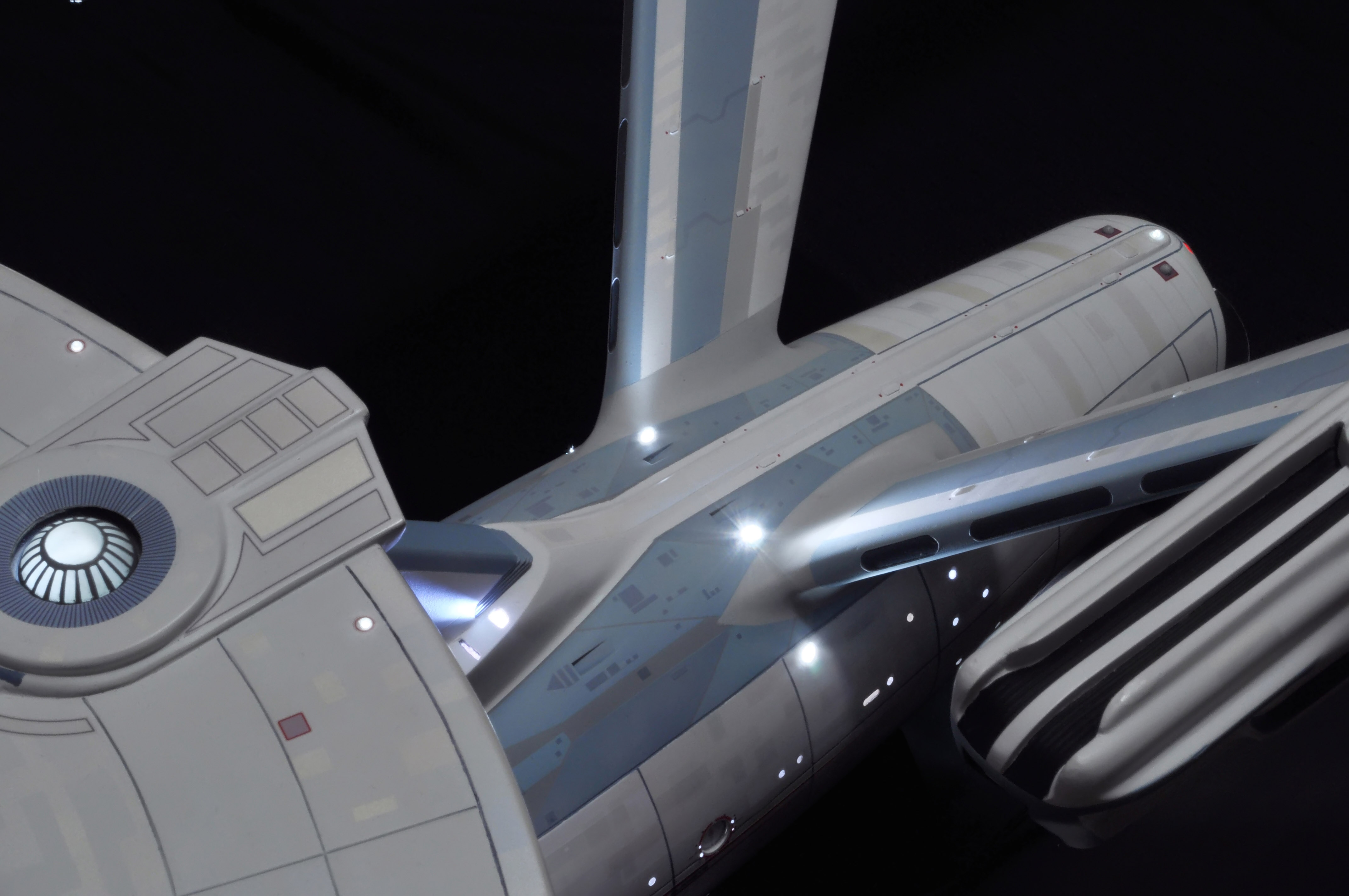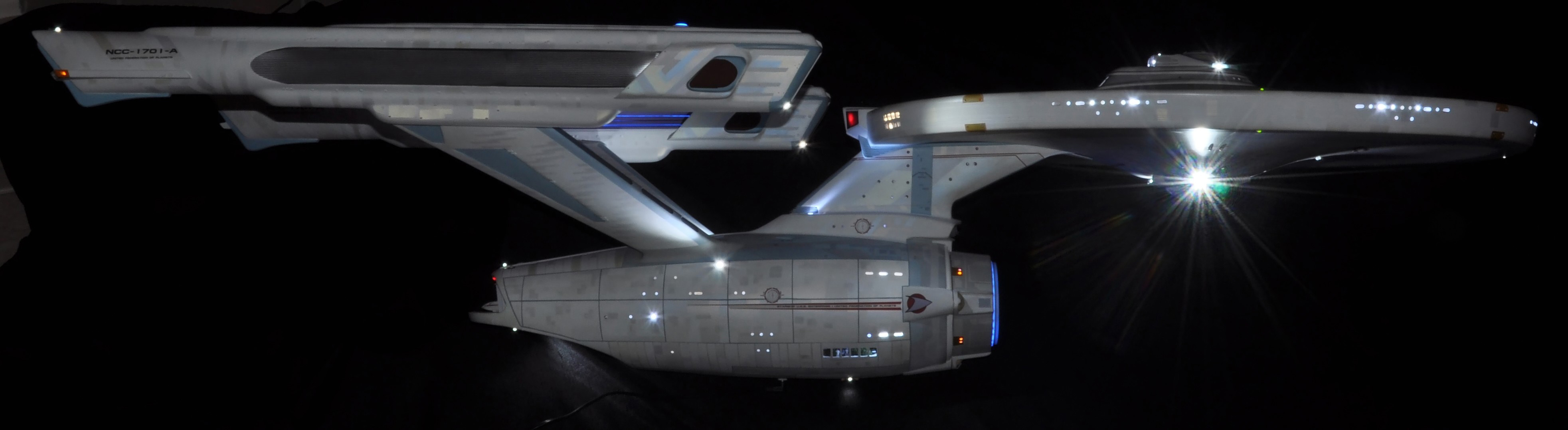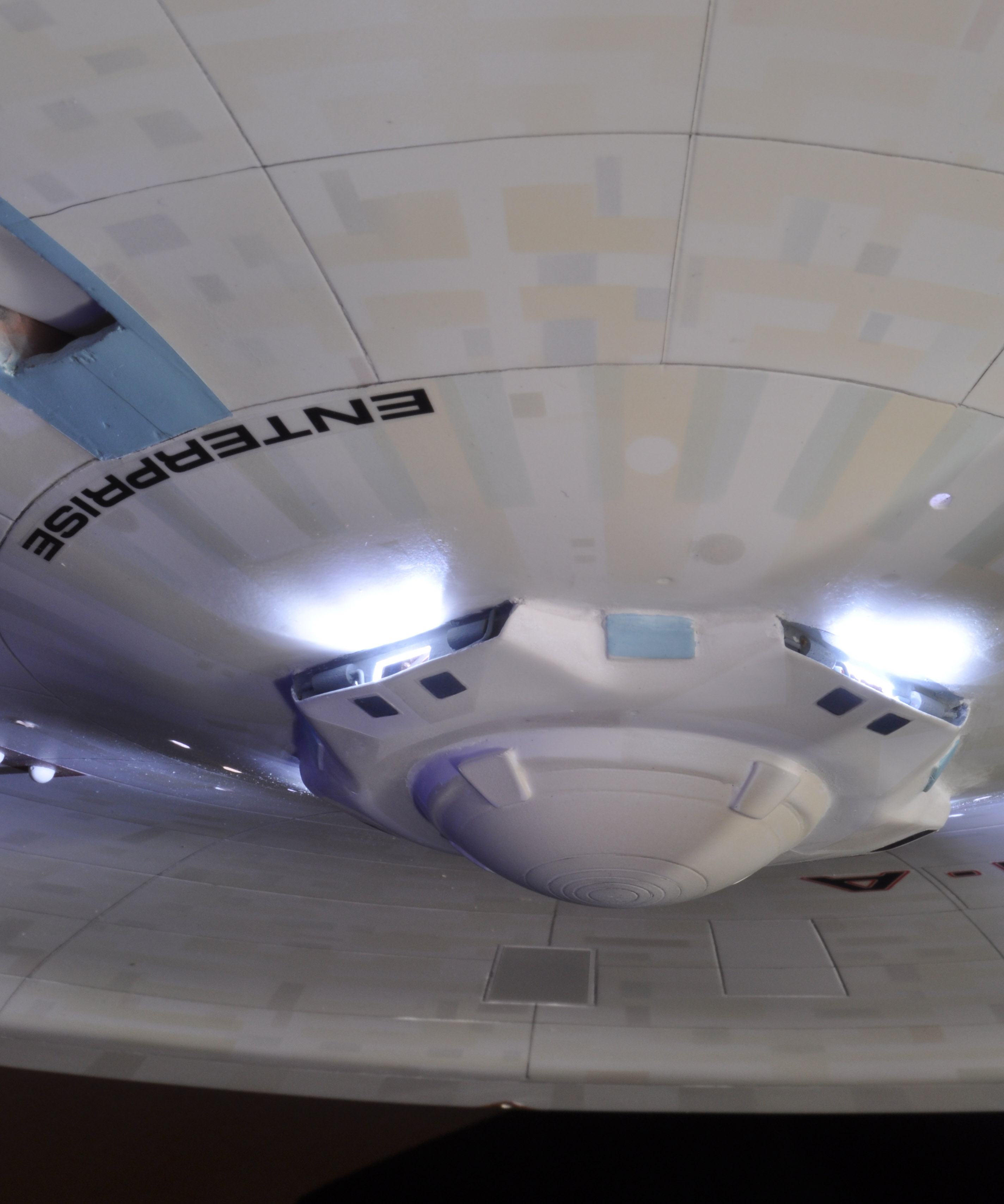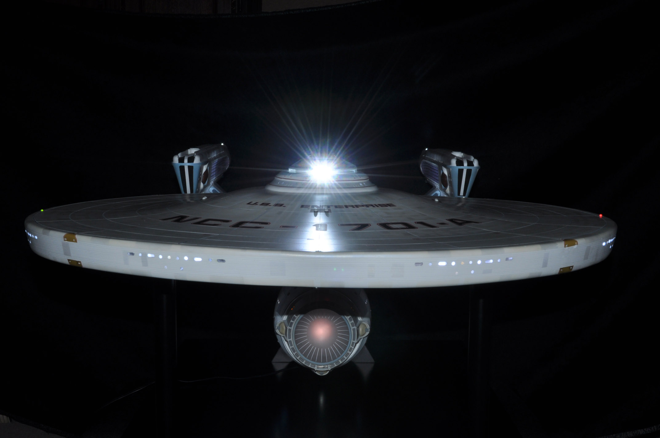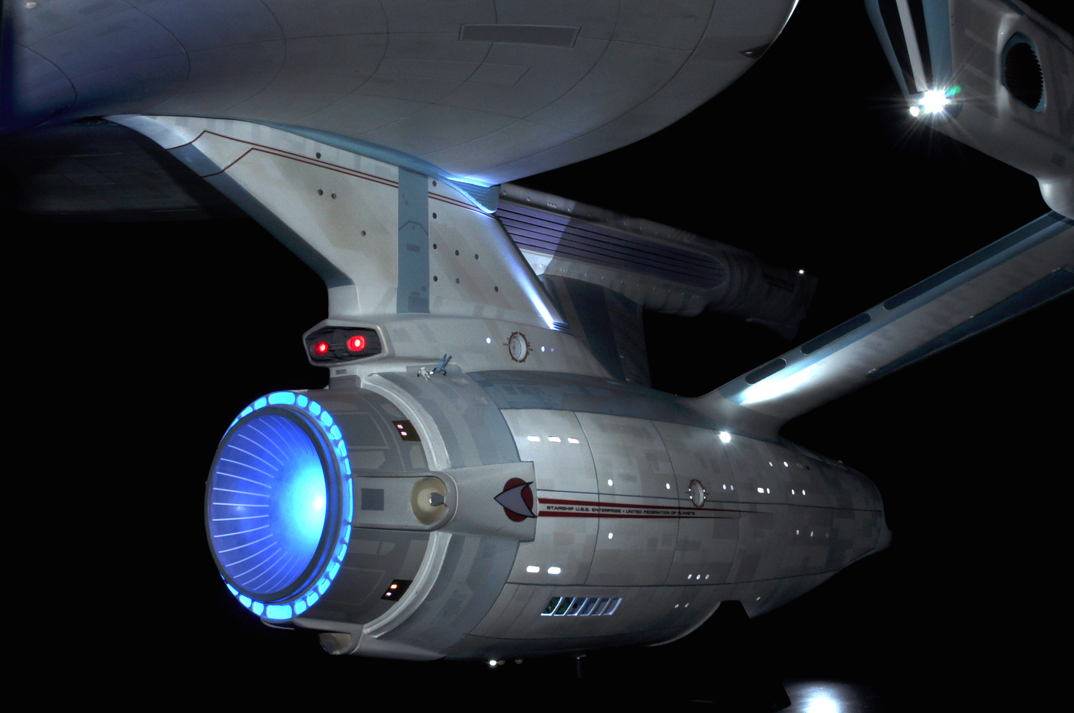I am honored today to be able to introduce a builder to this Gallery who has been inspirational to me in his talents, proving that dreams ARE achievable! Professional Photographer, and Model Master Jason Ware. Using some of the reference shown directly from this site through the Mark Dickson Collection, and using some dramatic lighting from VooDooFX, with over 1500 hours spent building her…. Jason made his dream come true of this 3/4 studio scale scratch build of the most known science fiction vessel in science fiction history… the Enterprise 1701 Refit! This piece is so large that he was even able to place figures in the windows and on the hull! Every bit of lighting accounted for exactly like the original 8 foot filming model… this piece is second to none that I have seen. There have some world class, beautiful builds from large kits of this piece before this time, but none scratch built… and certainly nothing this large! Jason has inspired me to do what I have been wanting to have done…. build and exact replica of the 8 foot filming model. I am completely floored with Jason’s talents in doing this piece and look forward to showing more of his fantastic builds!