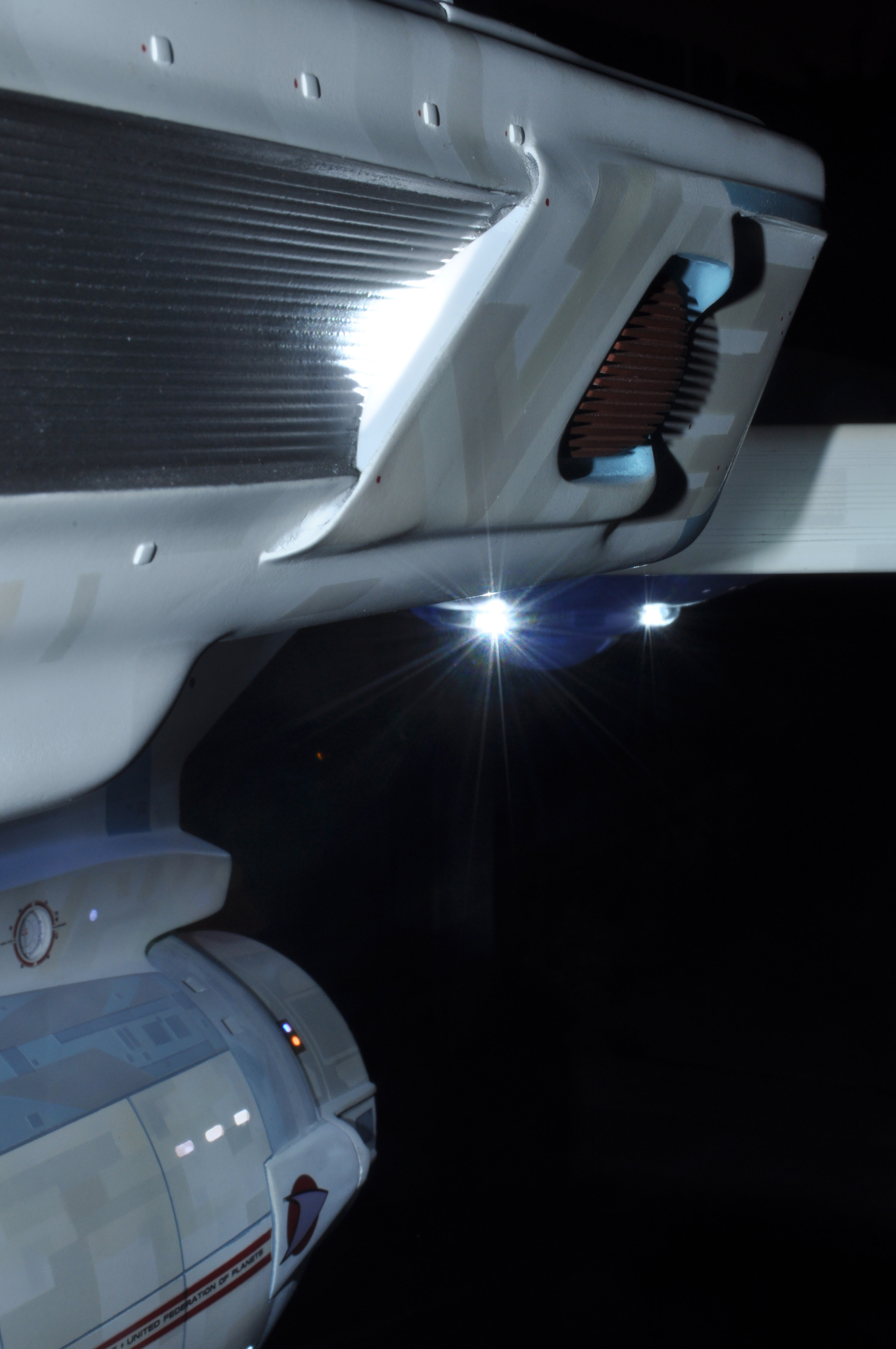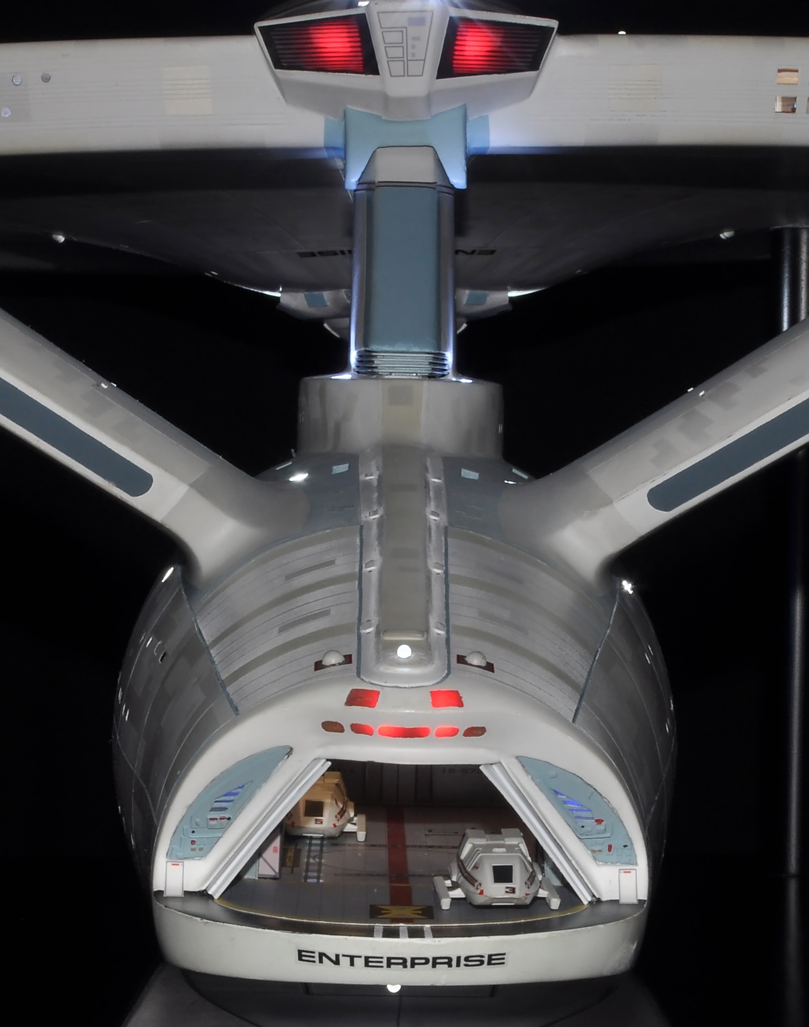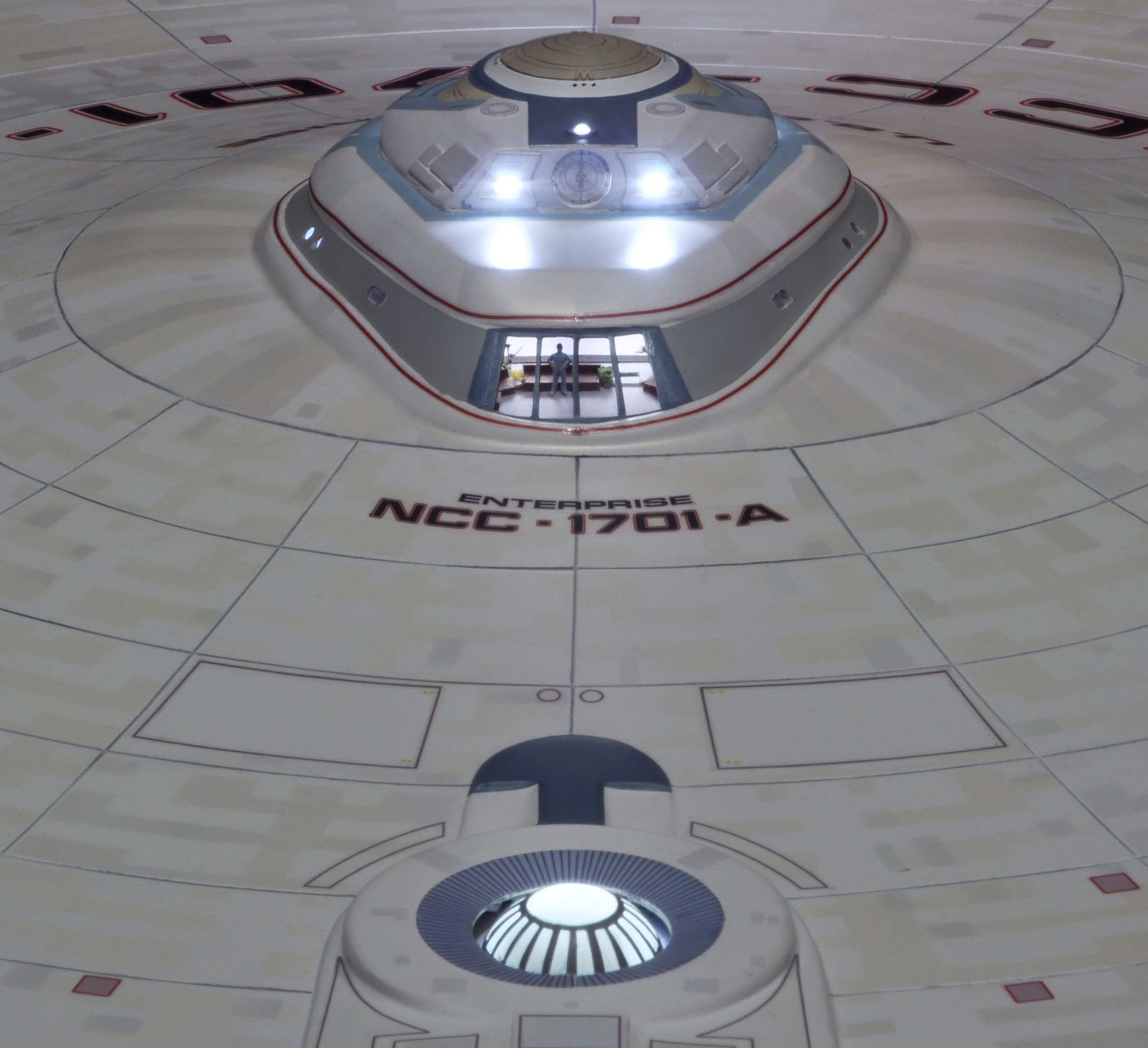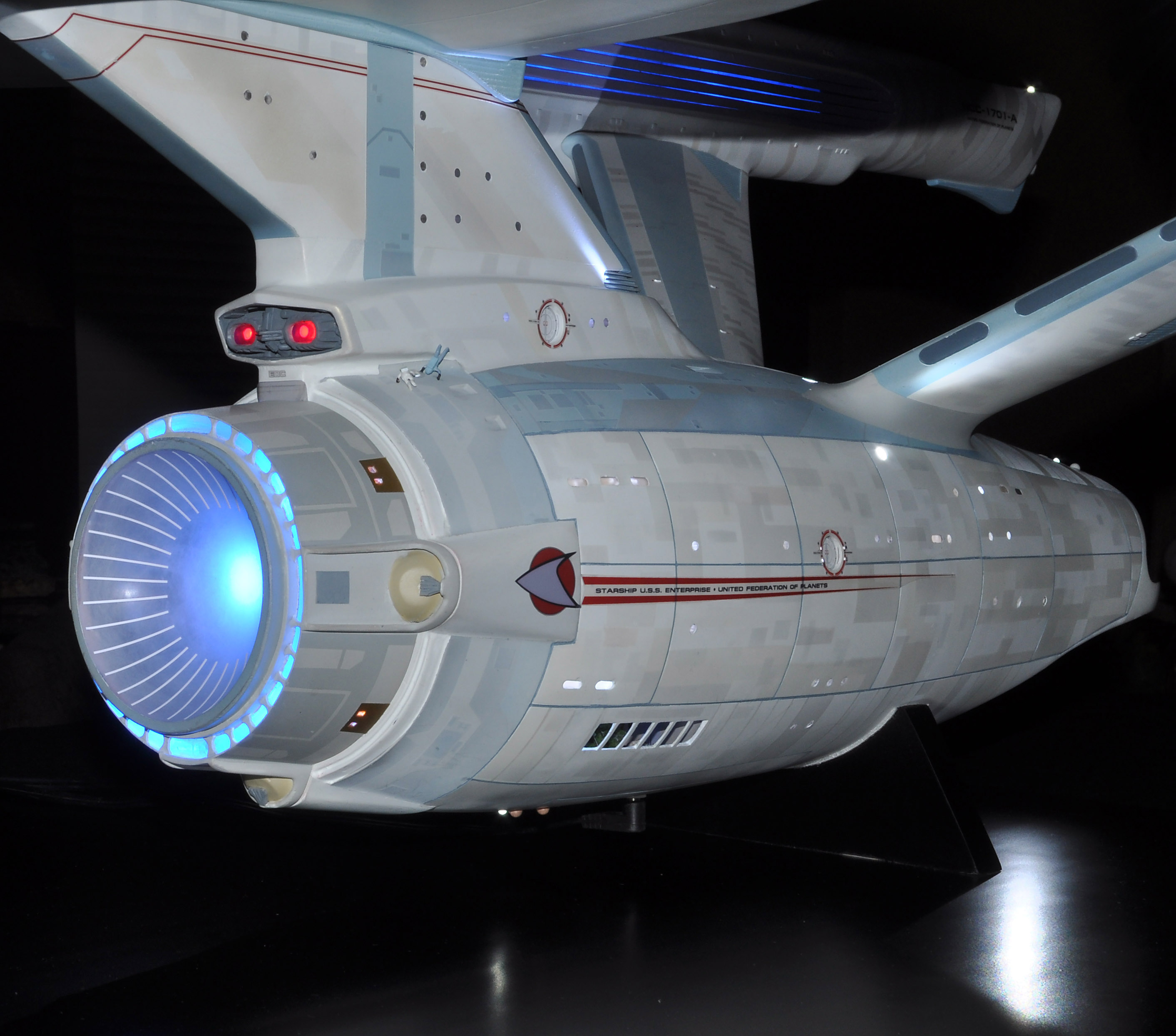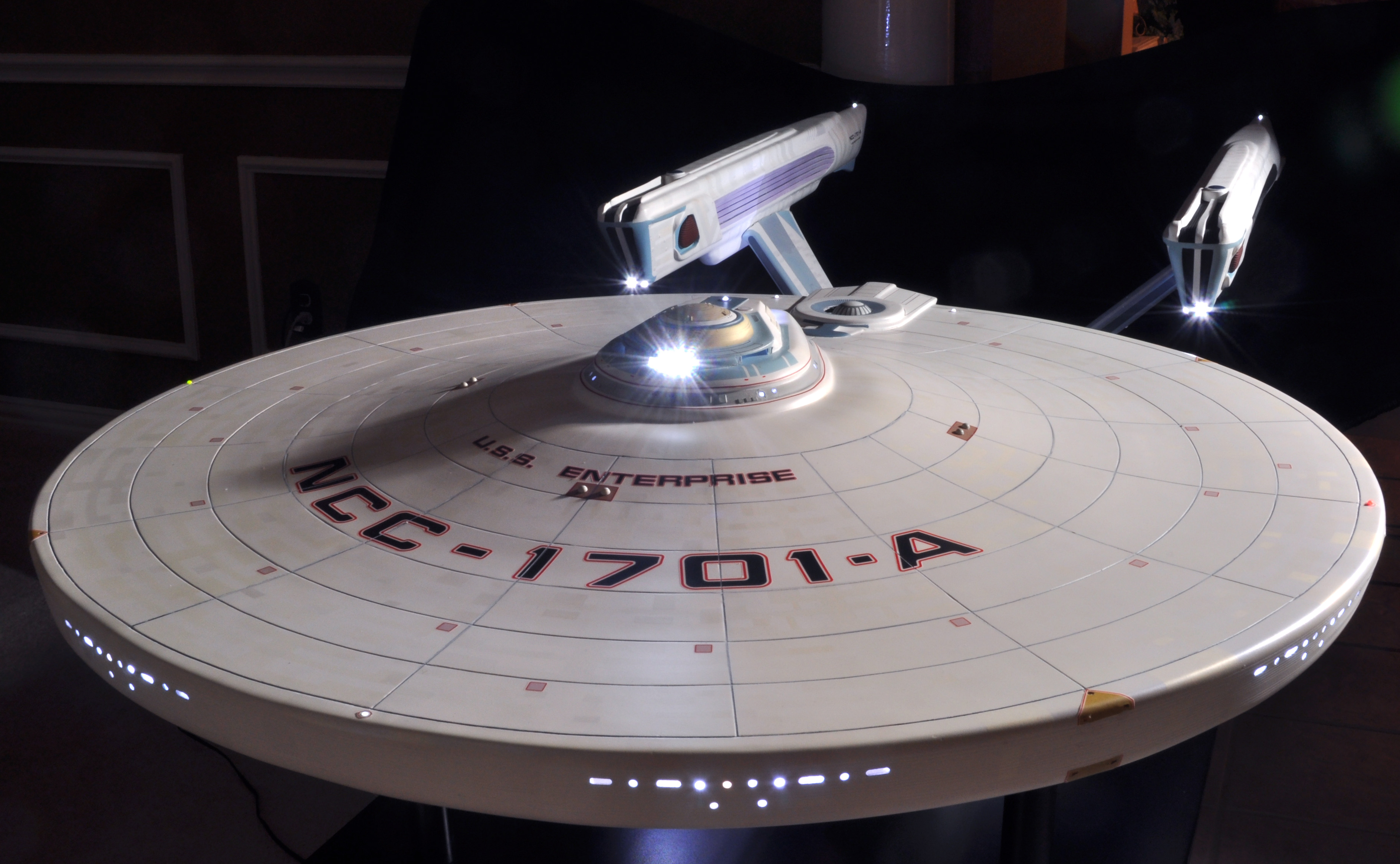I am honored today to be able to introduce a builder to this Gallery who has been inspirational to me in his talents, proving that dreams ARE achievable! Professional Photographer, and Model Master Jason Ware. Using some of the reference shown directly from this site through the Mark Dickson Collection, and using some dramatic lighting from VooDooFX, with over 1500 hours spent building her…. Jason made his dream come true of this 3/4 studio scale scratch build of the most known science fiction vessel in science fiction history… the Enterprise 1701 Refit! This piece is so large that he was even able to place figures in the windows and on the hull! Every bit of lighting accounted for exactly like the original 8 foot filming model… this piece is second to none that I have seen. There have some world class, beautiful builds from large kits of this piece before this time, but none scratch built… and certainly nothing this large! Jason has inspired me to do what I have been wanting to have done…. build and exact replica of the 8 foot filming model. I am completely floored with Jason’s talents in doing this piece and look forward to showing more of his fantastic builds!