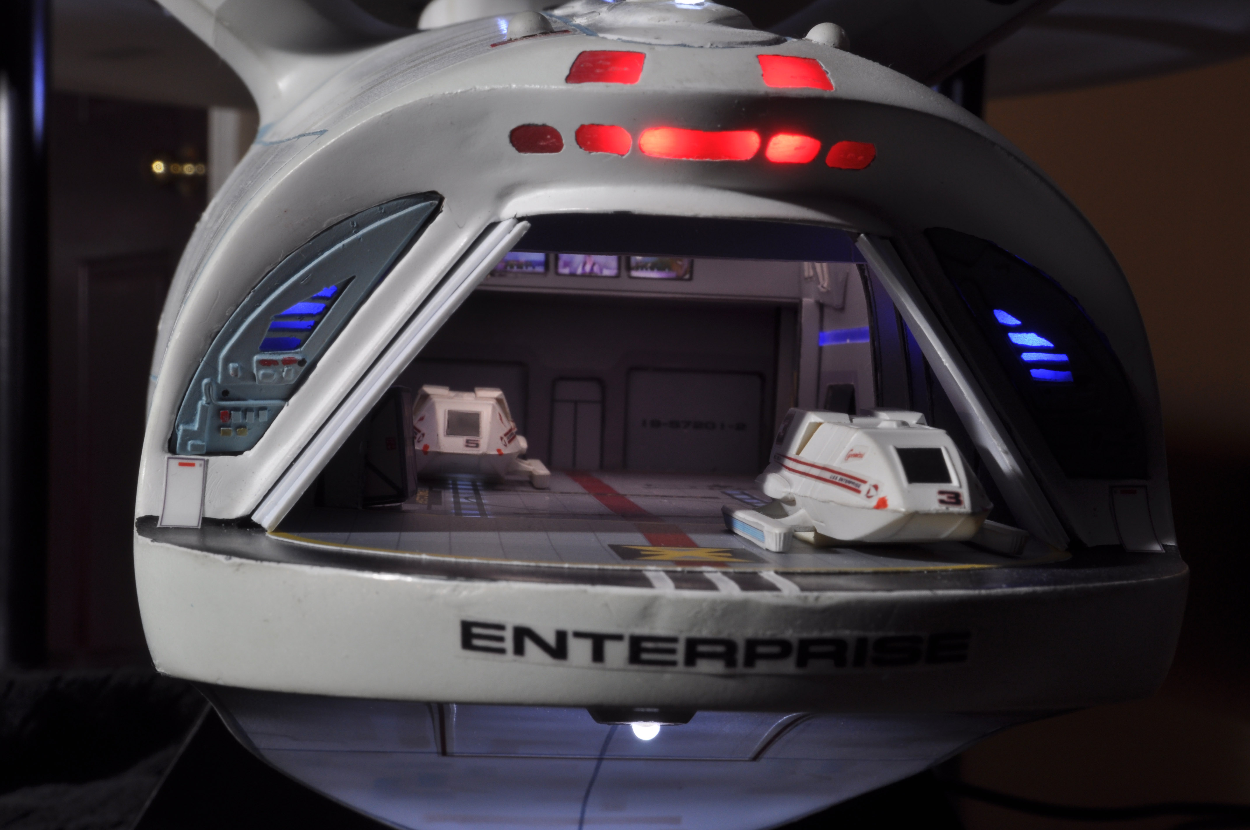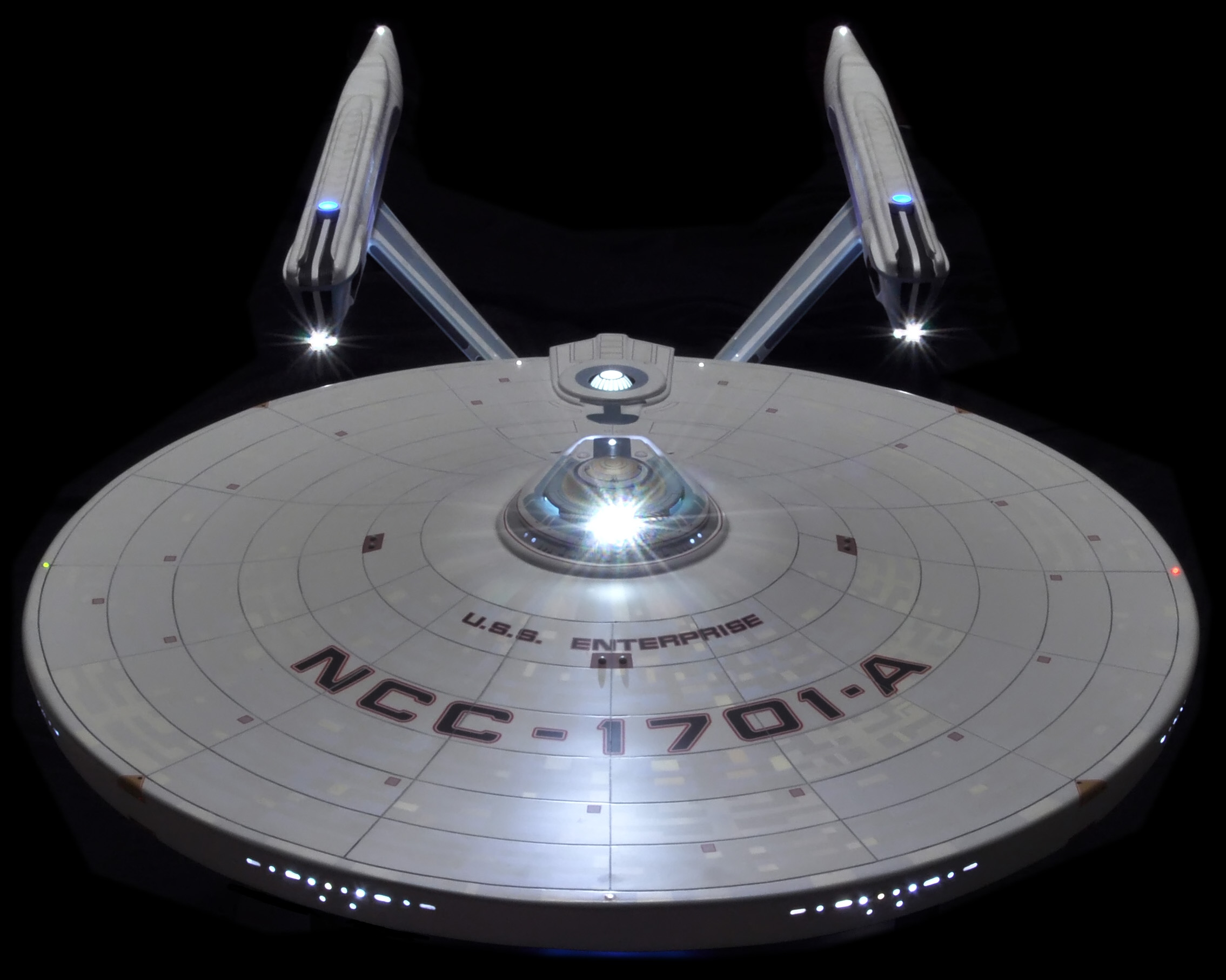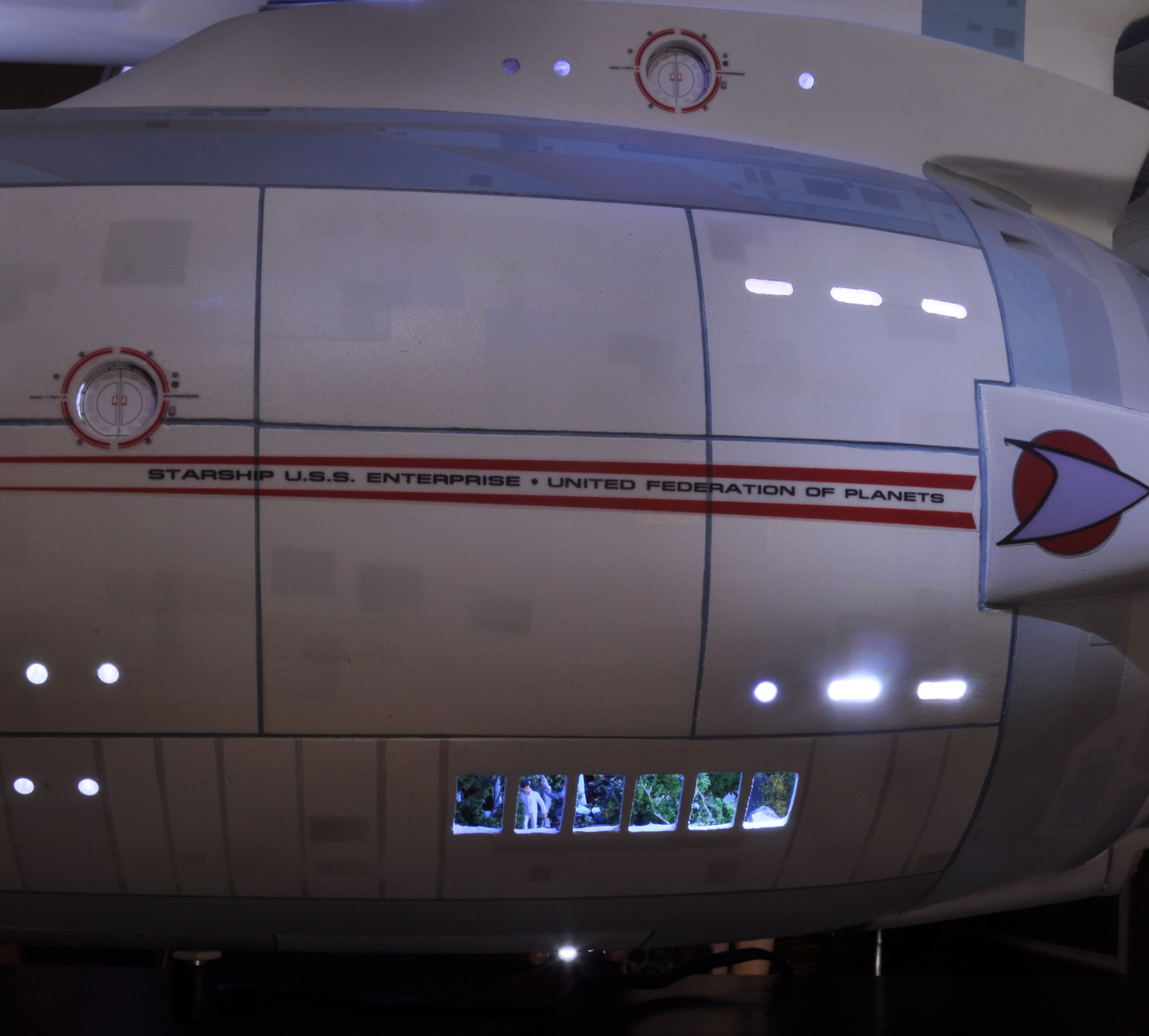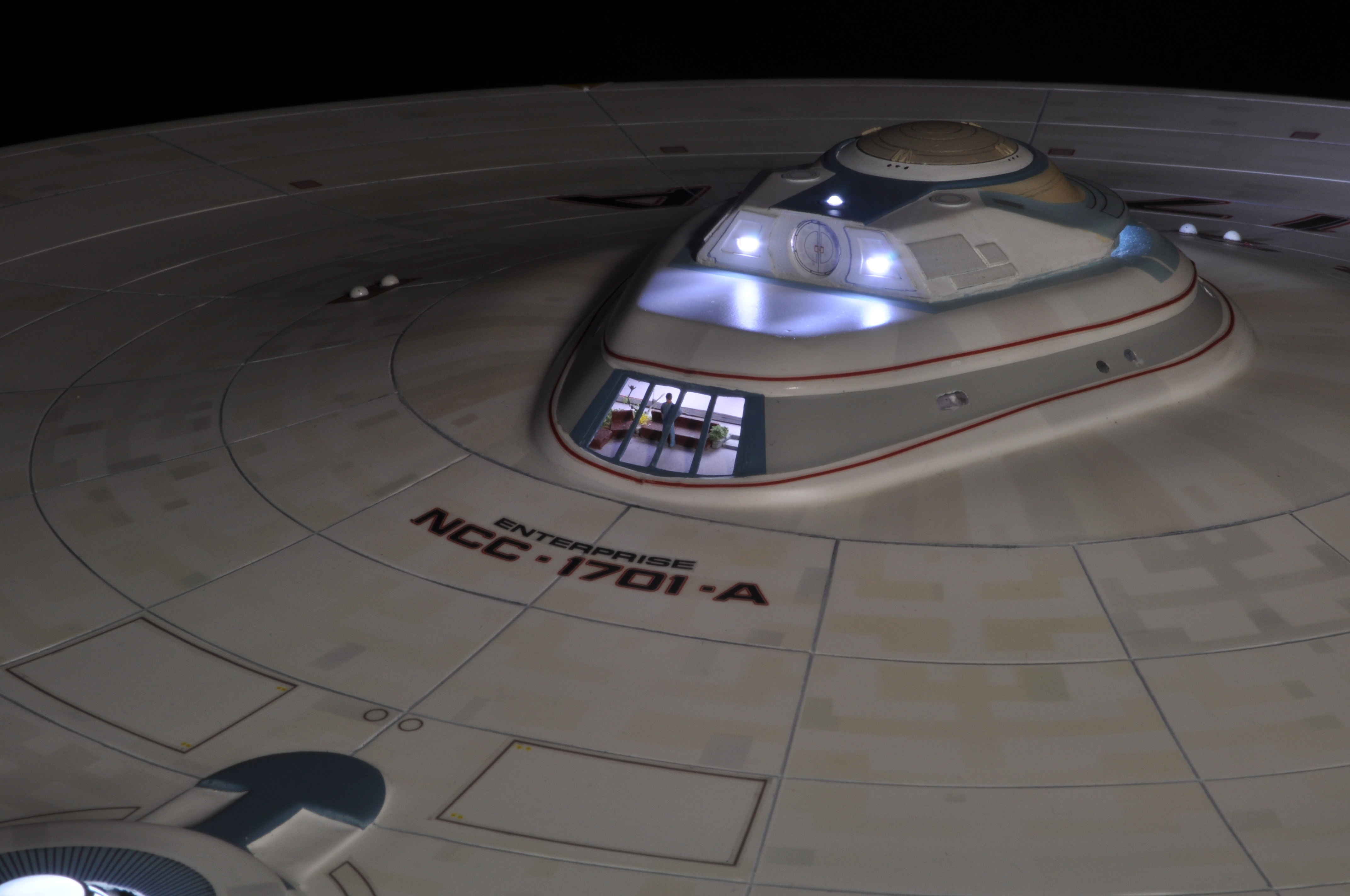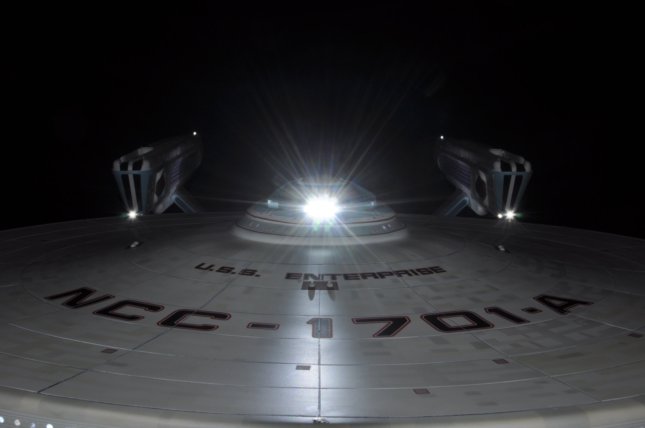 I am honored today to be able to introduce a builder to this Gallery who has been inspirational to me in his talents, proving that dreams ARE achievable! Professional Photographer, and Model Master Jason Ware. Using some of the reference shown directly from this site through the Mark Dickson Collection, and using some dramatic lighting from VooDooFX, with over 1500 hours spent building her…. Jason made his dream come true of this 3/4 studio scale scratch build of the most known science fiction vessel in science fiction history… the Enterprise 1701 Refit! This piece is so large that he was even able to place figures in the windows and on the hull! Every bit of lighting accounted for exactly like the original 8 foot filming model… this piece is second to none that I have seen. There have some world class, beautiful builds from large kits of this piece before this time, but none scratch built… and certainly nothing this large! Jason has inspired me to do what I have been wanting to have done…. build and exact replica of the 8 foot filming model. I am completely floored with Jason’s talents in doing this piece and look forward to showing more of his fantastic builds!