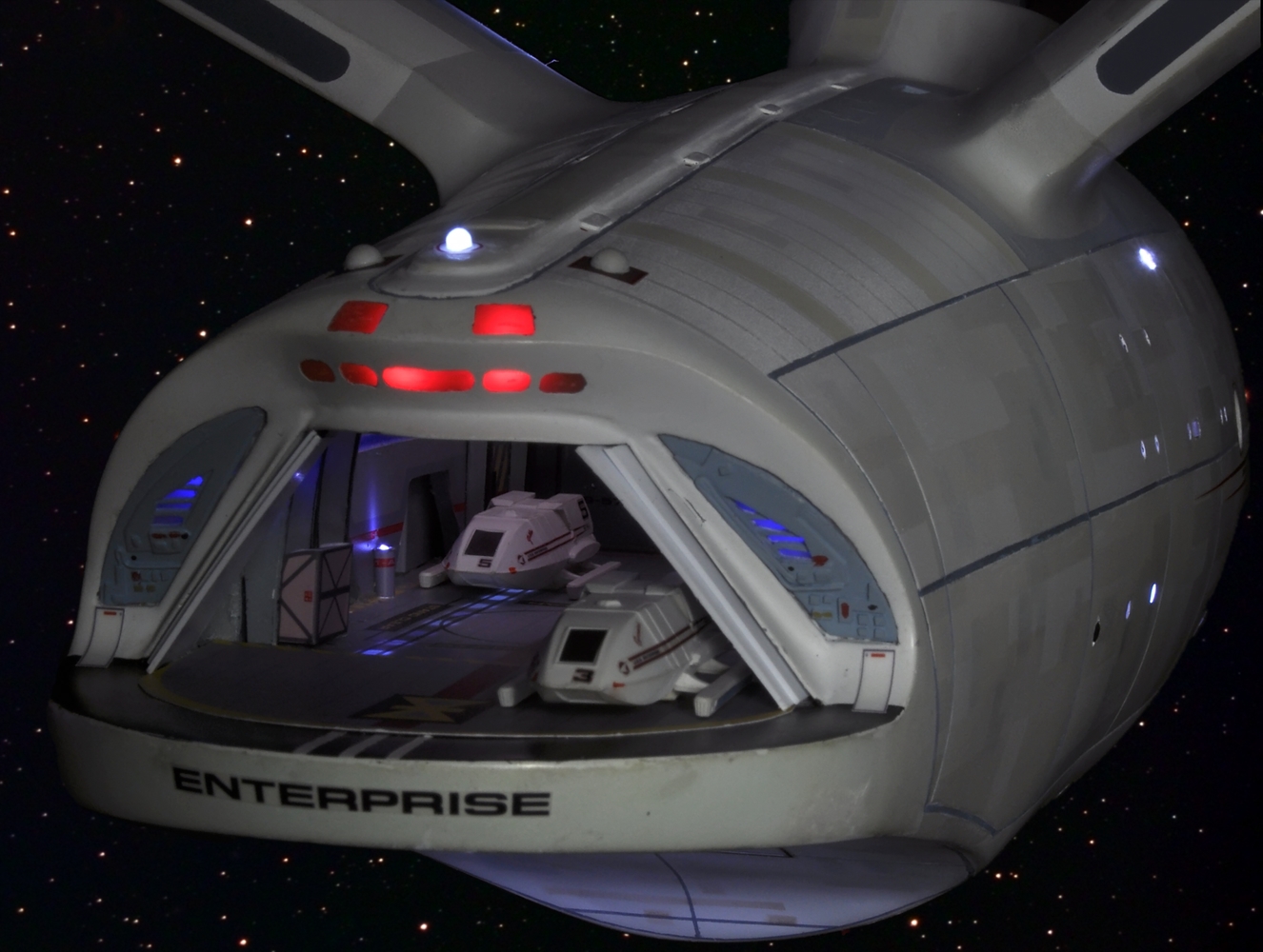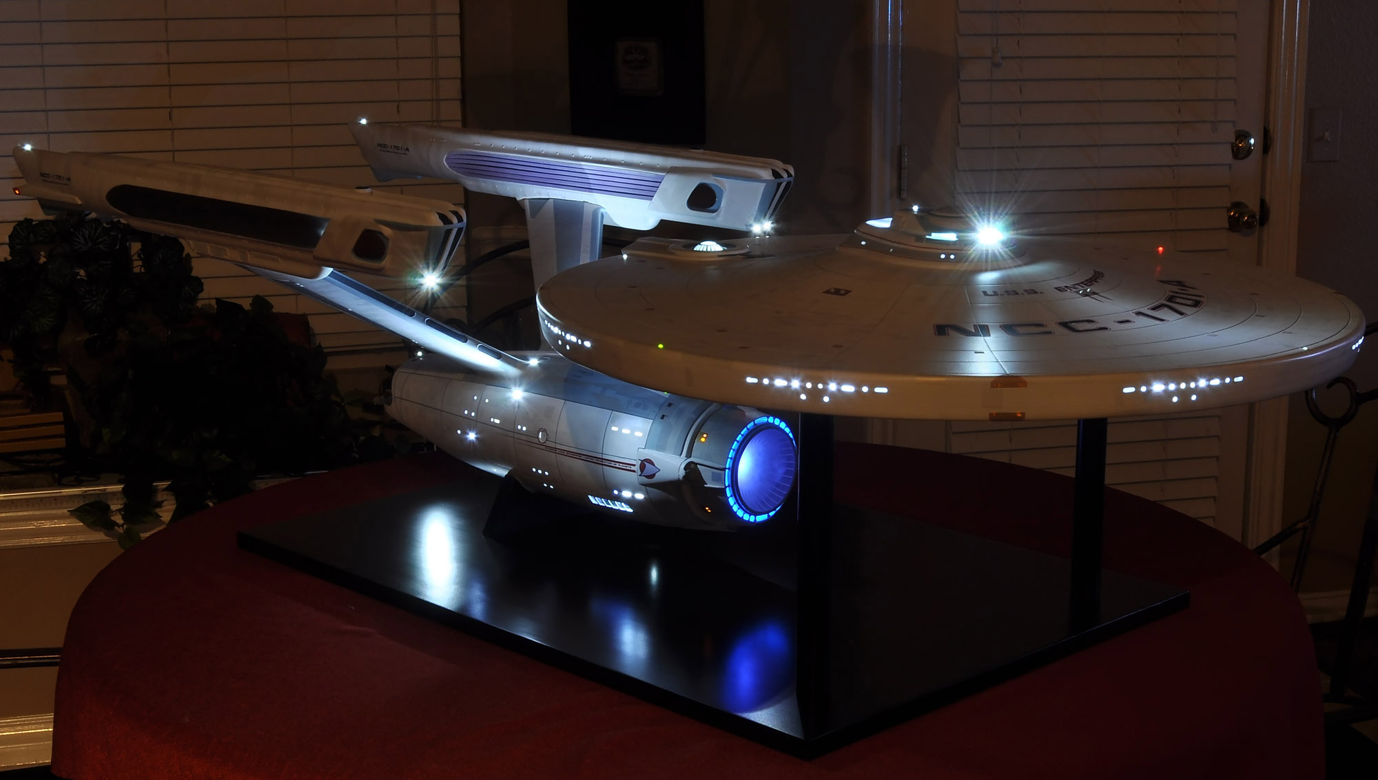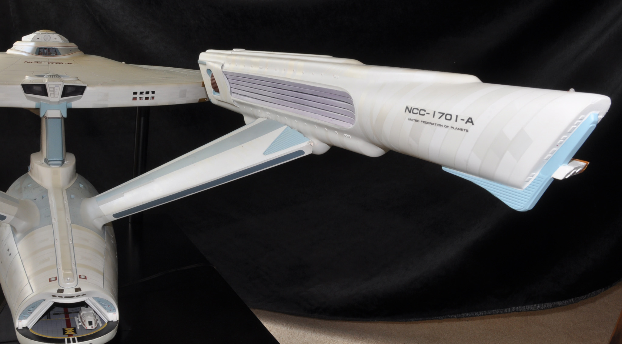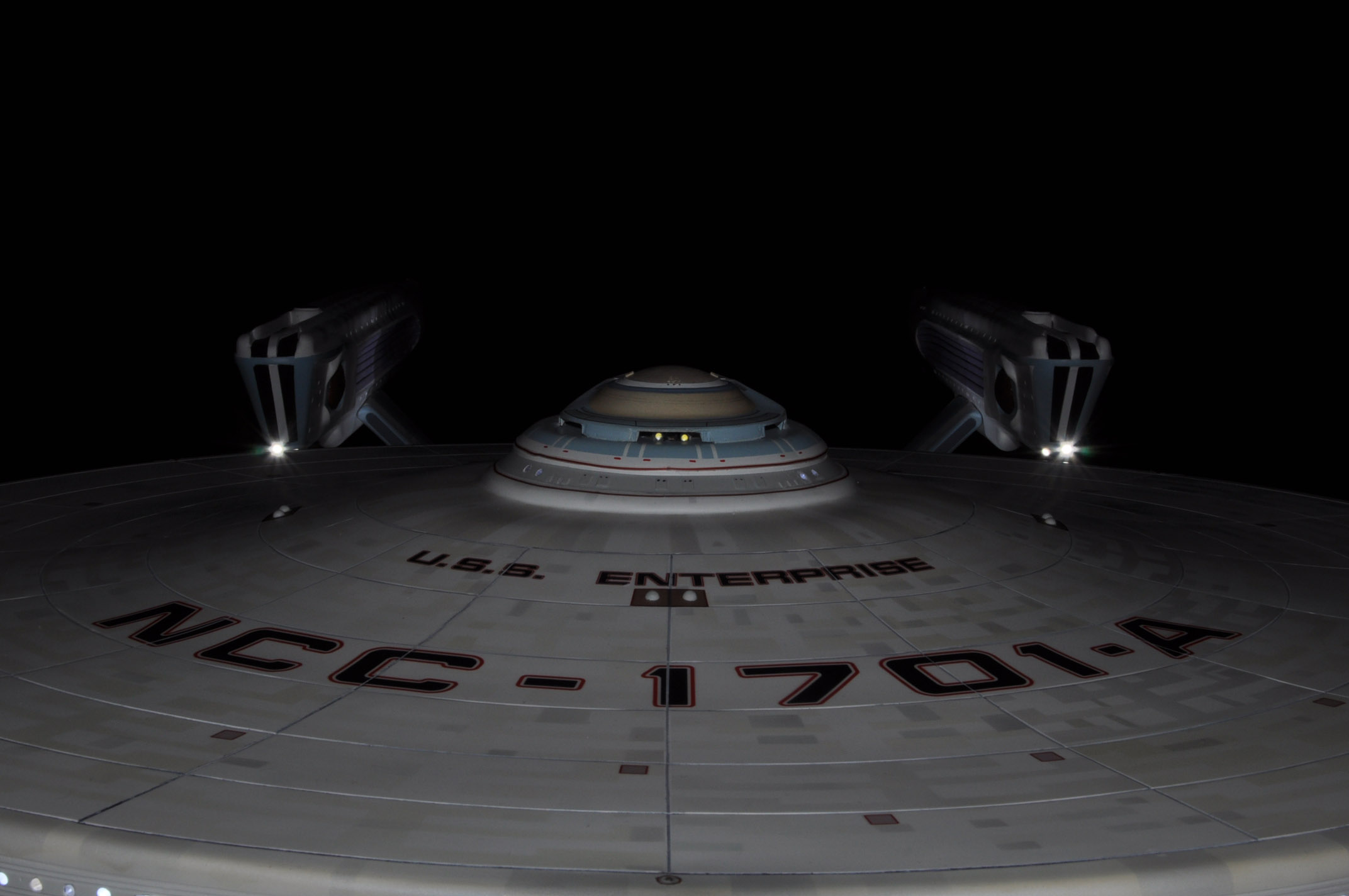 I am honored today to be able to introduce a builder to this Gallery who has been inspirational to me in his talents, proving that dreams ARE achievable! Professional Photographer, and Model Master Jason Ware. Using some of the reference shown directly from this site through the Mark Dickson Collection, and using some dramatic lighting from VooDooFX, with over 1500 hours spent building her…. Jason made his dream come true of this 3/4 studio scale scratch build of the most known science fiction vessel in science fiction history… the Enterprise 1701 Refit! This piece is so large that he was even able to place figures in the windows and on the hull! Every bit of lighting accounted for exactly like the original 8 foot filming model… this piece is second to none that I have seen. There have some world class, beautiful builds from large kits of this piece before this time, but none scratch built… and certainly nothing this large! Jason has inspired me to do what I have been wanting to have done…. build and exact replica of the 8 foot filming model. I am completely floored with Jason’s talents in doing this piece and look forward to showing more of his fantastic builds!