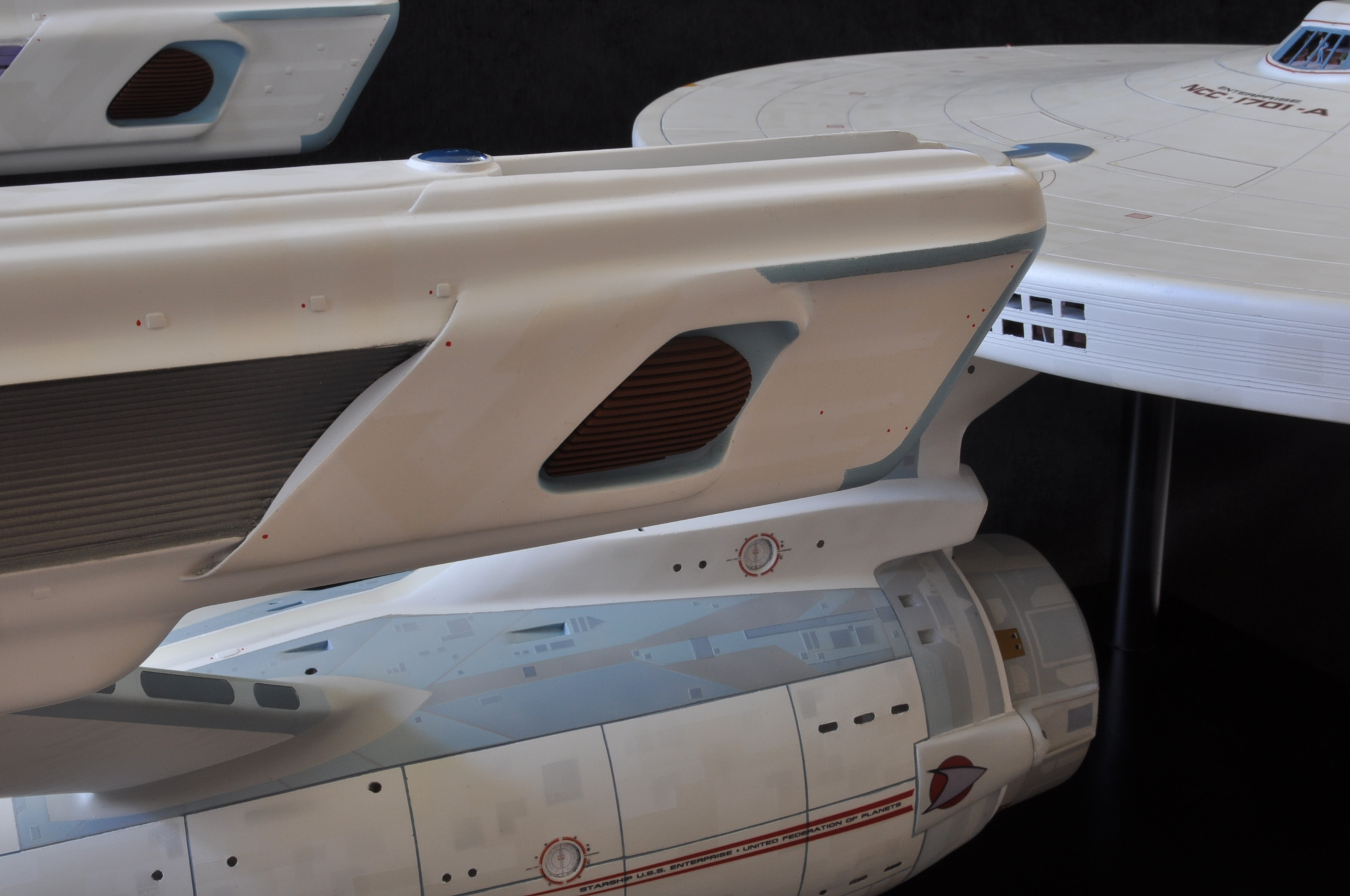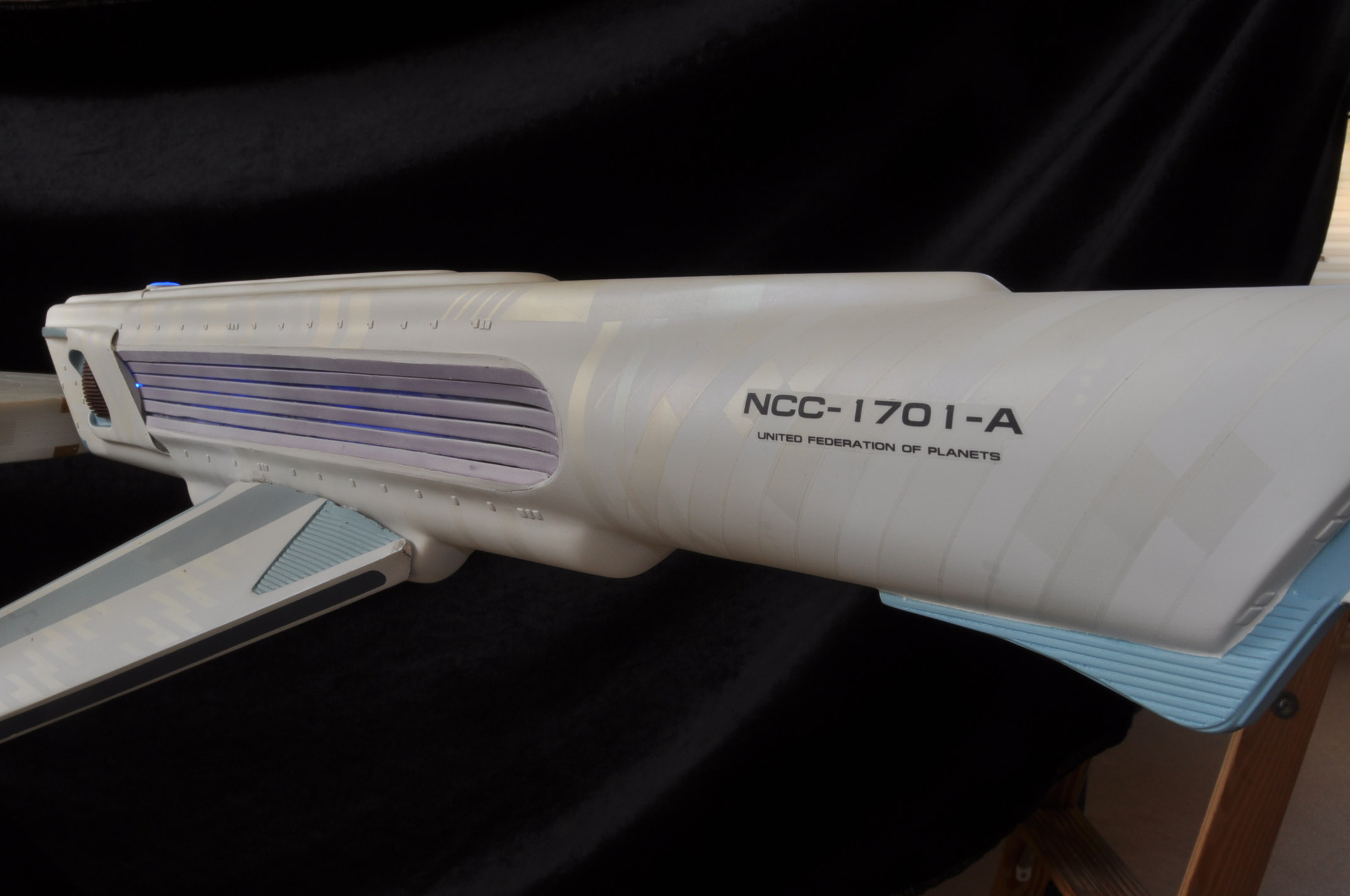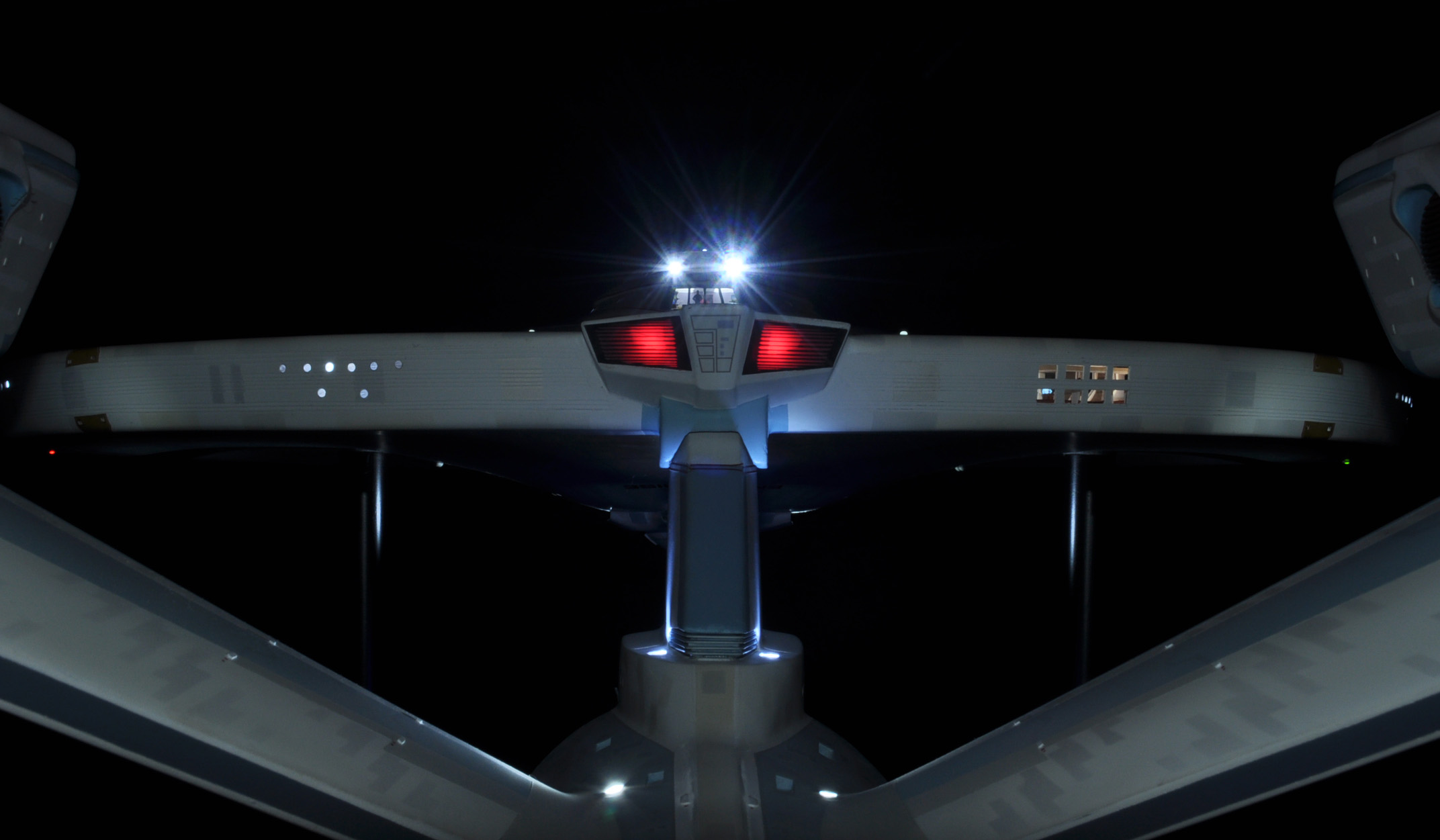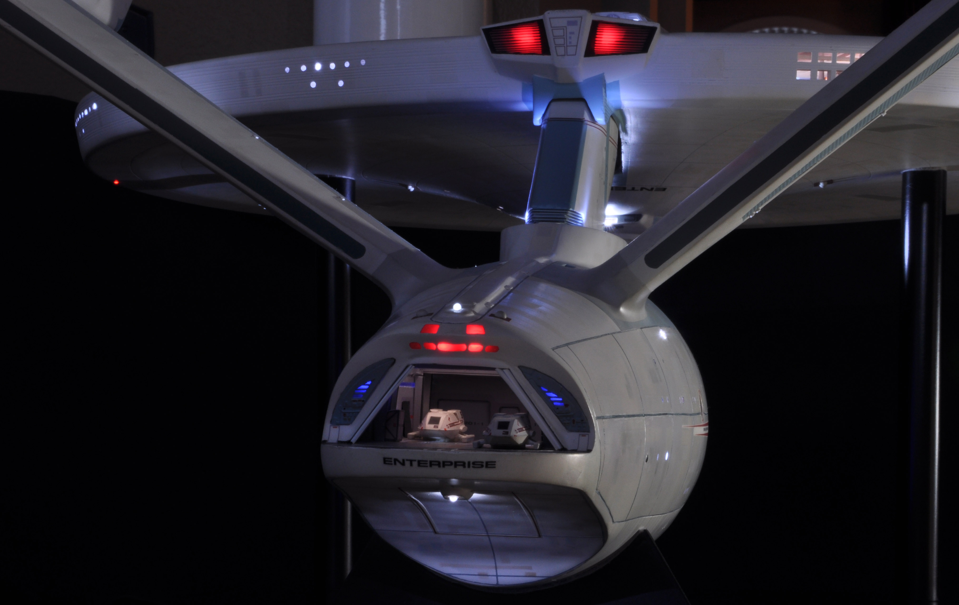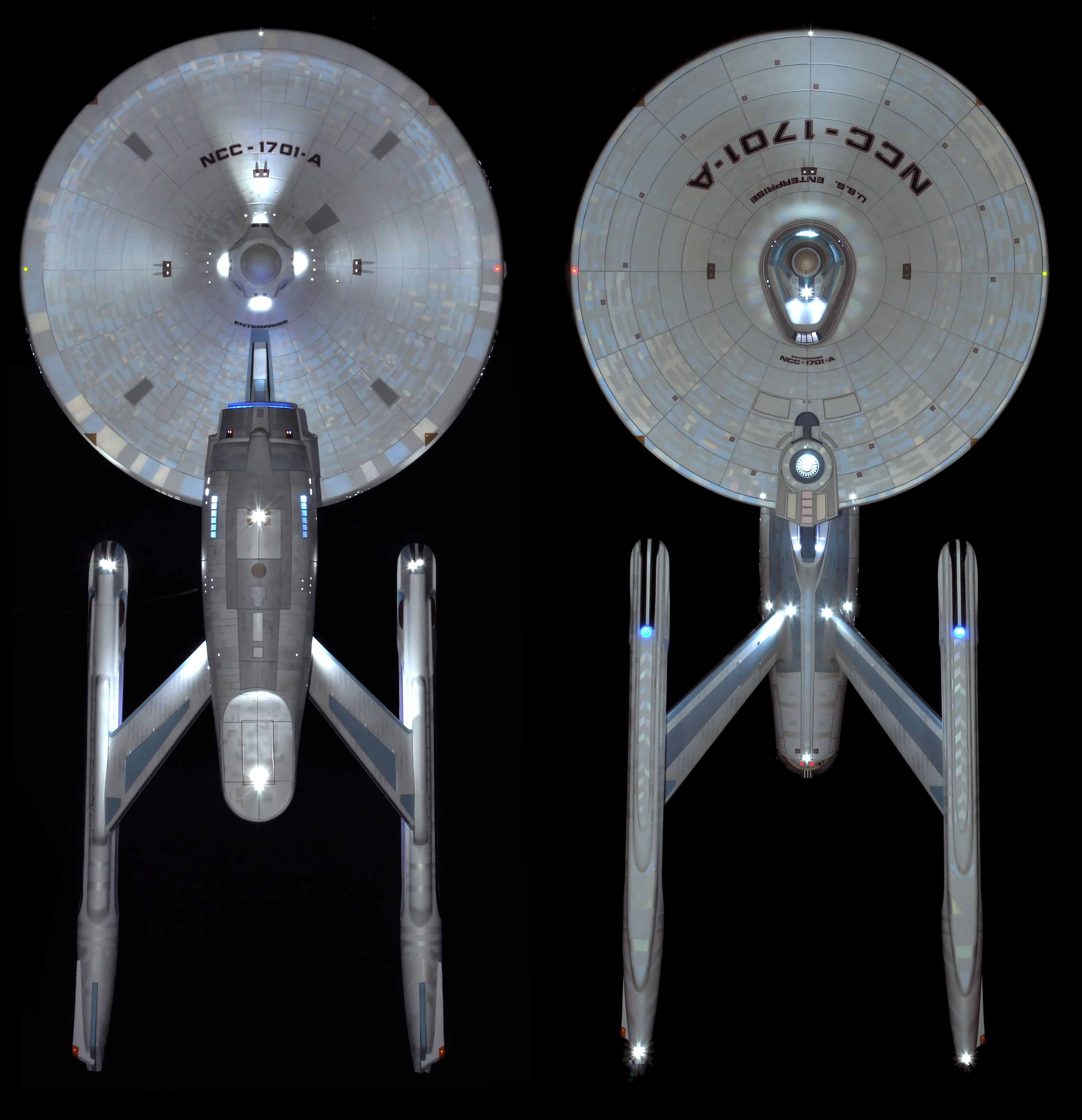 I am honored today to be able to introduce a builder to this Gallery who has been inspirational to me in his talents, proving that dreams ARE achievable! Professional Photographer, and Model Master Jason Ware. Using some of the reference shown directly from this site through the Mark Dickson Collection, and using some dramatic lighting from VooDooFX, with over 1500 hours spent building her…. Jason made his dream come true of this 3/4 studio scale scratch build of the most known science fiction vessel in science fiction history… the Enterprise 1701 Refit! This piece is so large that he was even able to place figures in the windows and on the hull! Every bit of lighting accounted for exactly like the original 8 foot filming model… this piece is second to none that I have seen. There have some world class, beautiful builds from large kits of this piece before this time, but none scratch built… and certainly nothing this large! Jason has inspired me to do what I have been wanting to have done…. build and exact replica of the 8 foot filming model. I am completely floored with Jason’s talents in doing this piece and look forward to showing more of his fantastic builds!