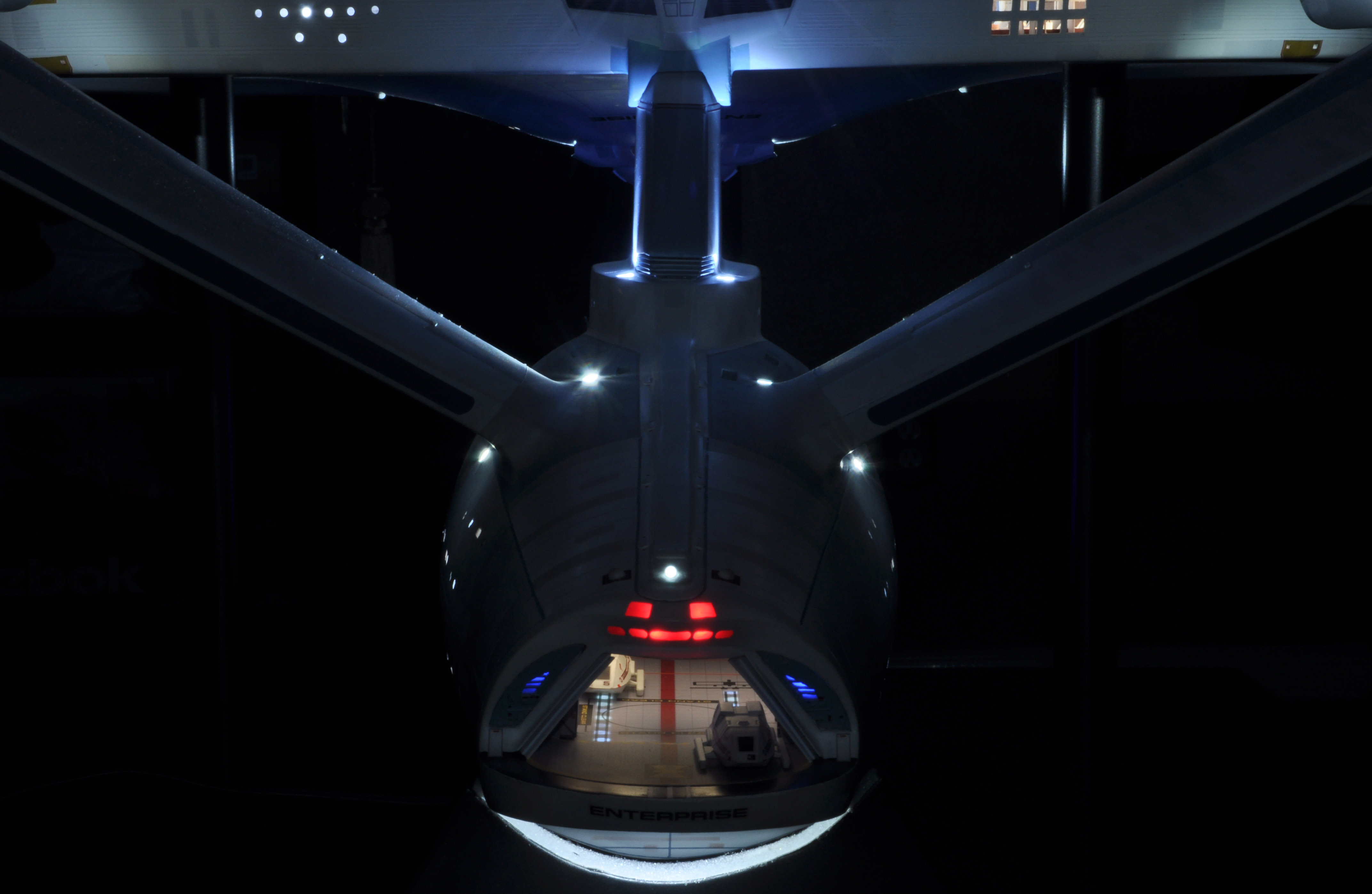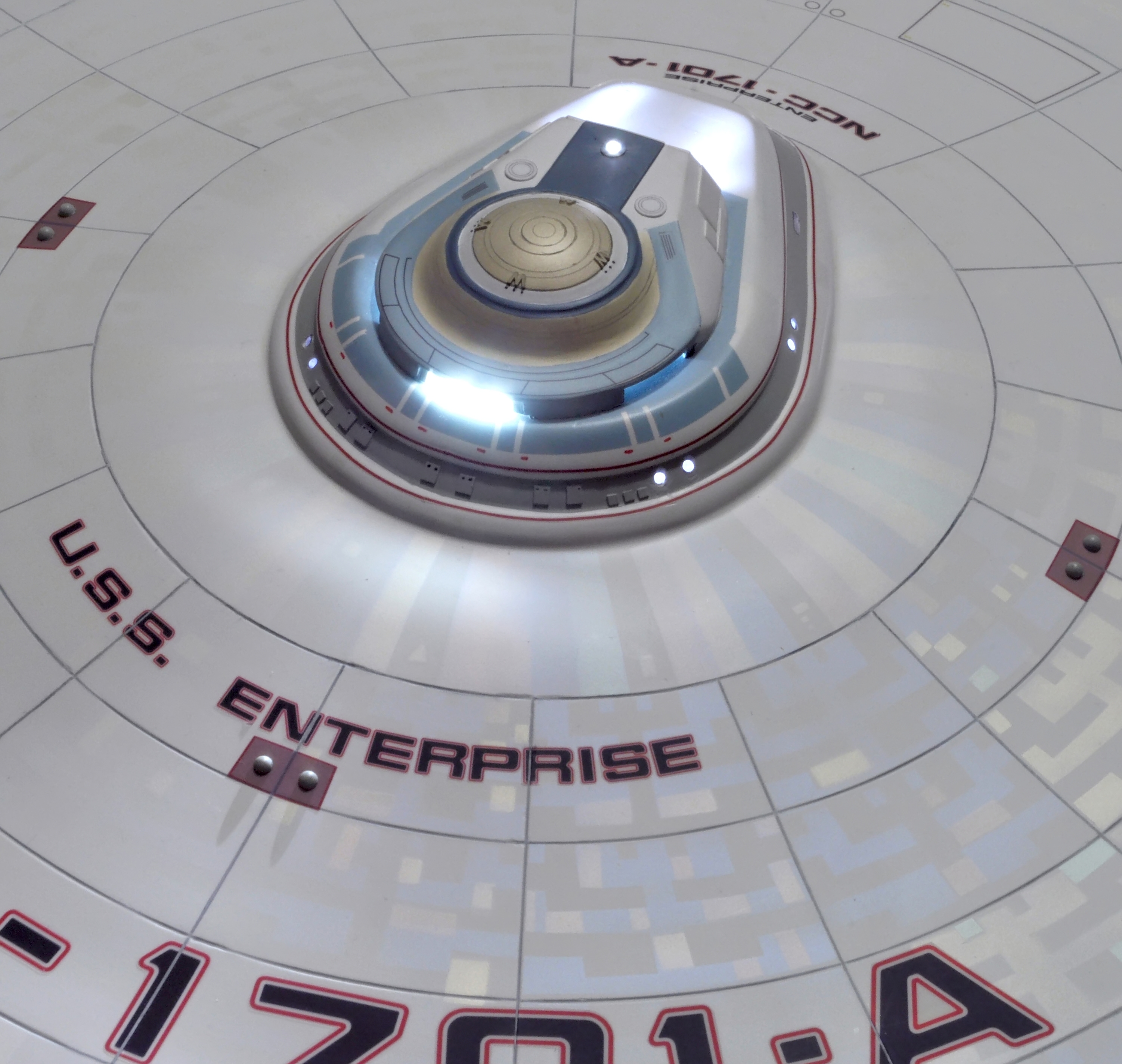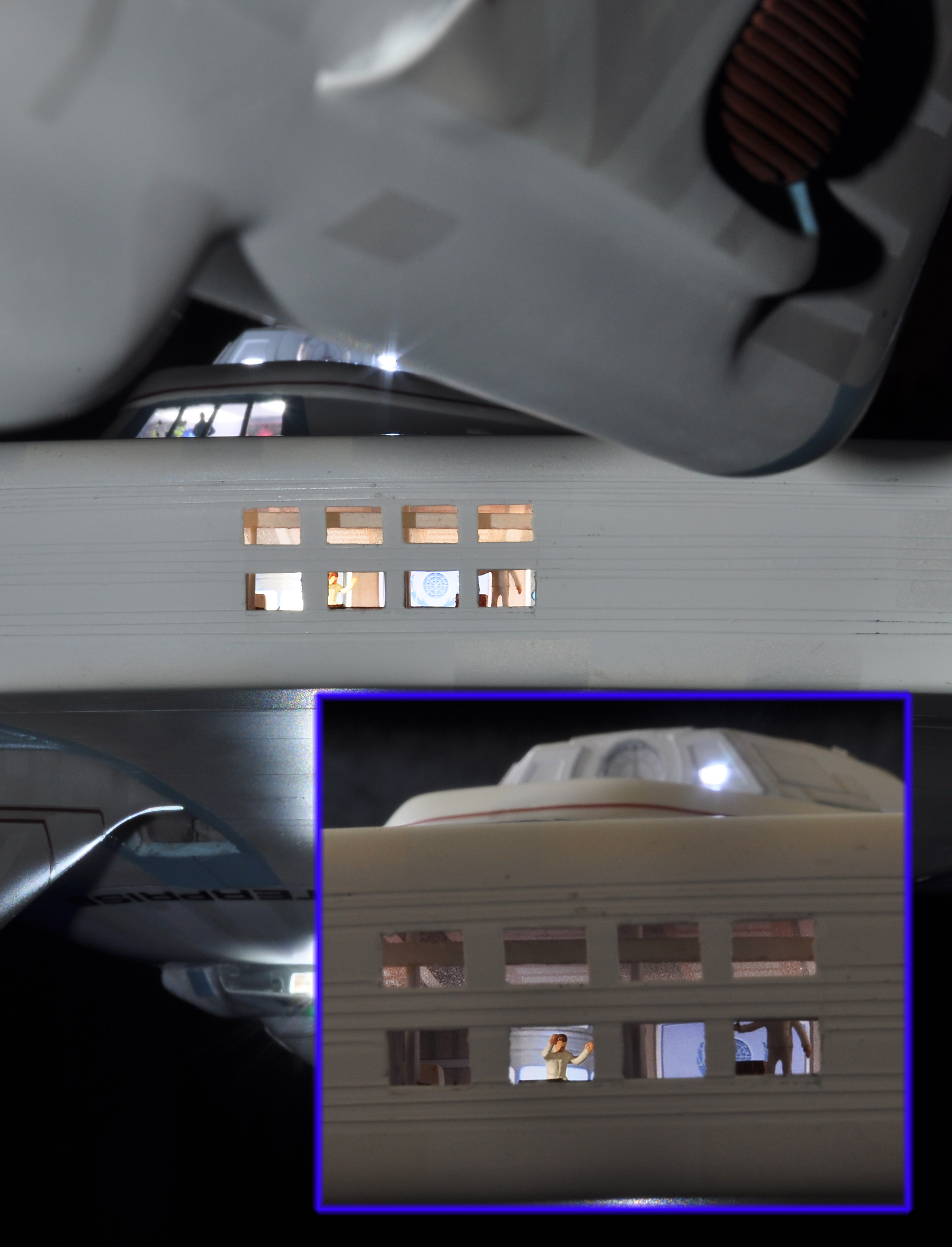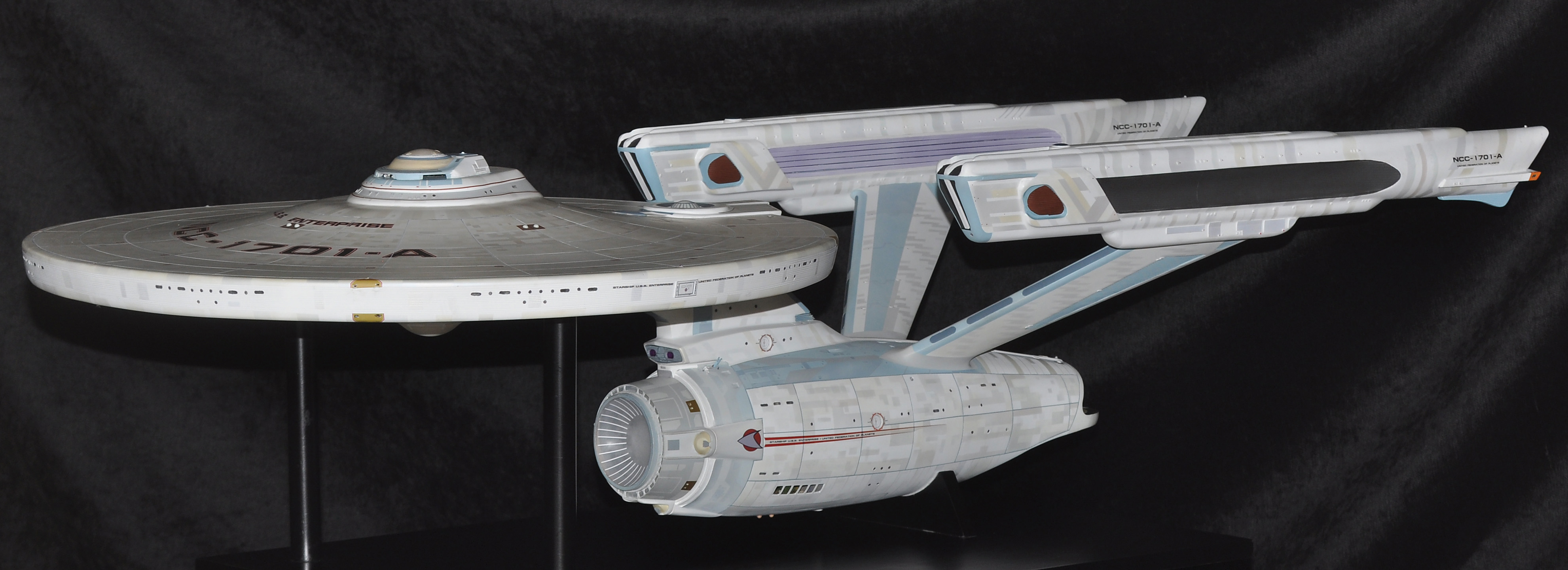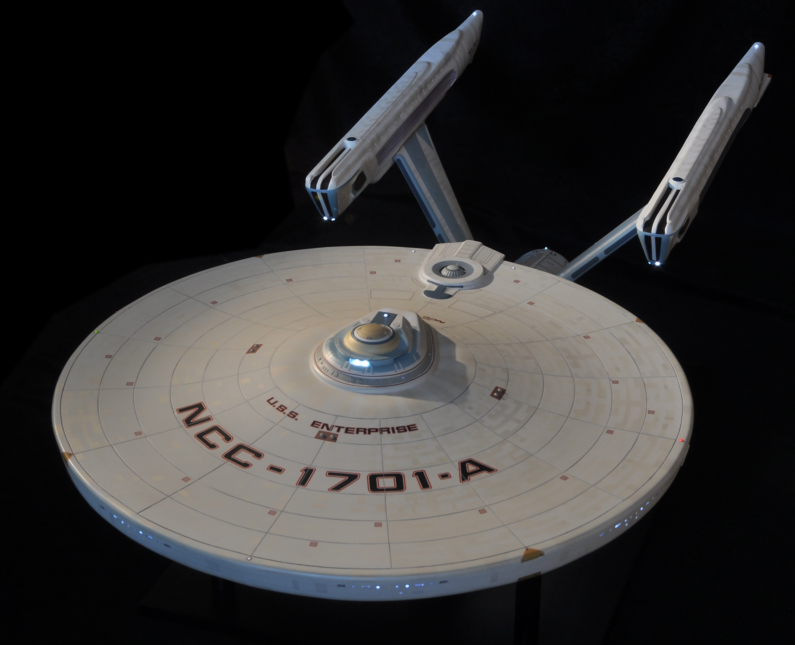I am honored today to be able to introduce a builder to this Gallery who has been inspirational to me in his talents, proving that dreams ARE achievable! Professional Photographer, and Model Master Jason Ware. Using some of the reference shown directly from this site through the Mark Dickson Collection, and using some dramatic lighting from VooDooFX, with over 1500 hours spent building her…. Jason made his dream come true of this 3/4 studio scale scratch build of the most known science fiction vessel in science fiction history… the Enterprise 1701 Refit! This piece is so large that he was even able to place figures in the windows and on the hull! Every bit of lighting accounted for exactly like the original 8 foot filming model… this piece is second to none that I have seen. There have some world class, beautiful builds from large kits of this piece before this time, but none scratch built… and certainly nothing this large! Jason has inspired me to do what I have been wanting to have done…. build and exact replica of the 8 foot filming model. I am completely floored with Jason’s talents in doing this piece and look forward to showing more of his fantastic builds!