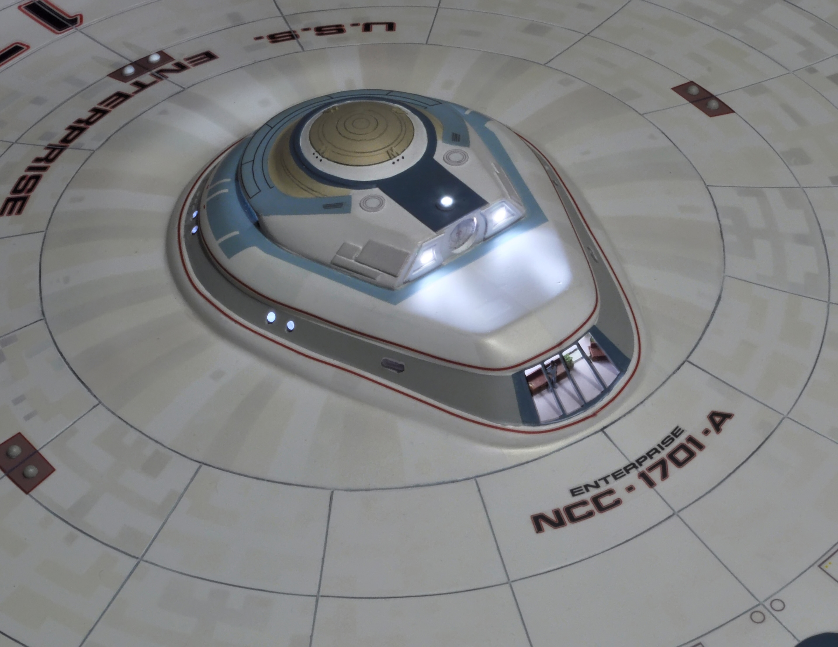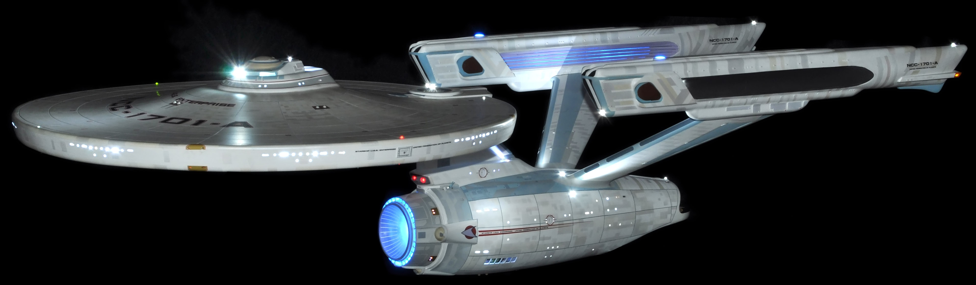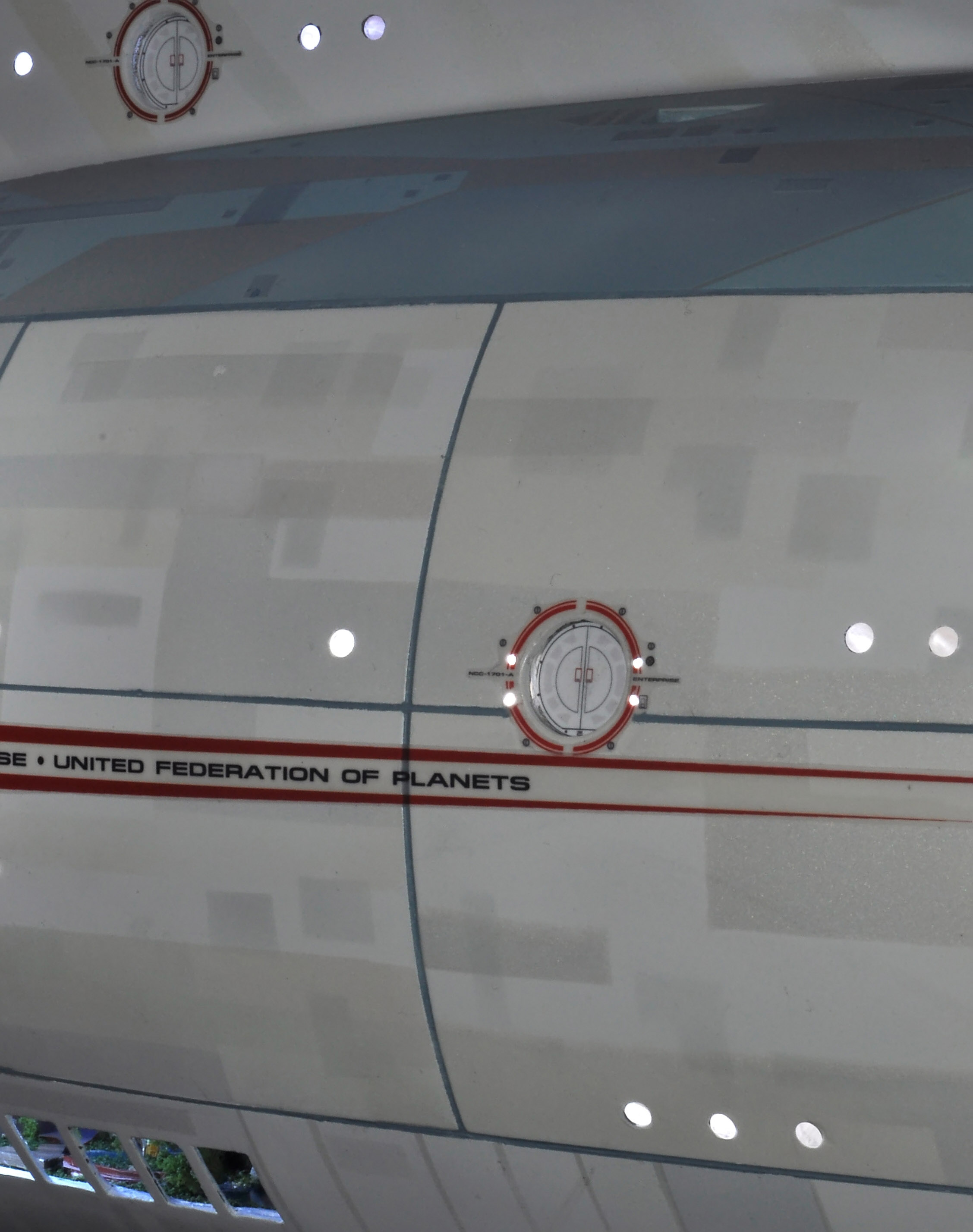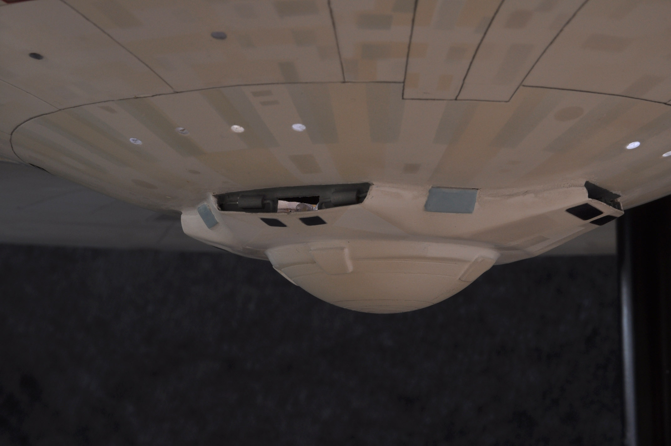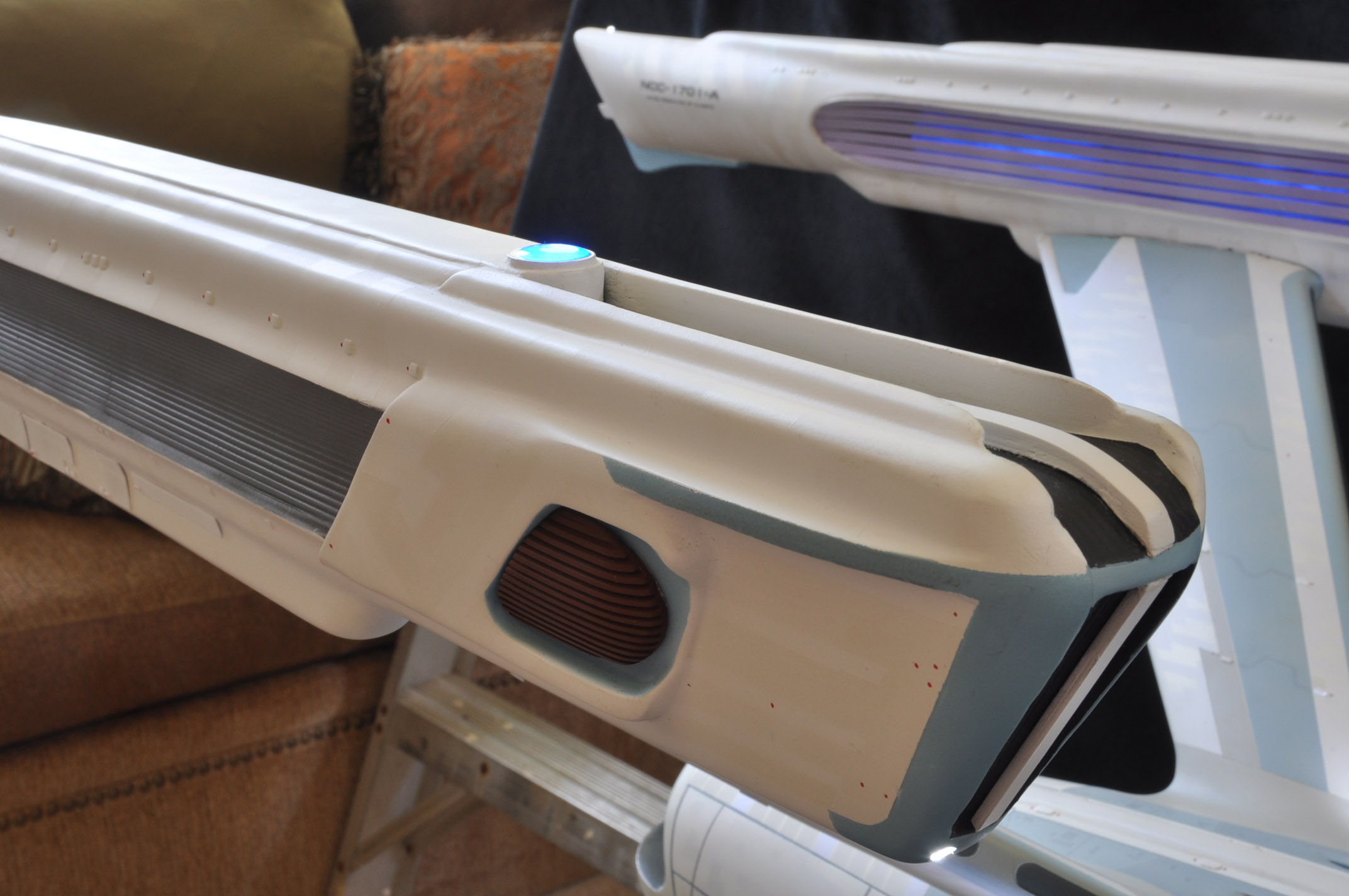 I am honored today to be able to introduce a builder to this Gallery who has been inspirational to me in his talents, proving that dreams ARE achievable! Professional Photographer, and Model Master Jason Ware. Using some of the reference shown directly from this site through the Mark Dickson Collection, and using some dramatic lighting from VooDooFX, with over 1500 hours spent building her…. Jason made his dream come true of this 3/4 studio scale scratch build of the most known science fiction vessel in science fiction history… the Enterprise 1701 Refit! This piece is so large that he was even able to place figures in the windows and on the hull! Every bit of lighting accounted for exactly like the original 8 foot filming model… this piece is second to none that I have seen. There have some world class, beautiful builds from large kits of this piece before this time, but none scratch built… and certainly nothing this large! Jason has inspired me to do what I have been wanting to have done…. build and exact replica of the 8 foot filming model. I am completely floored with Jason’s talents in doing this piece and look forward to showing more of his fantastic builds!