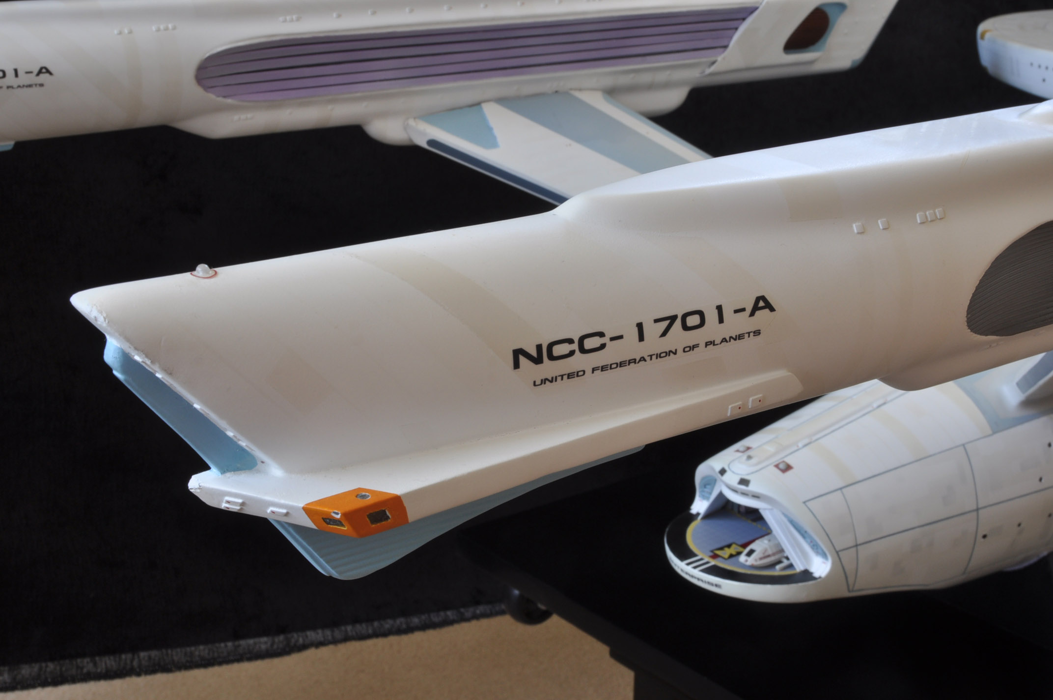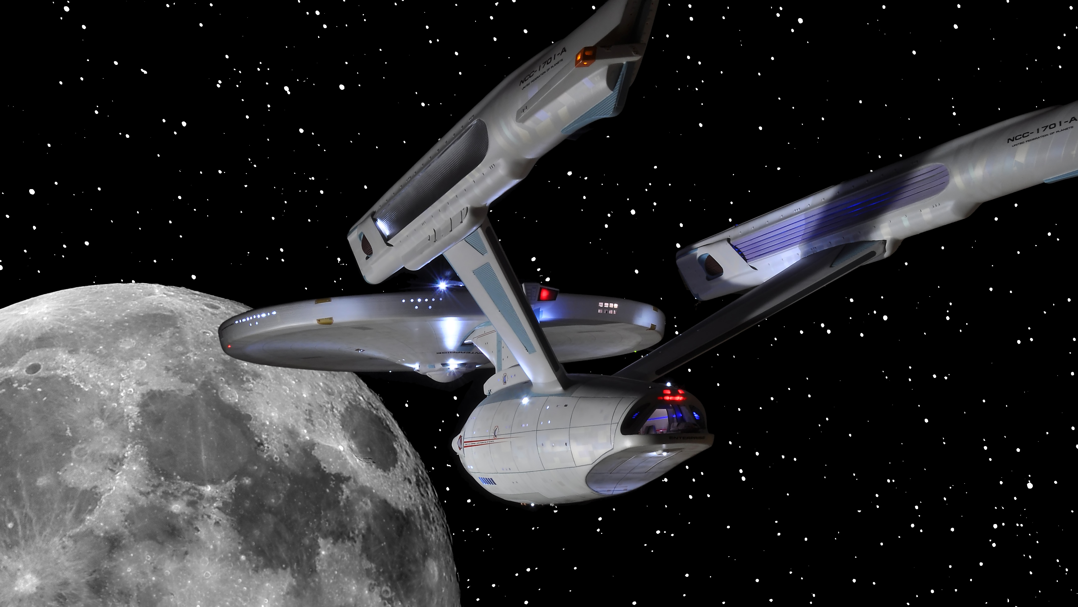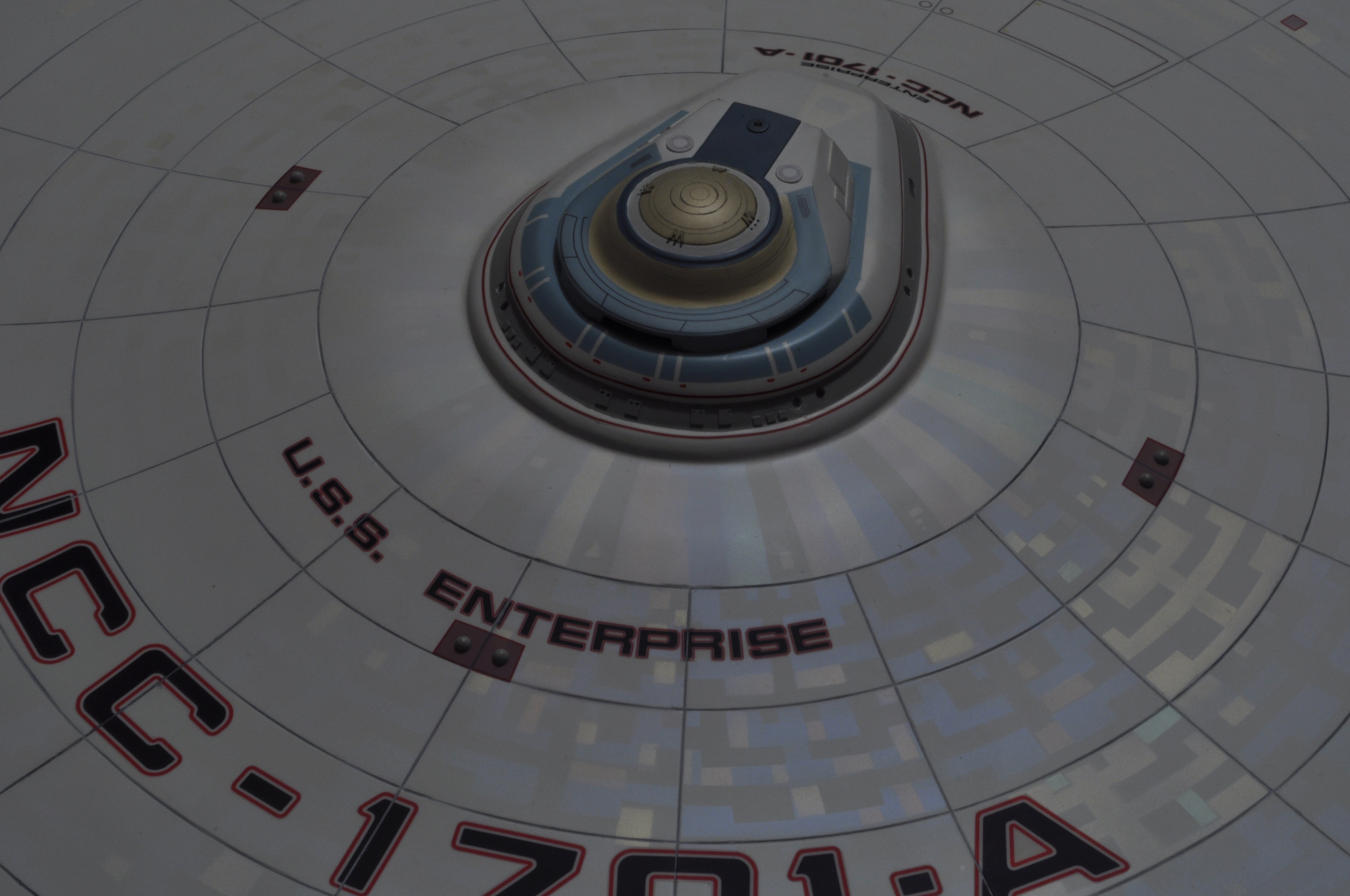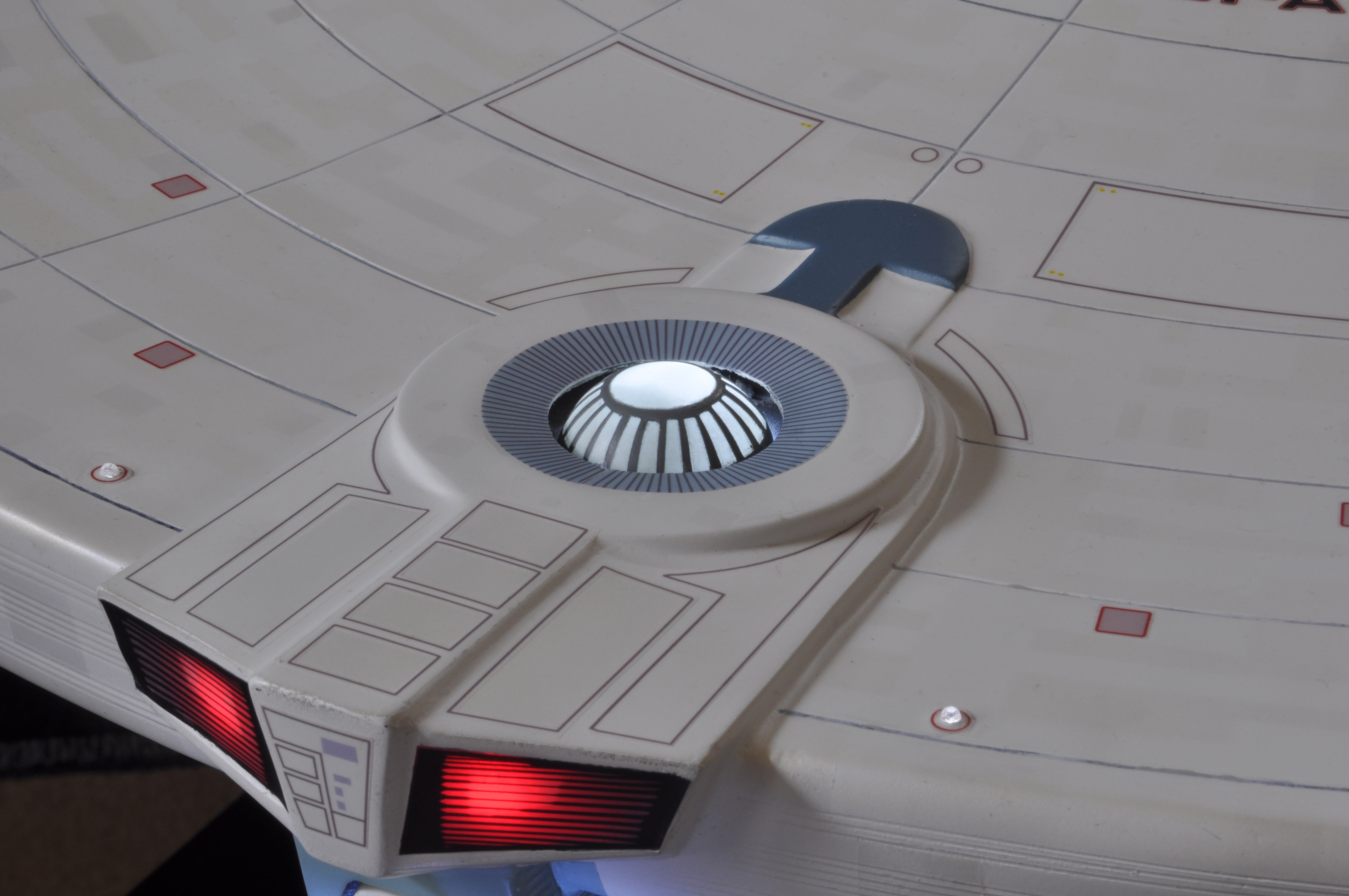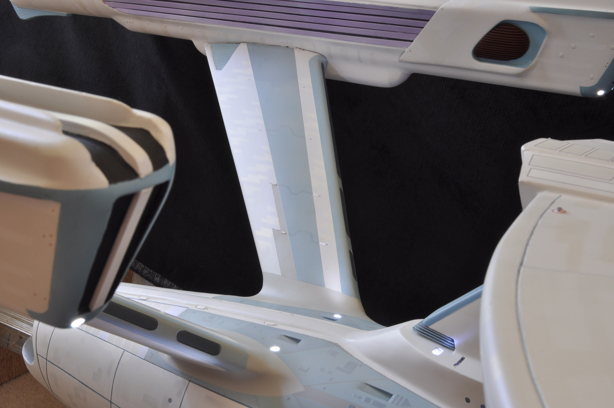 I am honored today to be able to introduce a builder to this Gallery who has been inspirational to me in his talents, proving that dreams ARE achievable! Professional Photographer, and Model Master Jason Ware. Using some of the reference shown directly from this site through the Mark Dickson Collection, and using some dramatic lighting from VooDooFX, with over 1500 hours spent building her…. Jason made his dream come true of this 3/4 studio scale scratch build of the most known science fiction vessel in science fiction history… the Enterprise 1701 Refit! This piece is so large that he was even able to place figures in the windows and on the hull! Every bit of lighting accounted for exactly like the original 8 foot filming model… this piece is second to none that I have seen. There have some world class, beautiful builds from large kits of this piece before this time, but none scratch built… and certainly nothing this large! Jason has inspired me to do what I have been wanting to have done…. build and exact replica of the 8 foot filming model. I am completely floored with Jason’s talents in doing this piece and look forward to showing more of his fantastic builds!