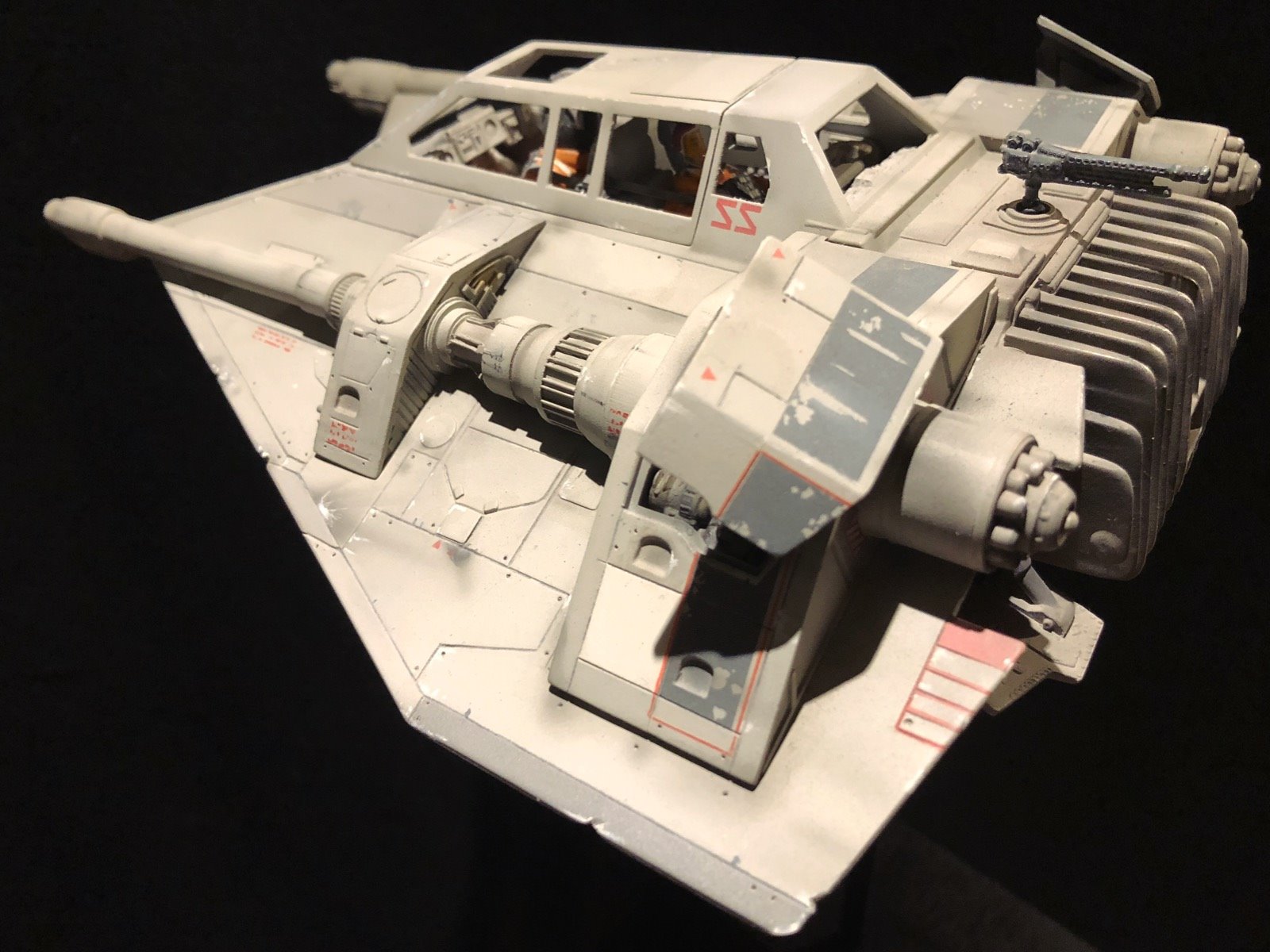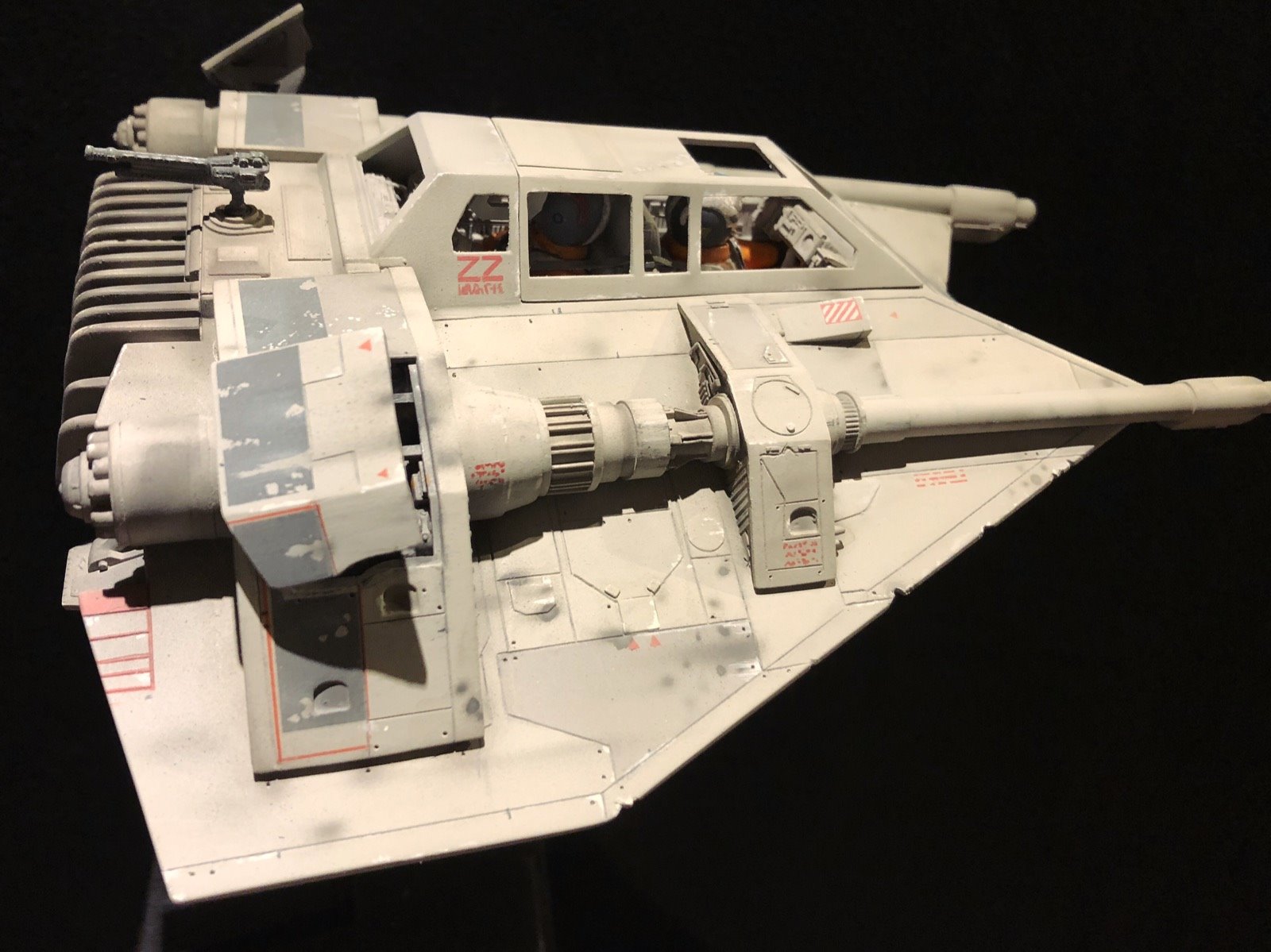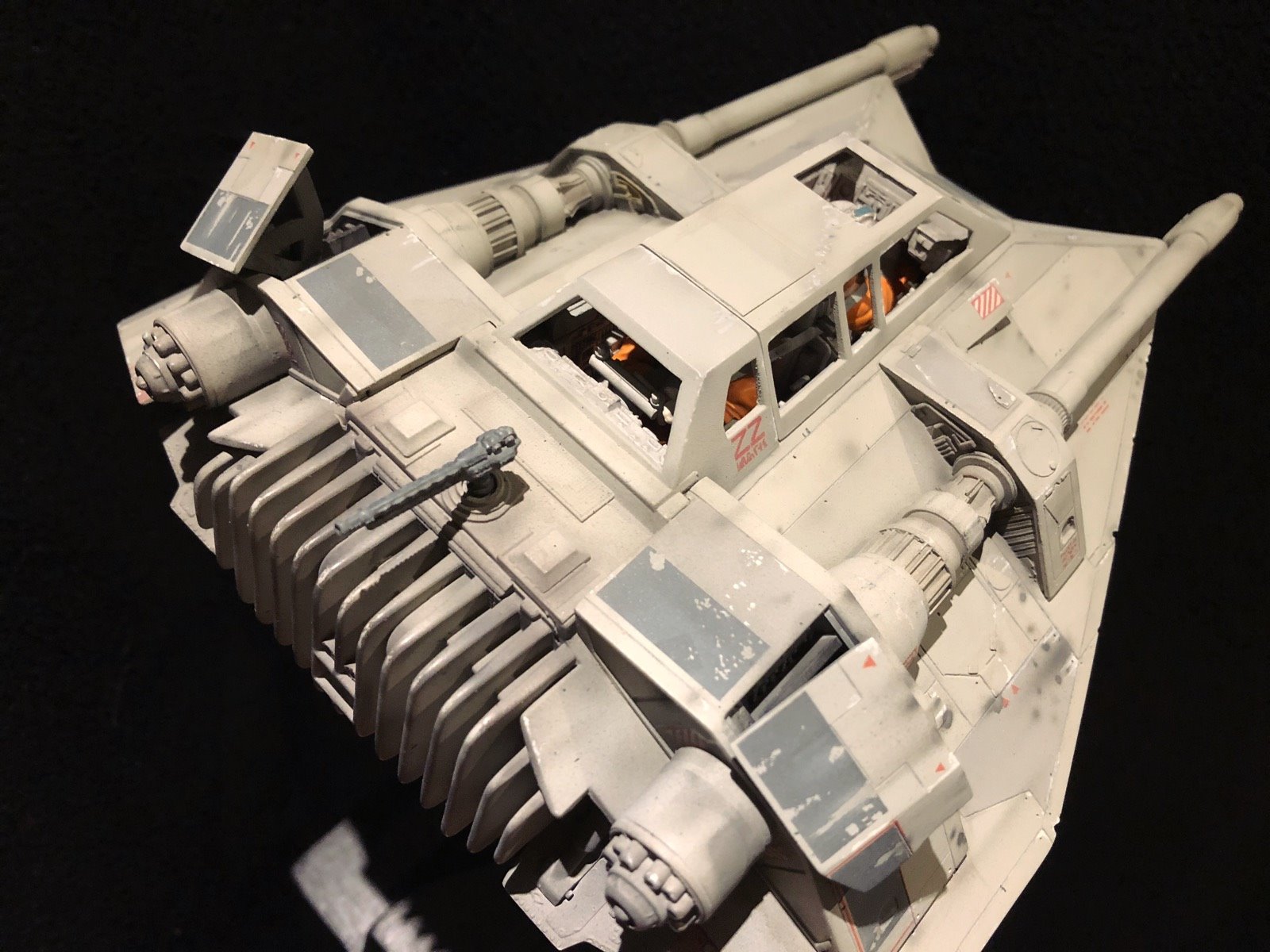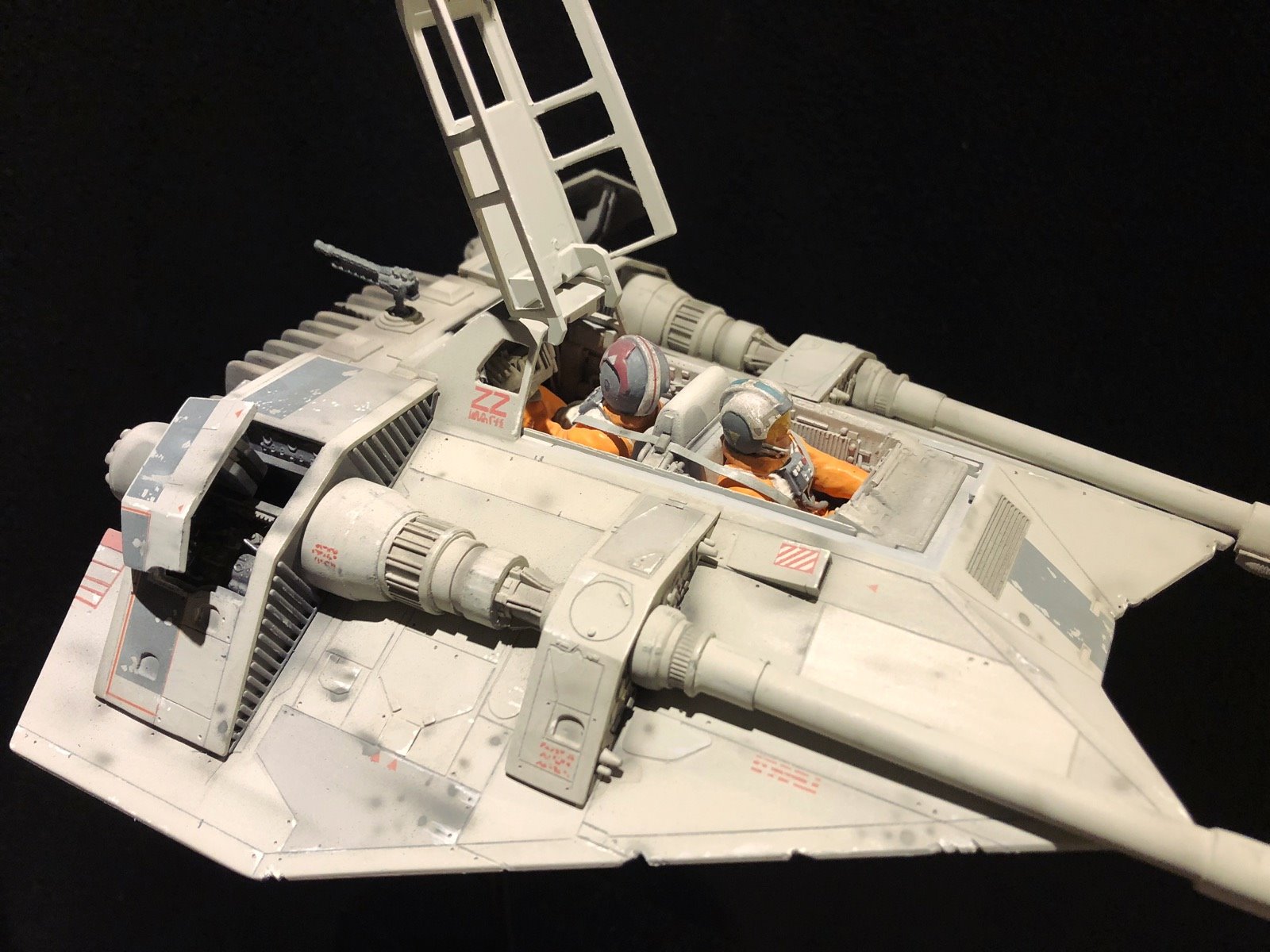 This is the MPC SnowSpeeder. I did several modifications/improvements on it (details, panel lines and more..)! The pilots are from a 1/24 scale Junker Stuka, and I used Milliput to make them look like Rebel pilots! There are no decals,.. it’s all hand painted. I also made a ILM style display stand and I used the ArchiveX paints for the first time on this model. As usual, I tried to be accurate to the studio model!