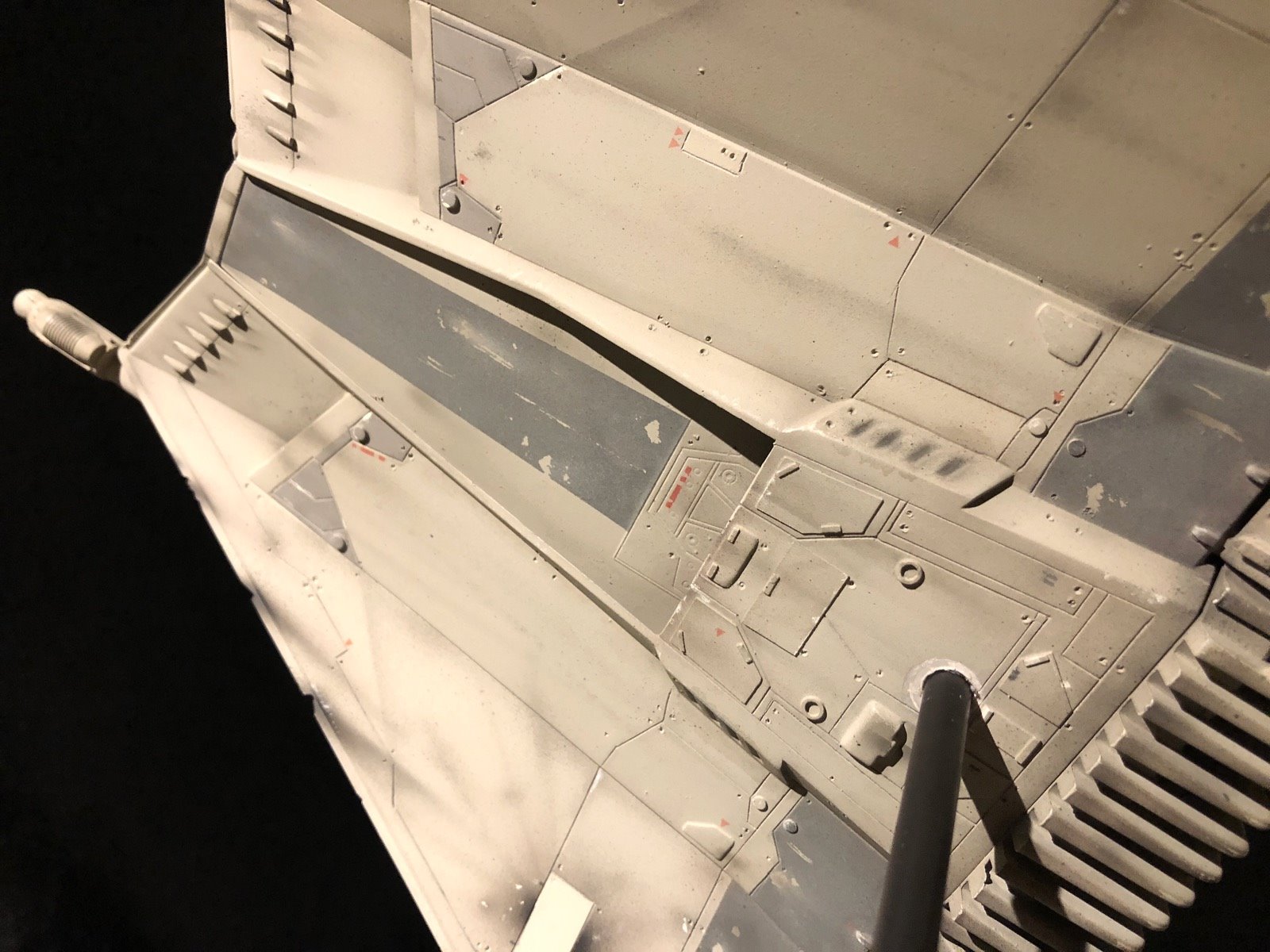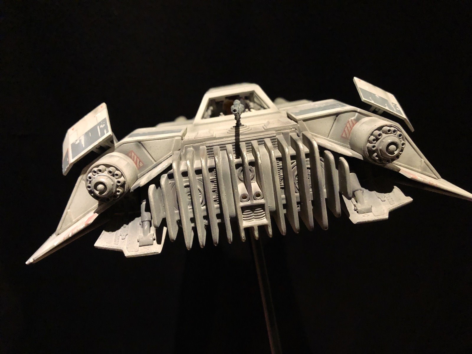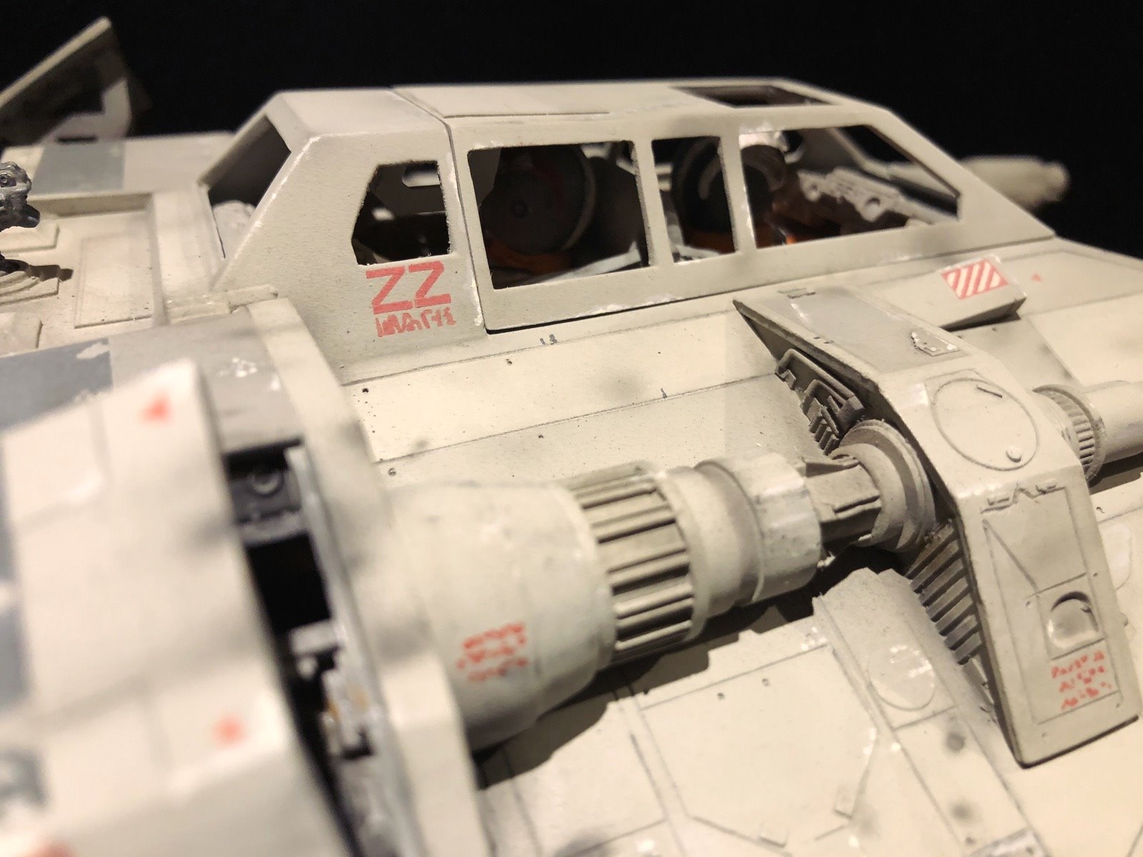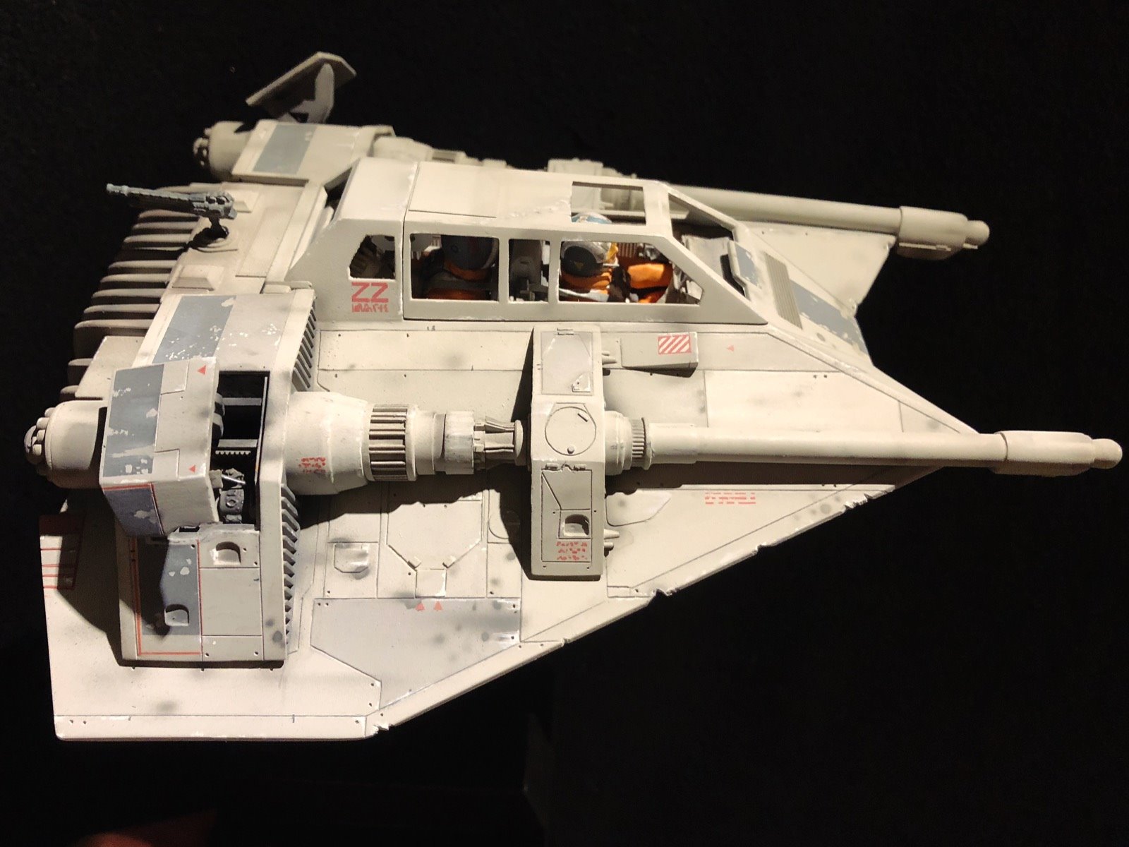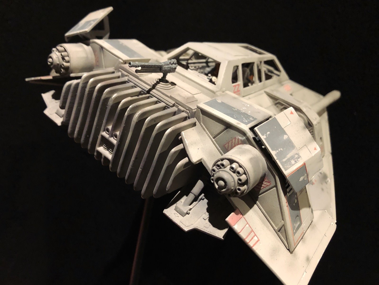 This is the MPC SnowSpeeder. I did several modifications/improvements on it (details, panel lines and more..)! The pilots are from a 1/24 scale Junker Stuka, and I used Milliput to make them look like Rebel pilots! There are no decals,.. it’s all hand painted. I also made a ILM style display stand and I used the ArchiveX paints for the first time on this model. As usual, I tried to be accurate to the studio model!