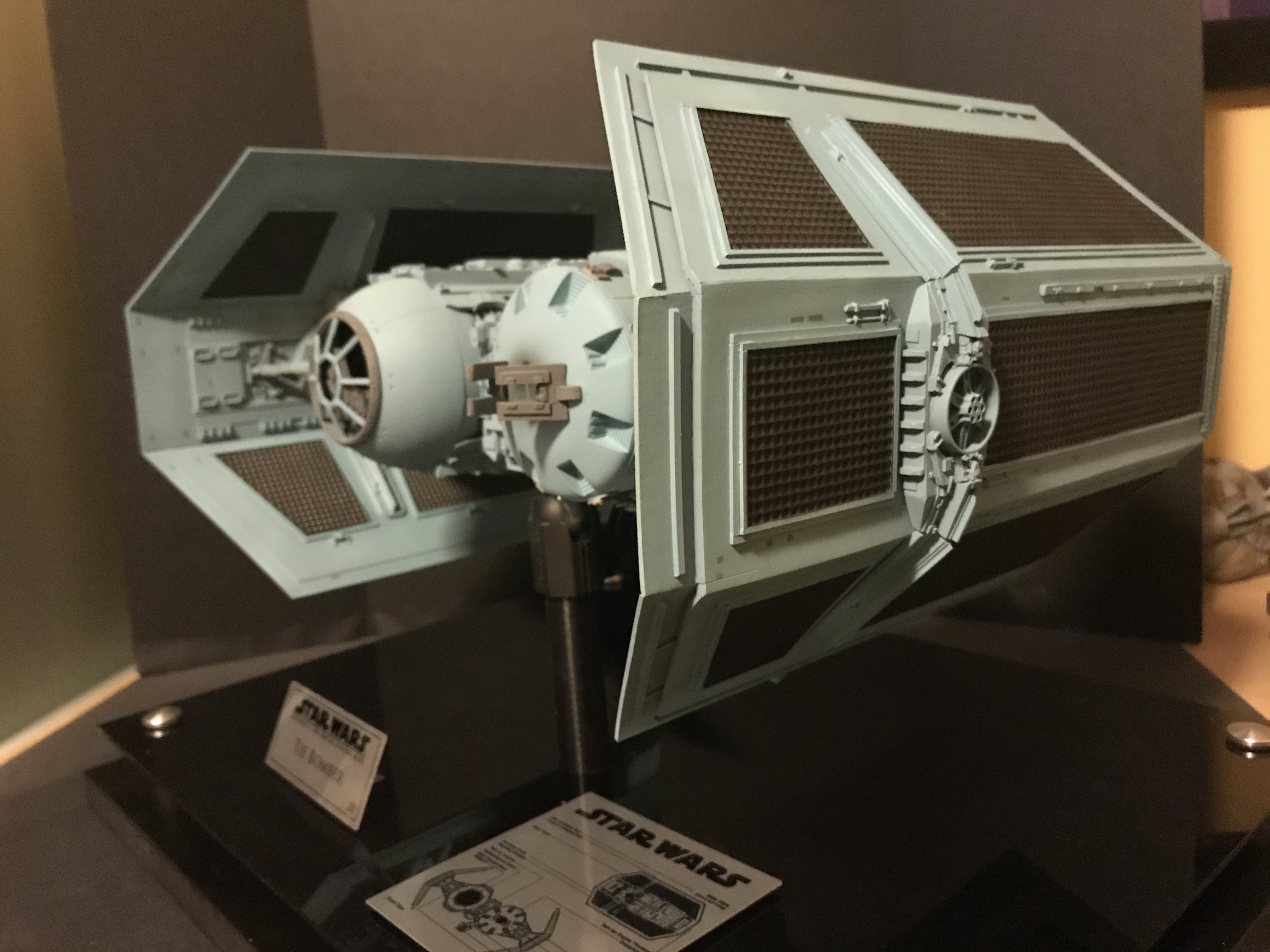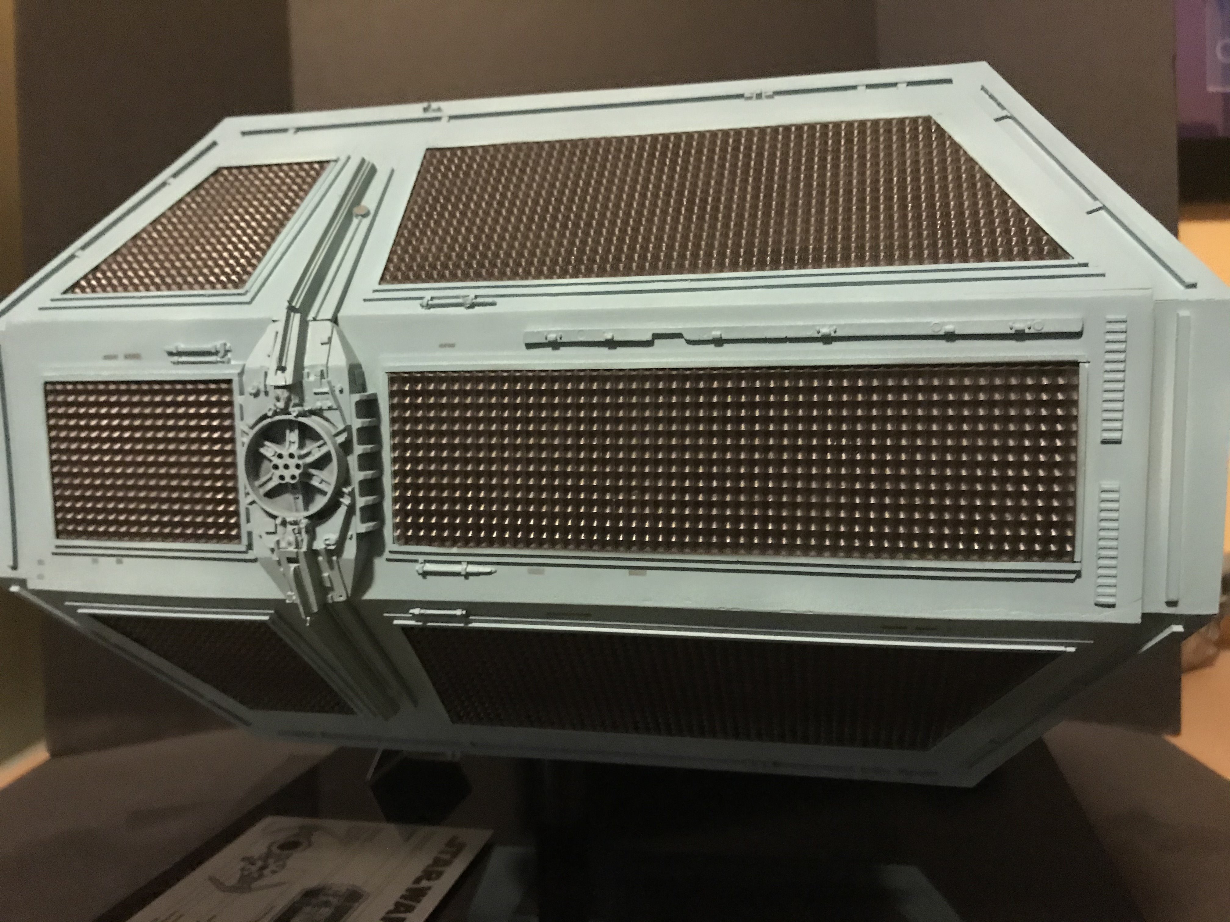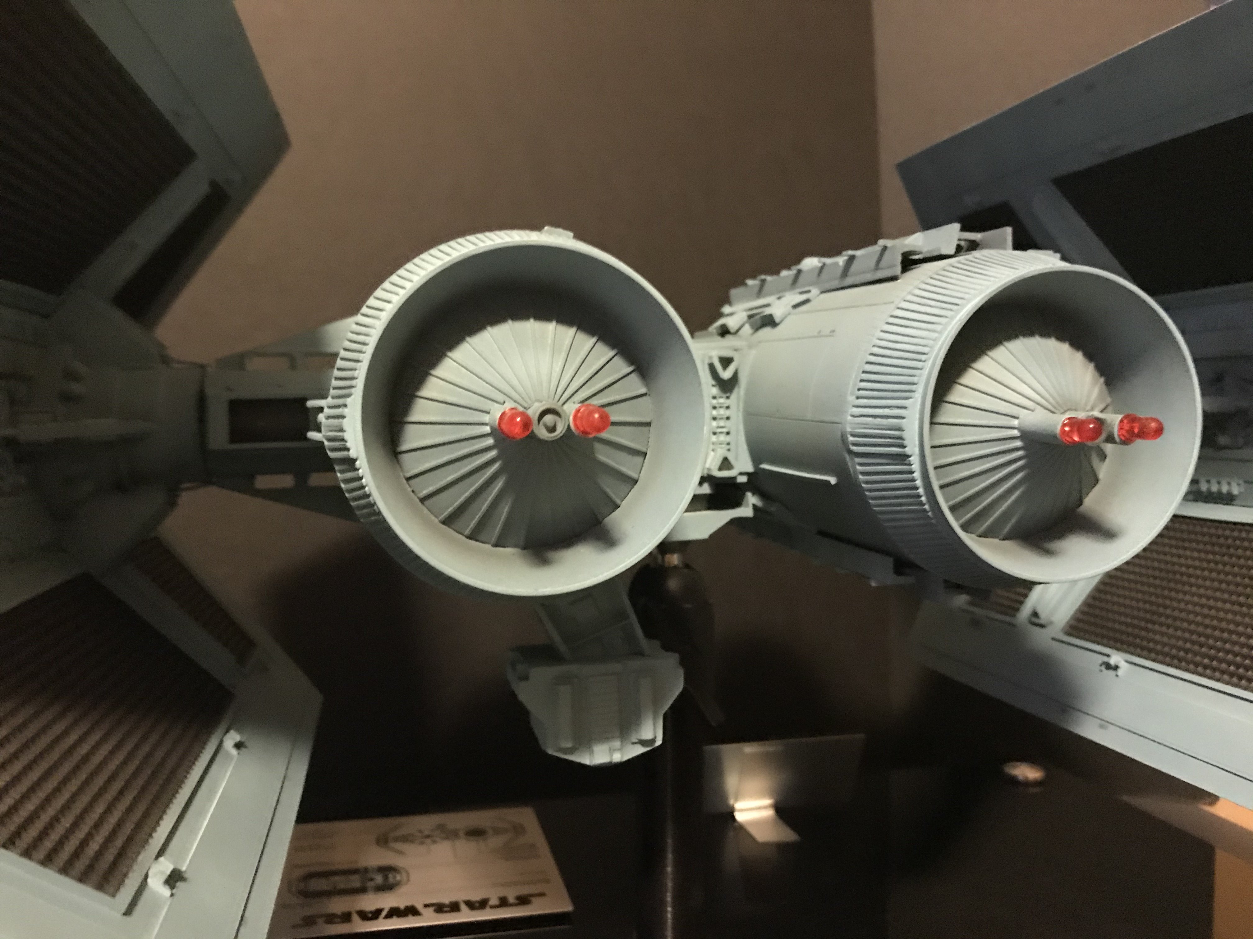 I’ve finally got my Korbanth Tie Bomber in it’s case. It’s 1/24 and designed by Alfred Wong. All painted with acrylics, it was a difficult task to find what I thought was the closest color to the ILM model and think I’ve got it pretty close. I added the LED tops to the rear engines to make it look closer to the studio model. The wings proved a small challenge to ensure they were even and since they are three piece, there were long seams to deal with. Everything is painted even the small rectangles that are everywhere. Mounted on a PanaVise stand and screwed into a custom display case.