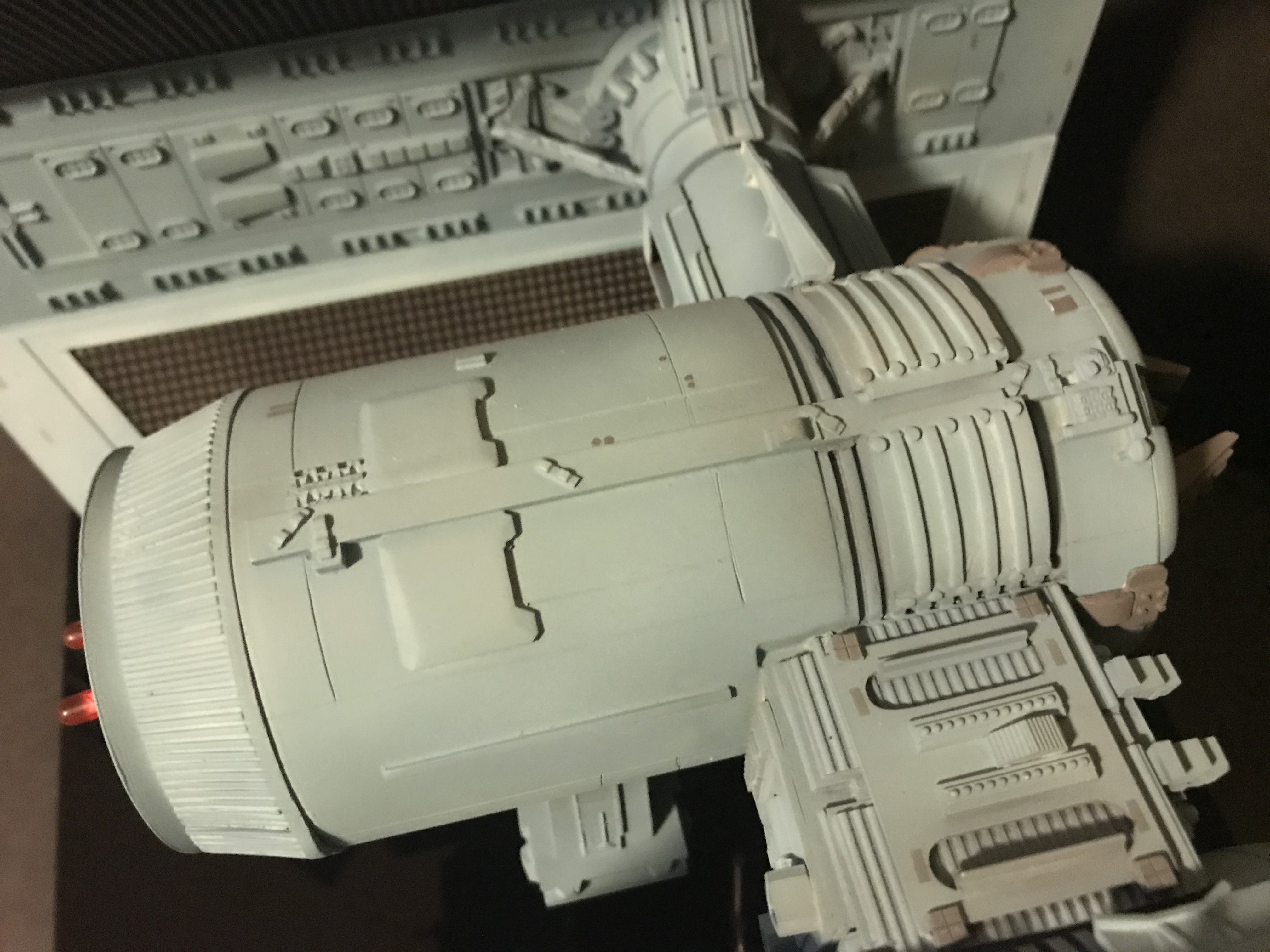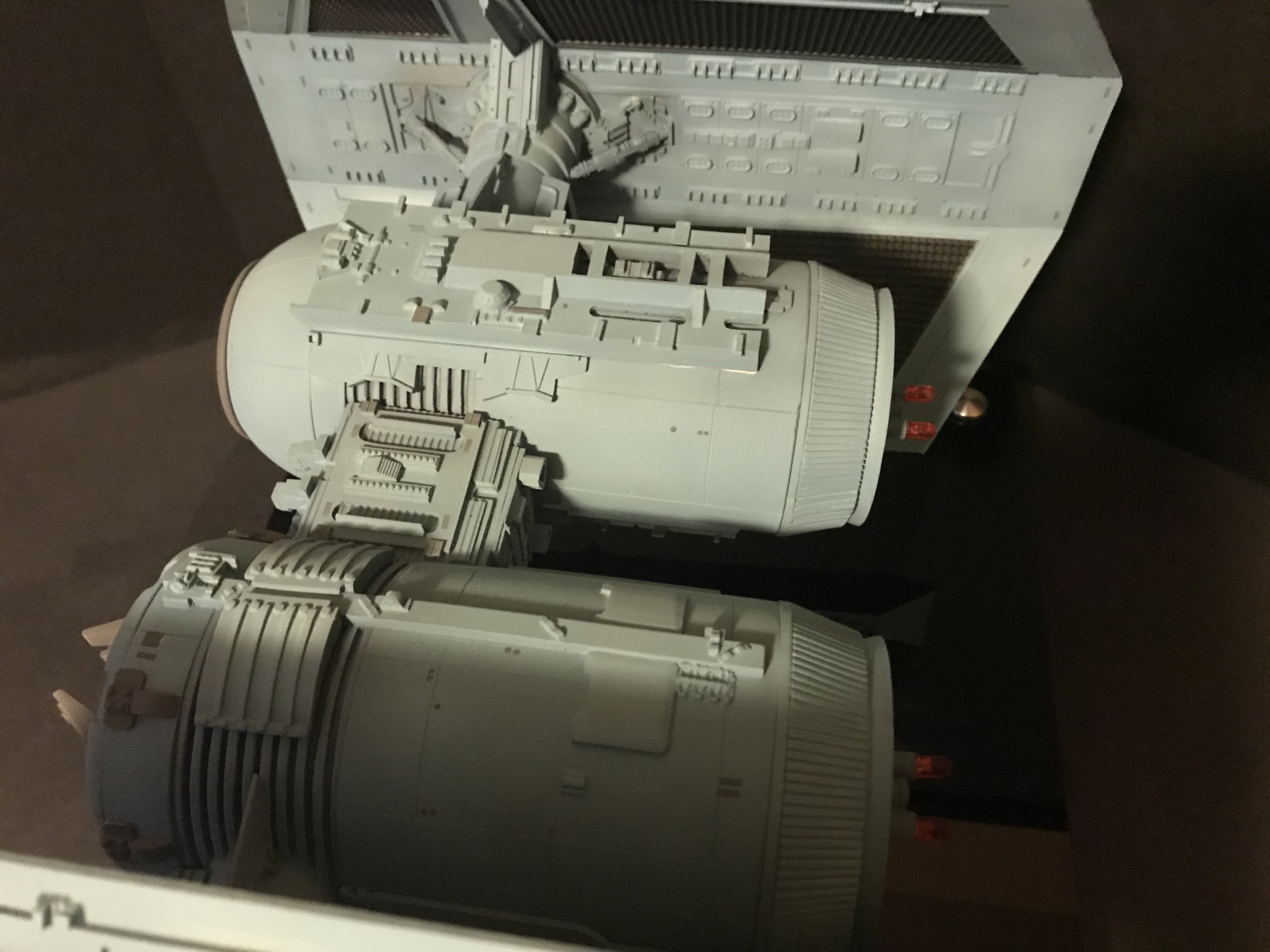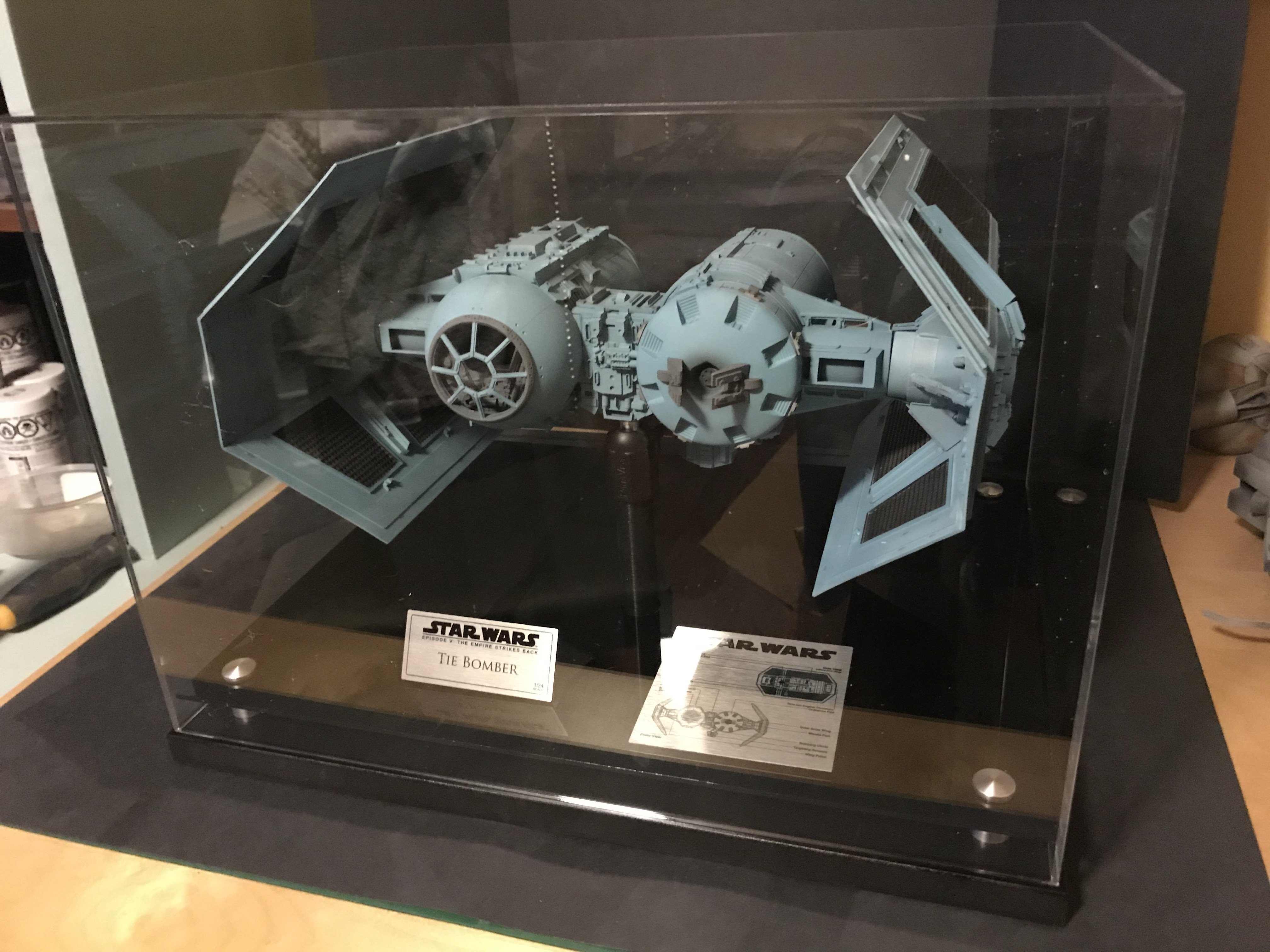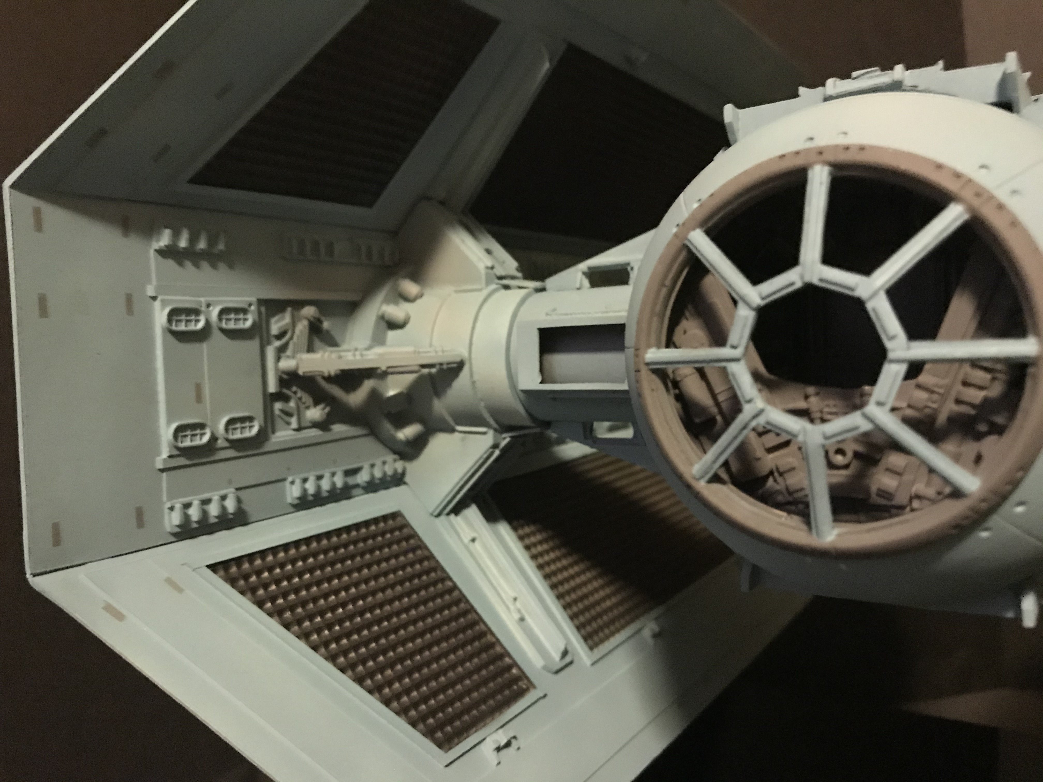 I’ve finally got my Korbanth Tie Bomber in it’s case. It’s 1/24 and designed by Alfred Wong. All painted with acrylics, it was a difficult task to find what I thought was the closest color to the ILM model and think I’ve got it pretty close. I added the LED tops to the rear engines to make it look closer to the studio model. The wings proved a small challenge to ensure they were even and since they are three piece, there were long seams to deal with. Everything is painted even the small rectangles that are everywhere. Mounted on a PanaVise stand and screwed into a custom display case.