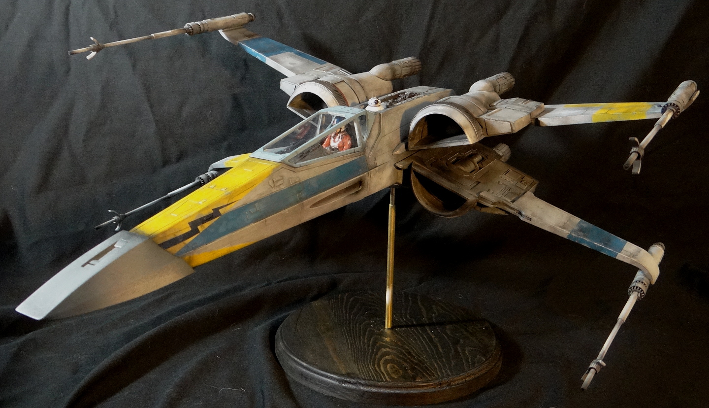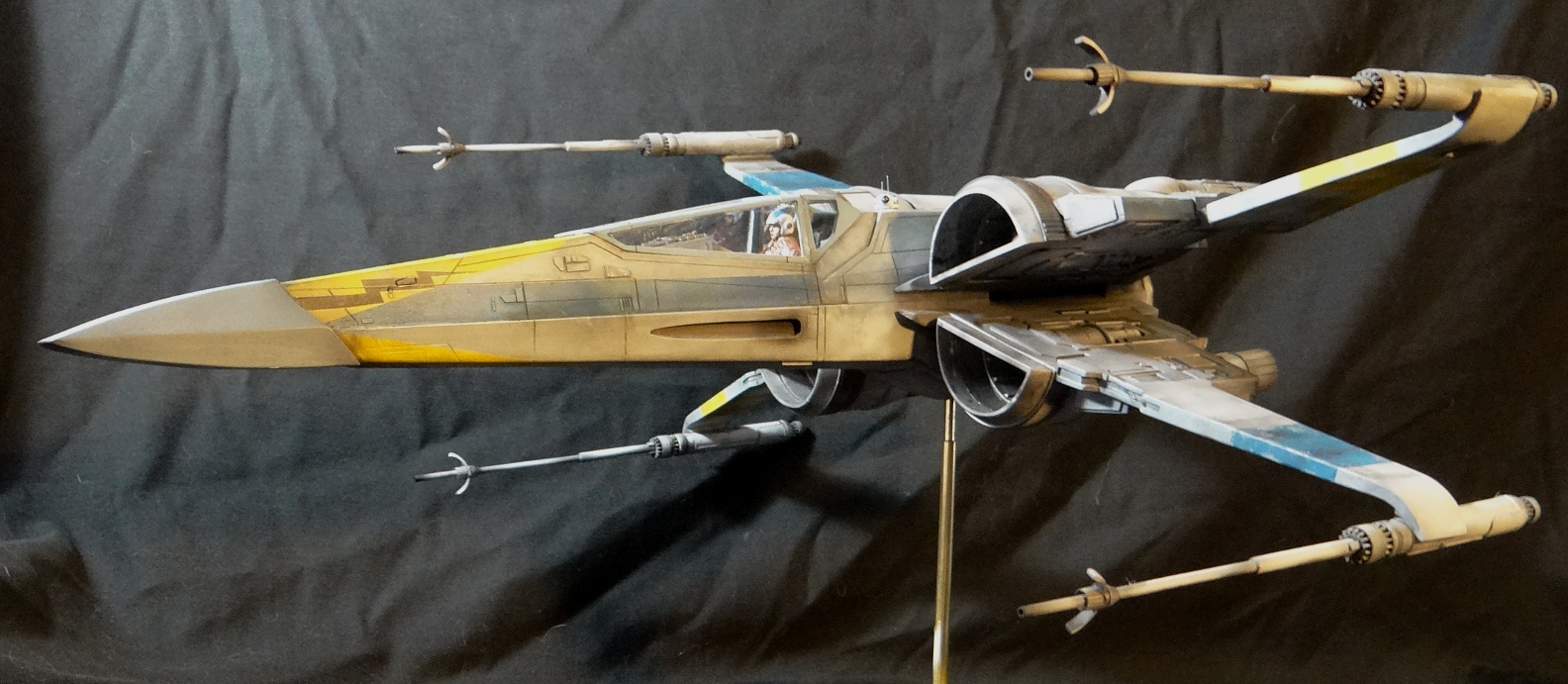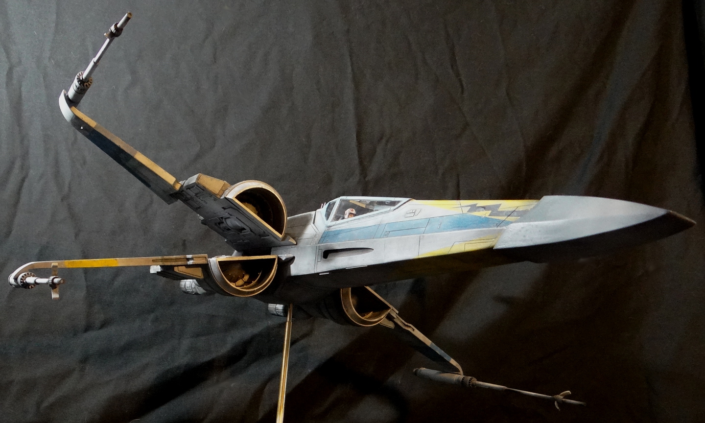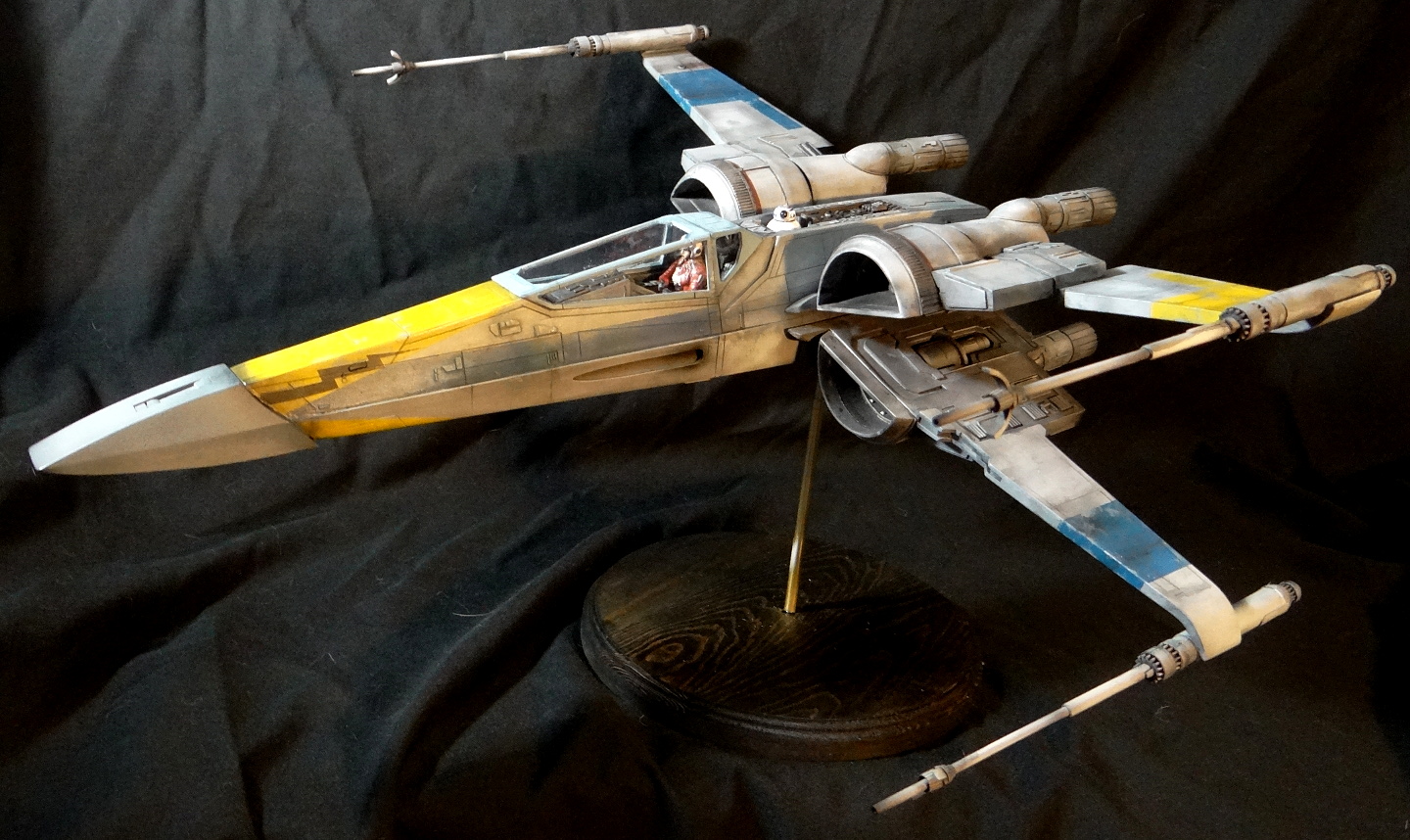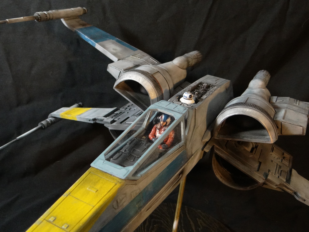 The Korbanth Sabers T-70 is a crisply cast kit, especially notable are virtually flawless casts of heavily detailed parts like the rear hull plate and the cockpit console. I was disappointed, however, that the engine housings and tail pipes are all solid casts, with no way to light the engine nozzles. Even for me, who hates installing lighting, a big 1/24 spaceship model cries out for it. In fact everything is solid cast, the finished model weighs a whopping 18.5kg! It is easily the heaviest model I have, almost twice the weight of my larger 1/24 B-Wing. I actually found it uncomfortable to hold it for any length of time when working on it. I built it mostly out of the box other than making a new female pilot to replace the now rather over-used fella from the old Captain Cardboard kit, and installing clear panes for the canopy frame. Get the kit while you can (CLICK HERE to ORDER), these 1/24 models are often short runs.