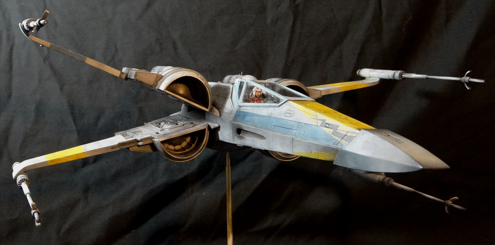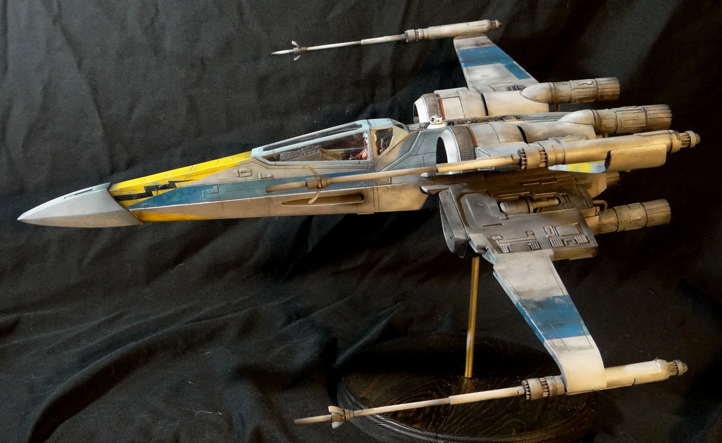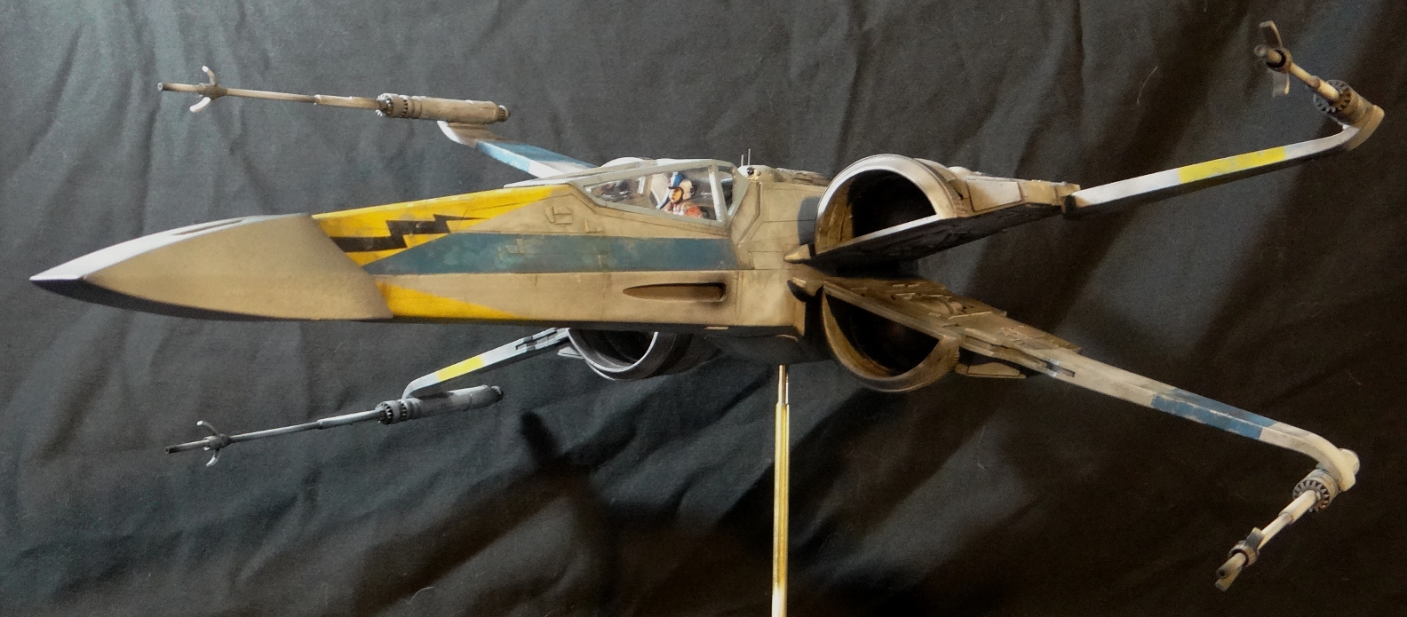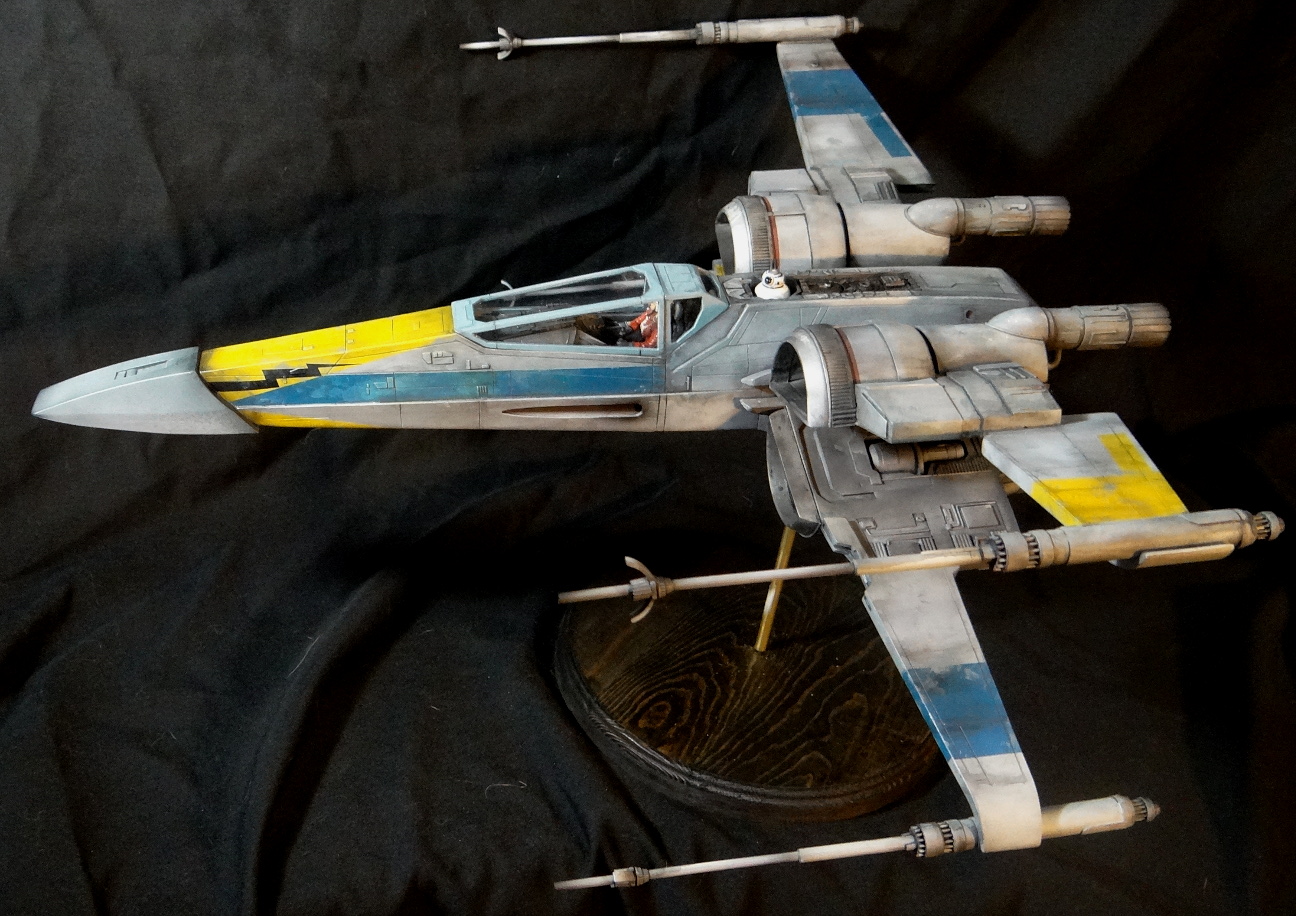 The Korbanth Sabers T-70 is a crisply cast kit, especially notable are virtually flawless casts of heavily detailed parts like the rear hull plate and the cockpit console. I was disappointed, however, that the engine housings and tail pipes are all solid casts, with no way to light the engine nozzles. Even for me, who hates installing lighting, a big 1/24 spaceship model cries out for it. In fact everything is solid cast, the finished model weighs a whopping 18.5kg! It is easily the heaviest model I have, almost twice the weight of my larger 1/24 B-Wing. I actually found it uncomfortable to hold it for any length of time when working on it. I built it mostly out of the box other than making a new female pilot to replace the now rather over-used fella from the old Captain Cardboard kit, and installing clear panes for the canopy frame. Get the kit while you can (CLICK HERE to ORDER), these 1/24 models are often short runs.
