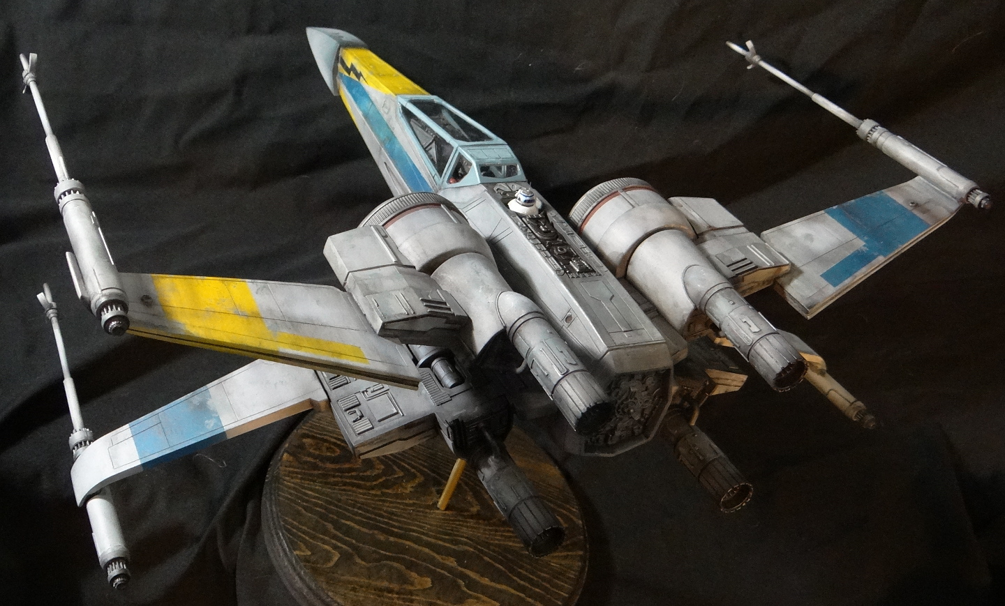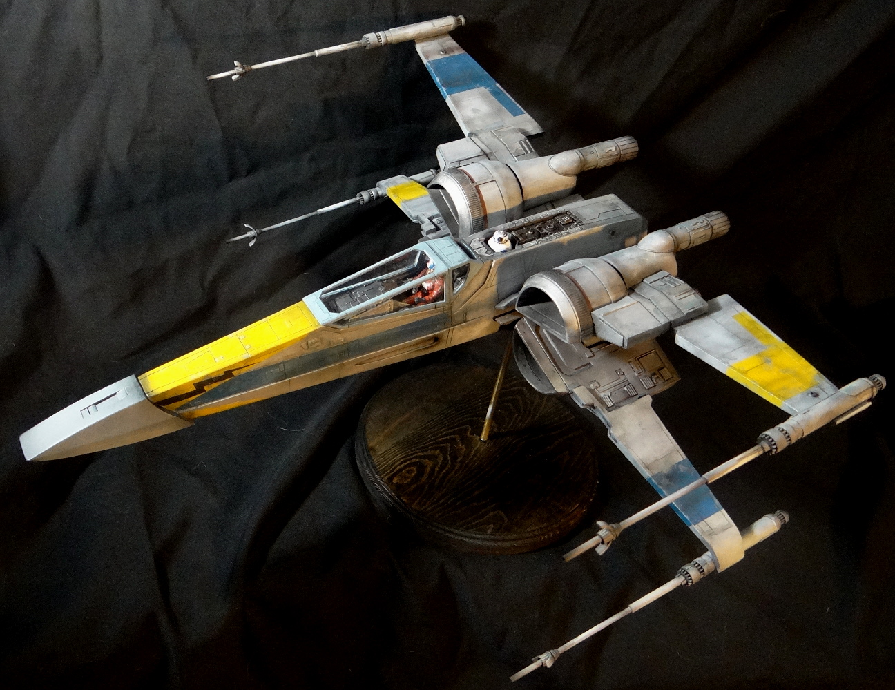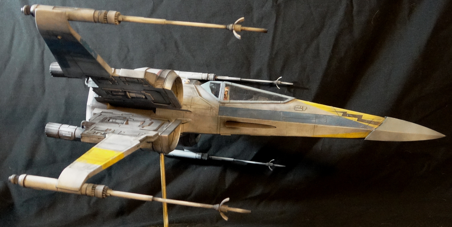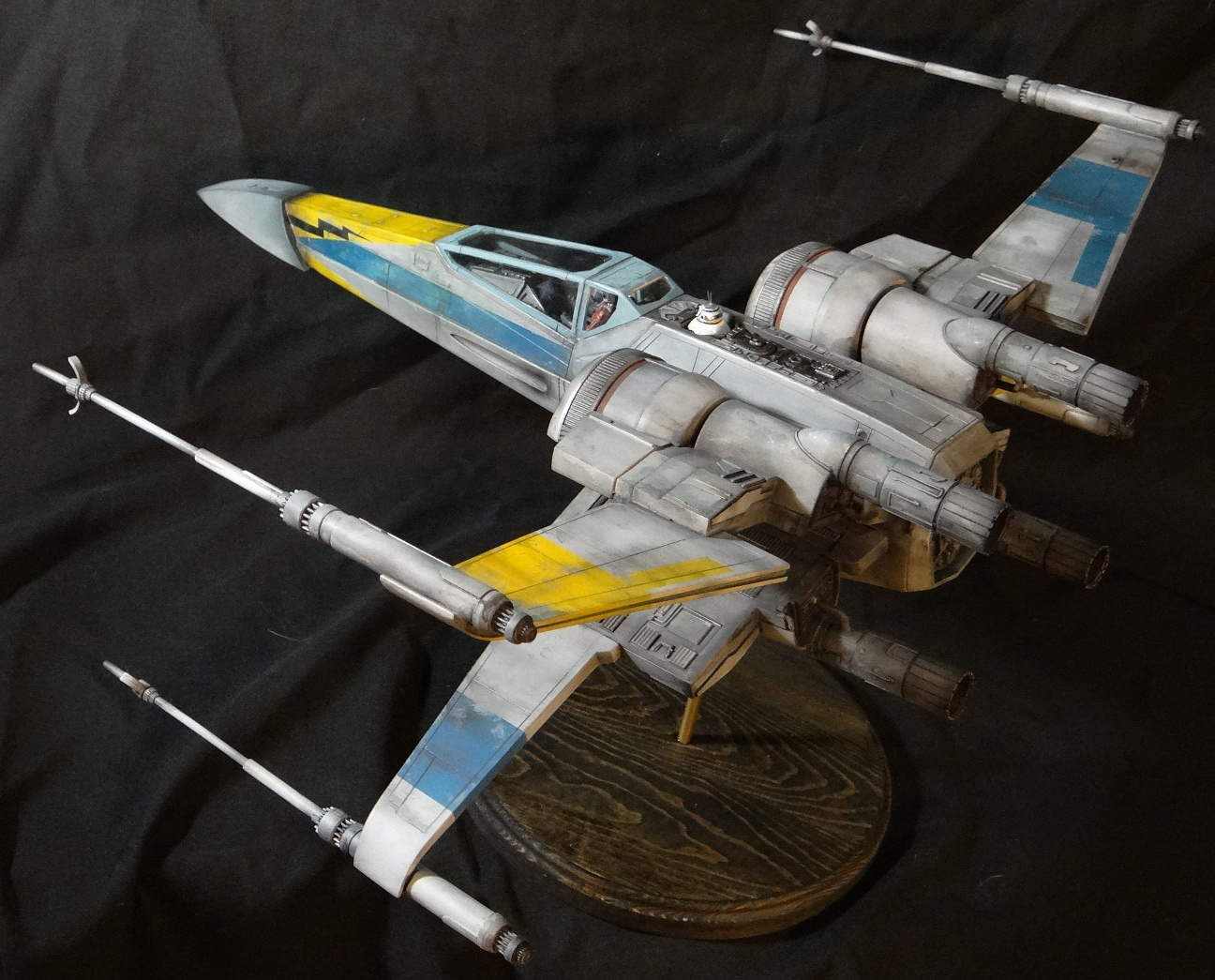 The Korbanth Sabers T-70 is a crisply cast kit, especially notable are virtually flawless casts of heavily detailed parts like the rear hull plate and the cockpit console. I was disappointed, however, that the engine housings and tail pipes are all solid casts, with no way to light the engine nozzles. Even for me, who hates installing lighting, a big 1/24 spaceship model cries out for it. In fact everything is solid cast, the finished model weighs a whopping 18.5kg! It is easily the heaviest model I have, almost twice the weight of my larger 1/24 B-Wing. I actually found it uncomfortable to hold it for any length of time when working on it. I built it mostly out of the box other than making a new female pilot to replace the now rather over-used fella from the old Captain Cardboard kit, and installing clear panes for the canopy frame. Get the kit while you can (CLICK HERE to ORDER), these 1/24 models are often short runs.