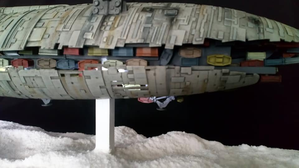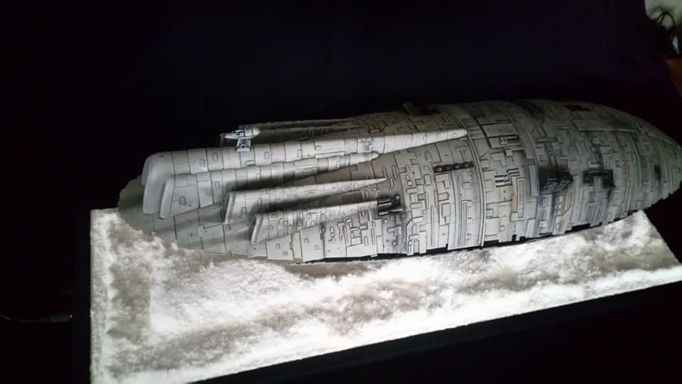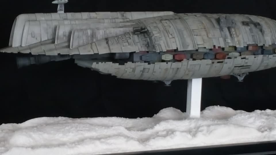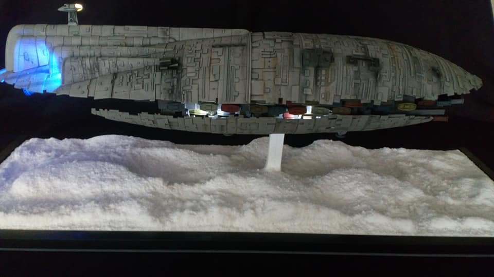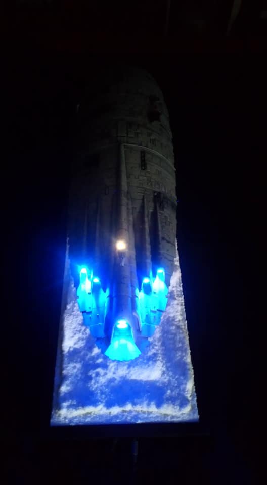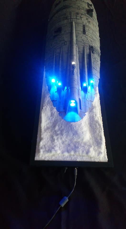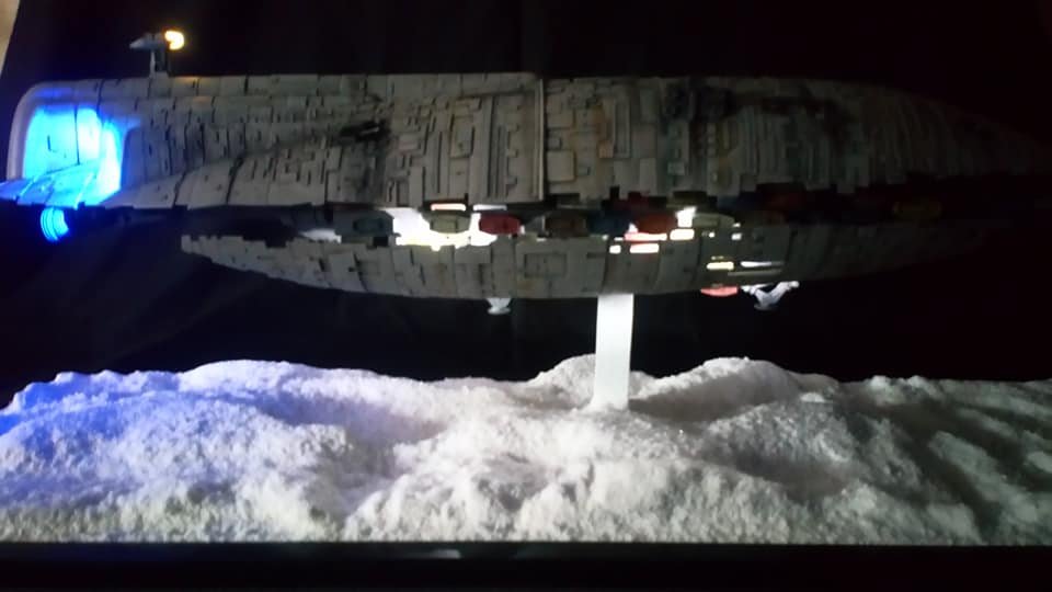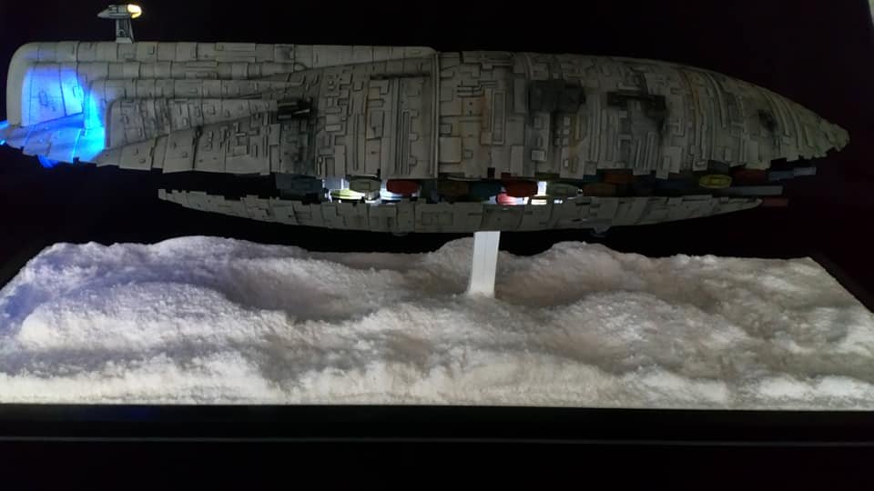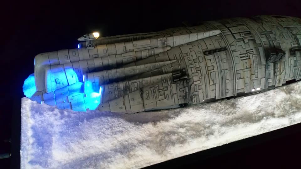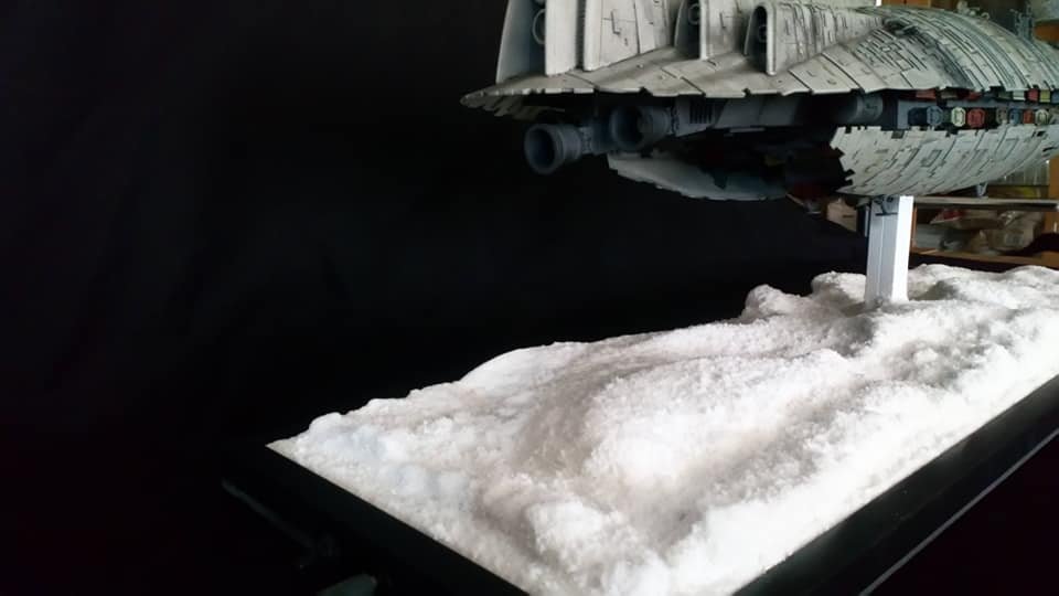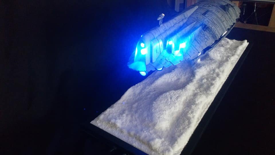 For this project I worked from the 1/144 Anigrand kit of the Rebel Transport GR-75. I added some extra light up at the level of containers to highlight the details of the lower part of the transport, the cockpit is also illuminated and the thrusters of course. The paint job was made with several aging techniques to obtain a pronounced wear patina. The base represents the snowy ground of the planet Hoth during the take-off of the transport.