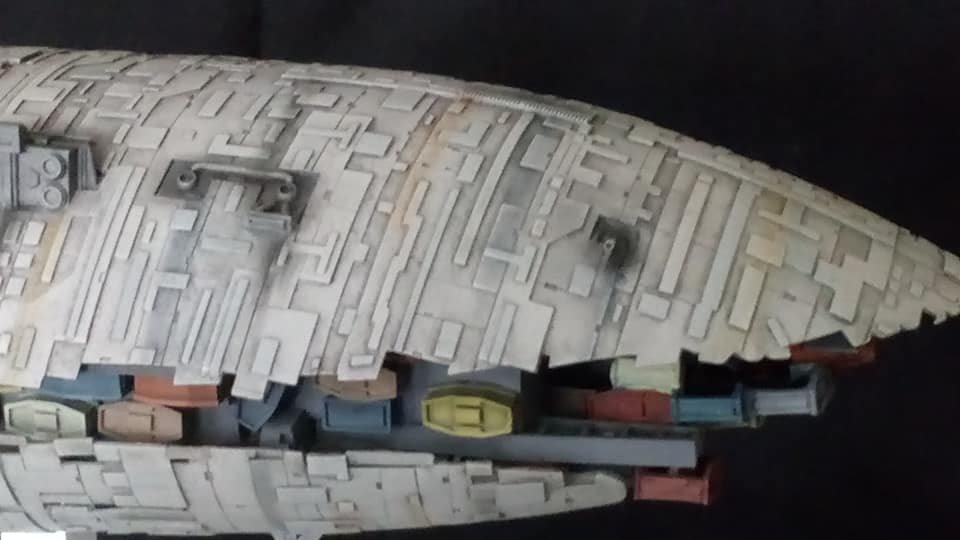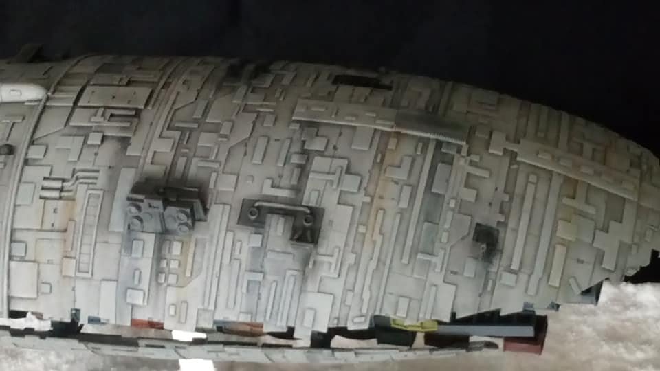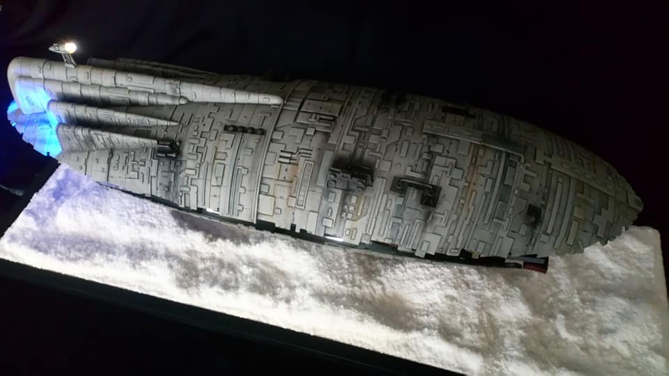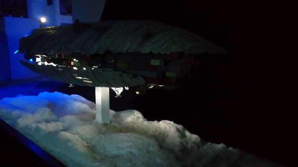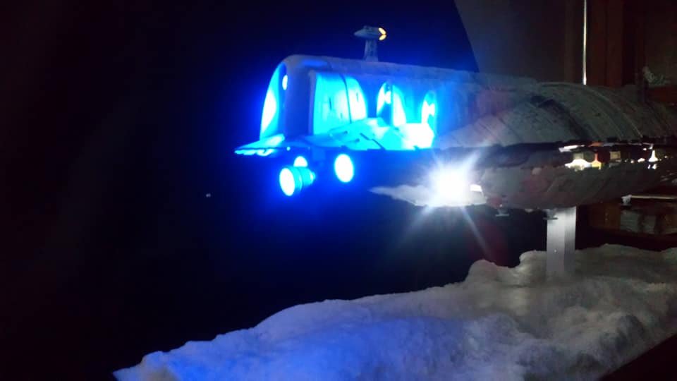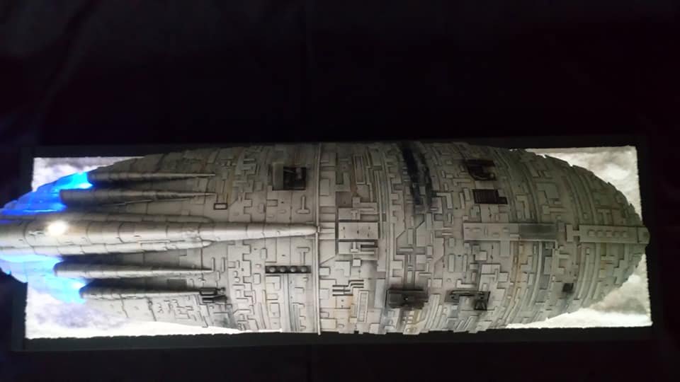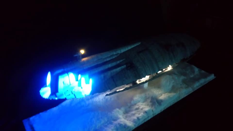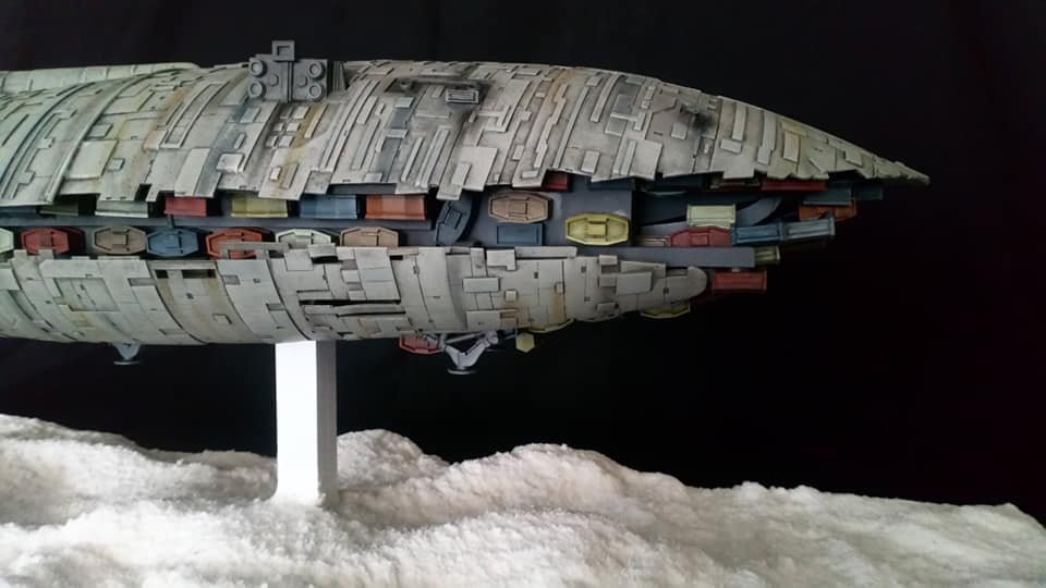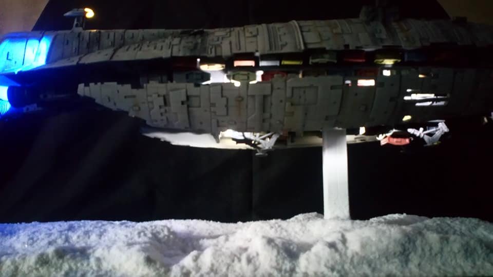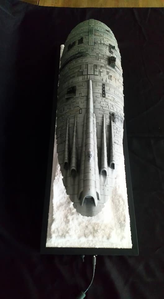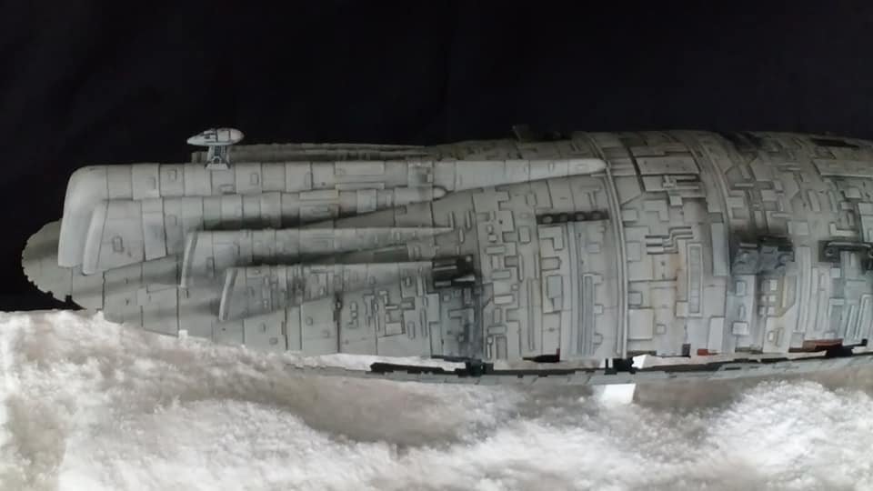For this project I worked from the 1/144 Anigrand kit of the Rebel Transport GR-75. I added some extra light up at the level of containers to highlight the details of the lower part of the transport, the cockpit is also illuminated and the thrusters of course. The paint job was made with several aging techniques to obtain a pronounced wear patina. The base represents the snowy ground of the planet Hoth during the take-off of the transport.