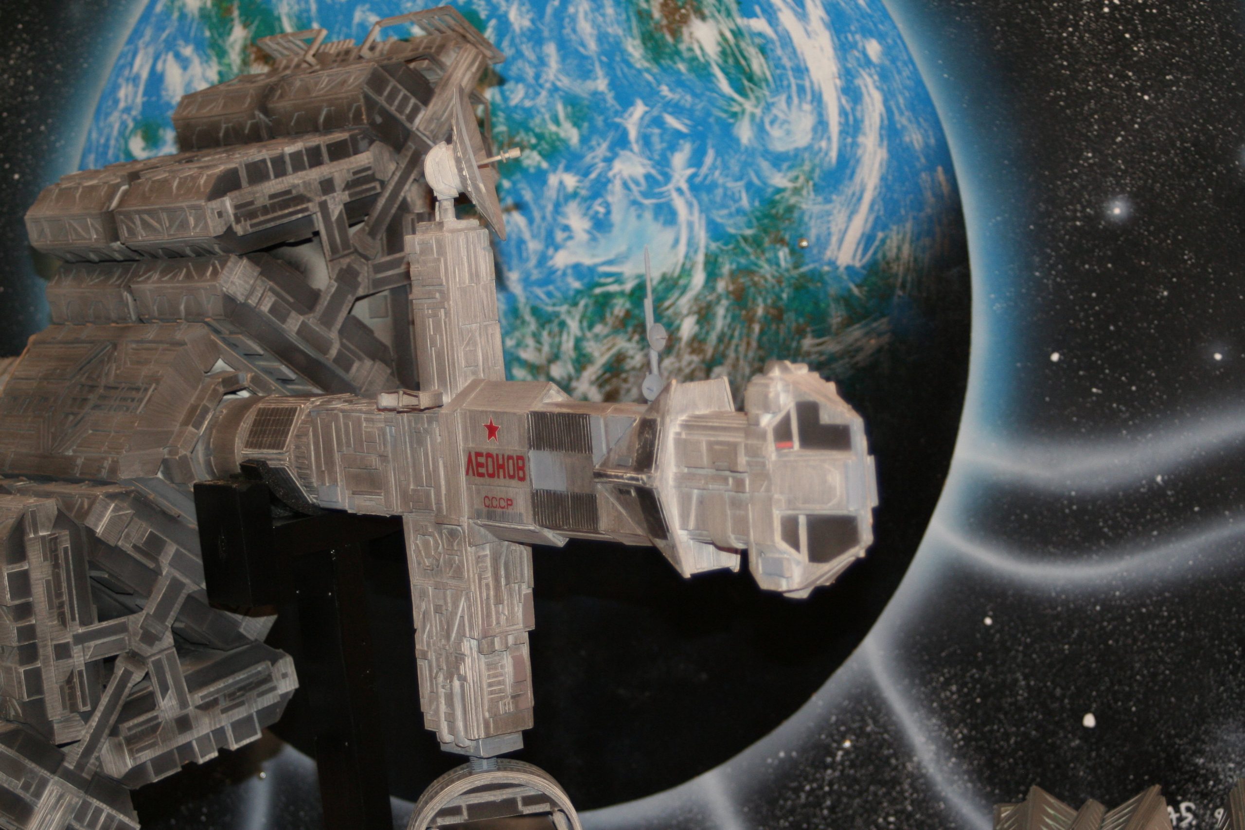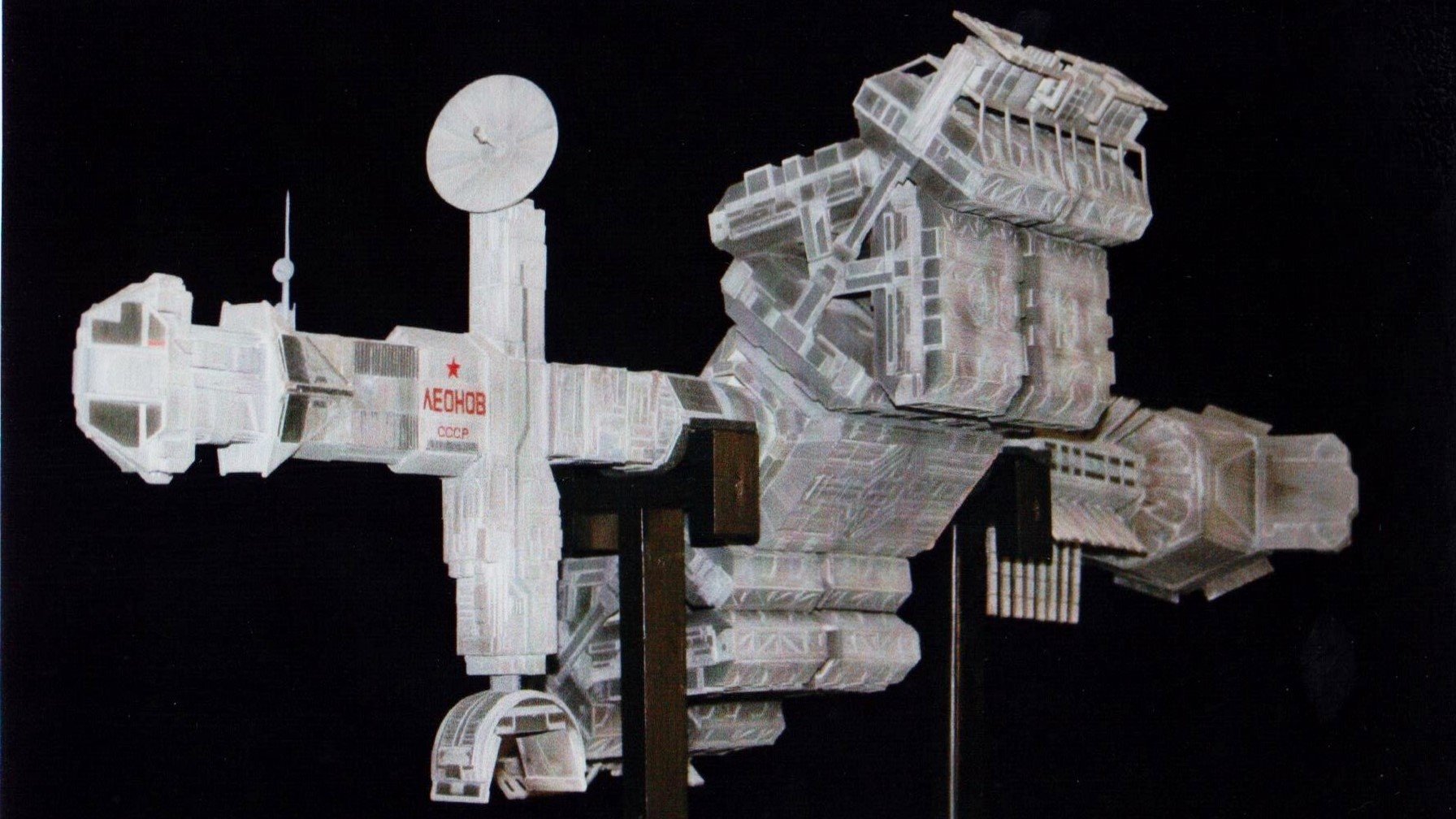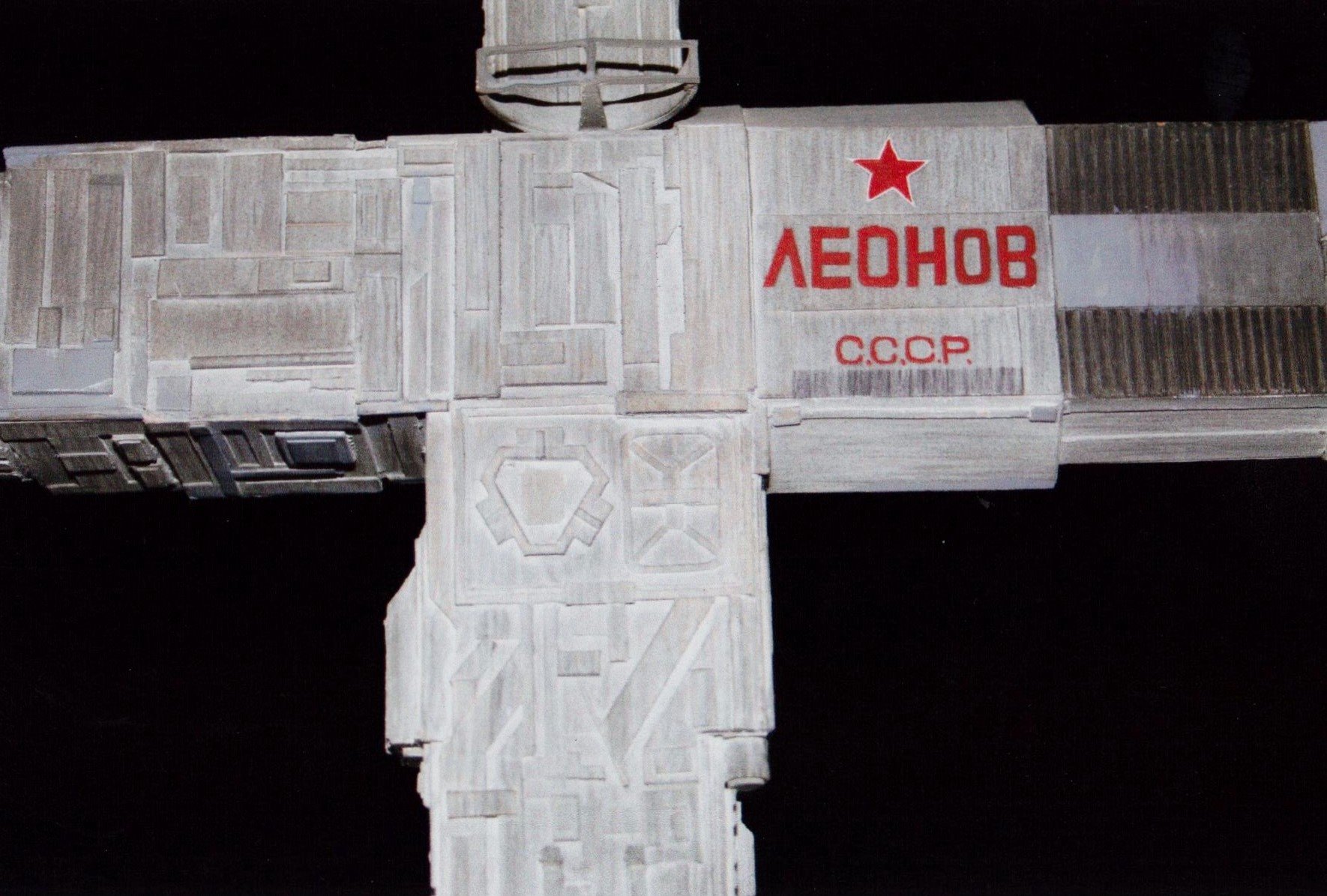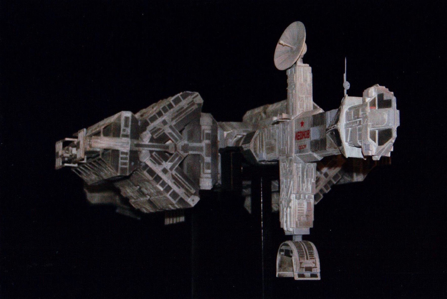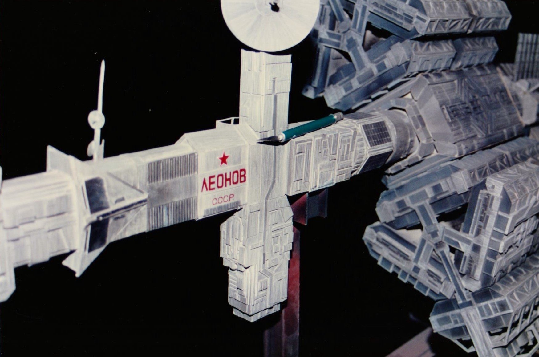 I finally got to scan some old photos of the Leonov that I made from scratch back in 1986/87. It took a year and four months to complete. It was airbrushed with tempera and dry brushed with black and white wash. The two small dishes where made from a Ping-Pong ball. The docking ring, the large dish and cabins are poseable. At 4ft. long it is still the largest model I have ever made. This model was made on a “dare” from an old high school friend who lent me his Cinefex and 2010 magazine special. He also taught me how to paint it. To him I say,…”Thanks Rudy!”