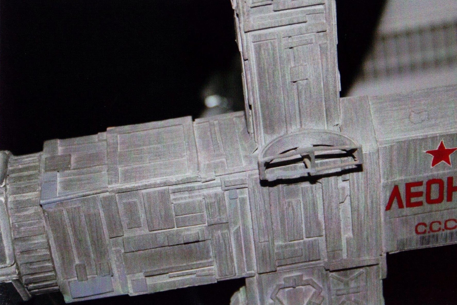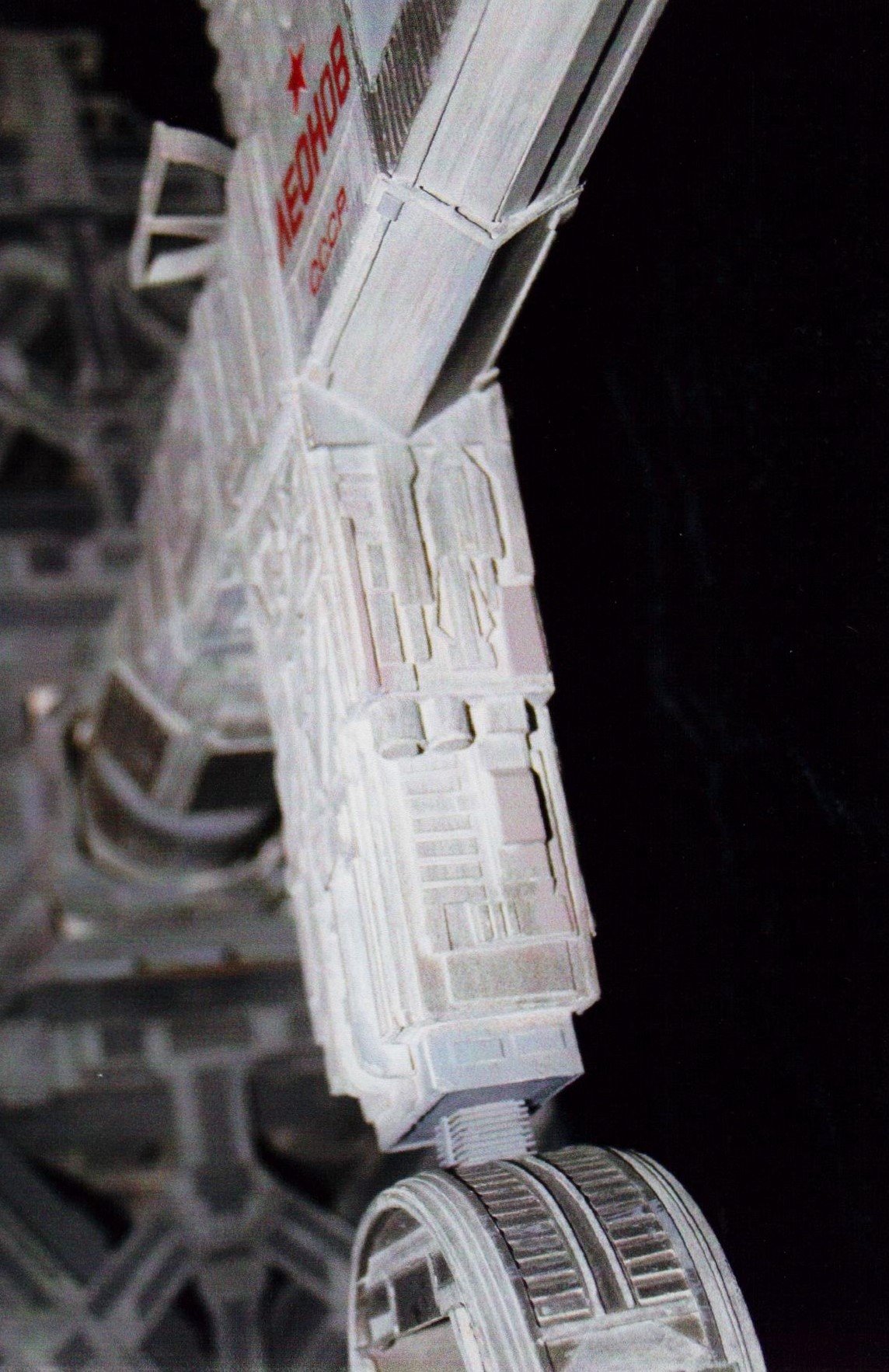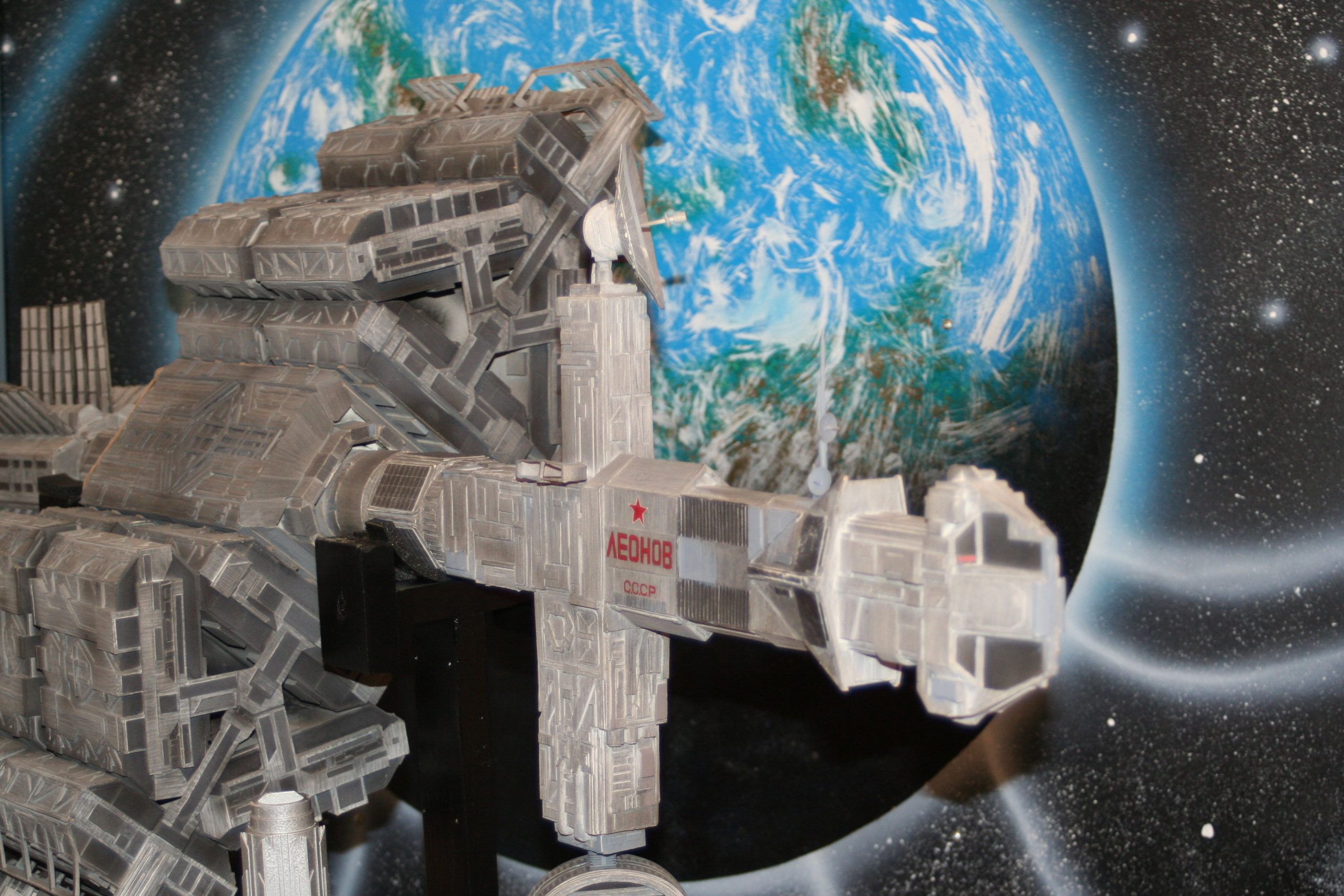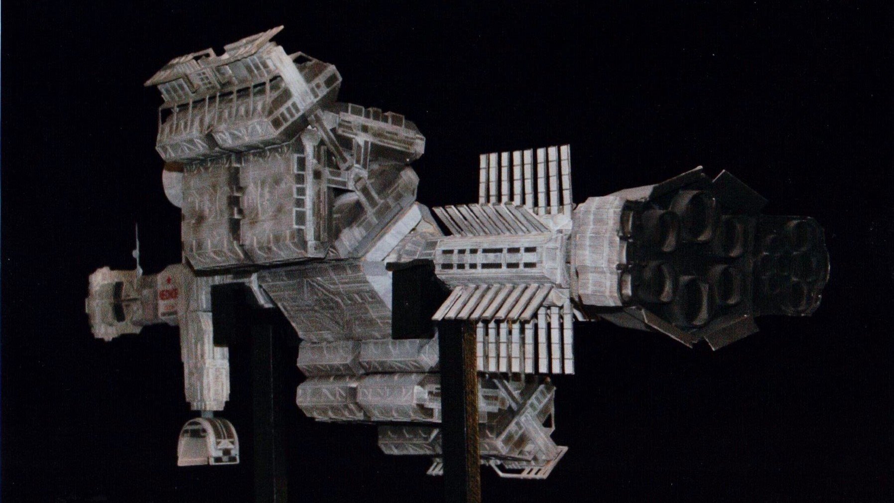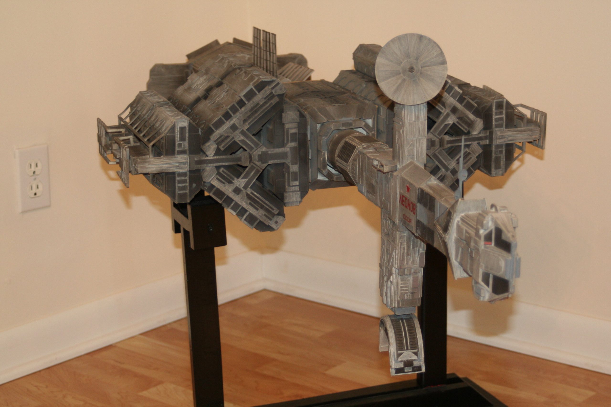 I finally got to scan some old photos of the Leonov that I made from scratch back in 1986/87. It took a year and four months to complete. It was airbrushed with tempera and dry brushed with black and white wash. The two small dishes where made from a Ping-Pong ball. The docking ring, the large dish and cabins are poseable. At 4ft. long it is still the largest model I have ever made. This model was made on a “dare” from an old high school friend who lent me his Cinefex and 2010 magazine special. He also taught me how to paint it. To him I say,…”Thanks Rudy!”
