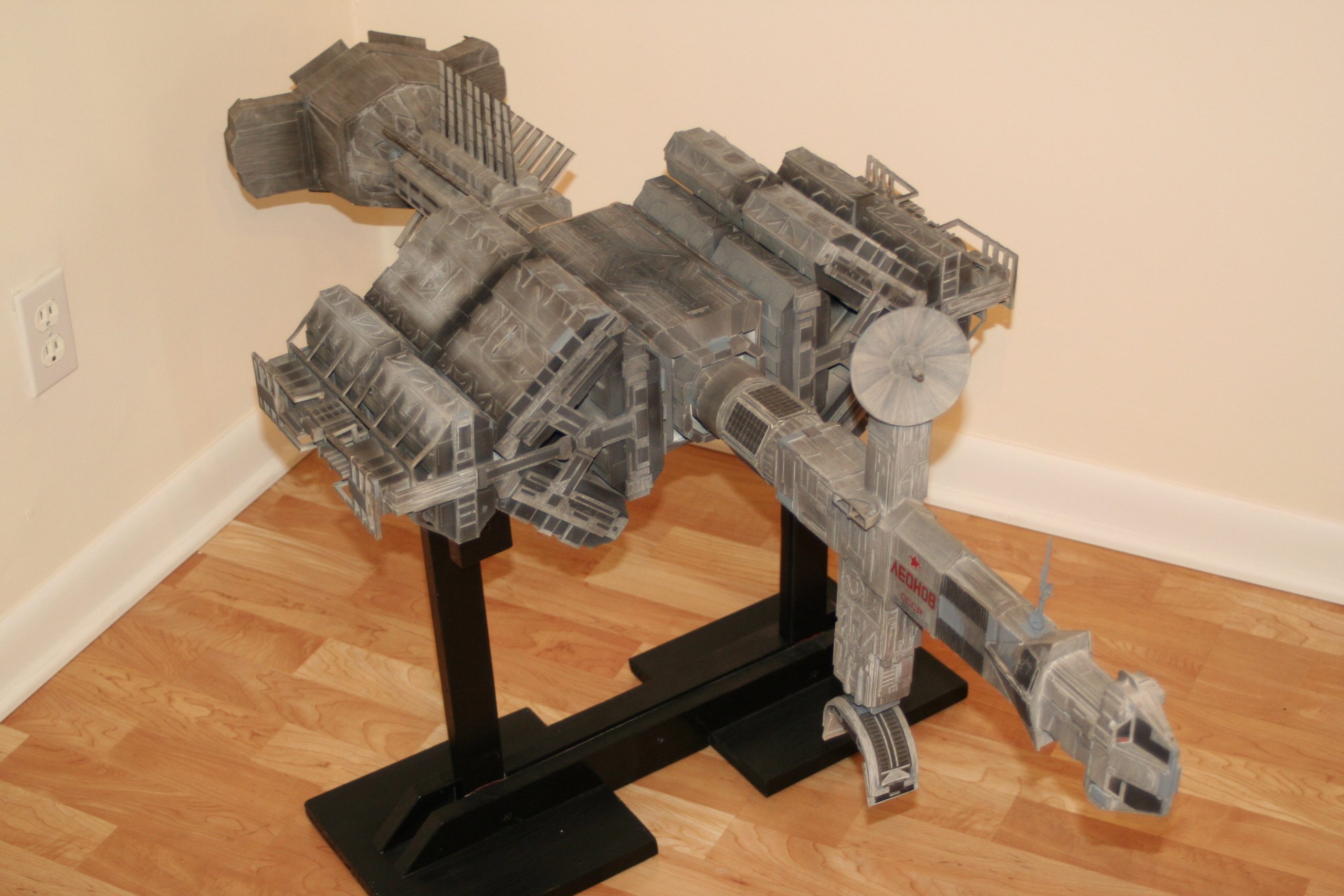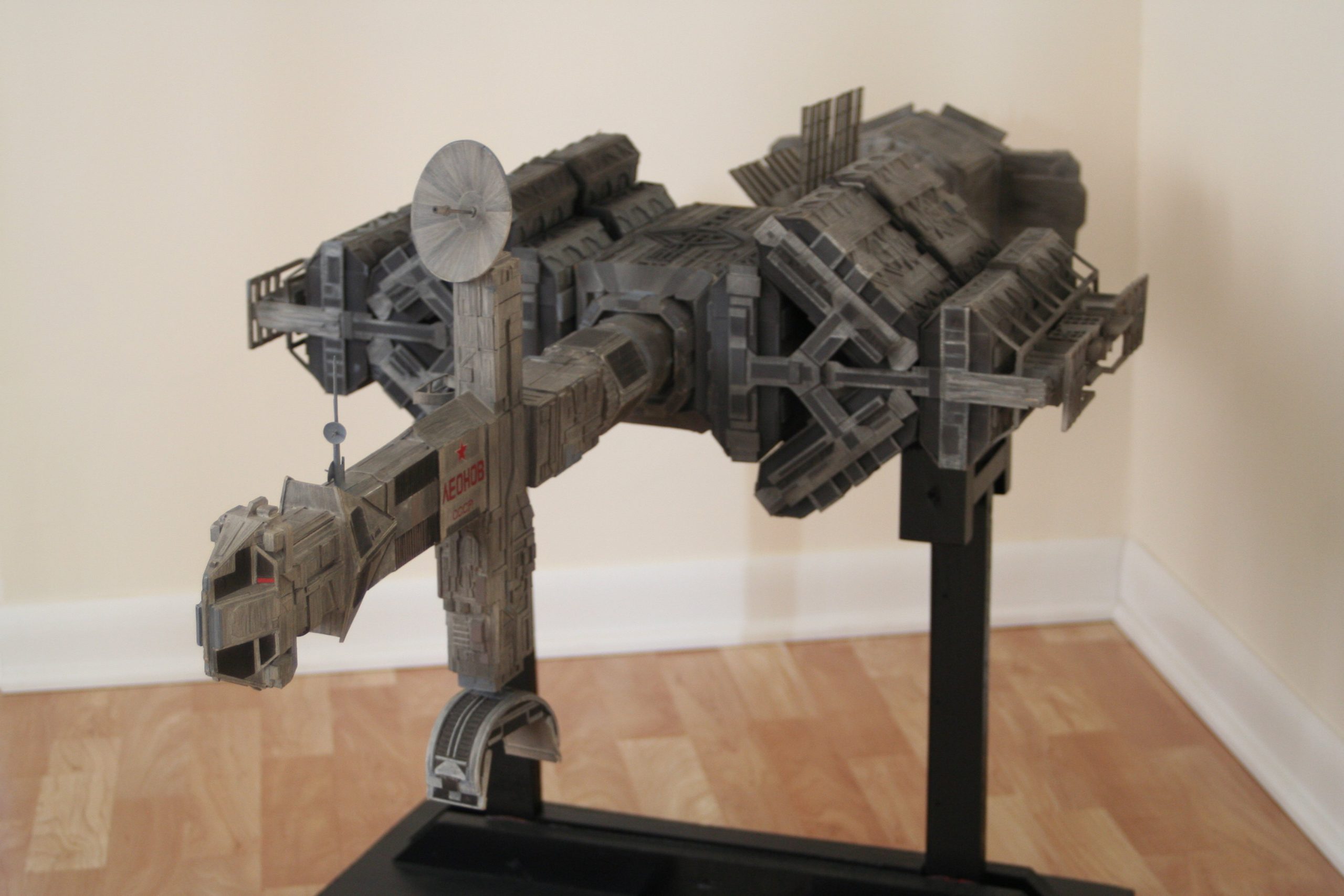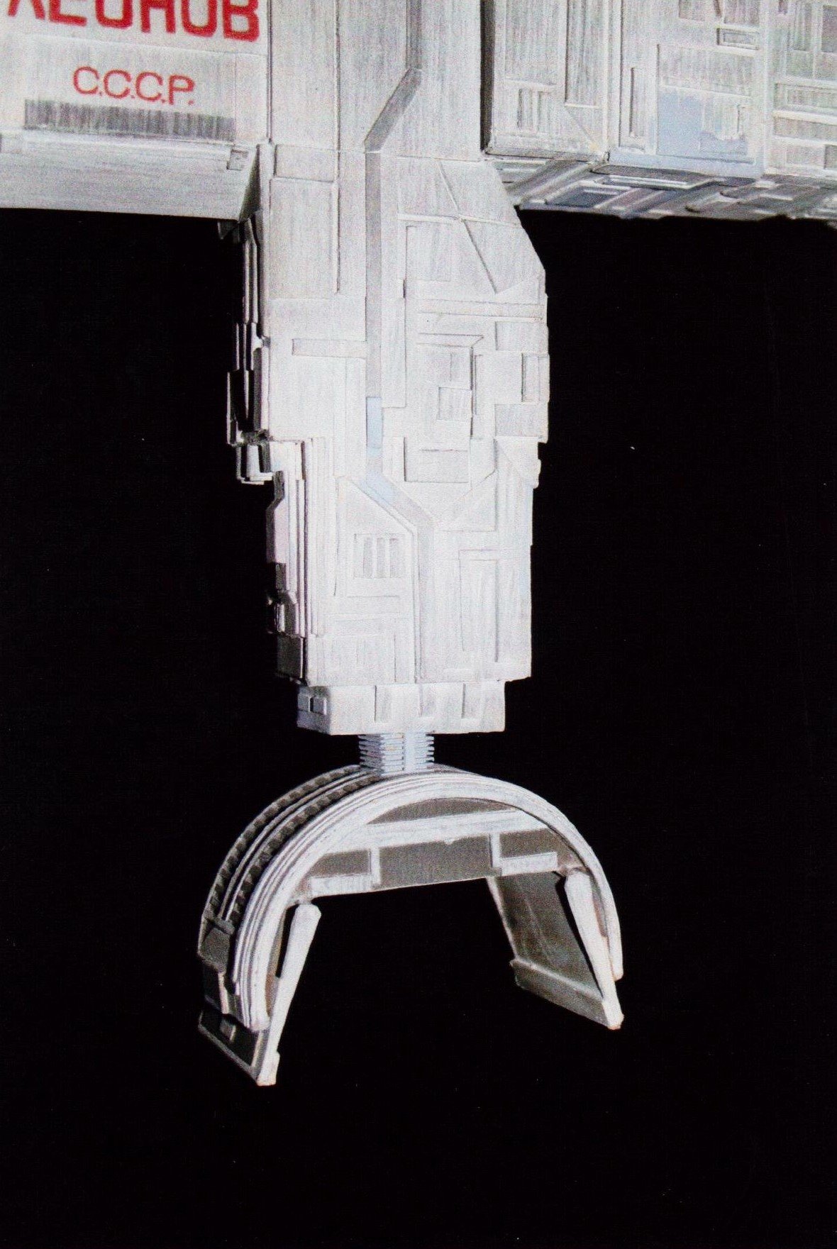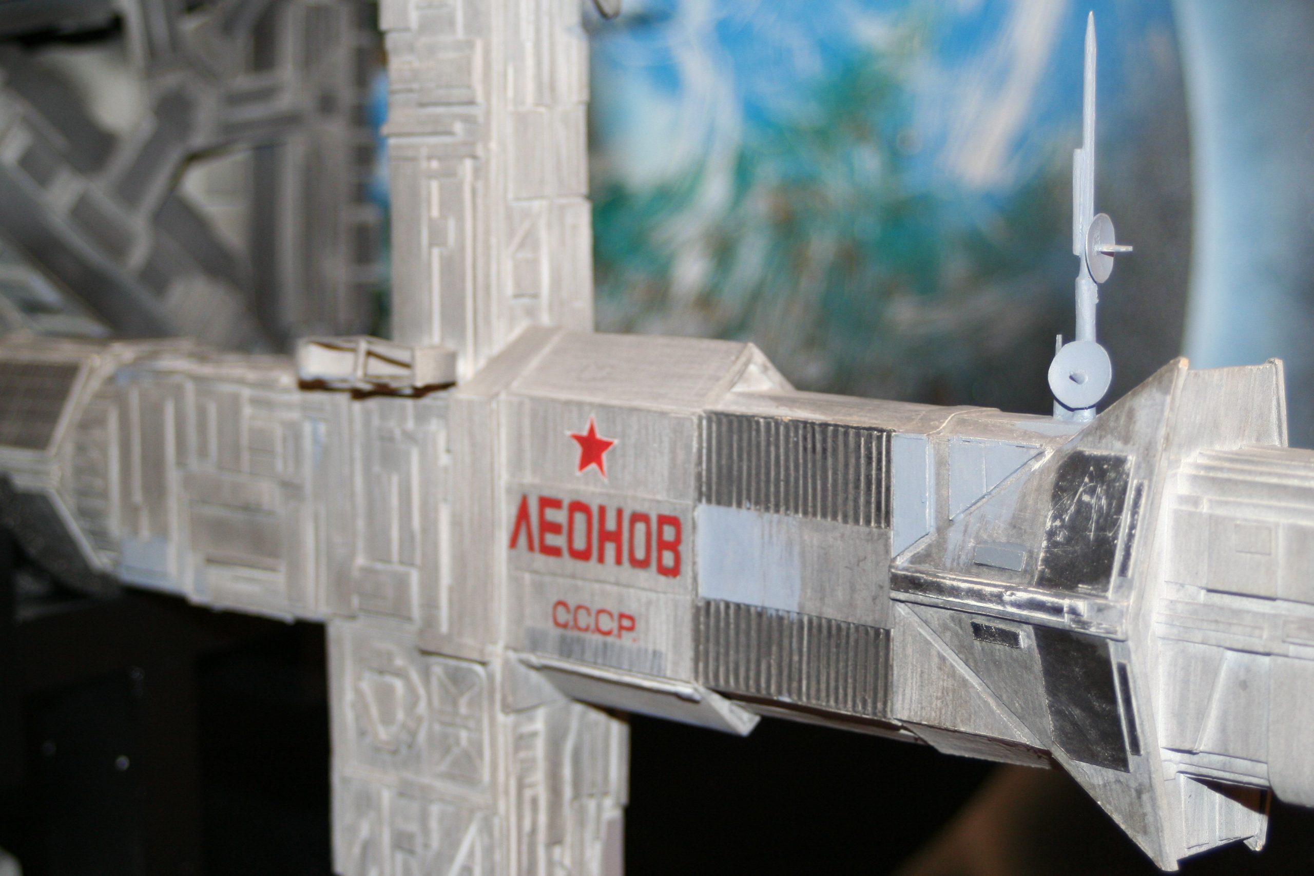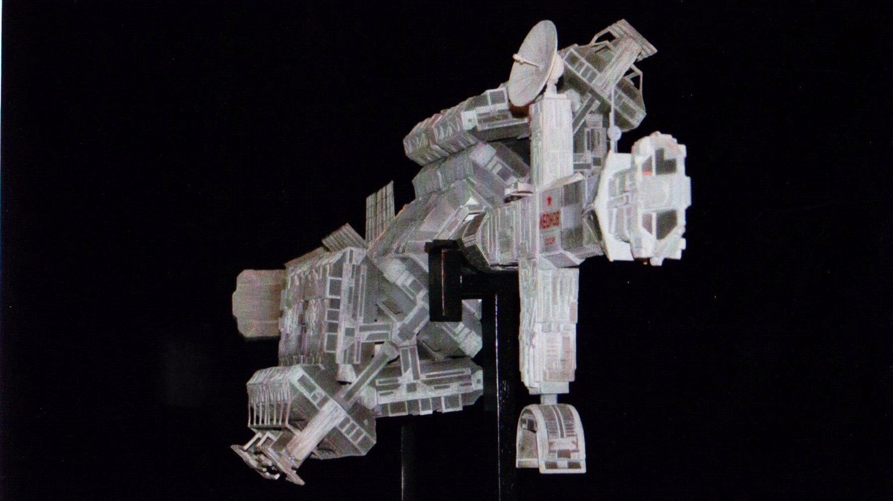 I finally got to scan some old photos of the Leonov that I made from scratch back in 1986/87. It took a year and four months to complete. It was airbrushed with tempera and dry brushed with black and white wash. The two small dishes where made from a Ping-Pong ball. The docking ring, the large dish and cabins are poseable. At 4ft. long it is still the largest model I have ever made. This model was made on a “dare” from an old high school friend who lent me his Cinefex and 2010 magazine special. He also taught me how to paint it. To him I say,…”Thanks Rudy!”