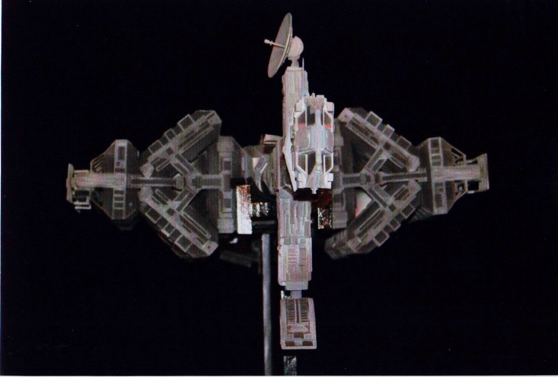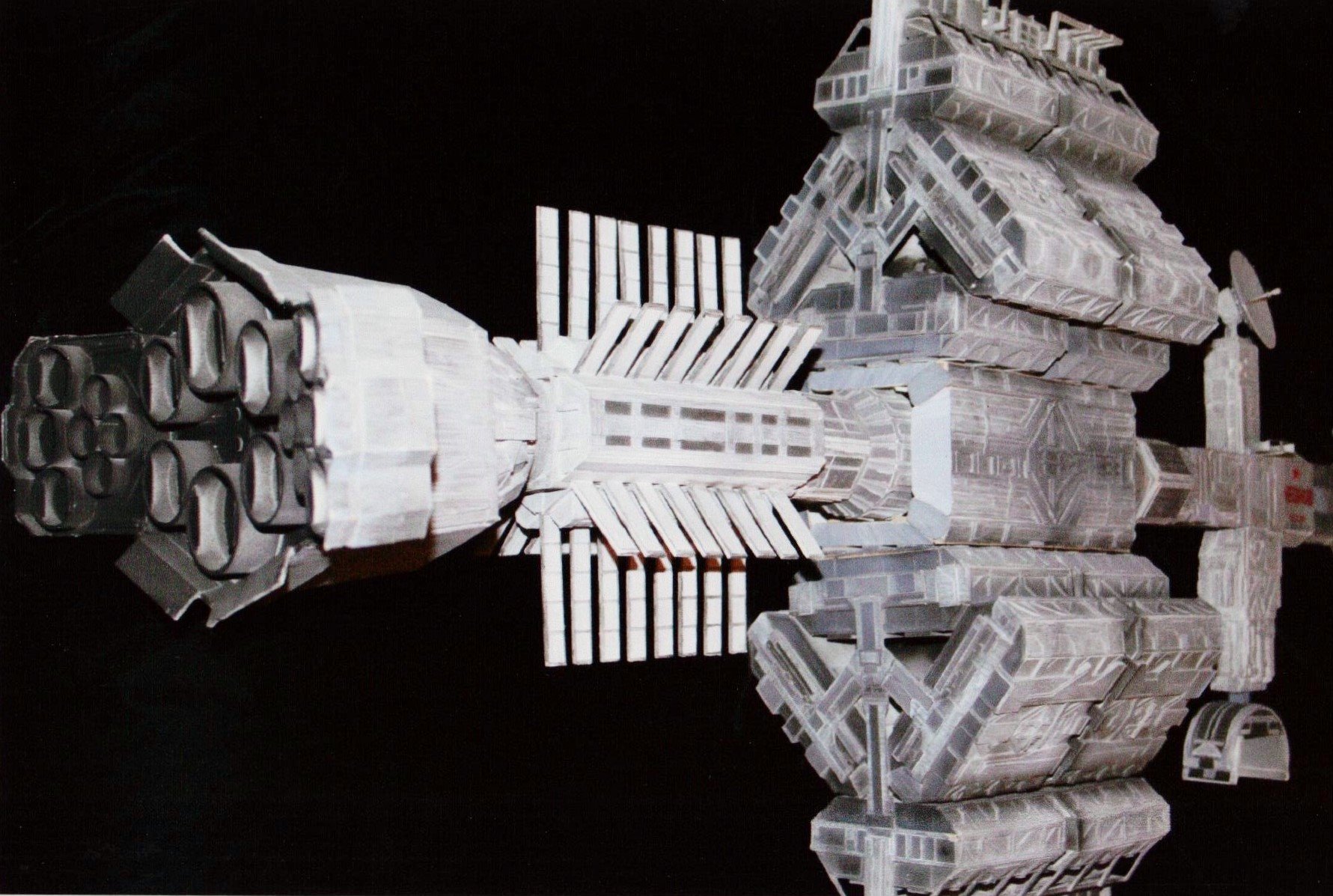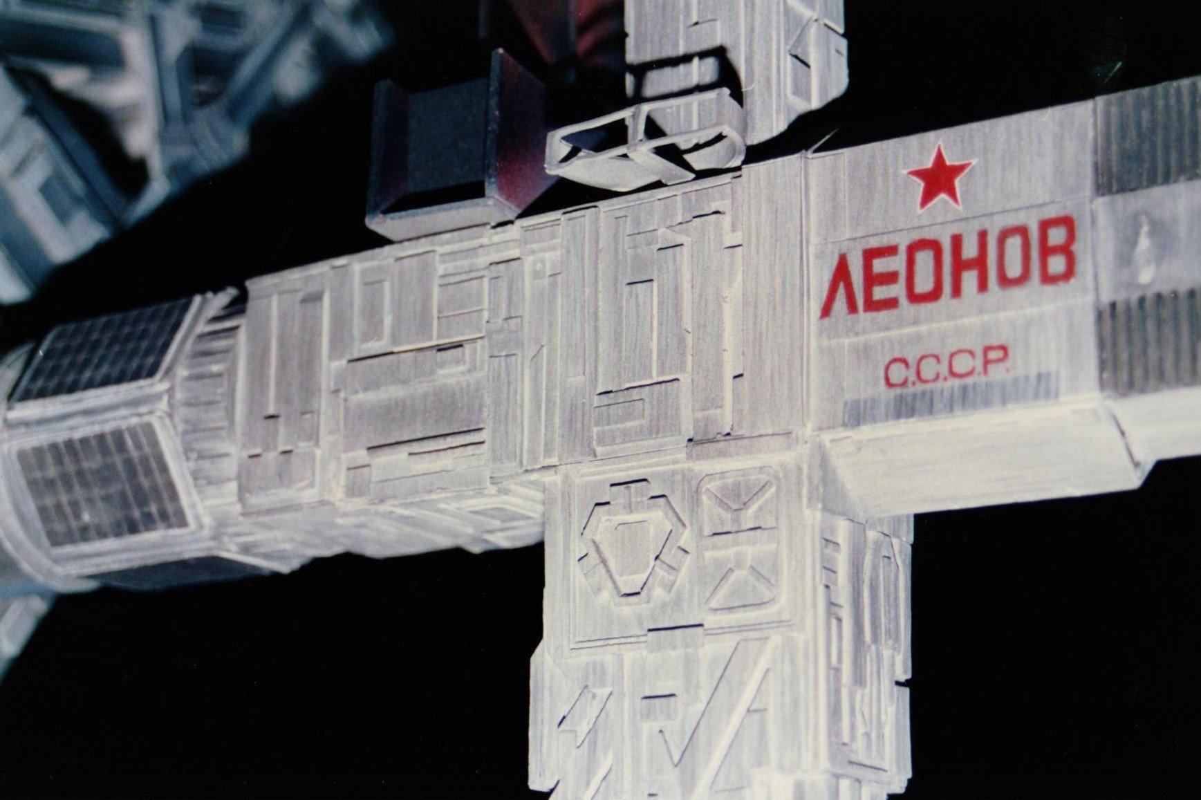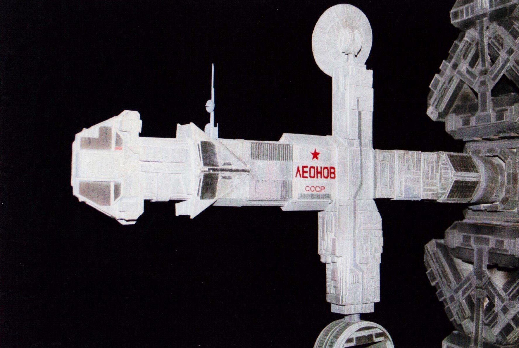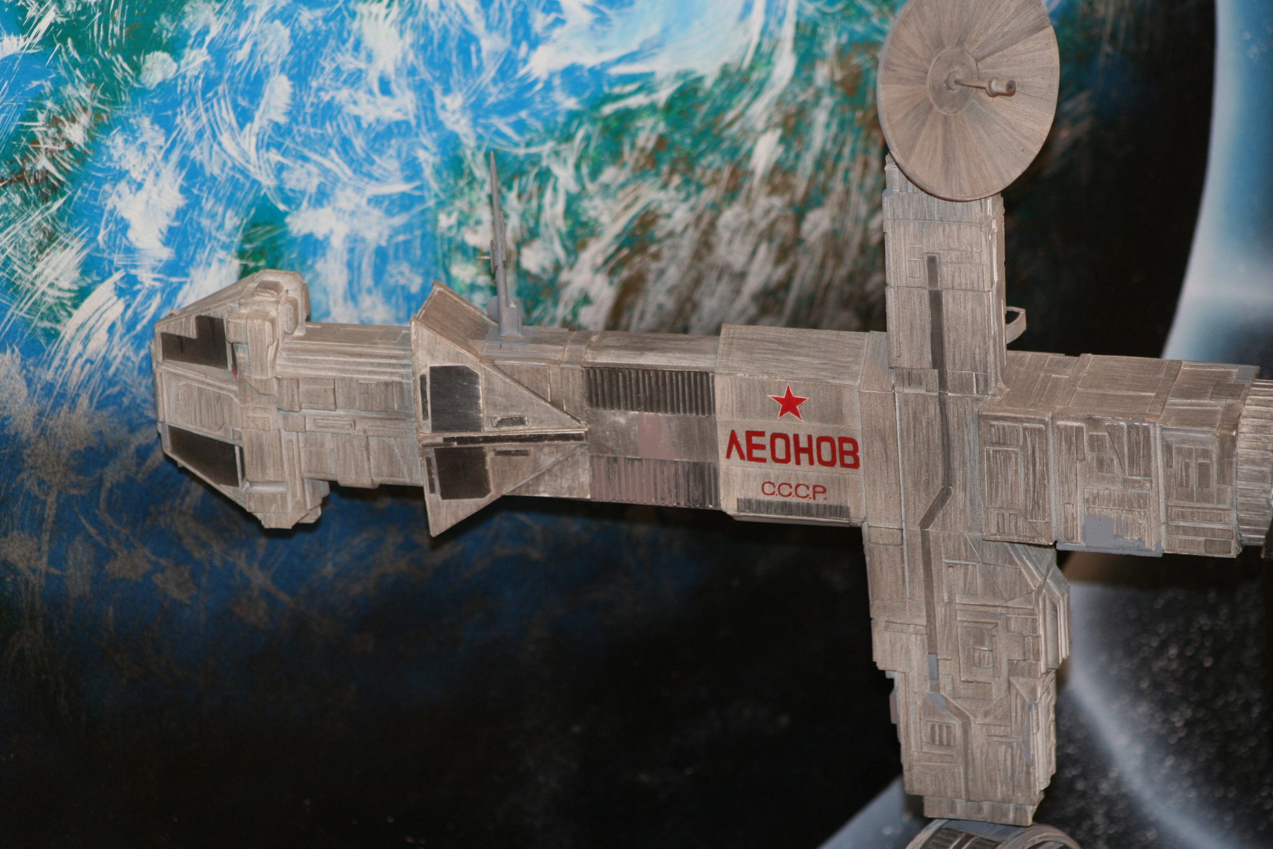 I finally got to scan some old photos of the Leonov that I made from scratch back in 1986/87. It took a year and four months to complete. It was airbrushed with tempera and dry brushed with black and white wash. The two small dishes where made from a Ping-Pong ball. The docking ring, the large dish and cabins are poseable. At 4ft. long it is still the largest model I have ever made. This model was made on a “dare” from an old high school friend who lent me his Cinefex and 2010 magazine special. He also taught me how to paint it. To him I say,…”Thanks Rudy!”