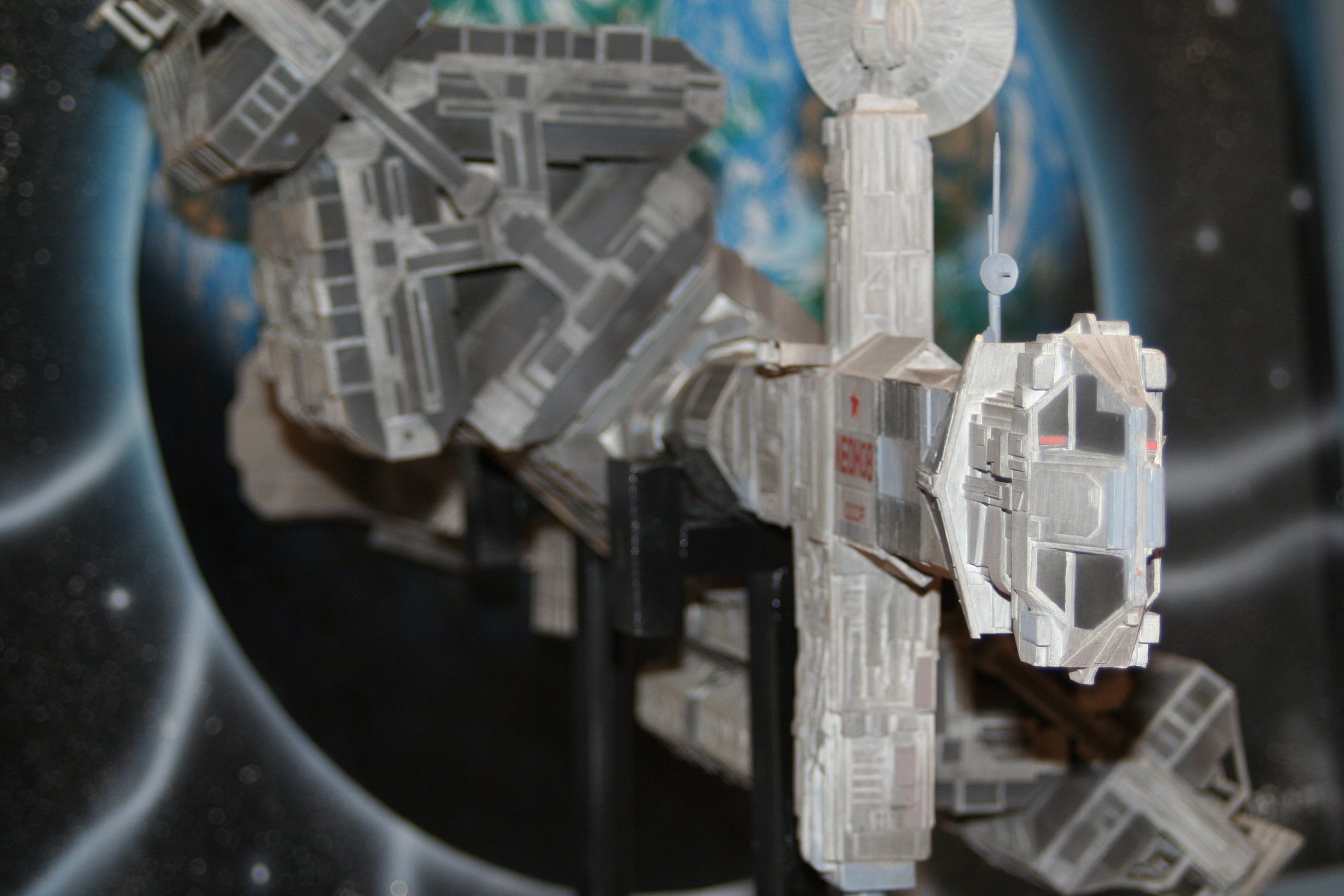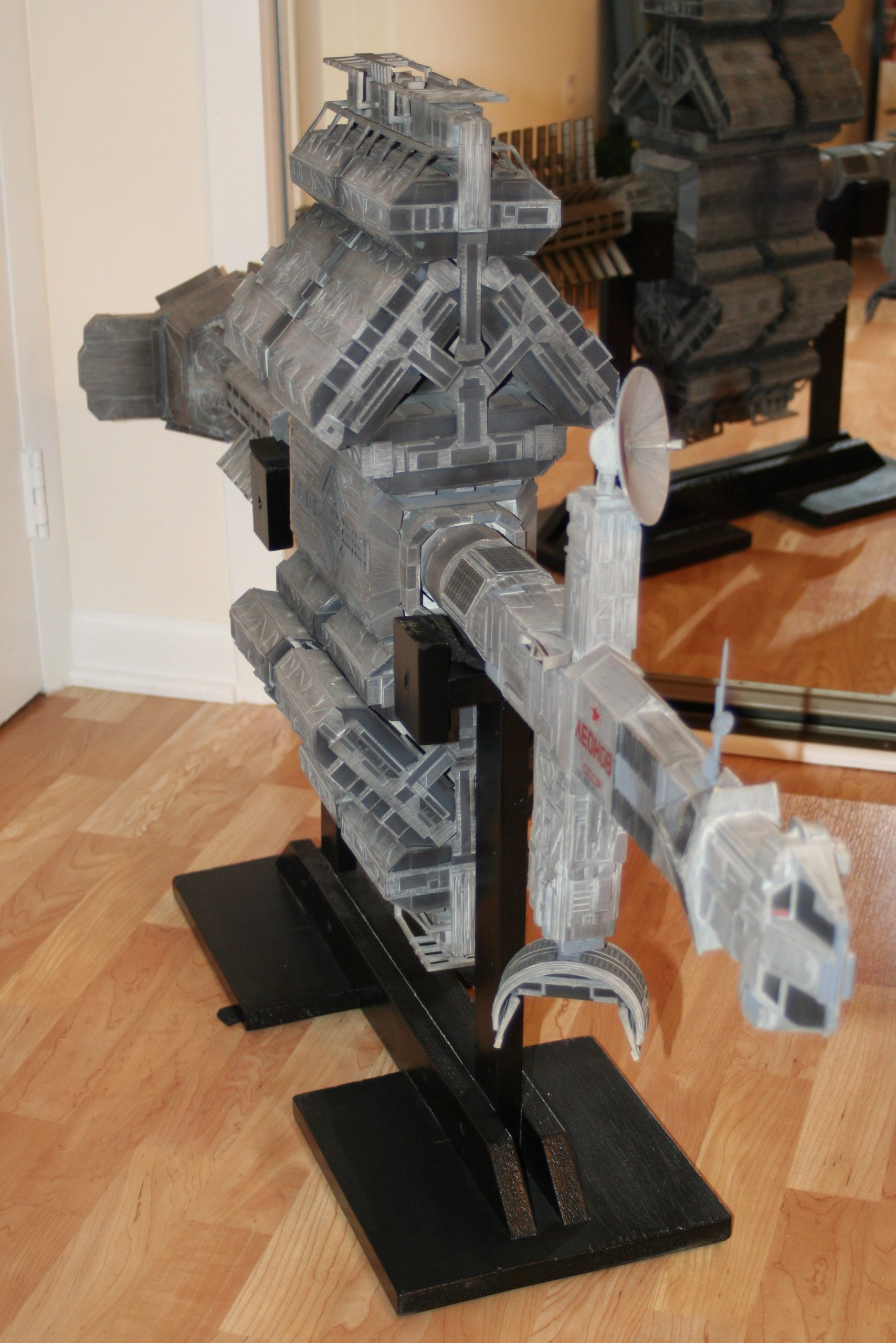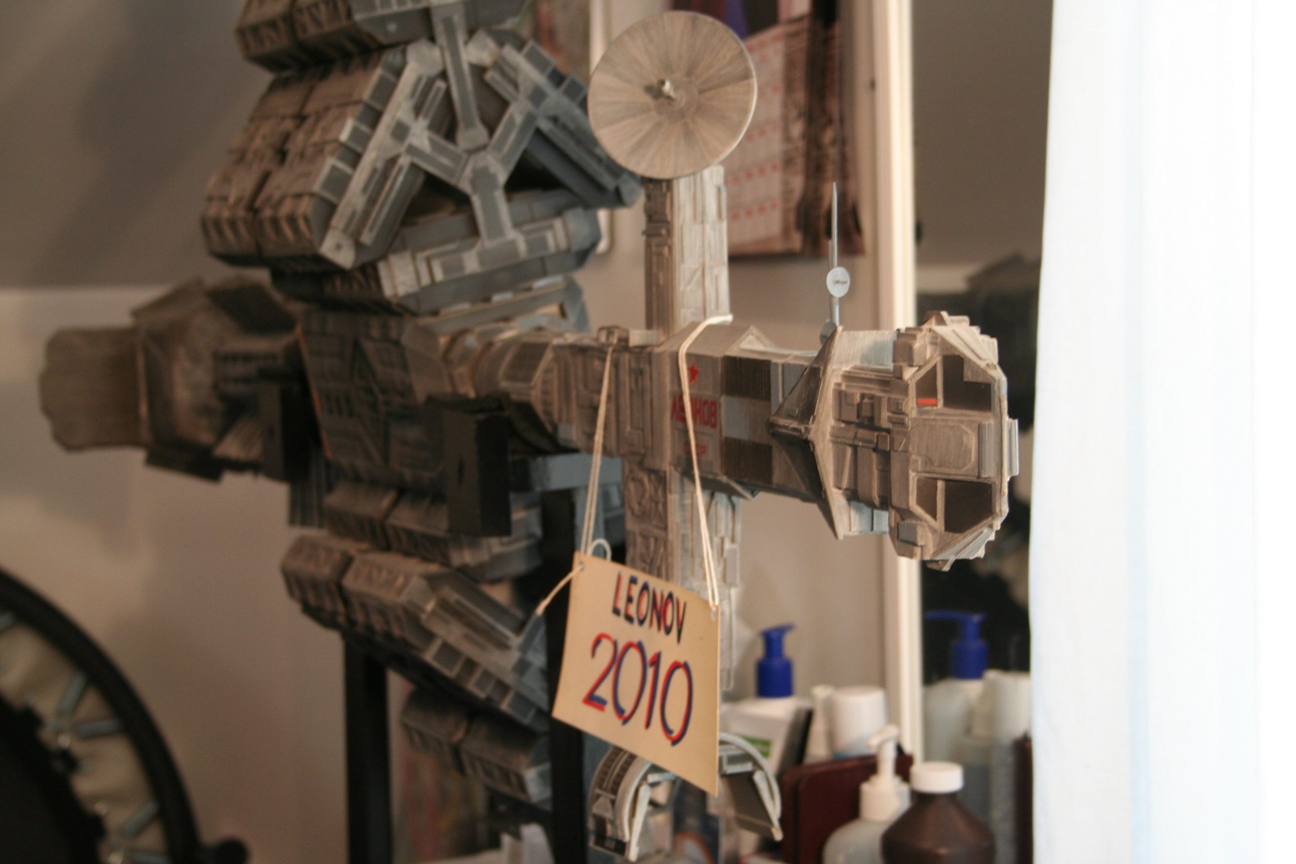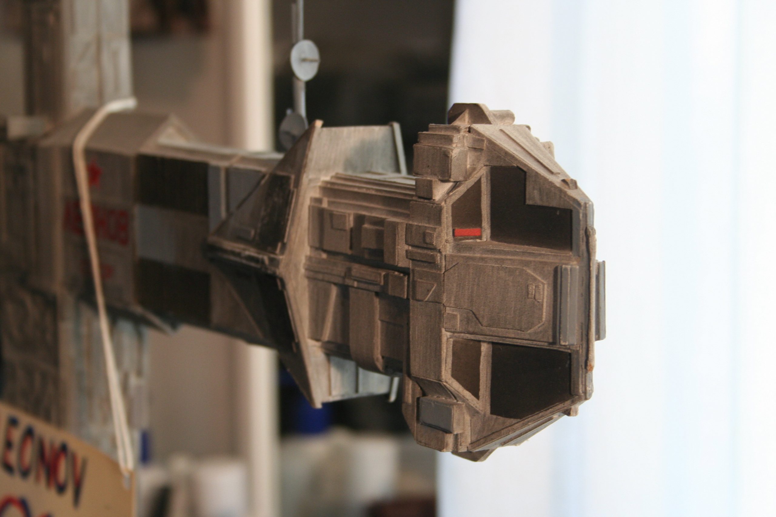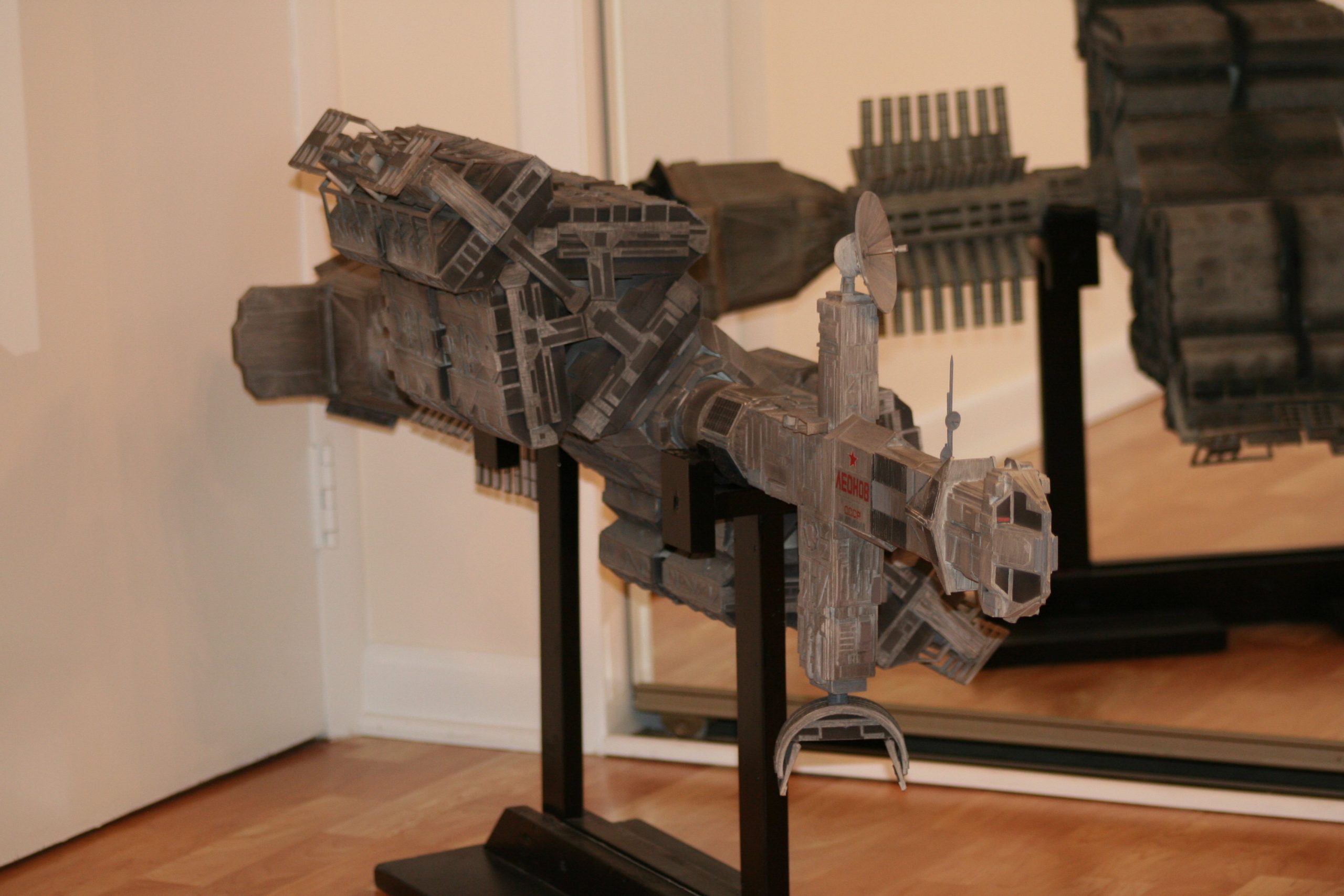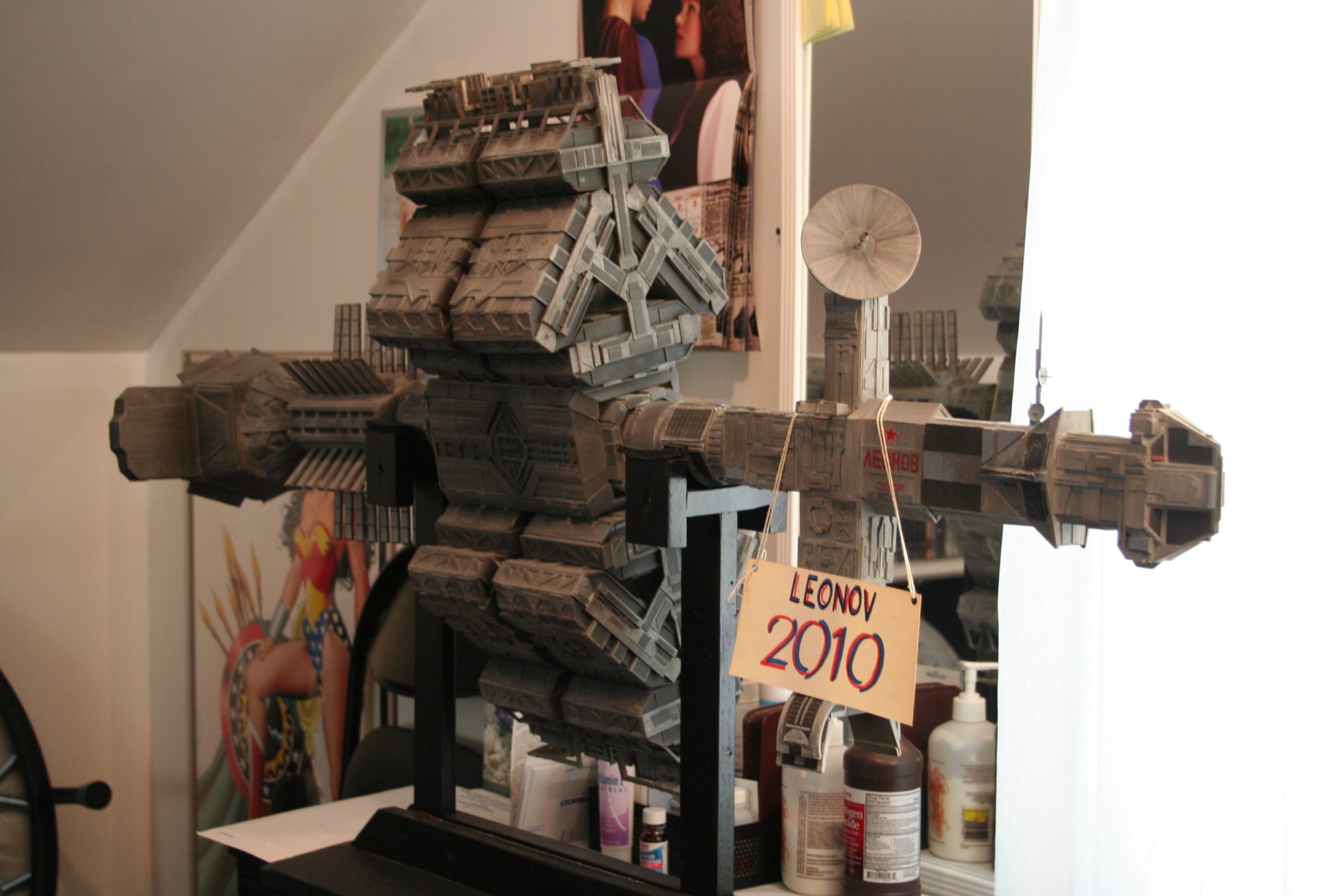 I finally got to scan some old photos of the Leonov that I made from scratch back in 1986/87. It took a year and four months to complete. It was airbrushed with tempera and dry brushed with black and white wash. The two small dishes where made from a Ping-Pong ball. The docking ring, the large dish and cabins are poseable. At 4ft. long it is still the largest model I have ever made. This model was made on a “dare” from an old high school friend who lent me his Cinefex and 2010 magazine special. He also taught me how to paint it. To him I say,…”Thanks Rudy!”