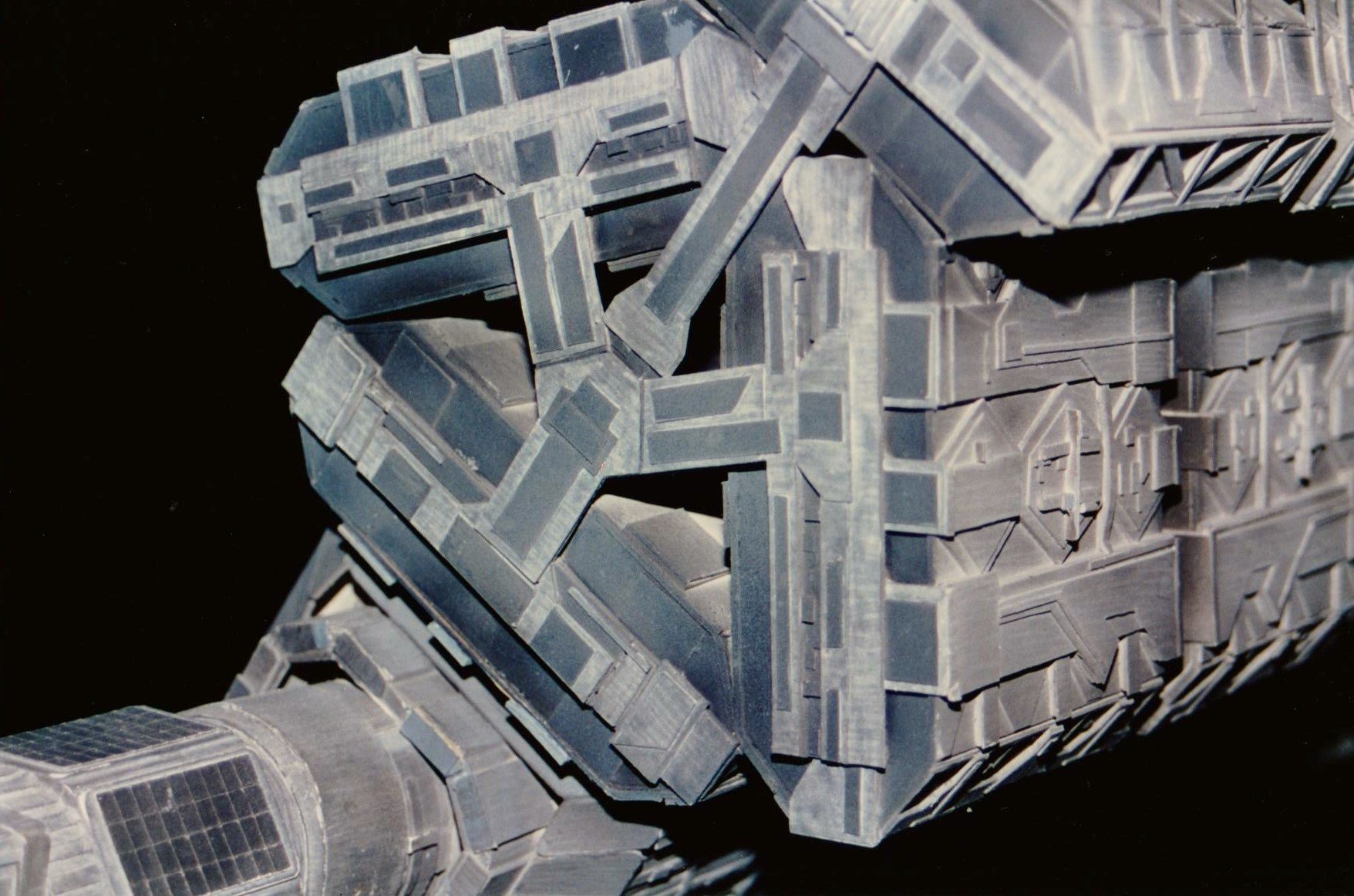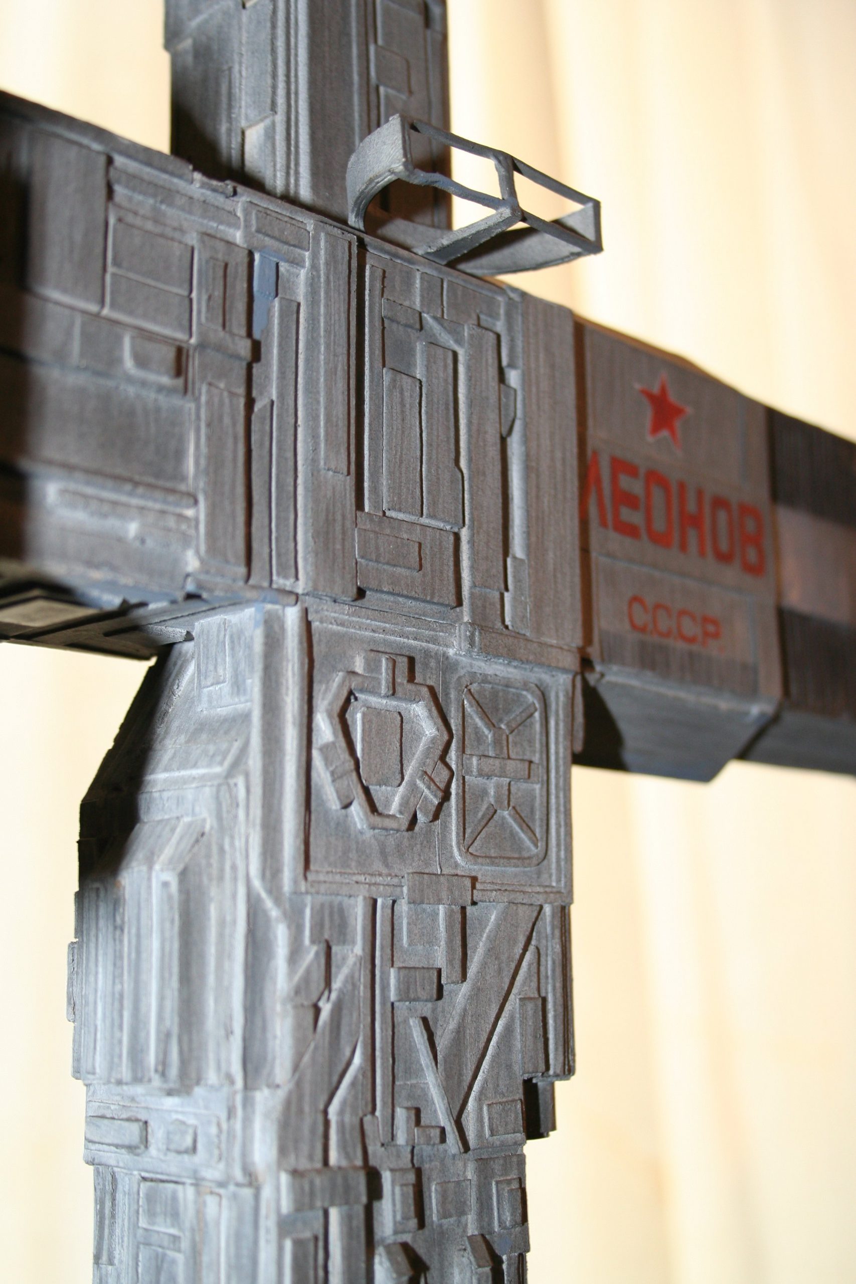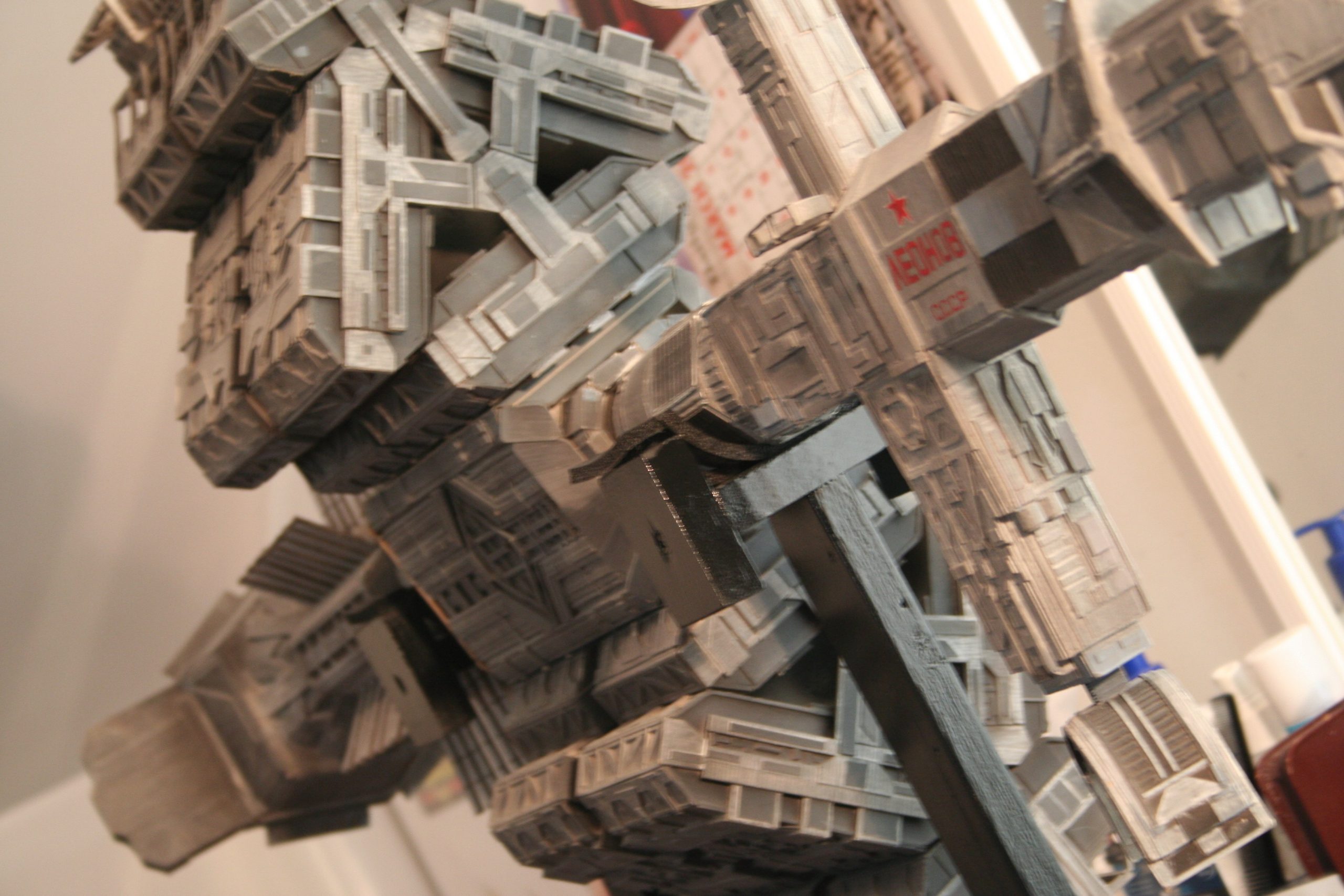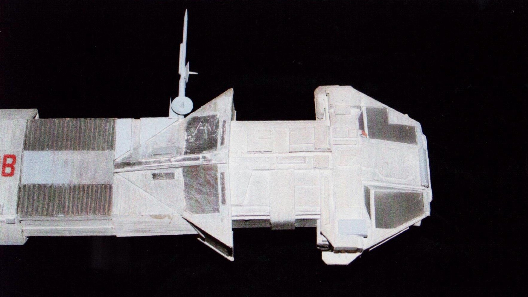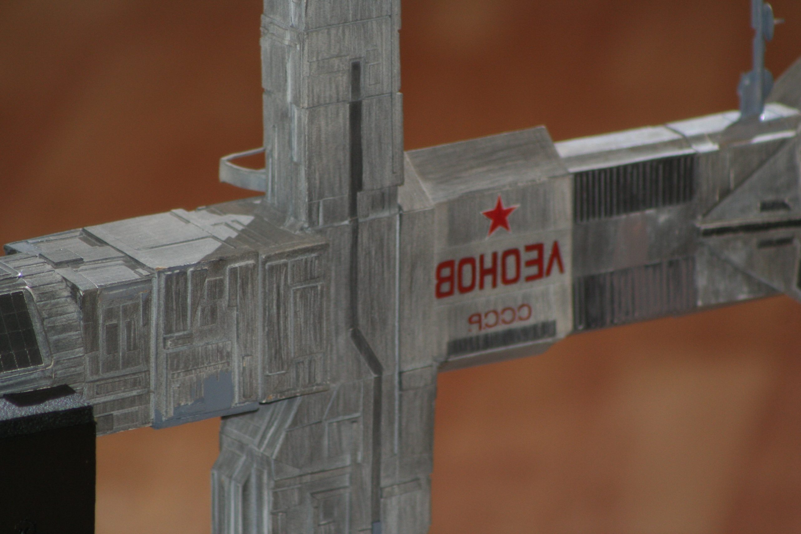 I finally got to scan some old photos of the Leonov that I made from scratch back in 1986/87. It took a year and four months to complete. It was airbrushed with tempera and dry brushed with black and white wash. The two small dishes where made from a Ping-Pong ball. The docking ring, the large dish and cabins are poseable. At 4ft. long it is still the largest model I have ever made. This model was made on a “dare” from an old high school friend who lent me his Cinefex and 2010 magazine special. He also taught me how to paint it. To him I say,…”Thanks Rudy!”