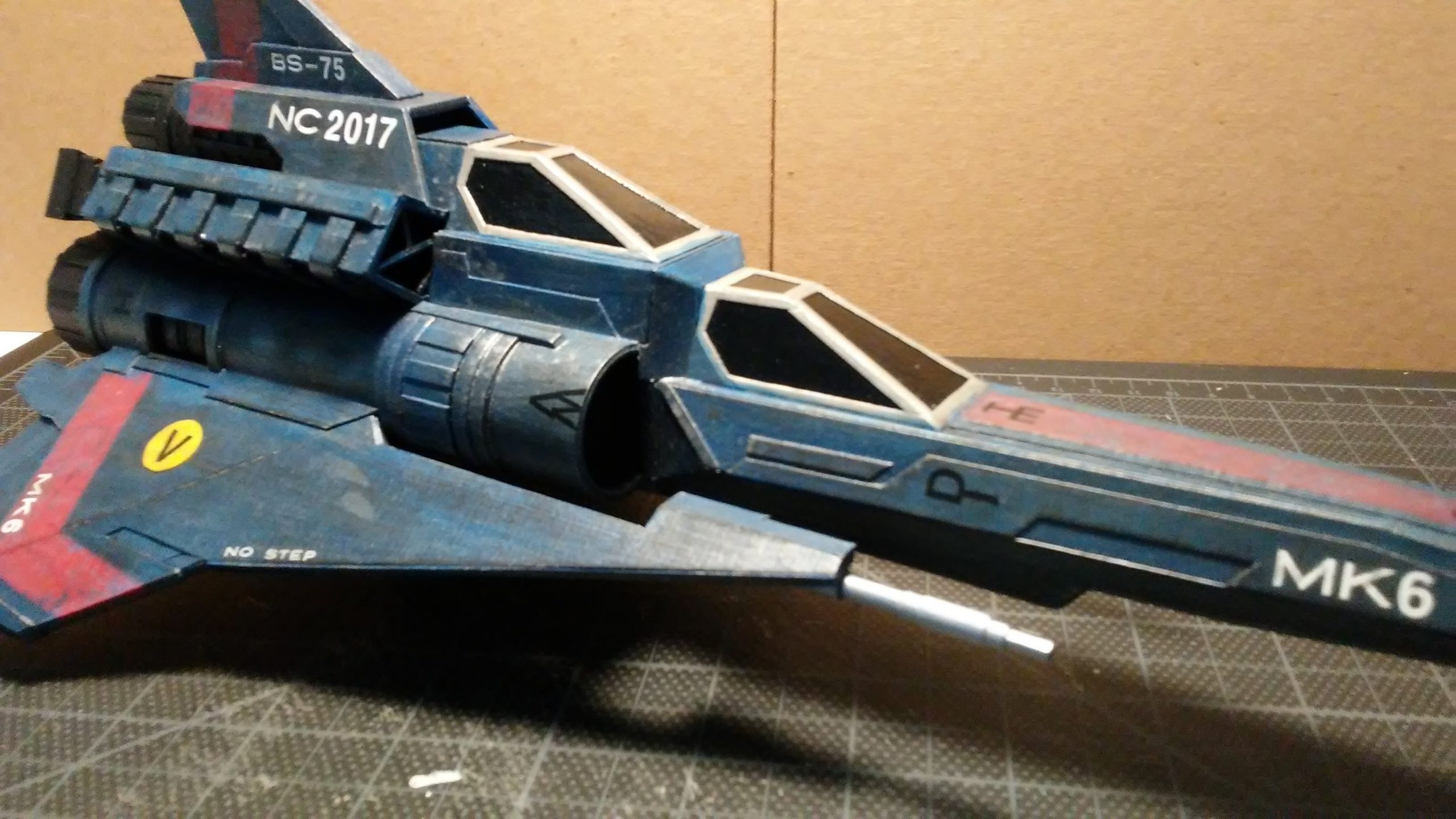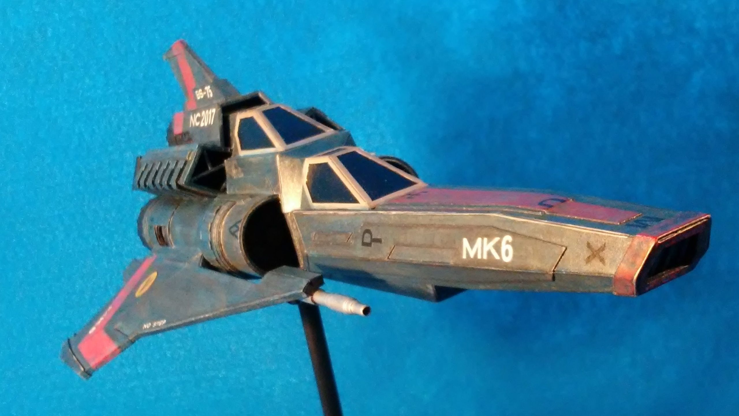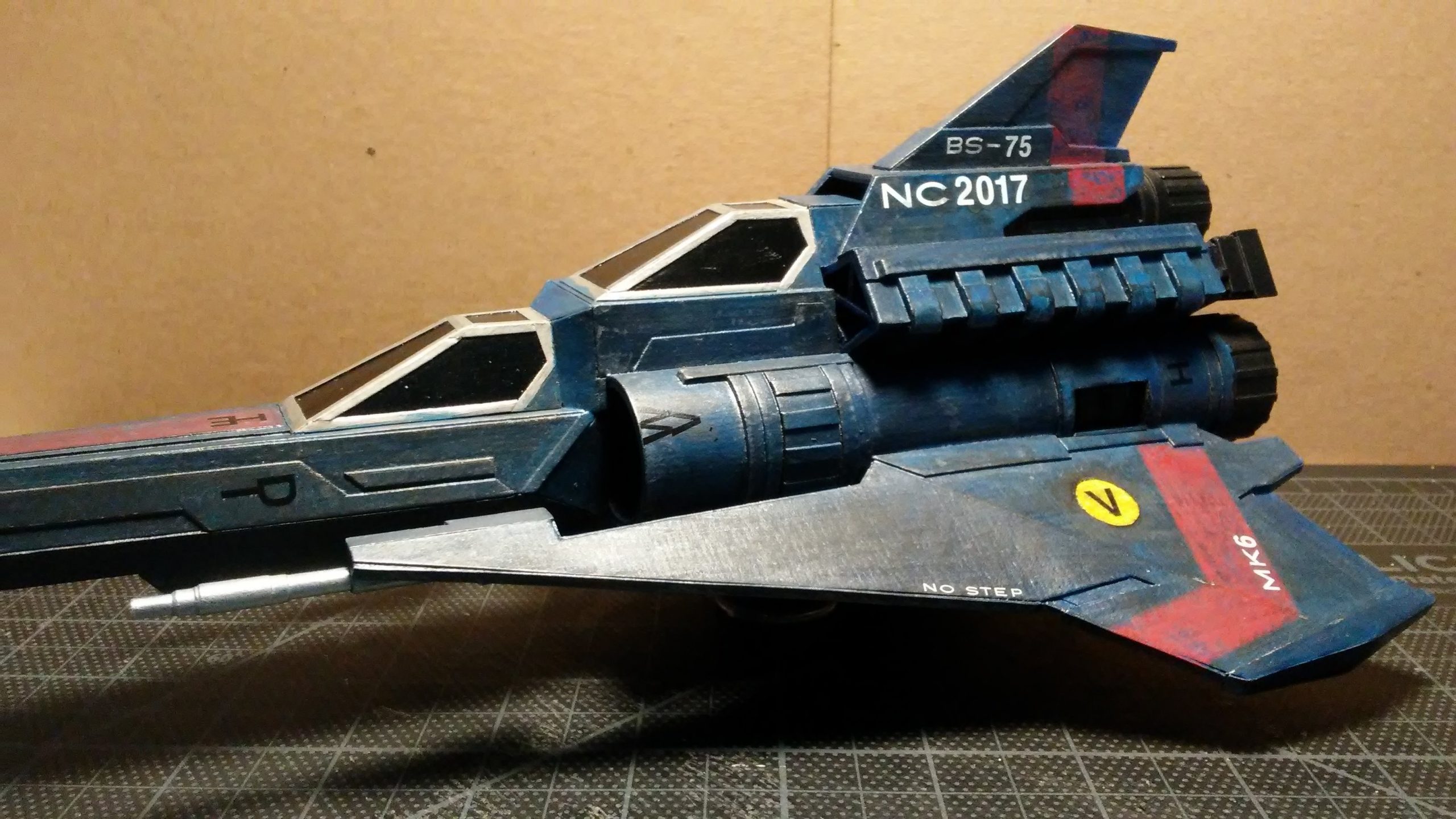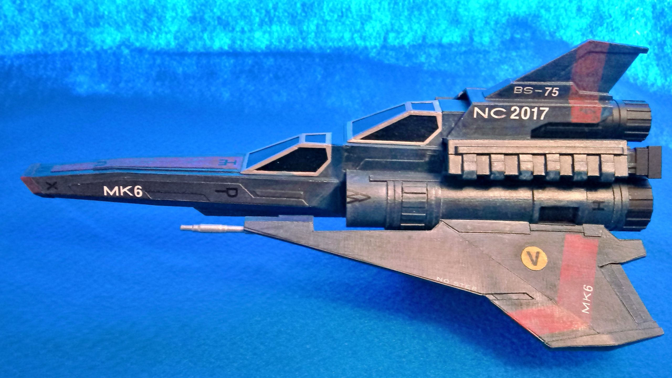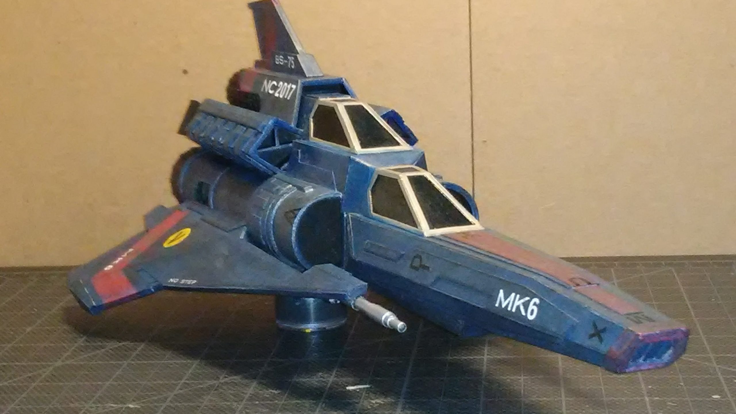 Card stock artist Anthony Santos recently sent me these wonderful photos of his latest creation and design,.. the Mk 6 Colonial Viper with TWO canopies showing! In the original series, I was always confused how a Colonial Viper ever was able to fit a passenger… yet the story had it happening. Then of course we had GALACTICA 1980, where the model and prop makers fixed that part of their story telling by elongating the cockpit and canopy of the Viper. Anthony Santos forwards this thinking in utilizing the 2003 series MkII Viper design as the base for his own two-seat design, which is seen here!