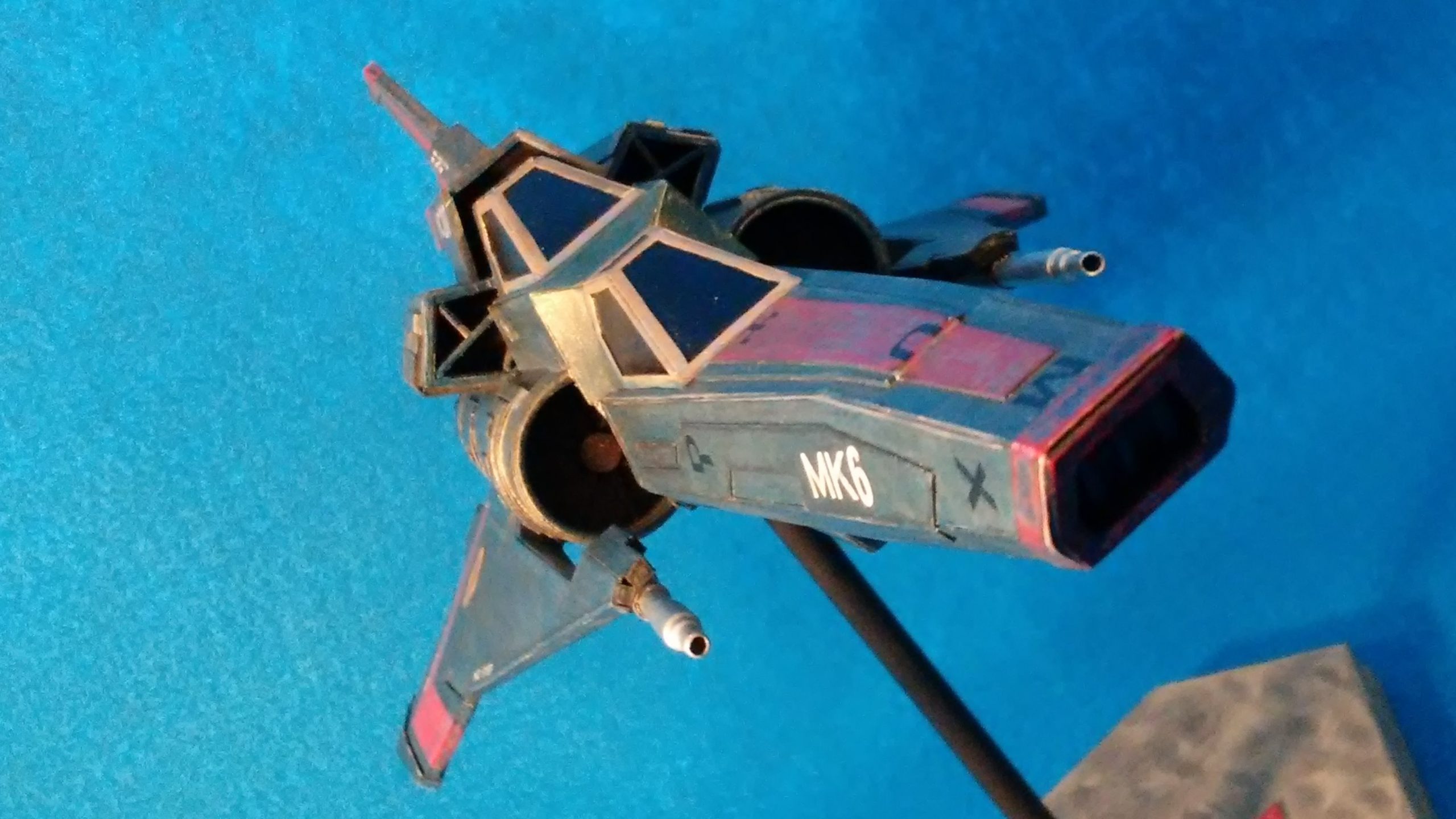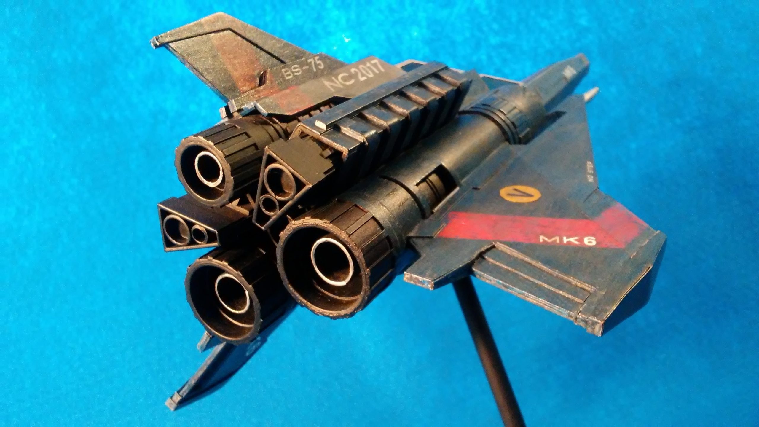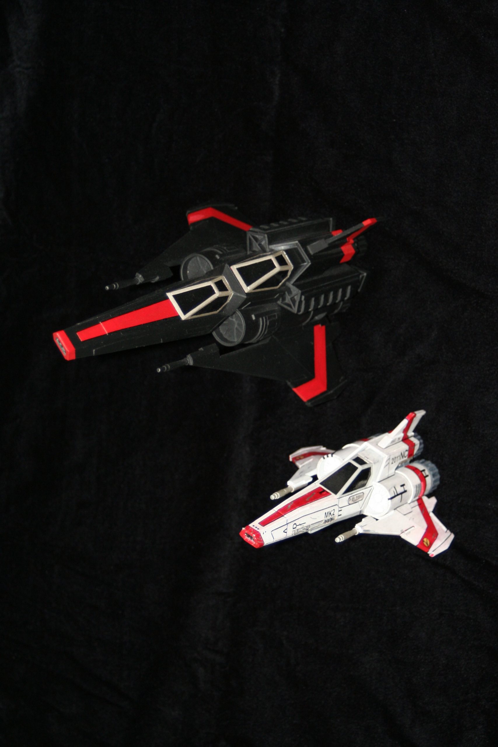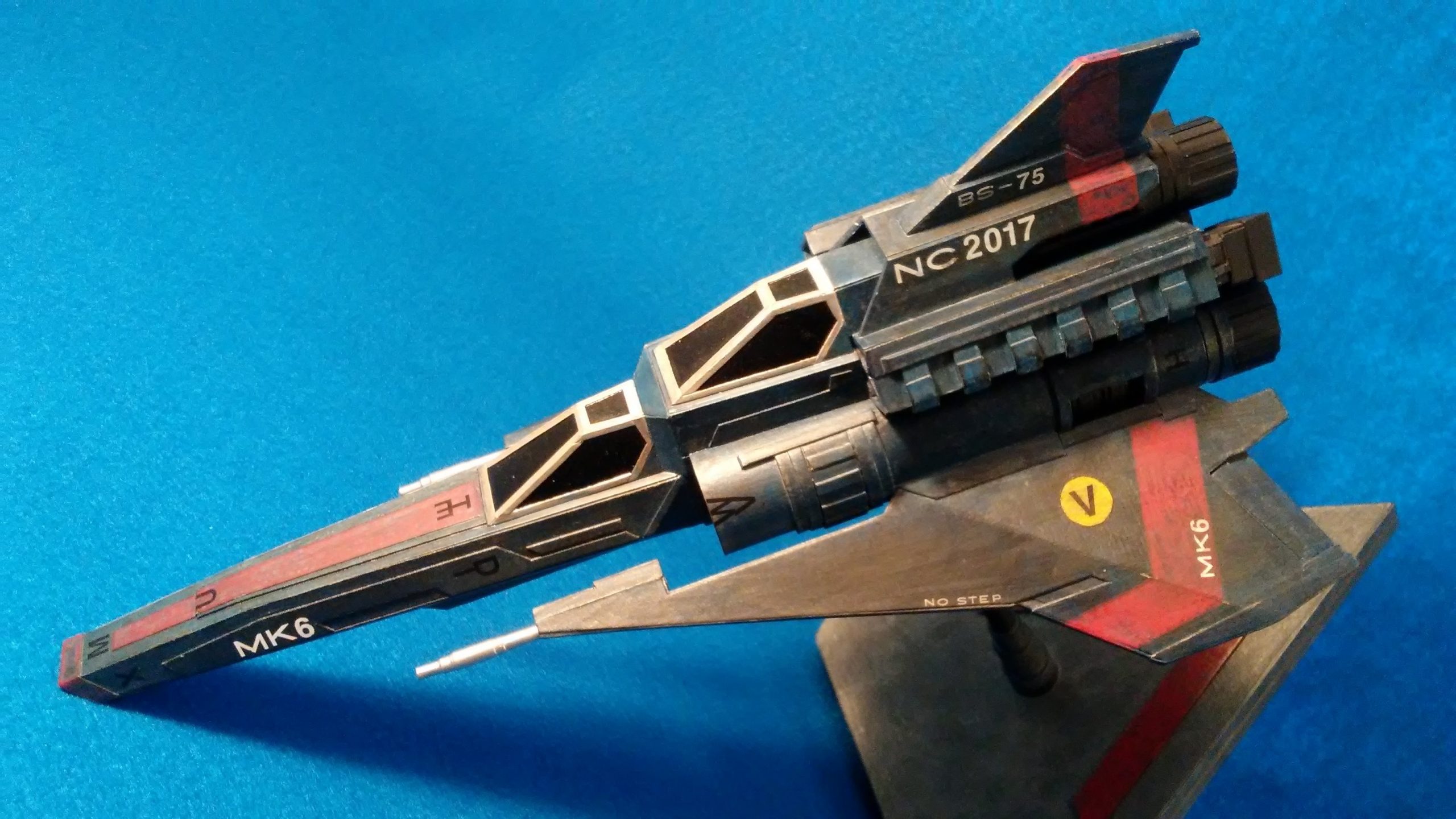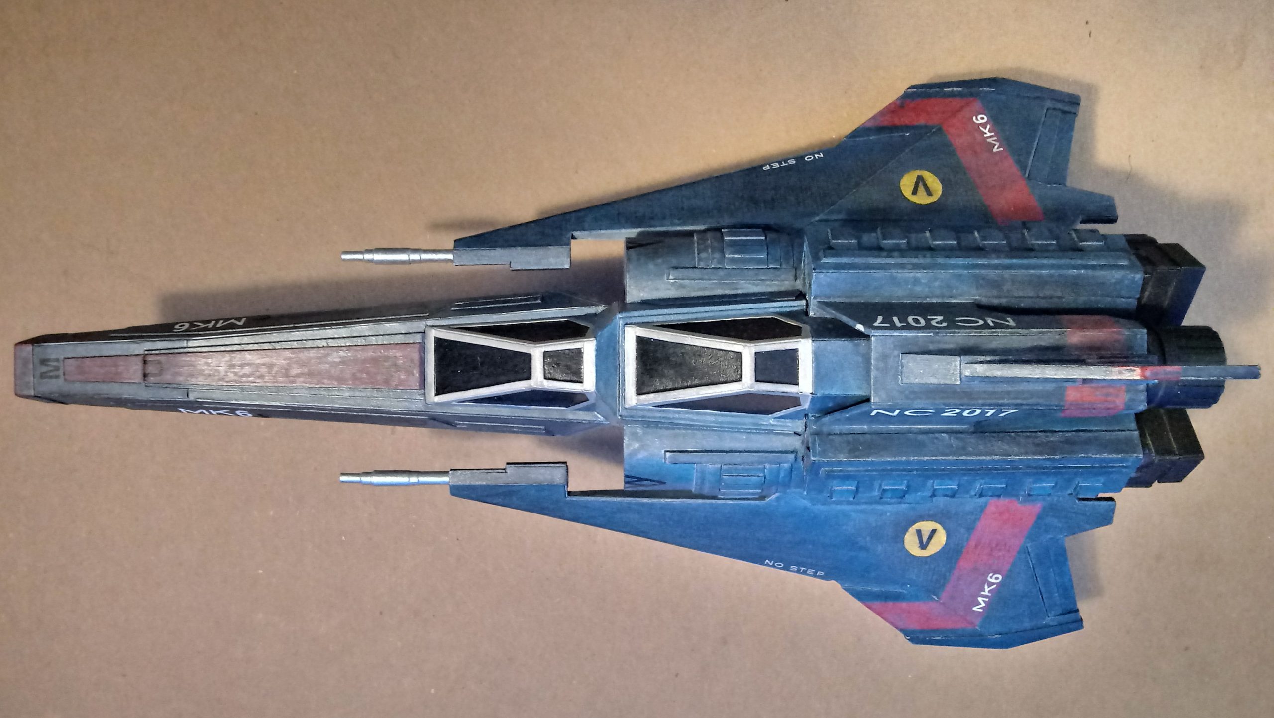 Card stock artist Anthony Santos recently sent me these wonderful photos of his latest creation and design,.. the Mk 6 Colonial Viper with TWO canopies showing! In the original series, I was always confused how a Colonial Viper ever was able to fit a passenger… yet the story had it happening. Then of course we had GALACTICA 1980, where the model and prop makers fixed that part of their story telling by elongating the cockpit and canopy of the Viper. Anthony Santos forwards this thinking in utilizing the 2003 series MkII Viper design as the base for his own two-seat design, which is seen here!