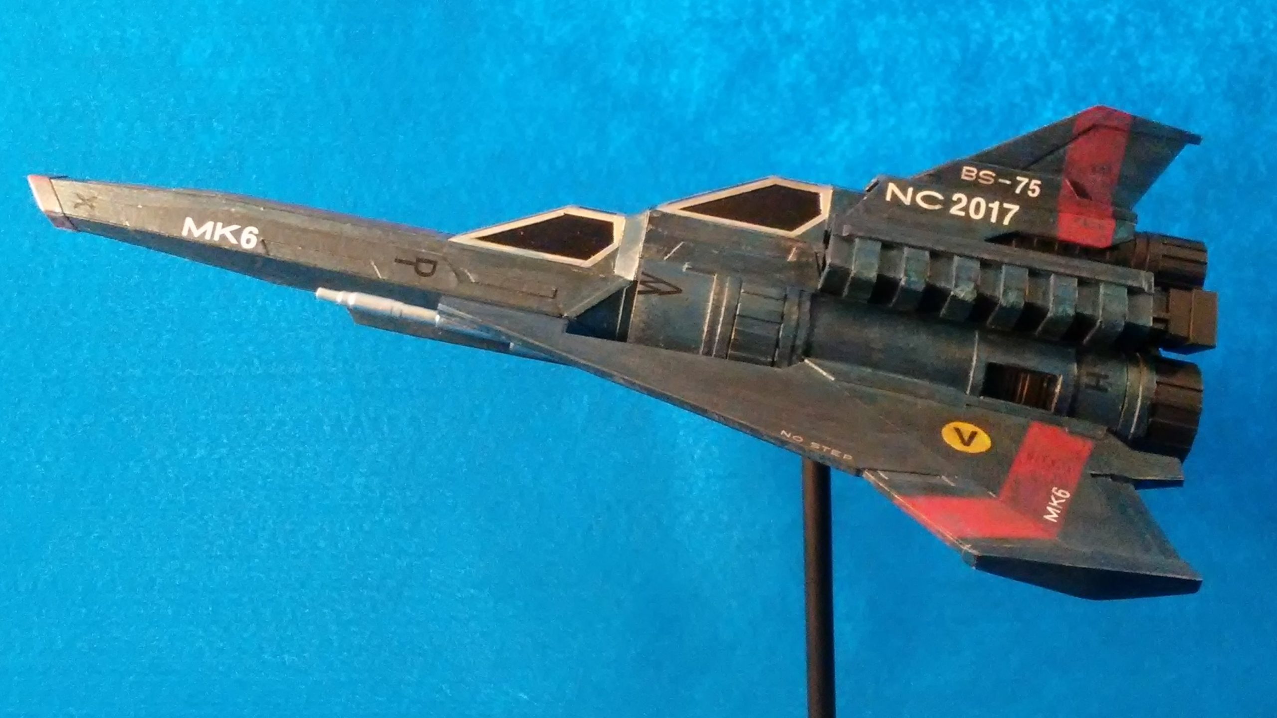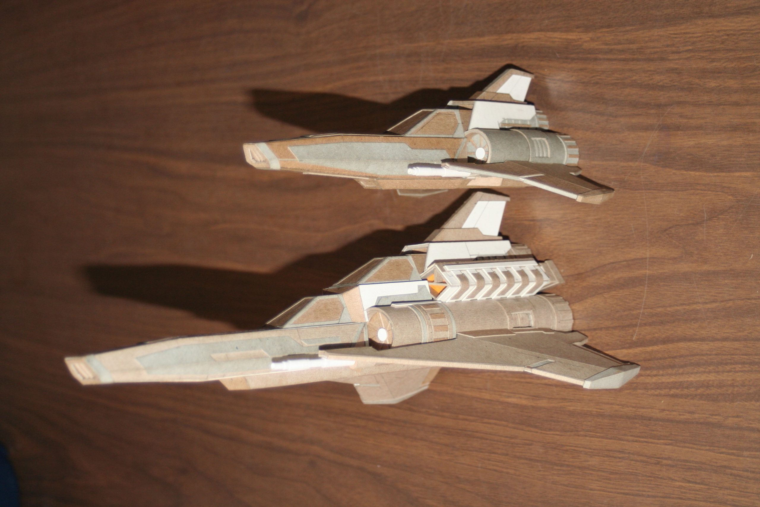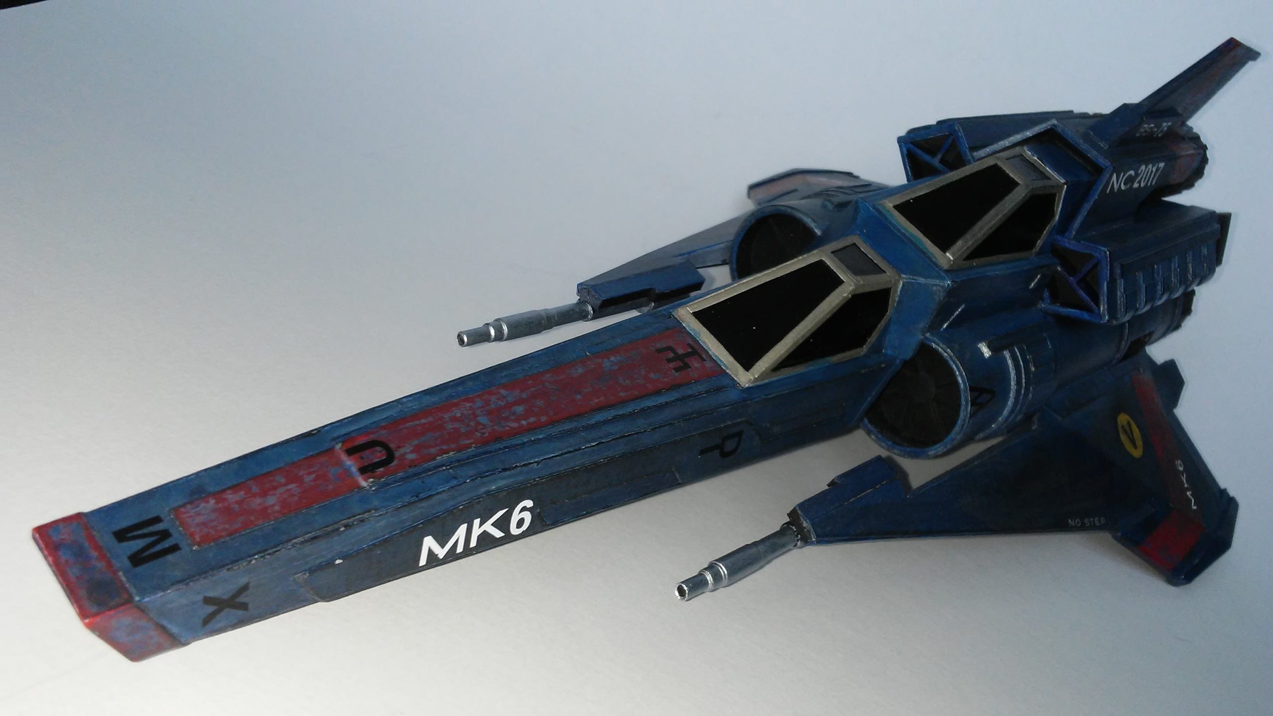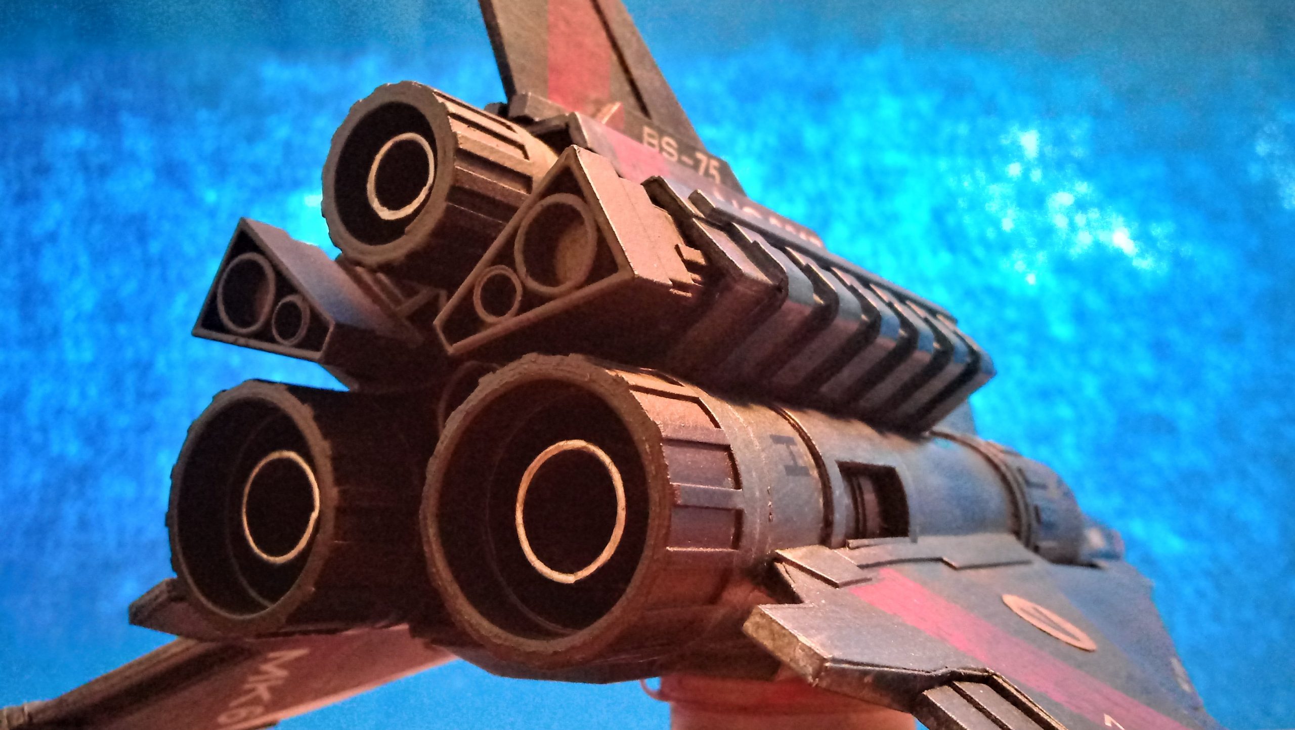 Card stock artist Anthony Santos recently sent me these wonderful photos of his latest creation and design,.. the Mk 6 Colonial Viper with TWO canopies showing! In the original series, I was always confused how a Colonial Viper ever was able to fit a passenger… yet the story had it happening. Then of course we had GALACTICA 1980, where the model and prop makers fixed that part of their story telling by elongating the cockpit and canopy of the Viper. Anthony Santos forwards this thinking in utilizing the 2003 series MkII Viper design as the base for his own two-seat design, which is seen here!