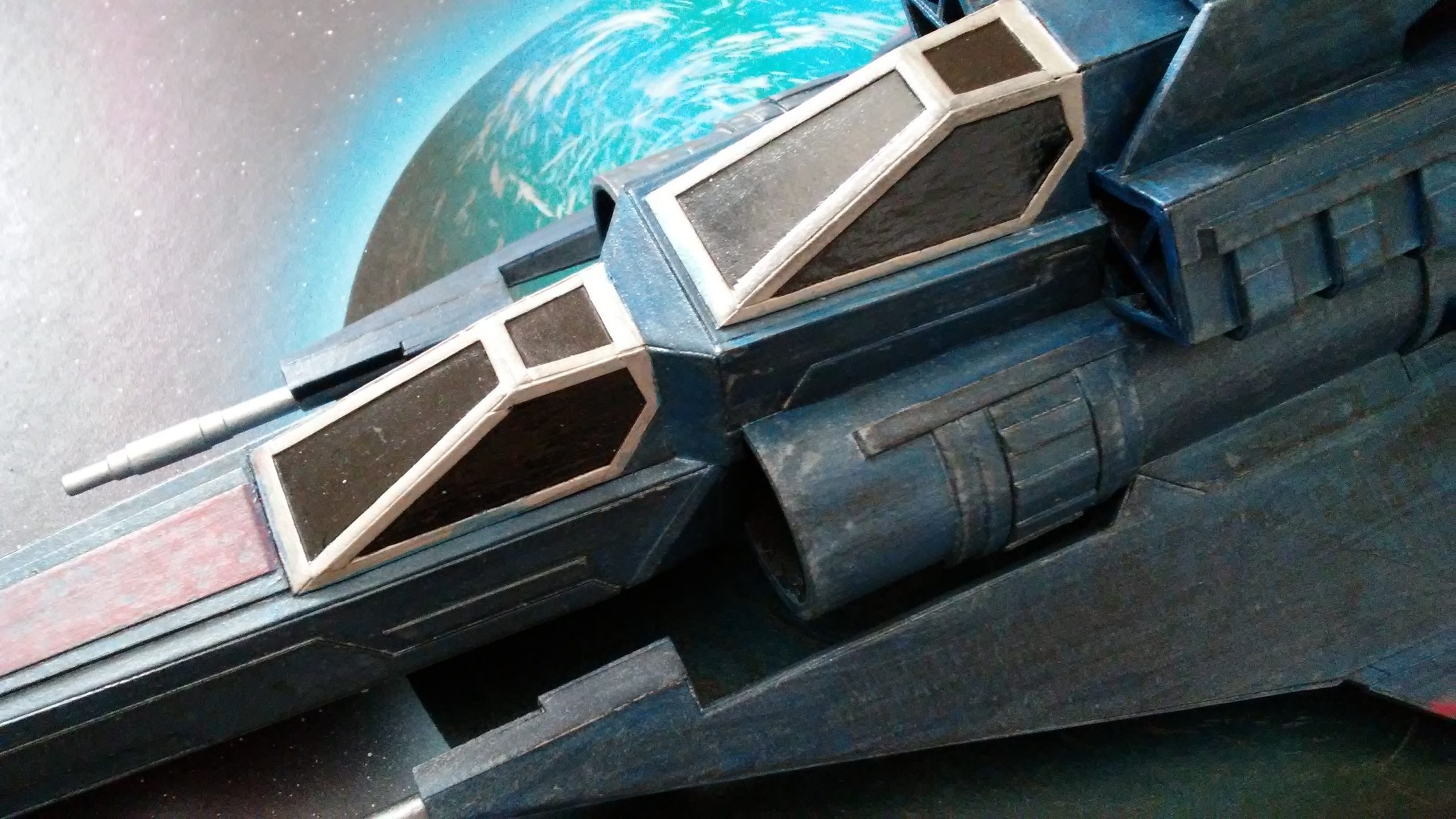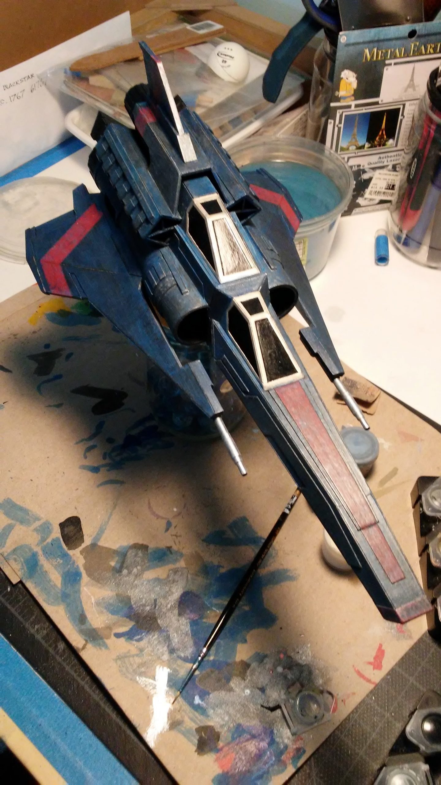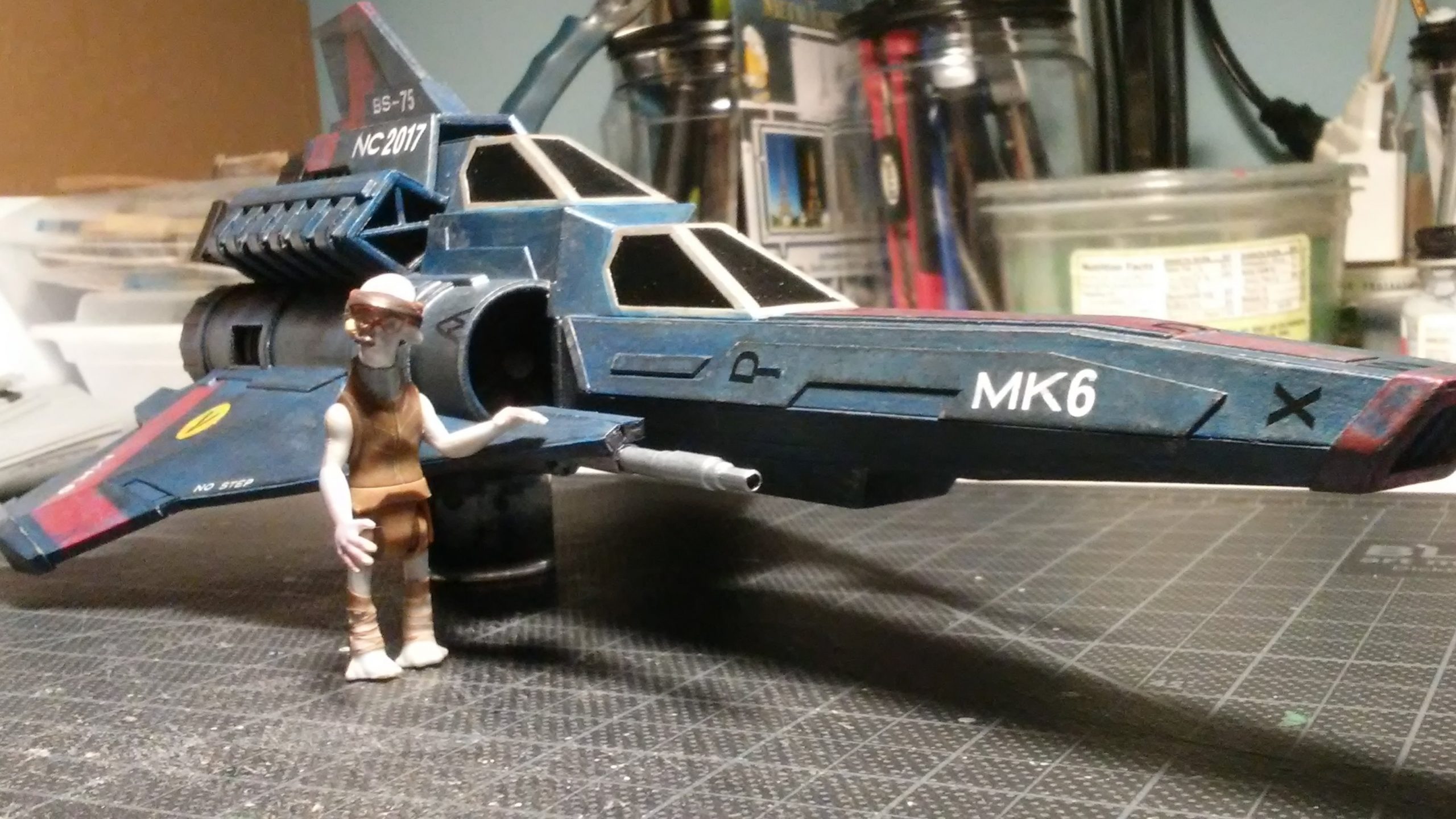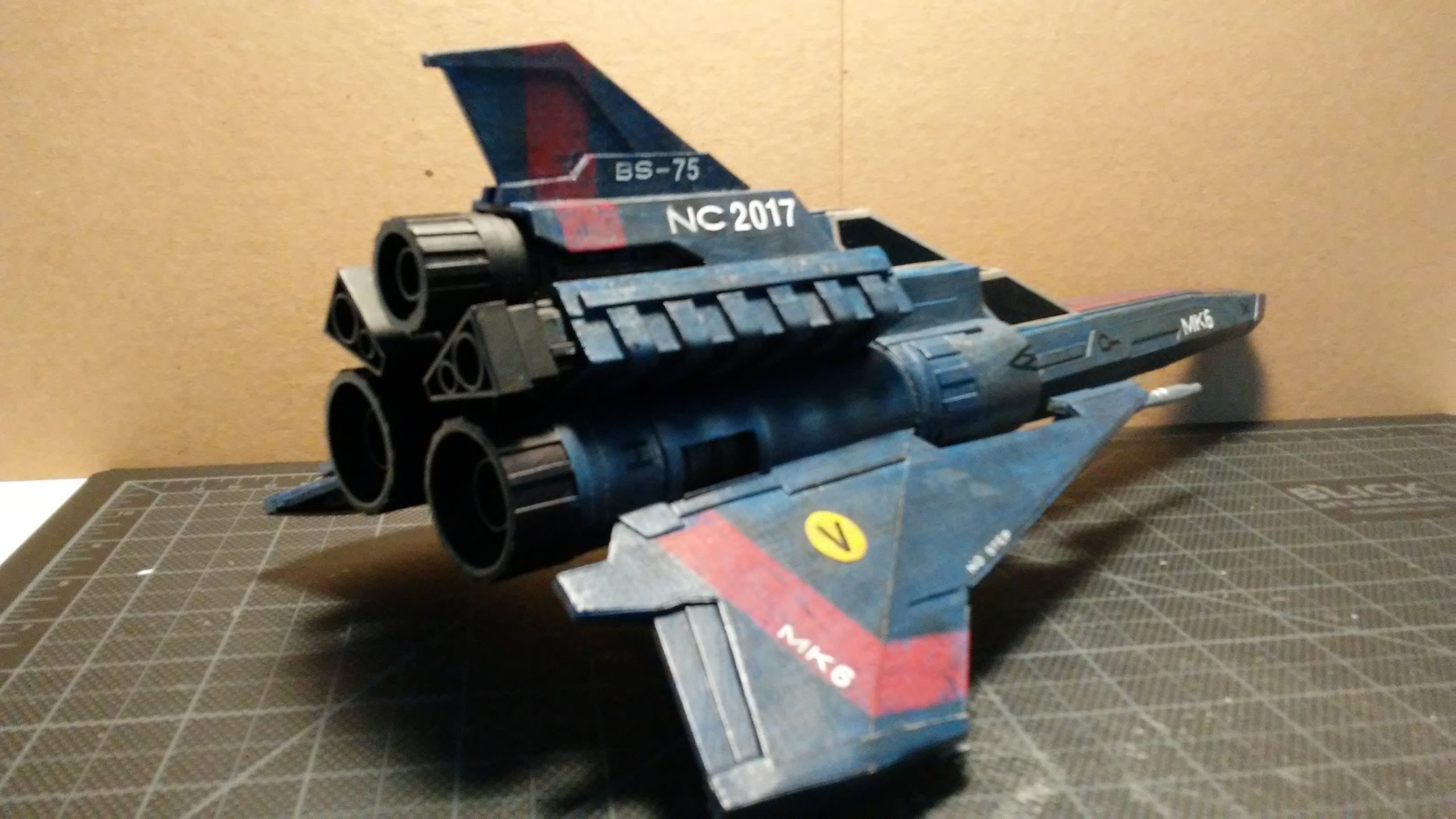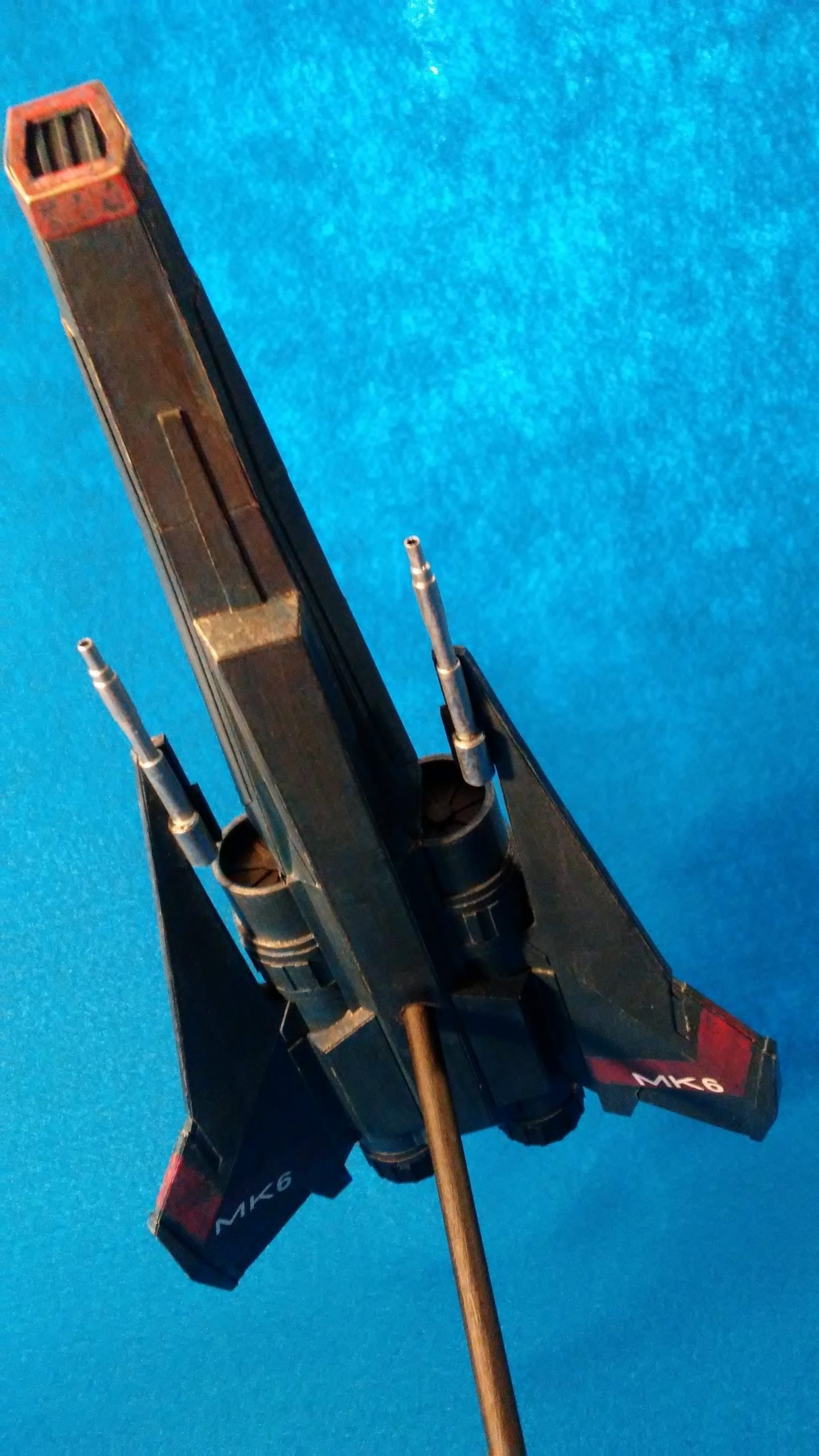 Card stock artist Anthony Santos recently sent me these wonderful photos of his latest creation and design,.. the Mk 6 Colonial Viper with TWO canopies showing! In the original series, I was always confused how a Colonial Viper ever was able to fit a passenger… yet the story had it happening. Then of course we had GALACTICA 1980, where the model and prop makers fixed that part of their story telling by elongating the cockpit and canopy of the Viper. Anthony Santos forwards this thinking in utilizing the 2003 series MkII Viper design as the base for his own two-seat design, which is seen here!