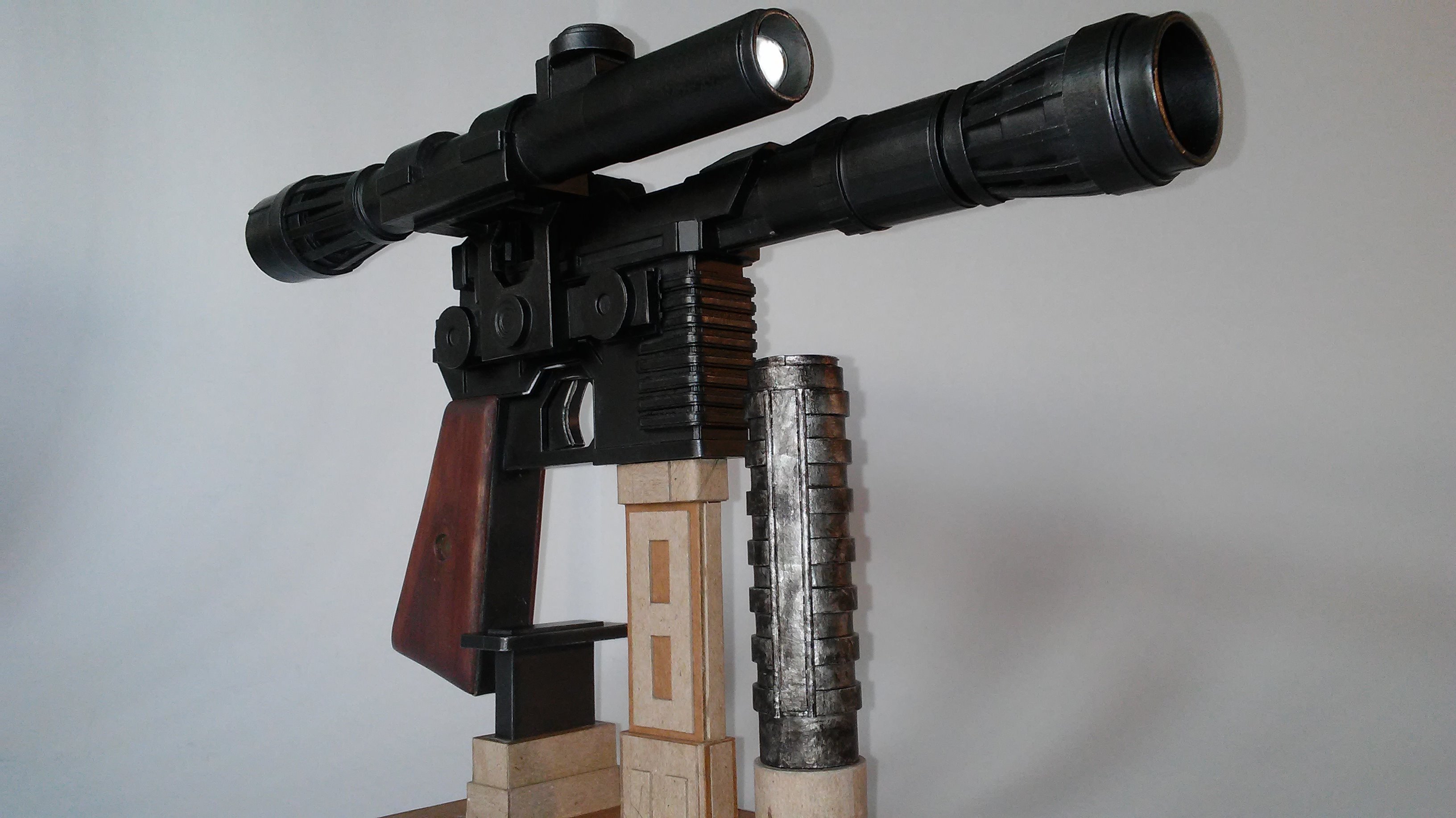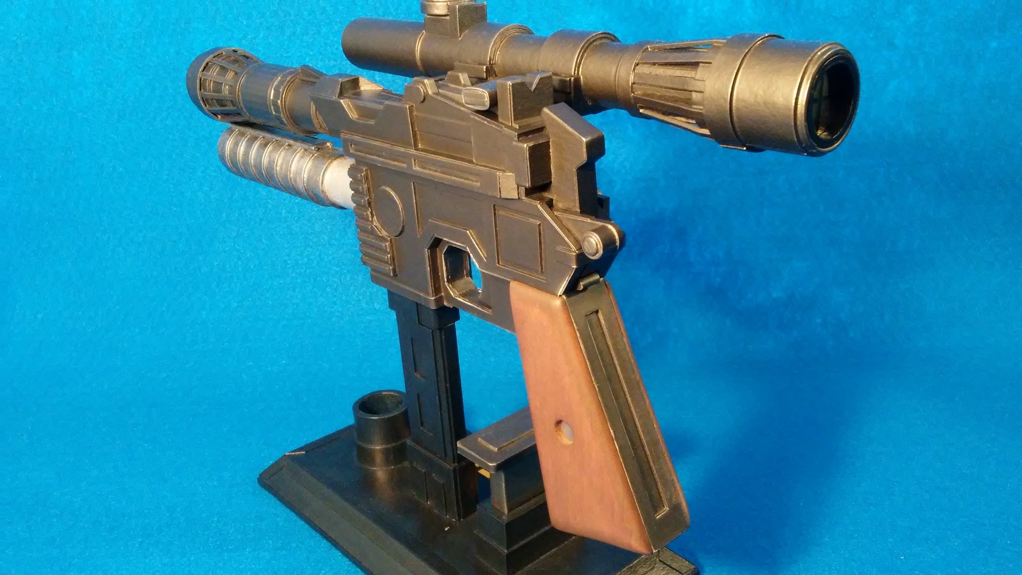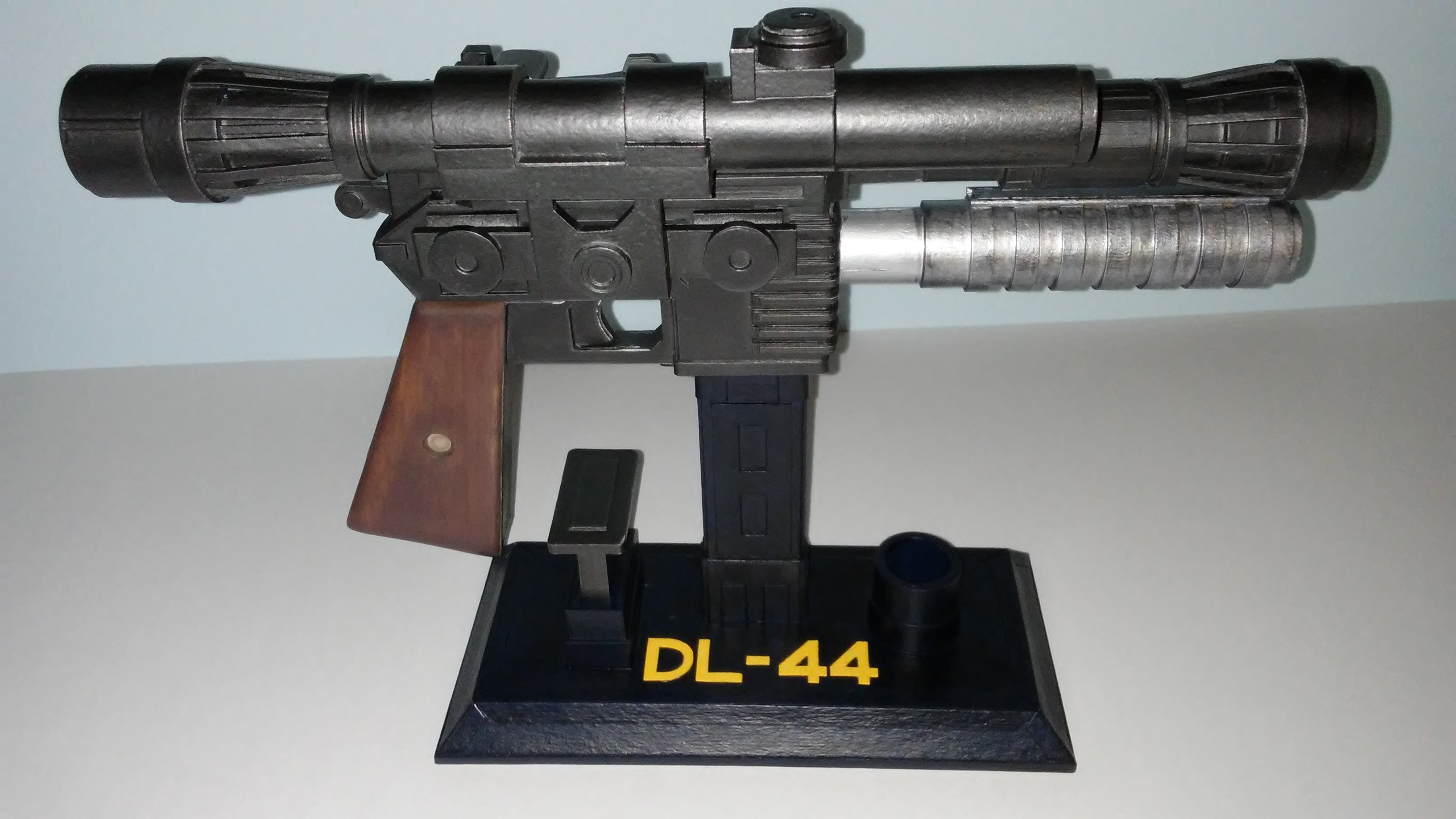 My DL-44 Blaster From Star Wars was started in march of 2016,the stand came a year later. It’s made from cardboard, basswood for the handle, a marble for the scope and two ceramic magnets to keep the power pack in place. It was painted with Testors Buffing Metalizer (gunmetal) A small flashlight was placed in the scope, but just for the photo.