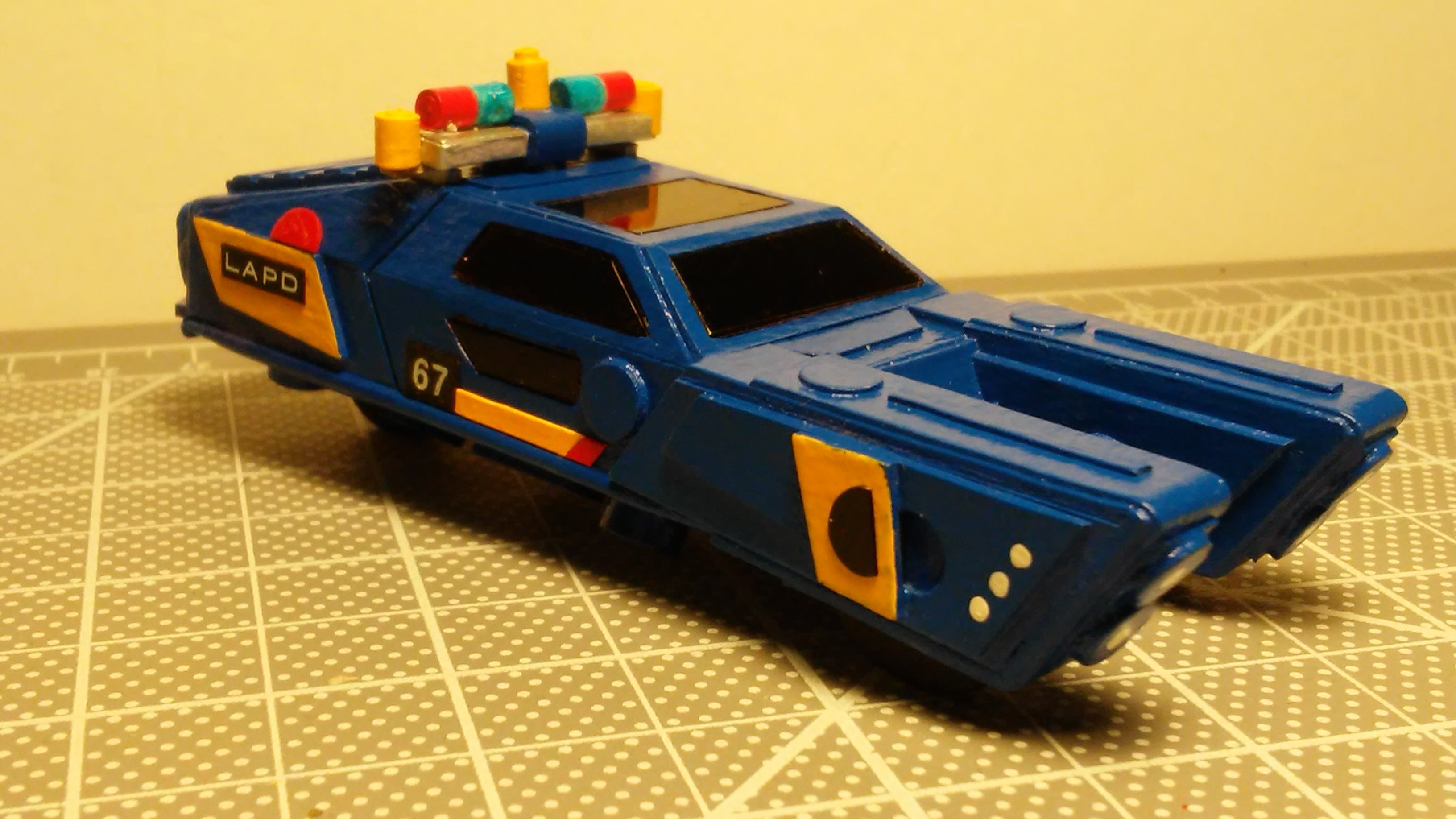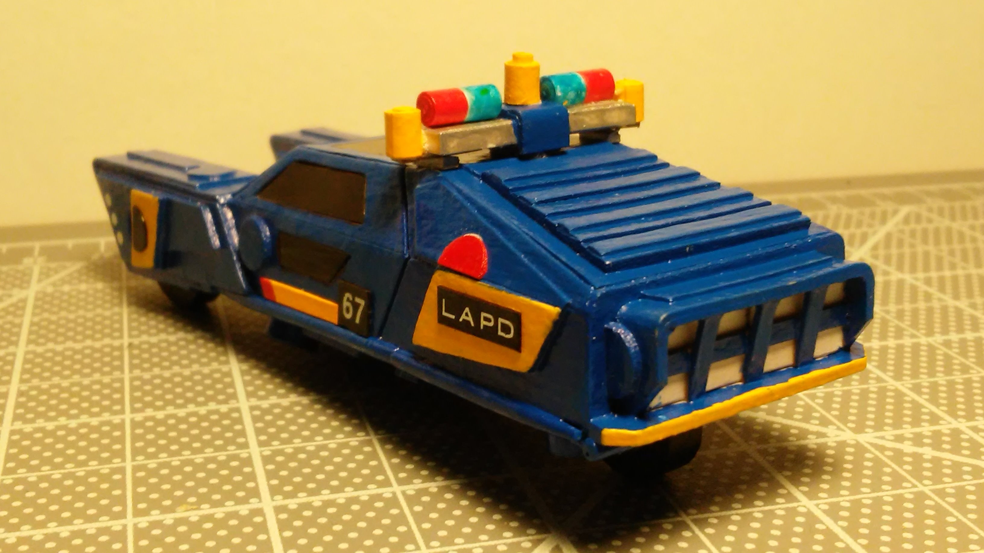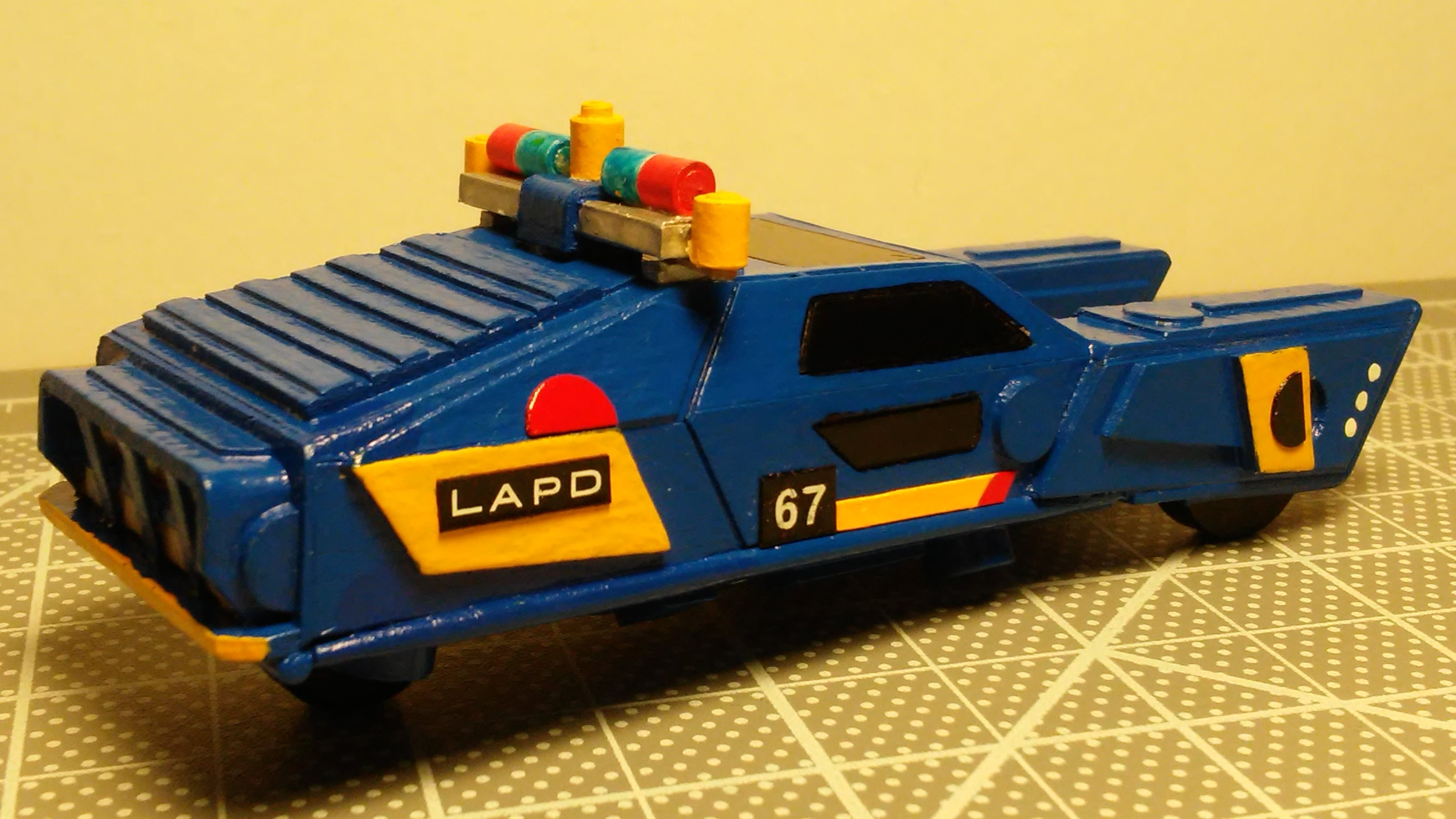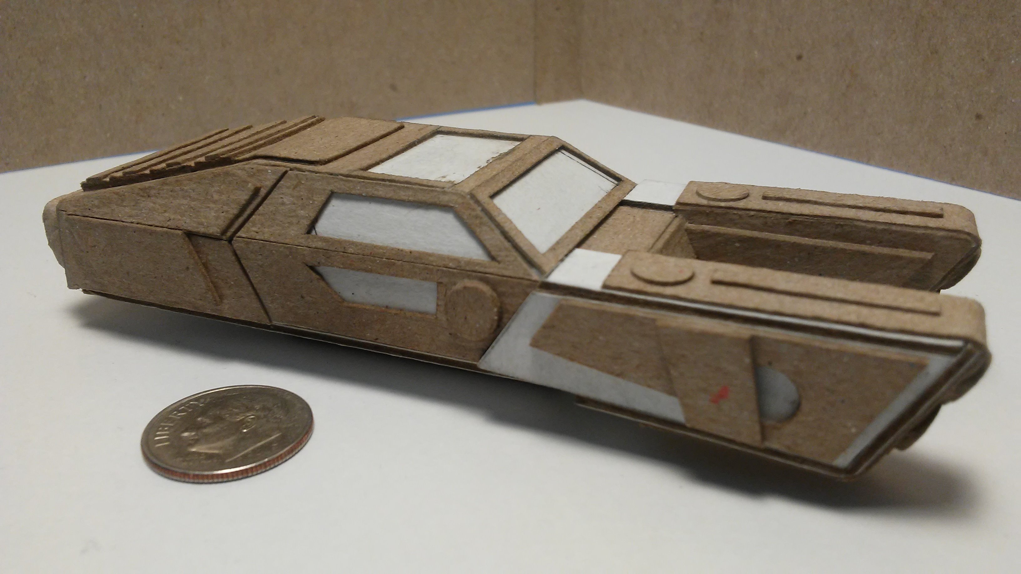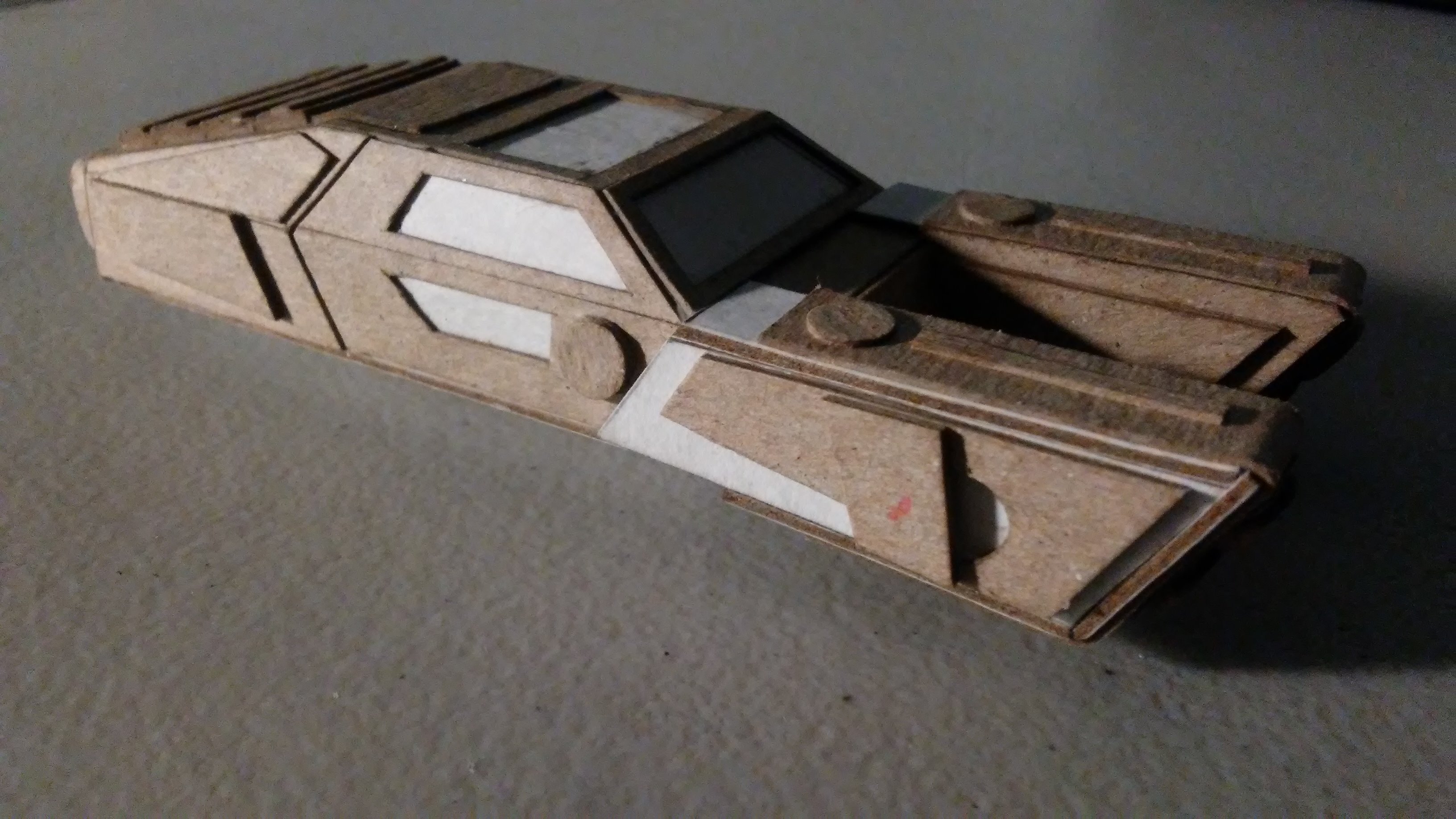 This one was not really planed but I had just finished watching Blade Runner 2049 and looking at photos of the police cars from the first Blade Runner movie. I decided to make my own version. It’s 4 1/2 in’ long, made from left over card board scrap.