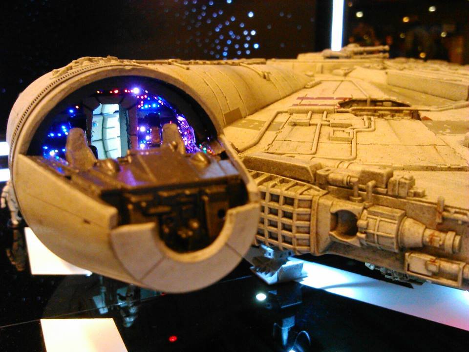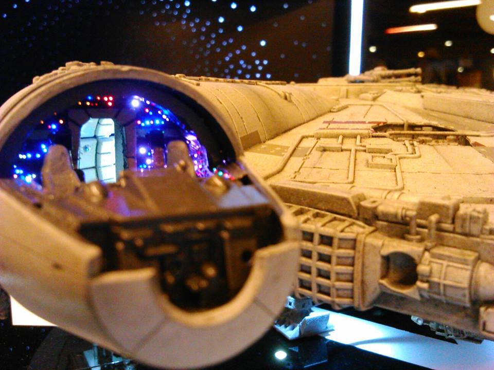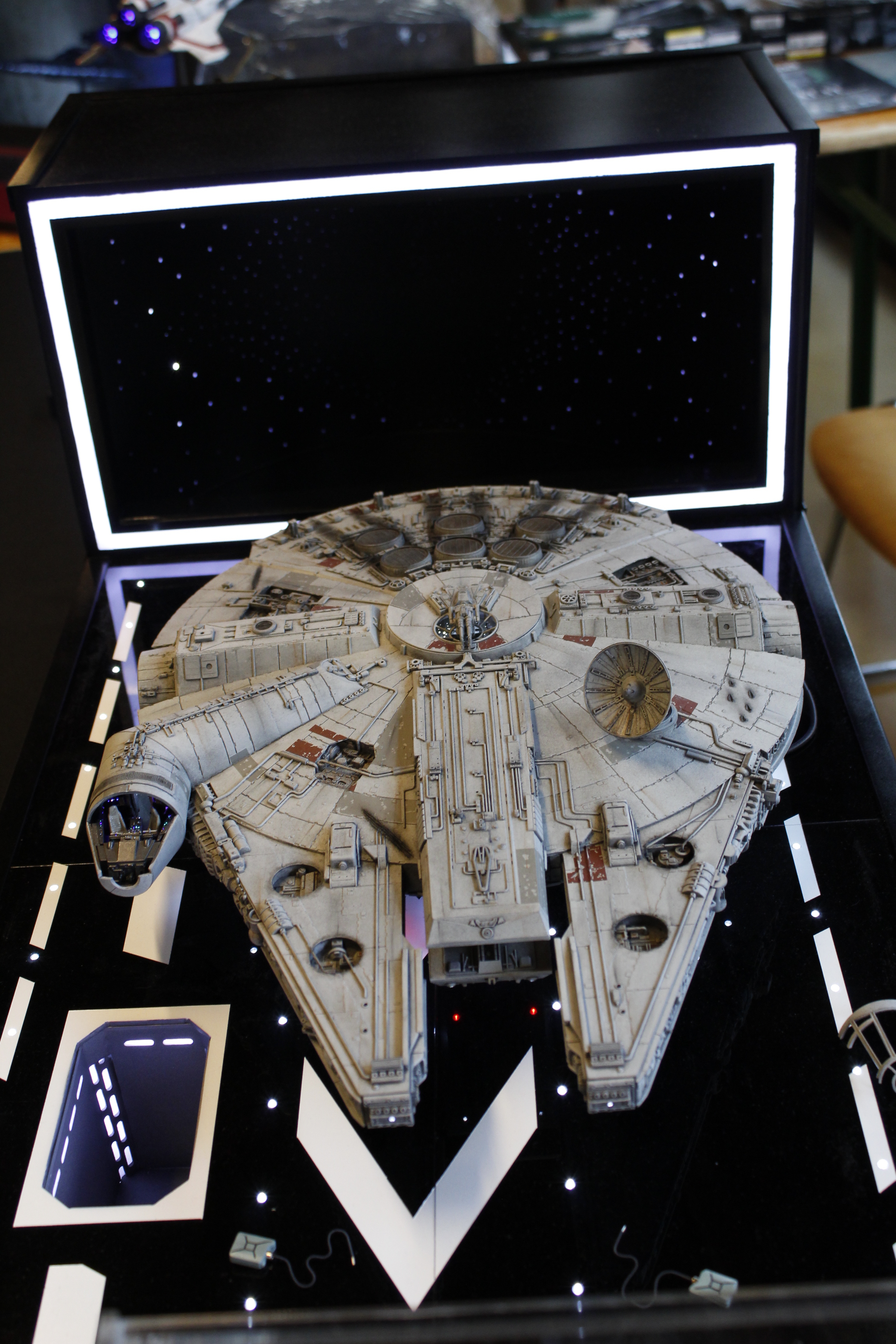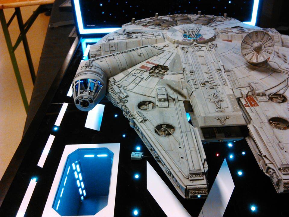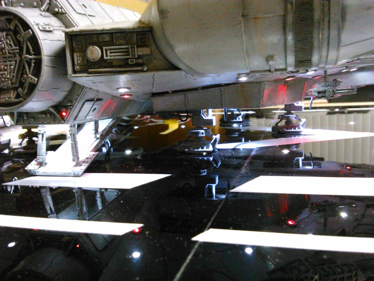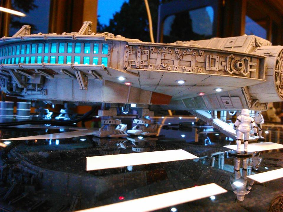 The Falcon has received several layers of aging at the paint job. For the design of the cockpit, I added about 250 optical fibers of 0.25 mm. The corridors behind the cockpit and up the ramp were detailed and lighted. The general Light-Up (Falcon + Diorama) consists of about 100 LED and LED ribbon 1.50m. The diorama is a personal creation, it is composed of a starry background, an elevator, a door bay hangar and a runway. The Light-Up is controlled by remote control.