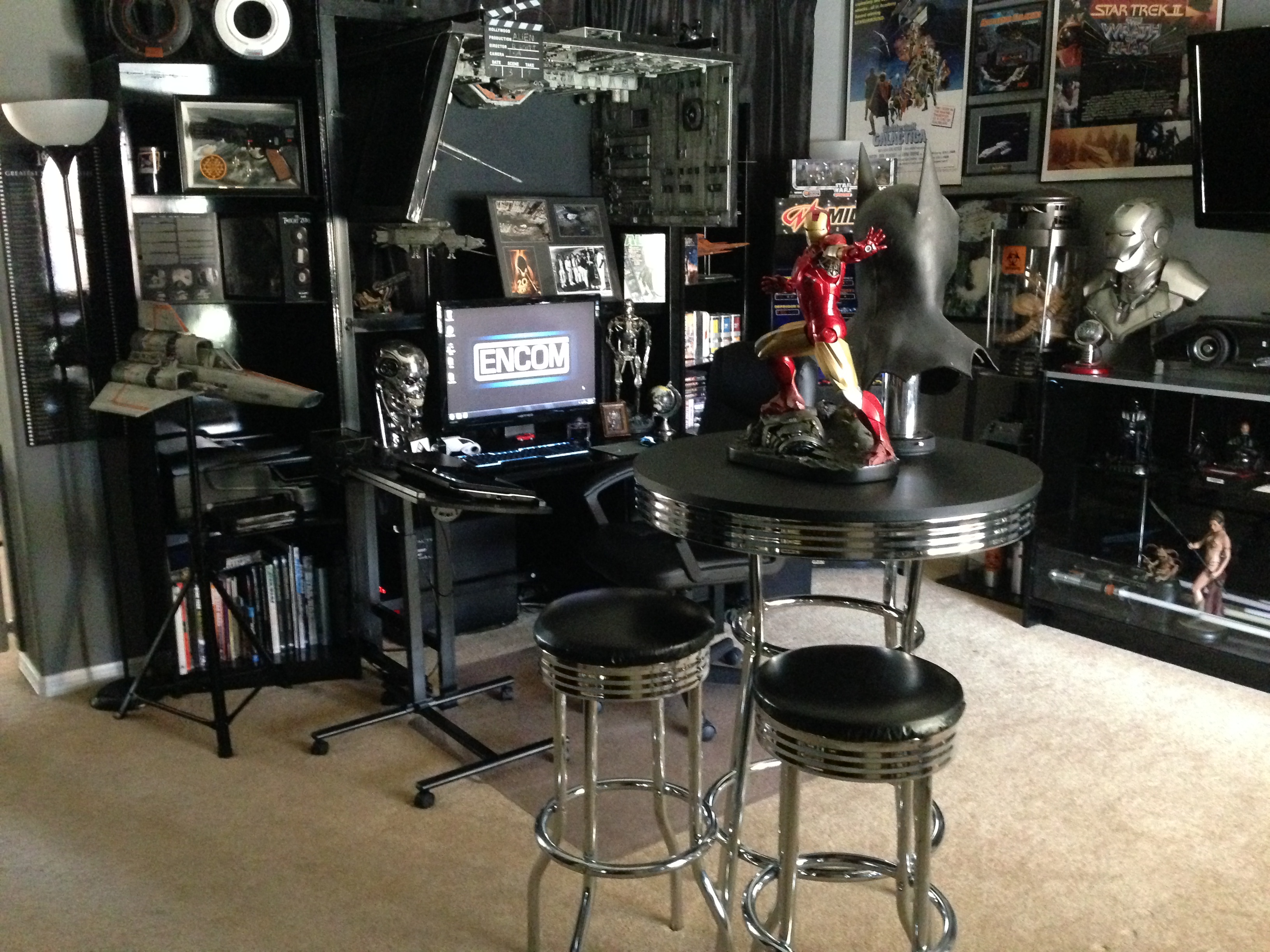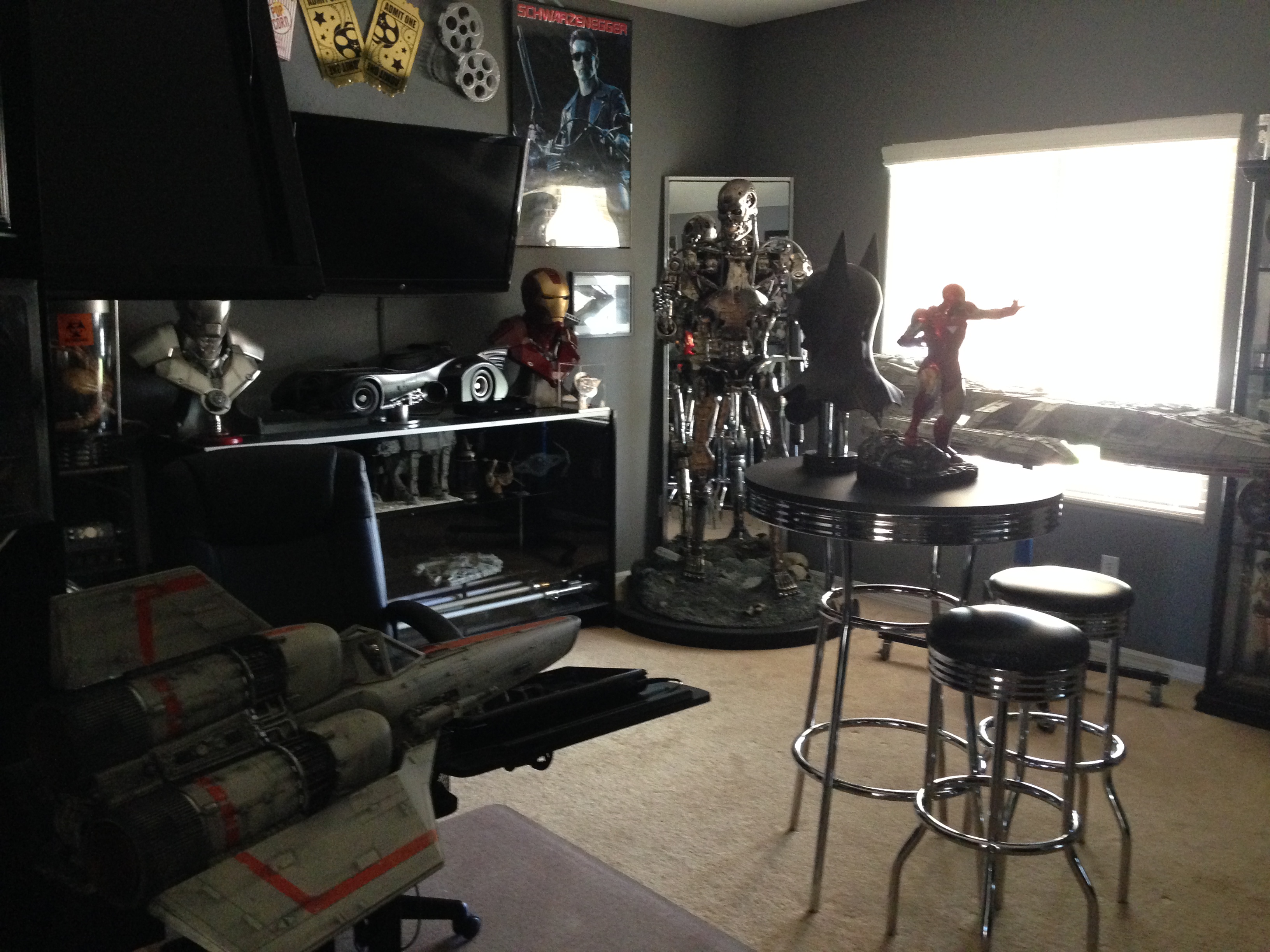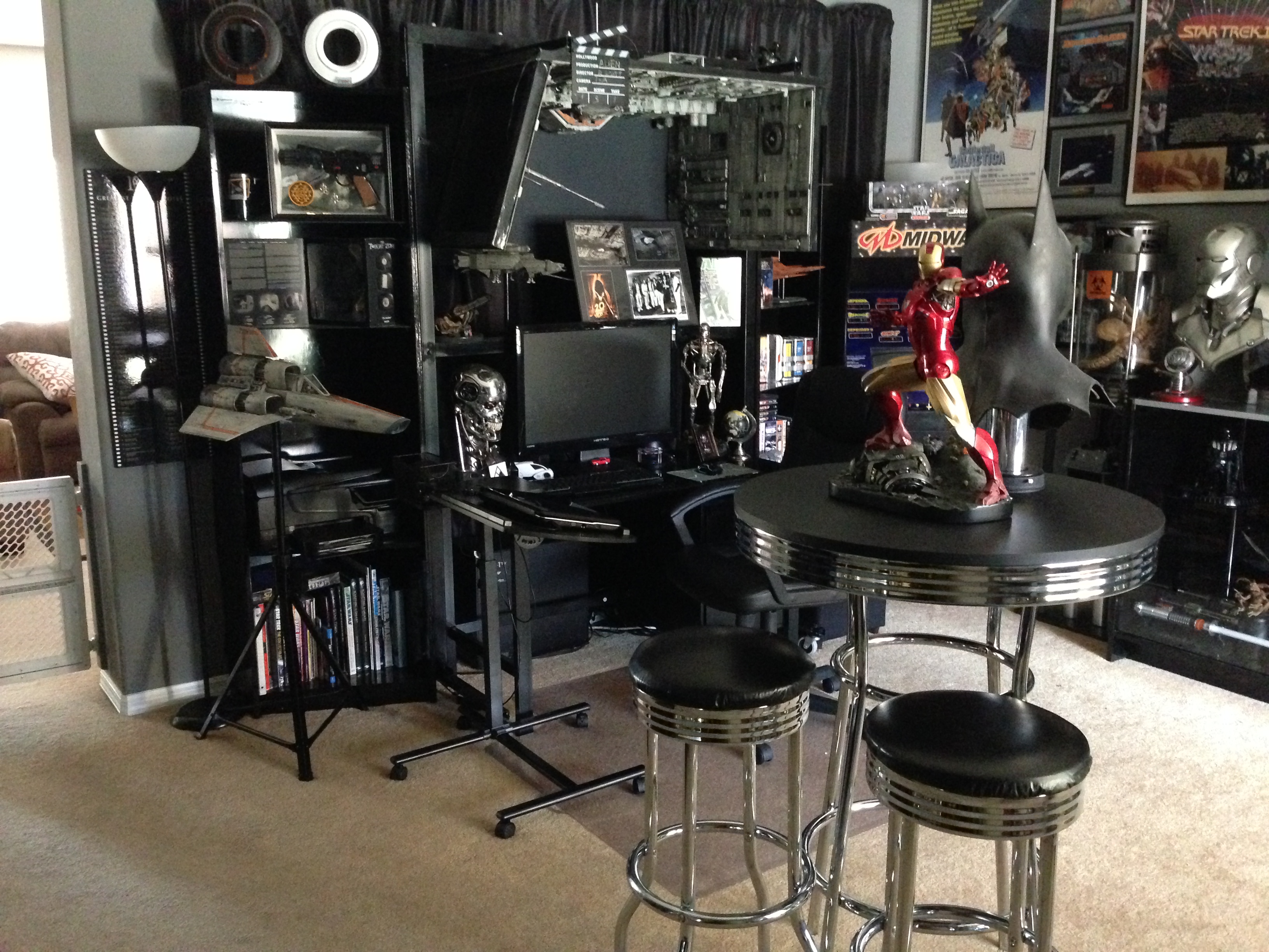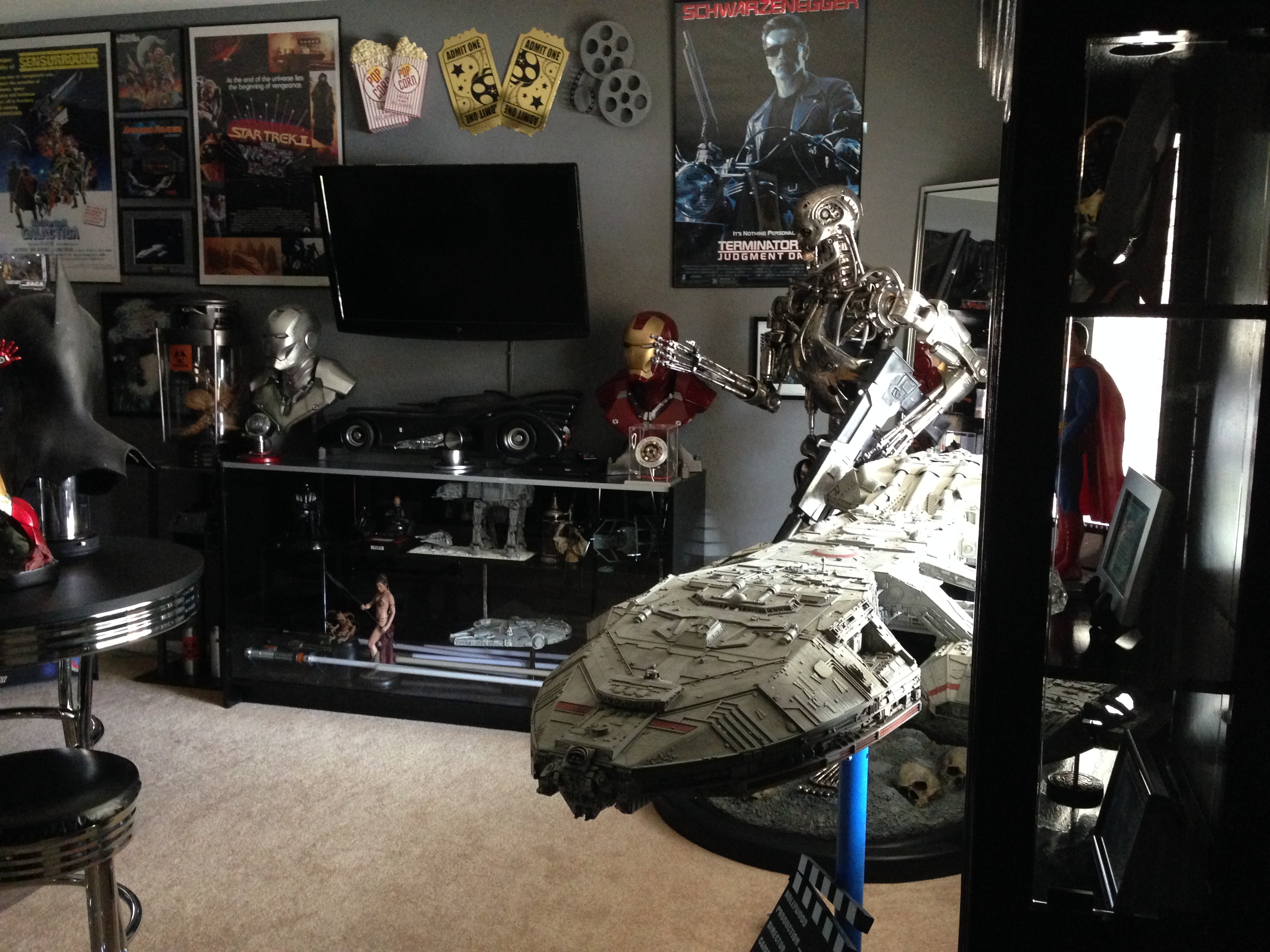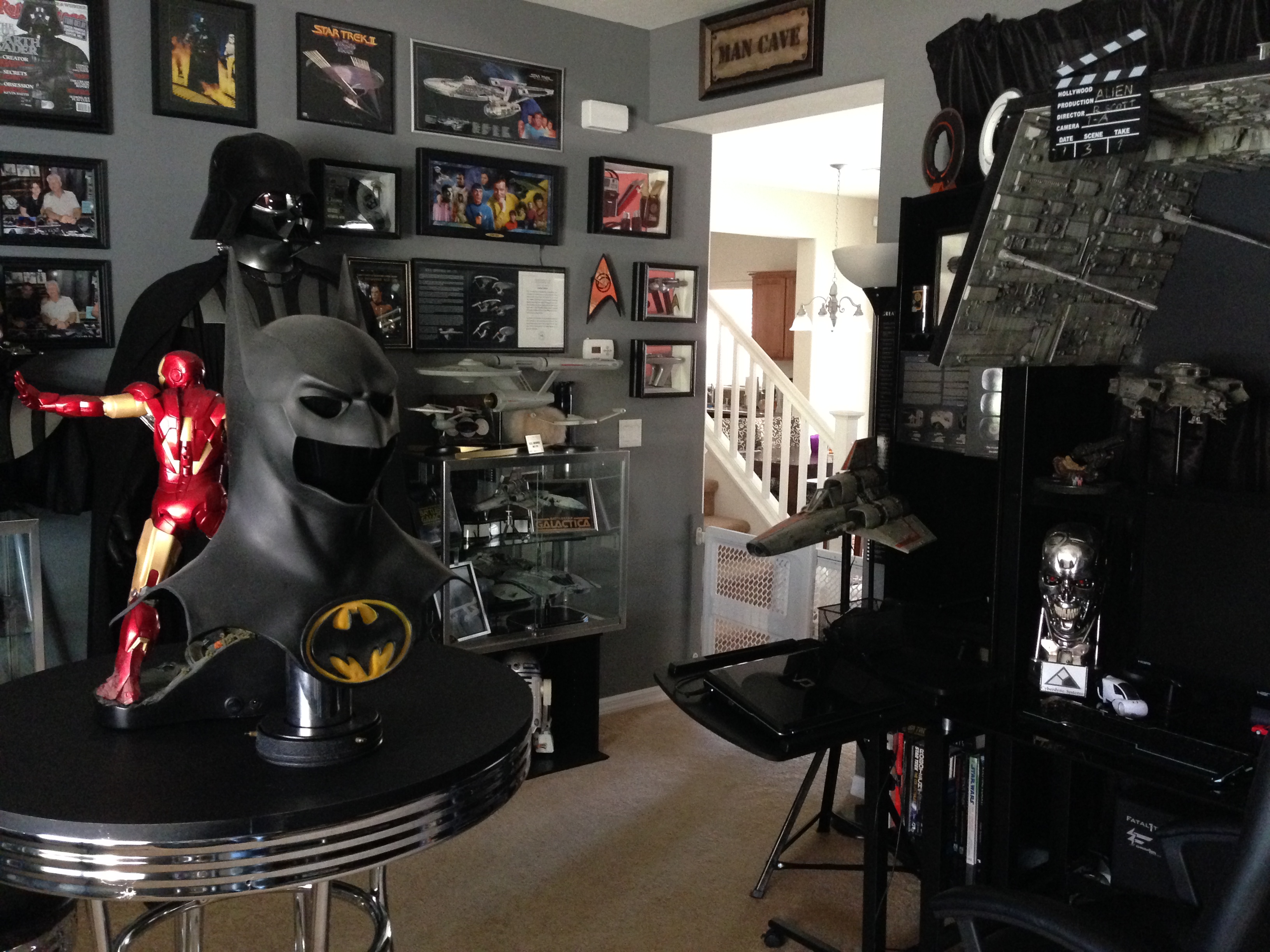 I always love to show different man caves. This one of Marc’s, in his new home, is marvelous! Still adorning the world’s largest scaled replica (7 feet long) of the Battlestar Galactica, and a full sized Terminator…this room will cause any male to drool!