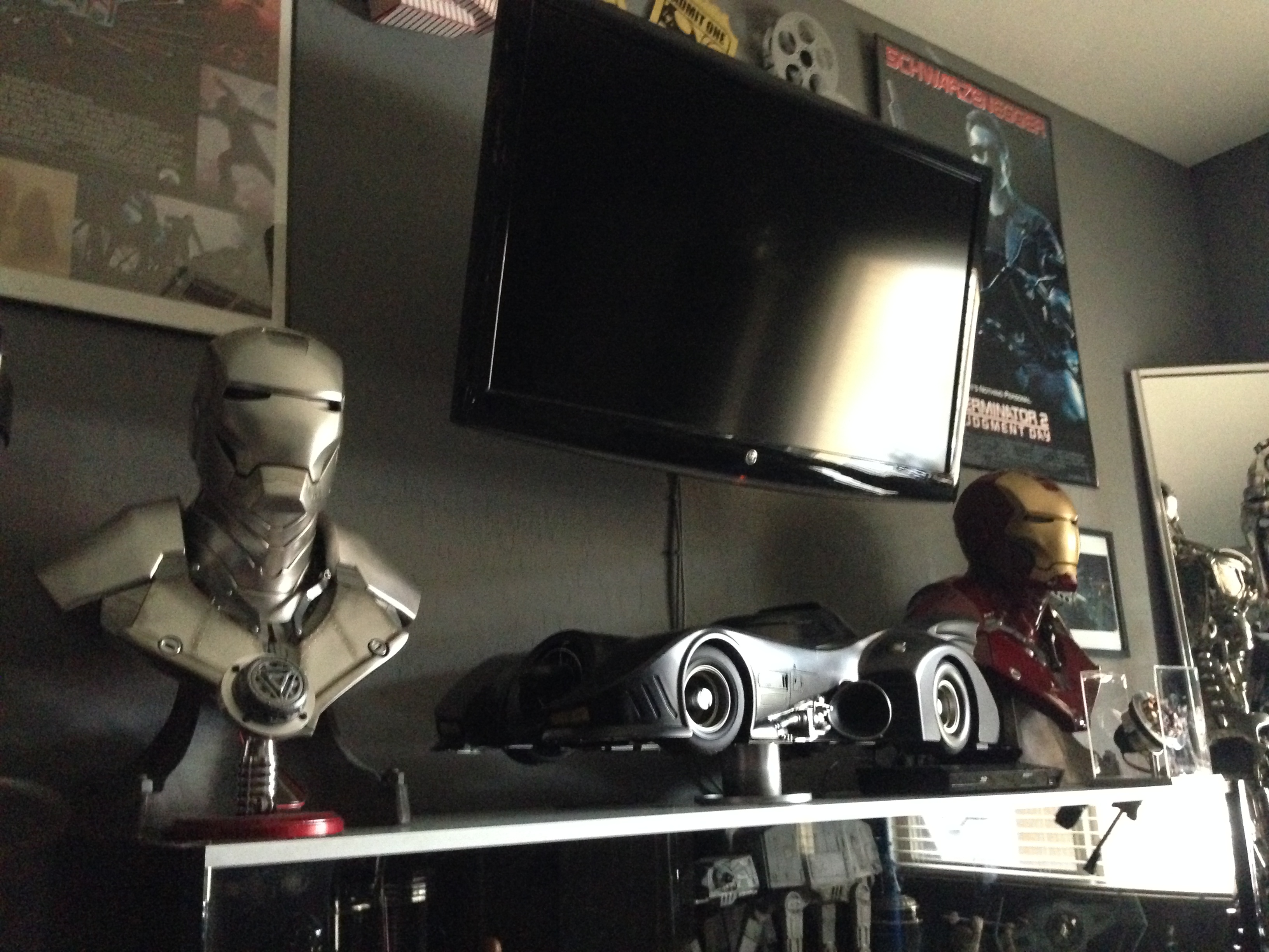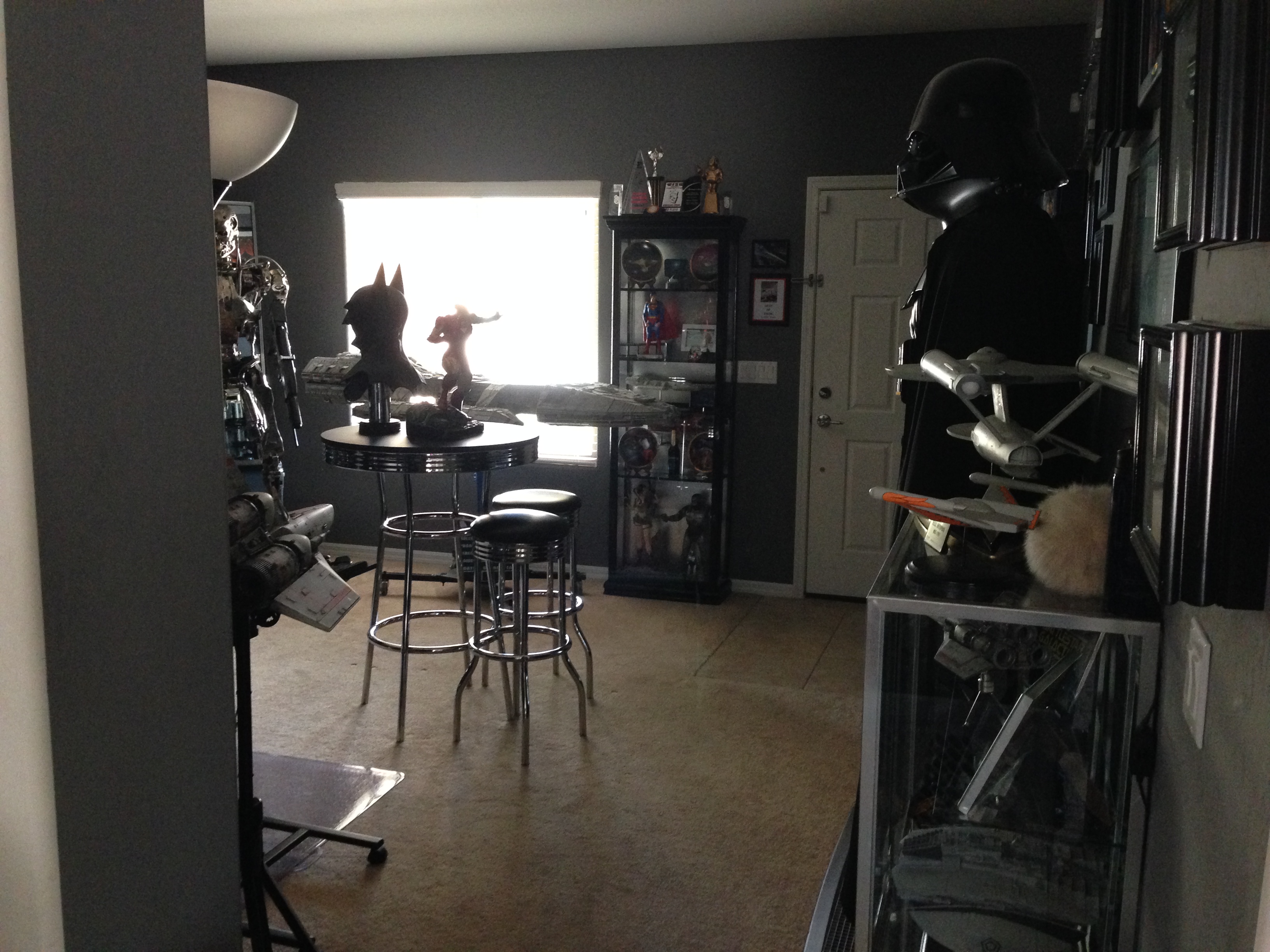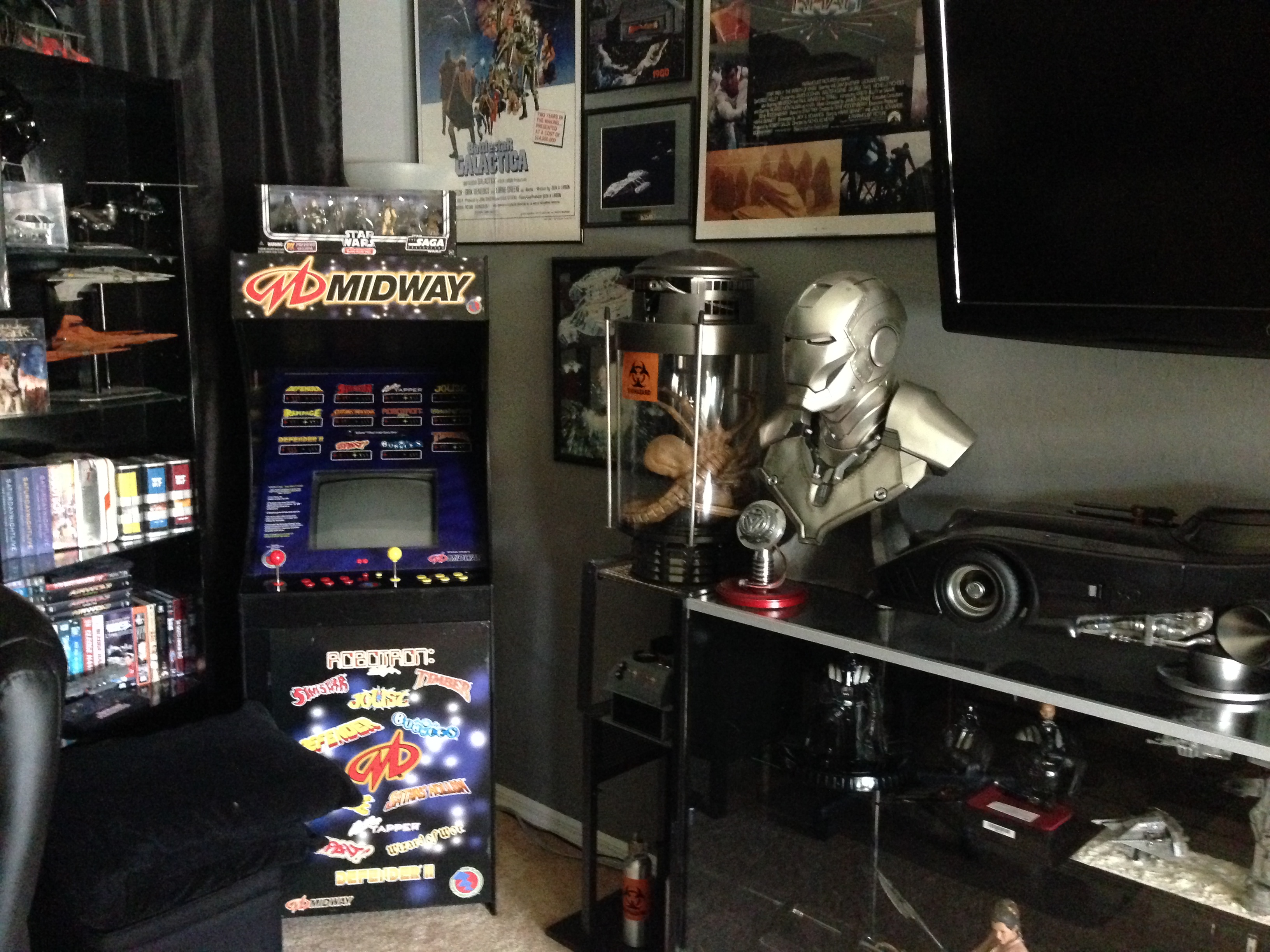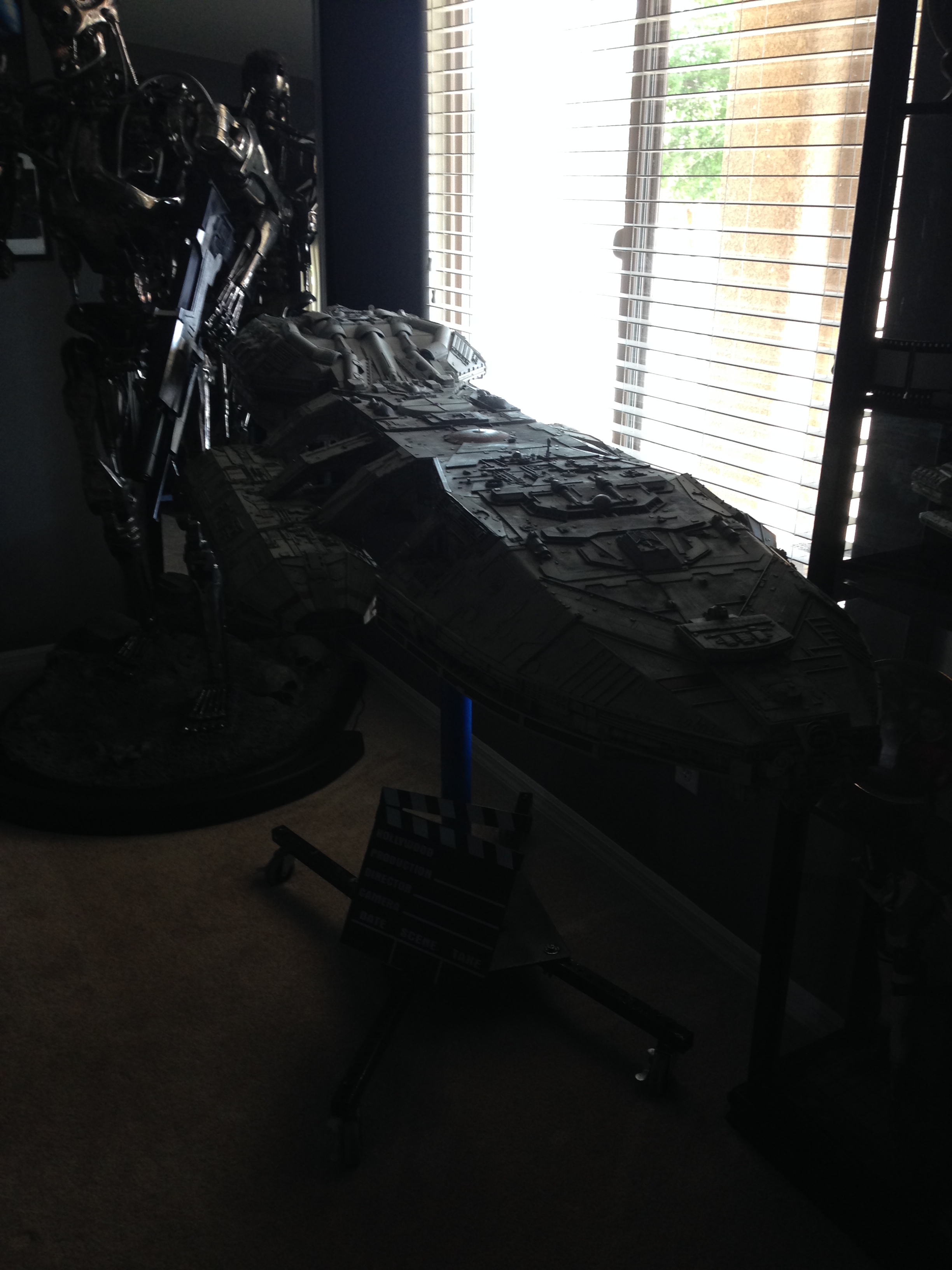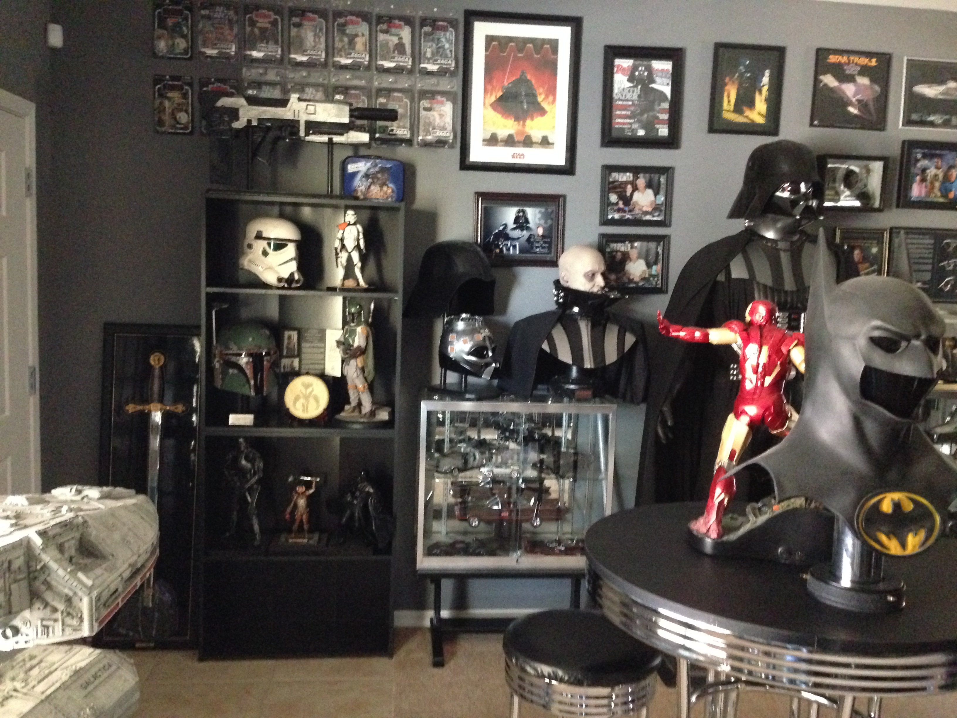 I always love to show different man caves. This one of Marc’s, in his new home, is marvelous! Still adorning the world’s largest scaled replica (7 feet long) of the Battlestar Galactica, and a full sized Terminator…this room will cause any male to drool!