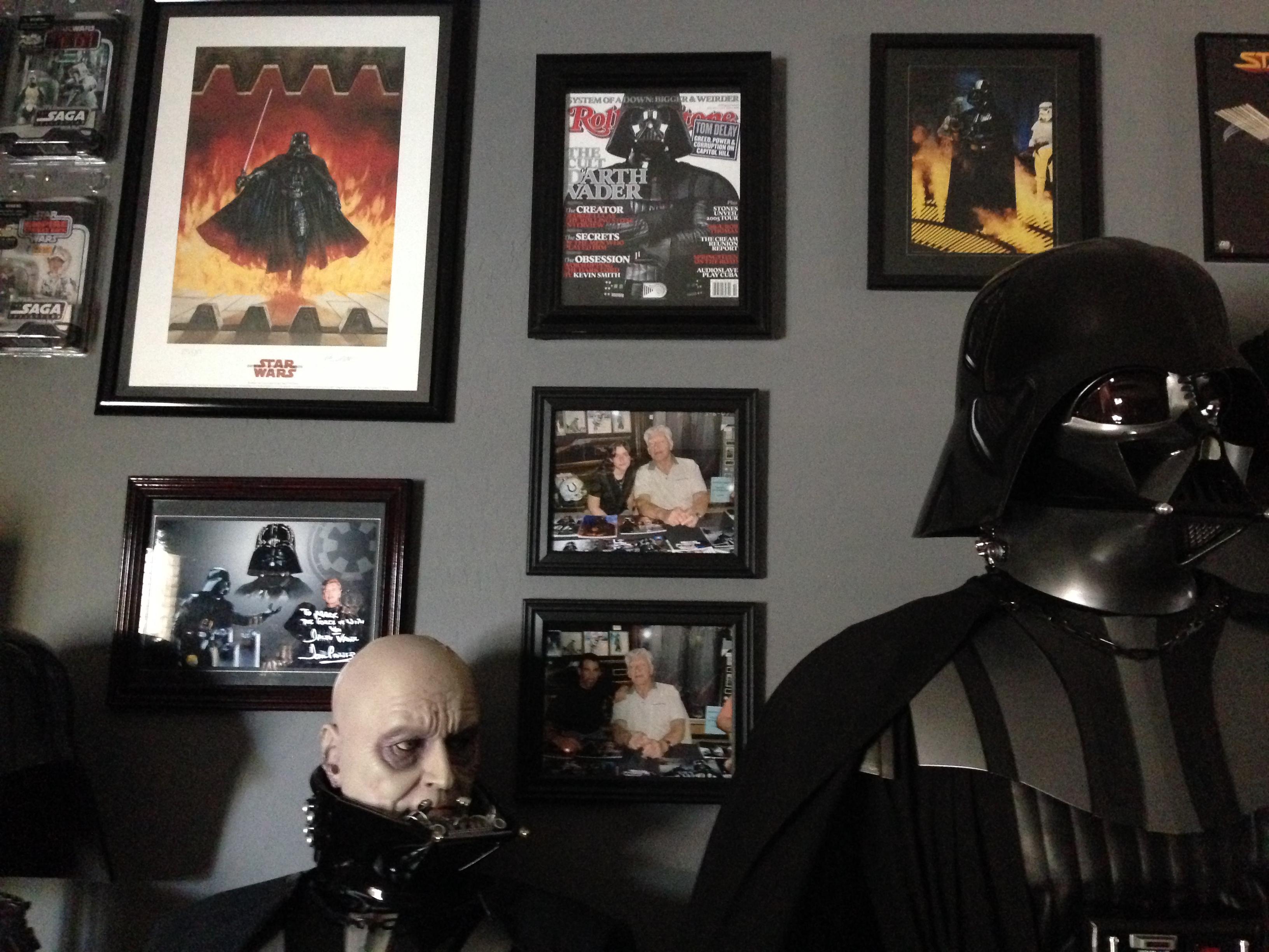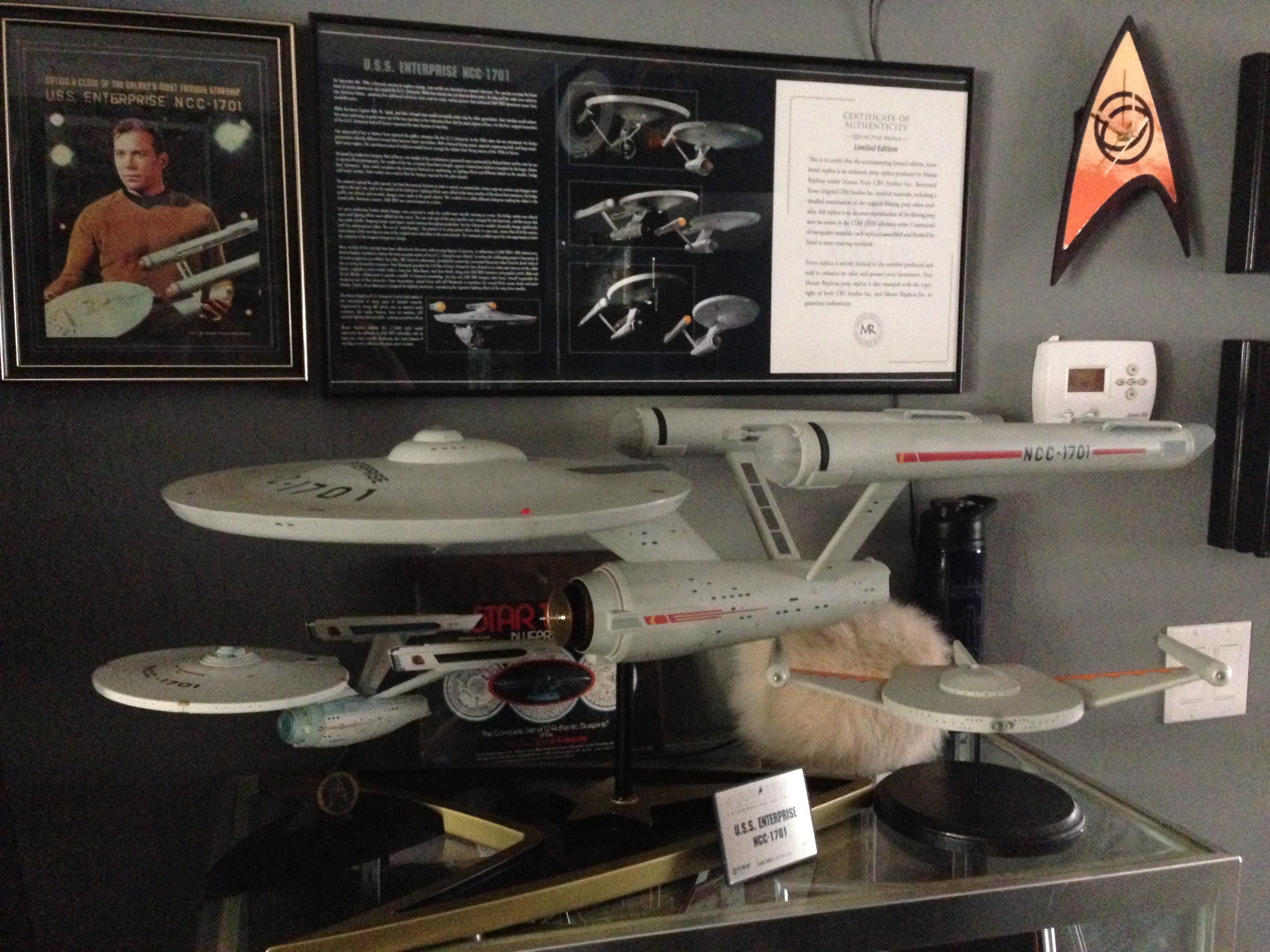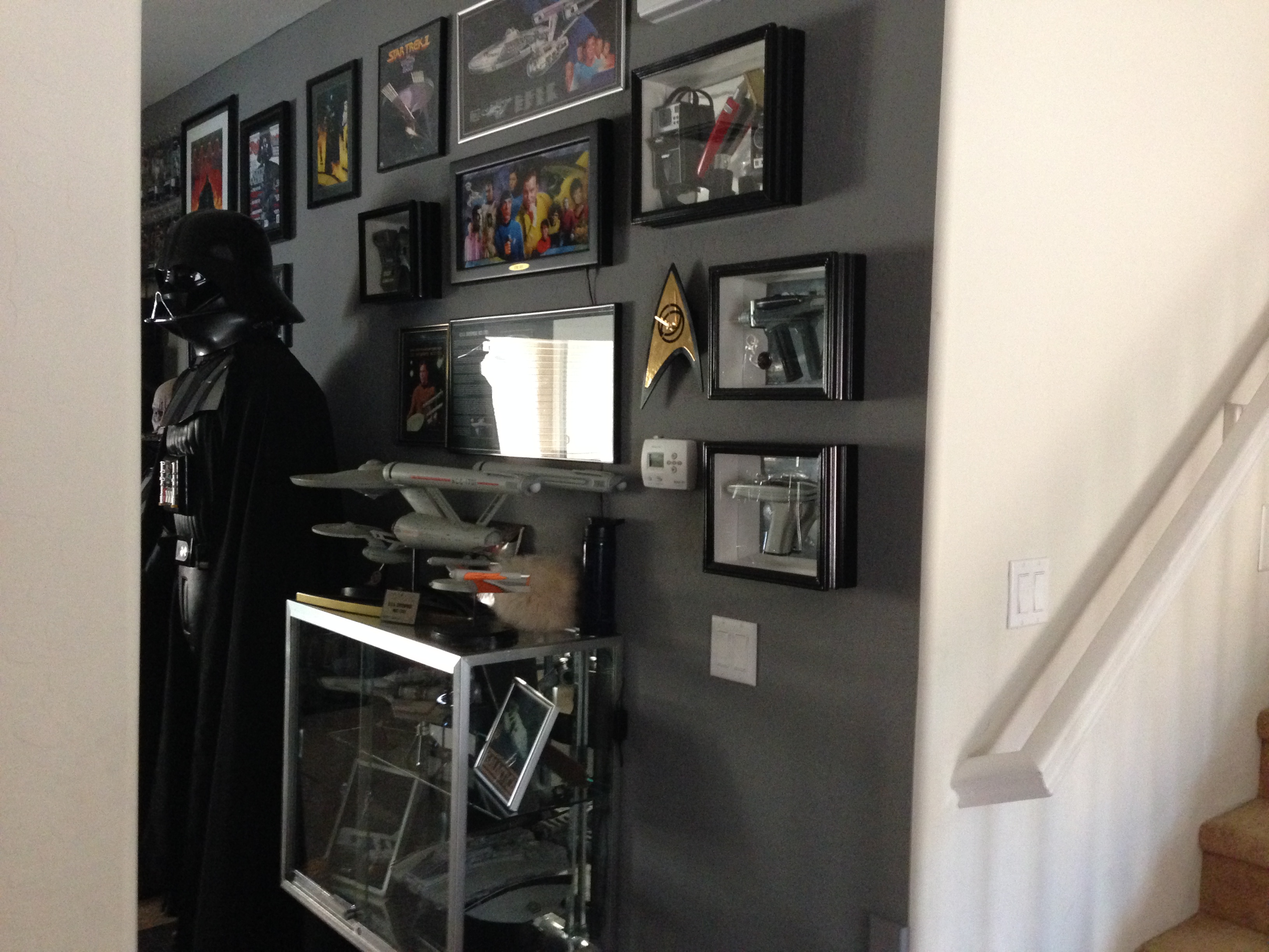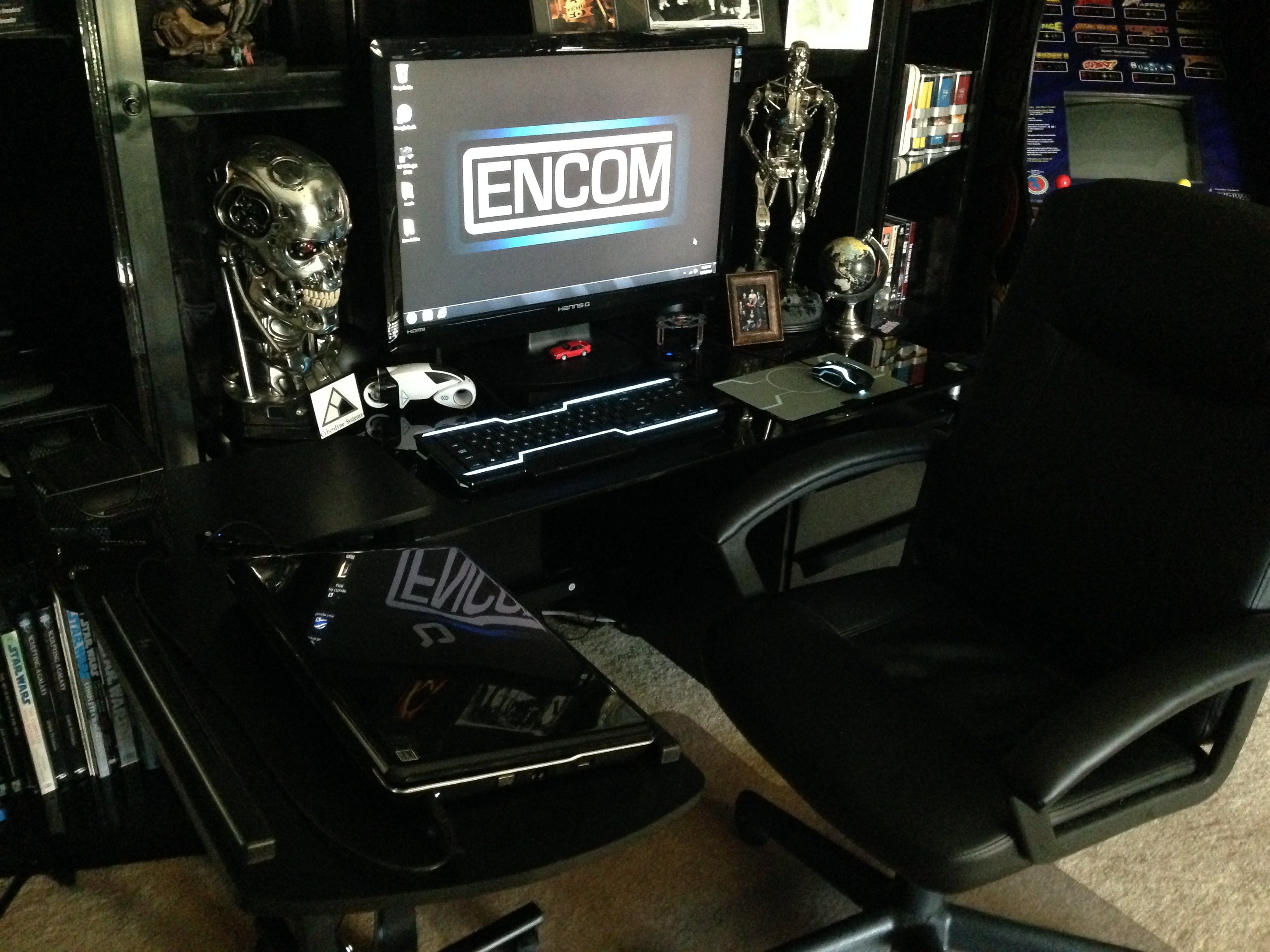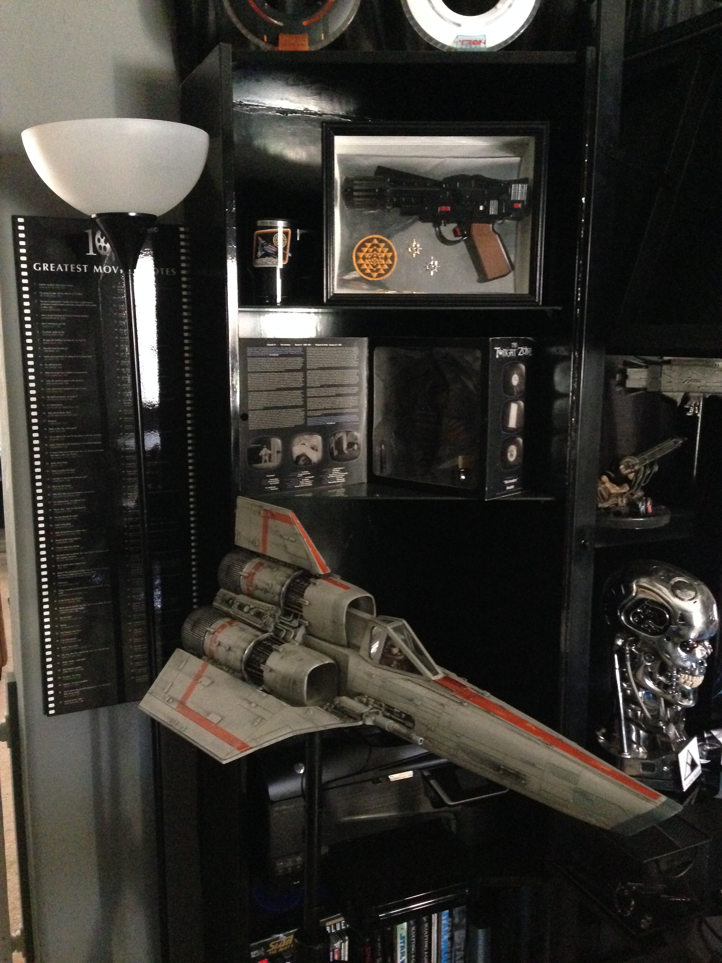 I always love to show different man caves. This one of Marc’s, in his new home, is marvelous! Still adorning the world’s largest scaled replica (7 feet long) of the Battlestar Galactica, and a full sized Terminator…this room will cause any male to drool!